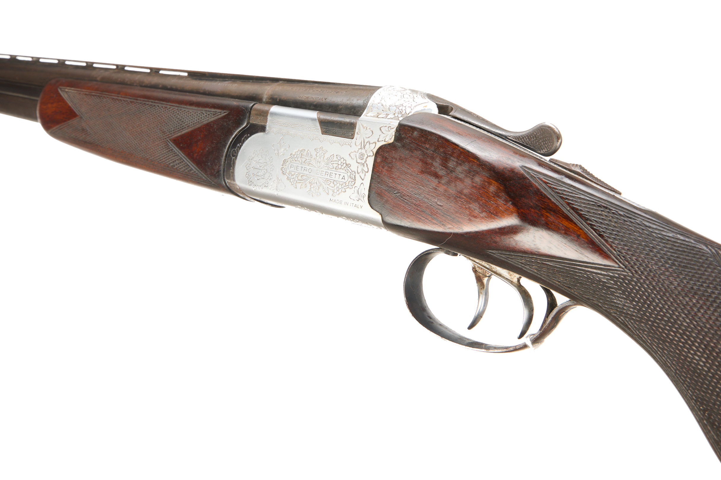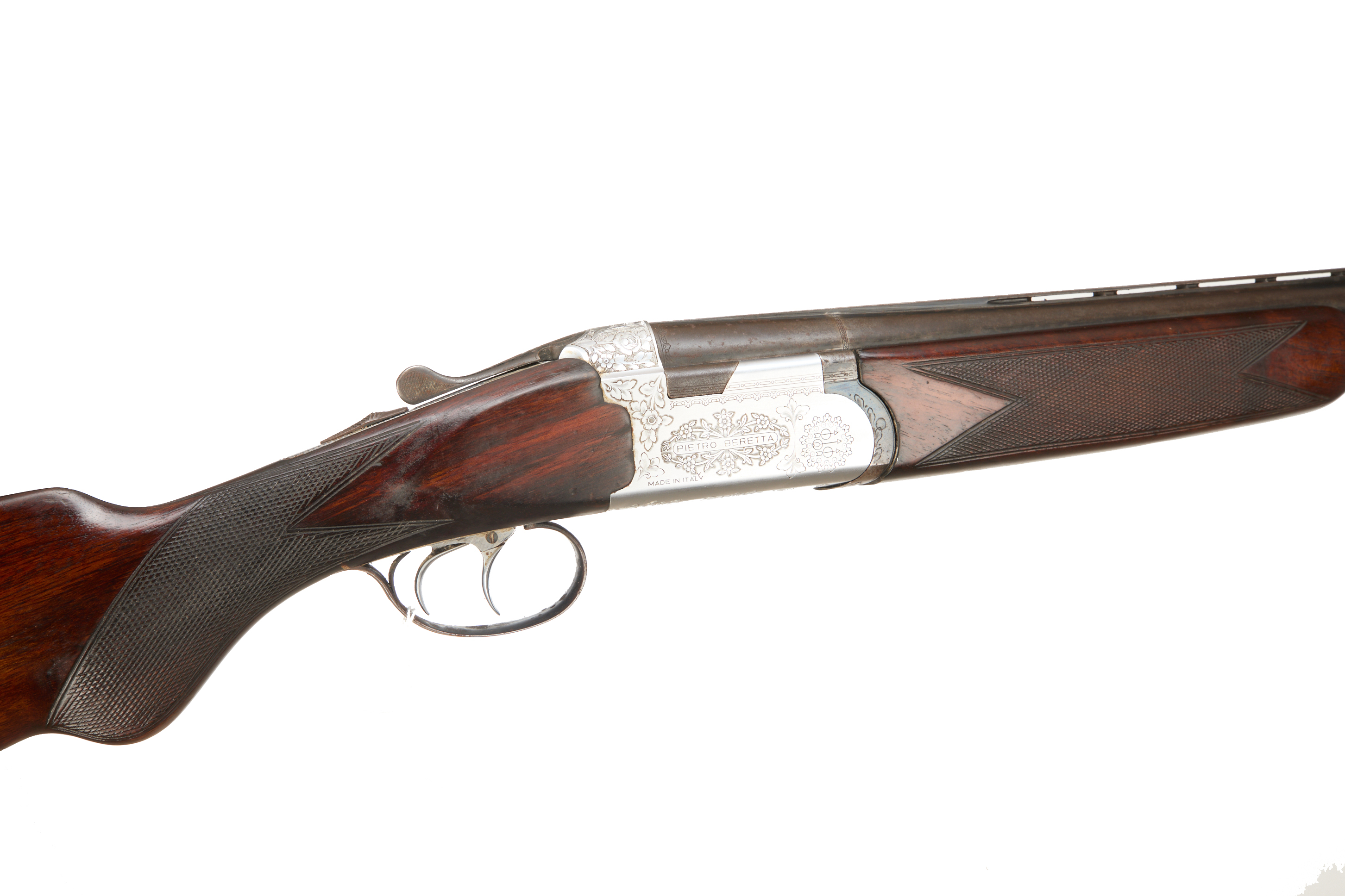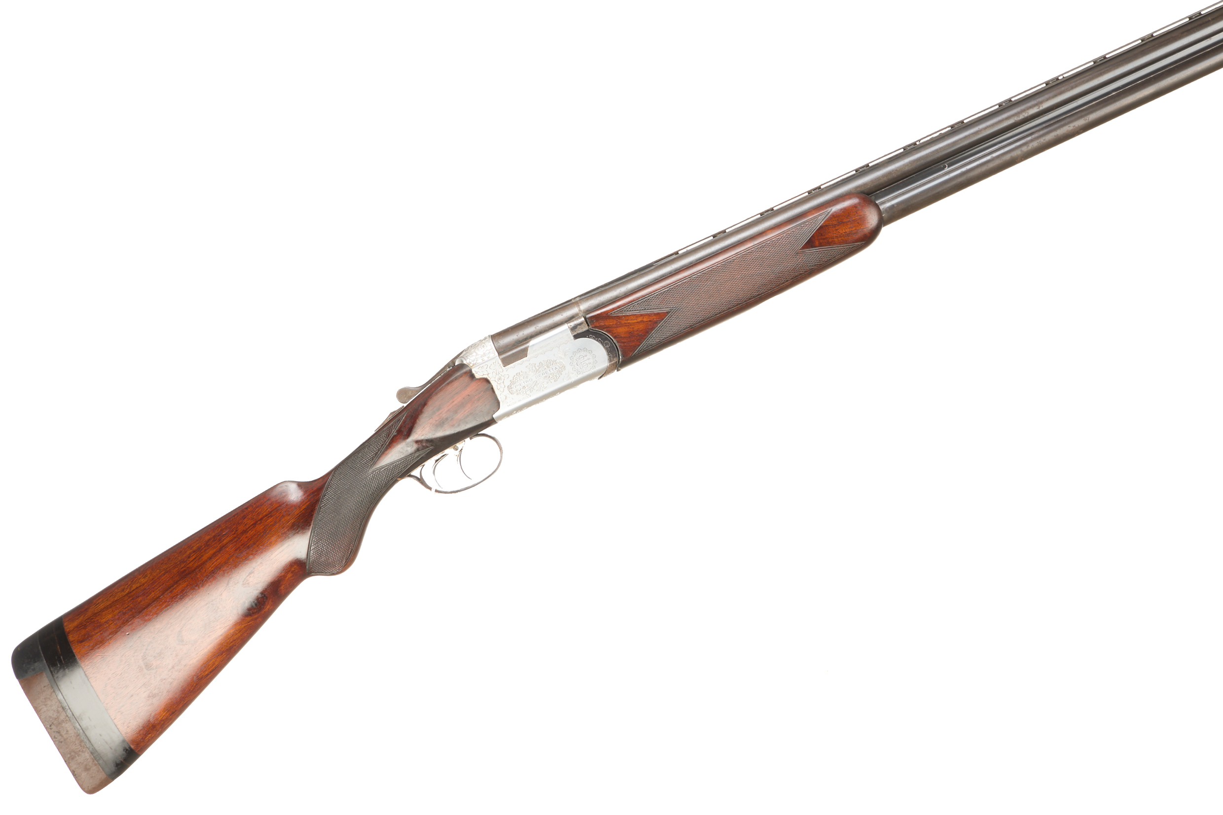 Cushioned butt pad, chequered semi-pistol grip and forend, ventilated top rib. Pietro Beretta surrounded by floral scrolls to action. Double trigger, and safety.
