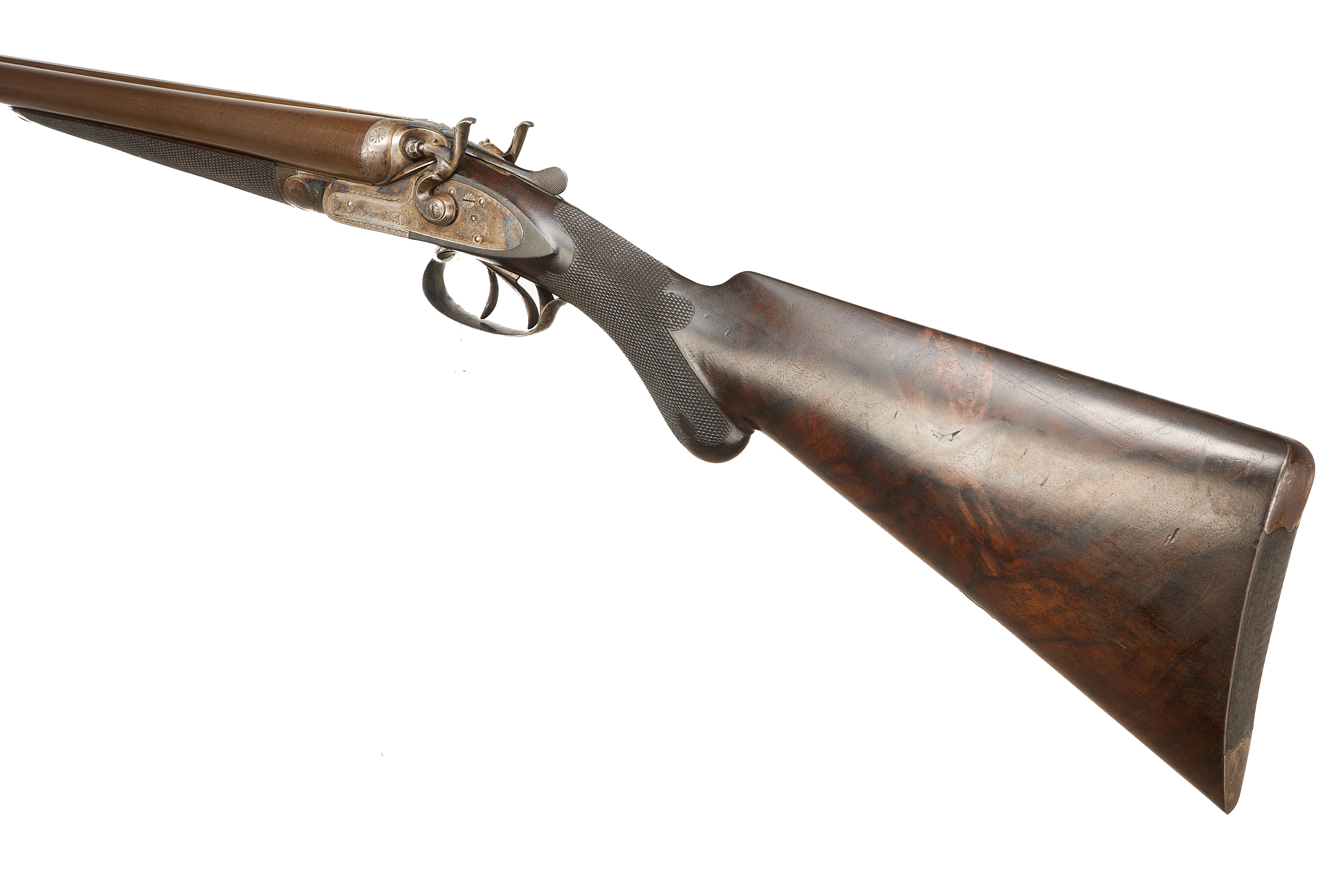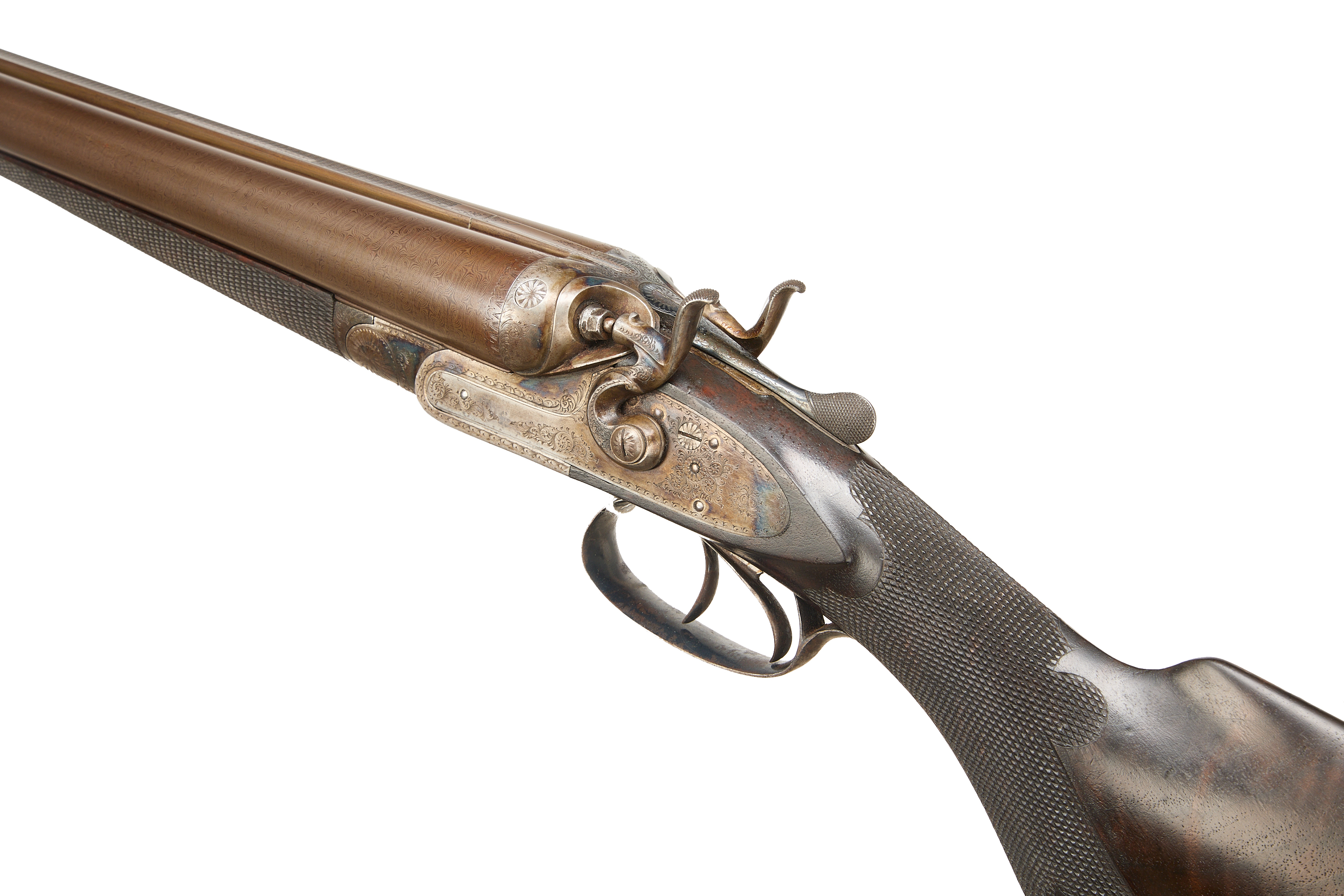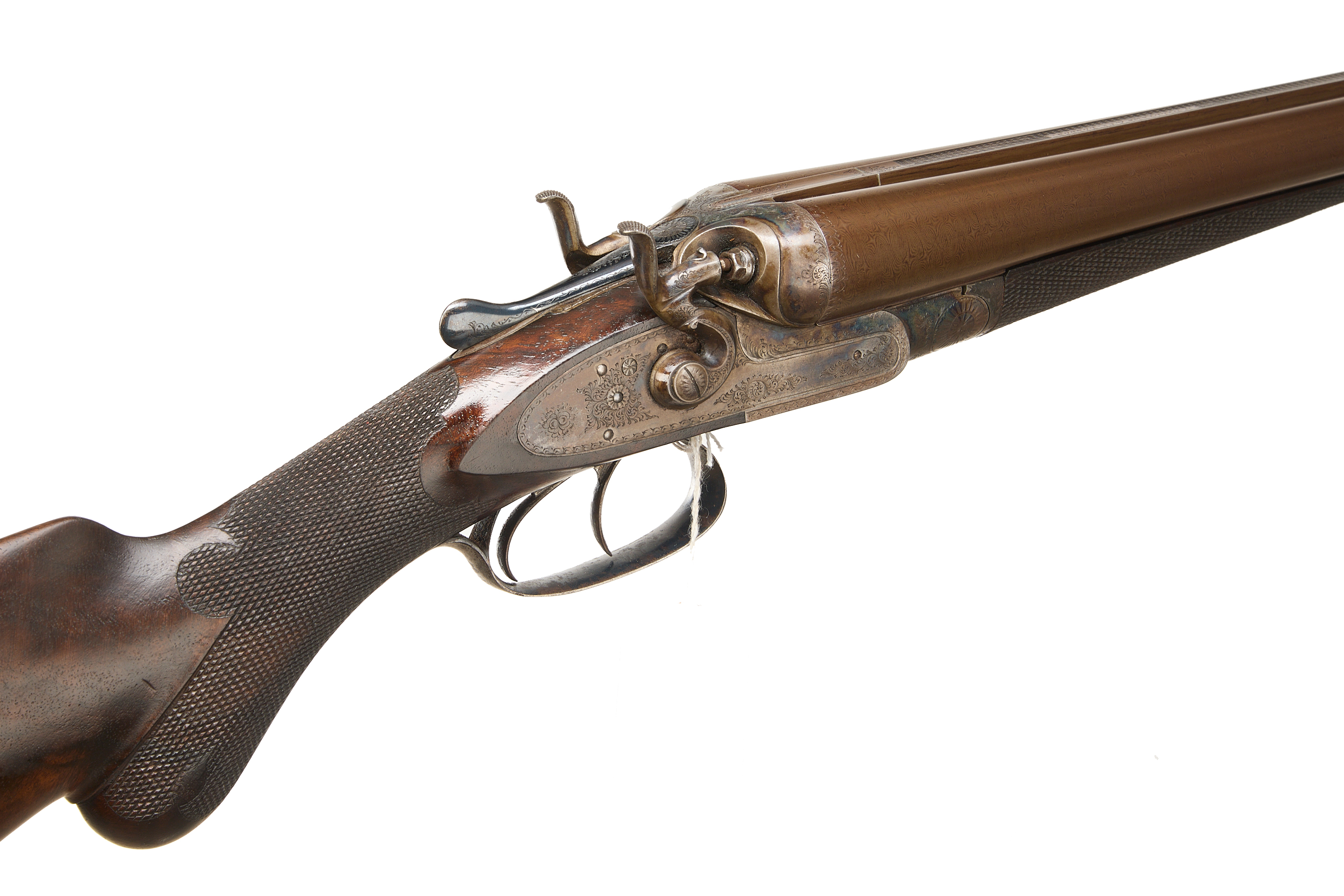 Chequered butt pad with steel heel and toe plates, richly-figured stock, chequered, rounded, semi-pistol grip and forend. The rib engraved "J WILLIAMS & CO LONDON". Carved fences, non-rebounding, hare’s ears hammers, blued top lever. Treble grip action. The plates, action and hammers all retaining much original colour. In a leather bound, brass-cornered case with accessories. Original black powder proof 1887 – 96, nitro-reproved c.1980.