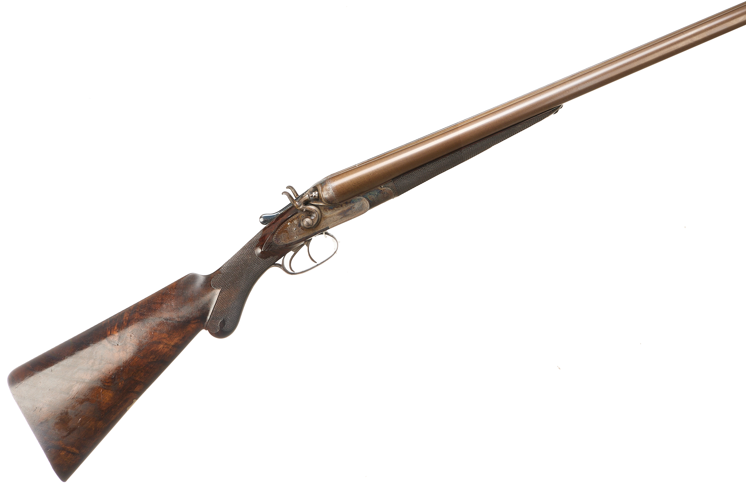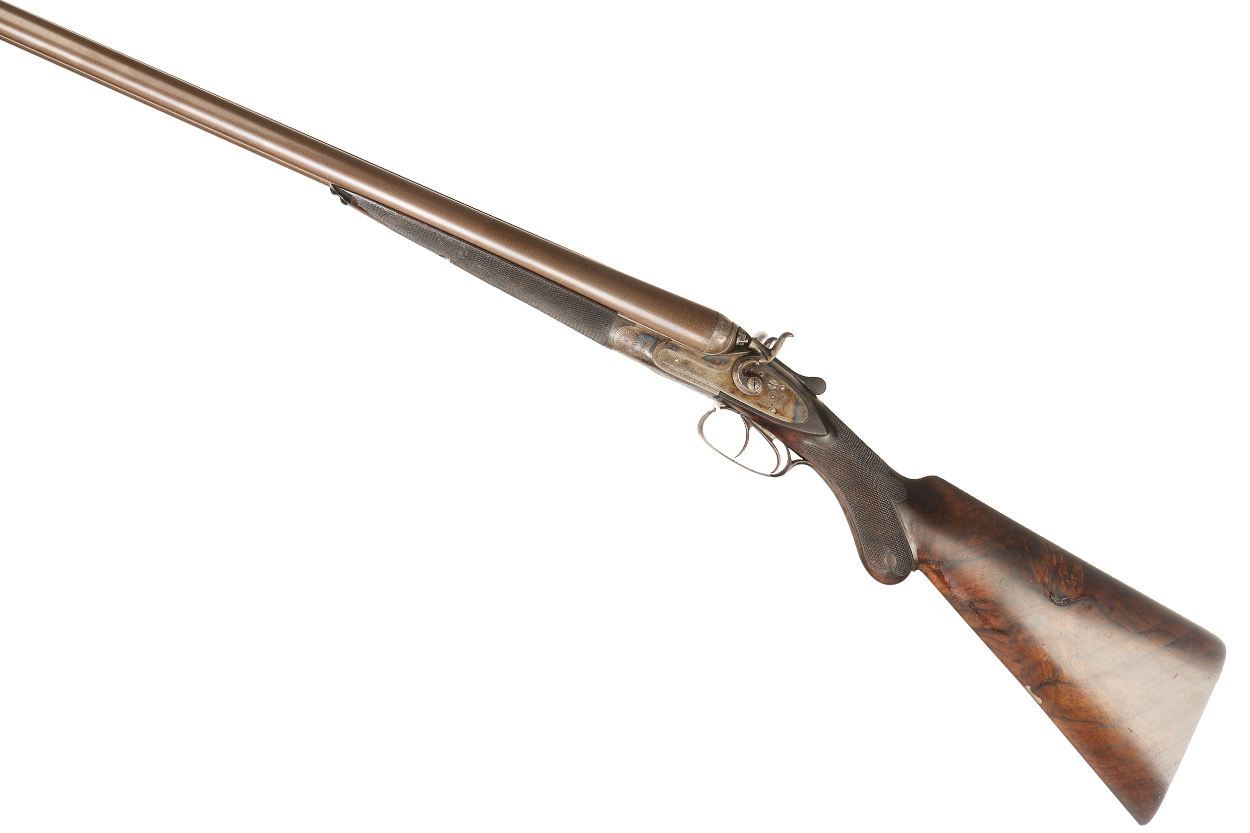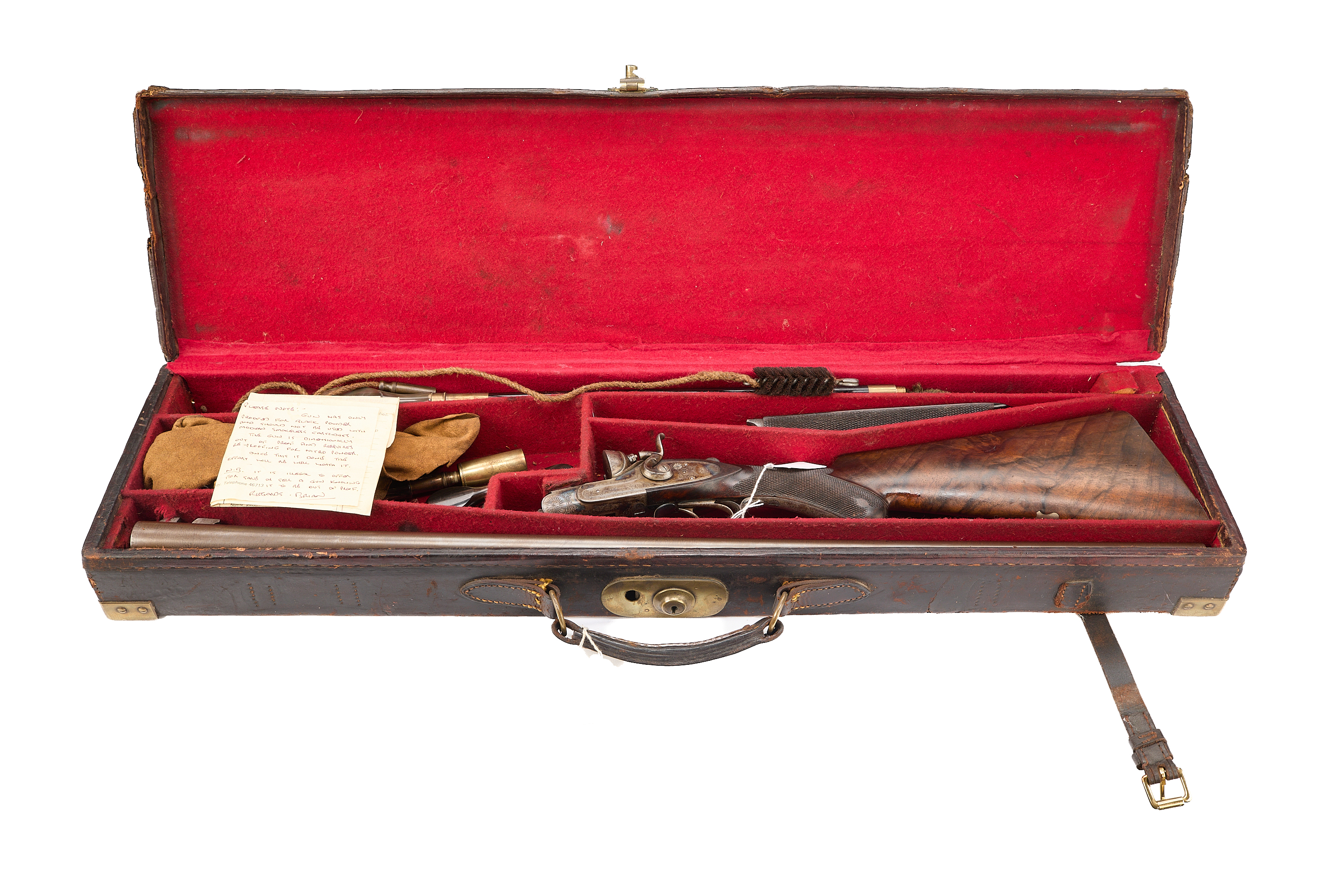 Chequered butt pad with steel heel and toe plates, richly-figured stock, chequered, rounded, semi-pistol grip and forend. The rib engraved "J WILLIAMS & CO LONDON". Carved fences, non-rebounding, hare’s ears hammers, blued top lever. Treble grip action. The plates, action and hammers all retaining much original colour. In a leather bound, brass-cornered case with accessories. Original black powder proof 1887 – 96, nitro-reproved c.1980.