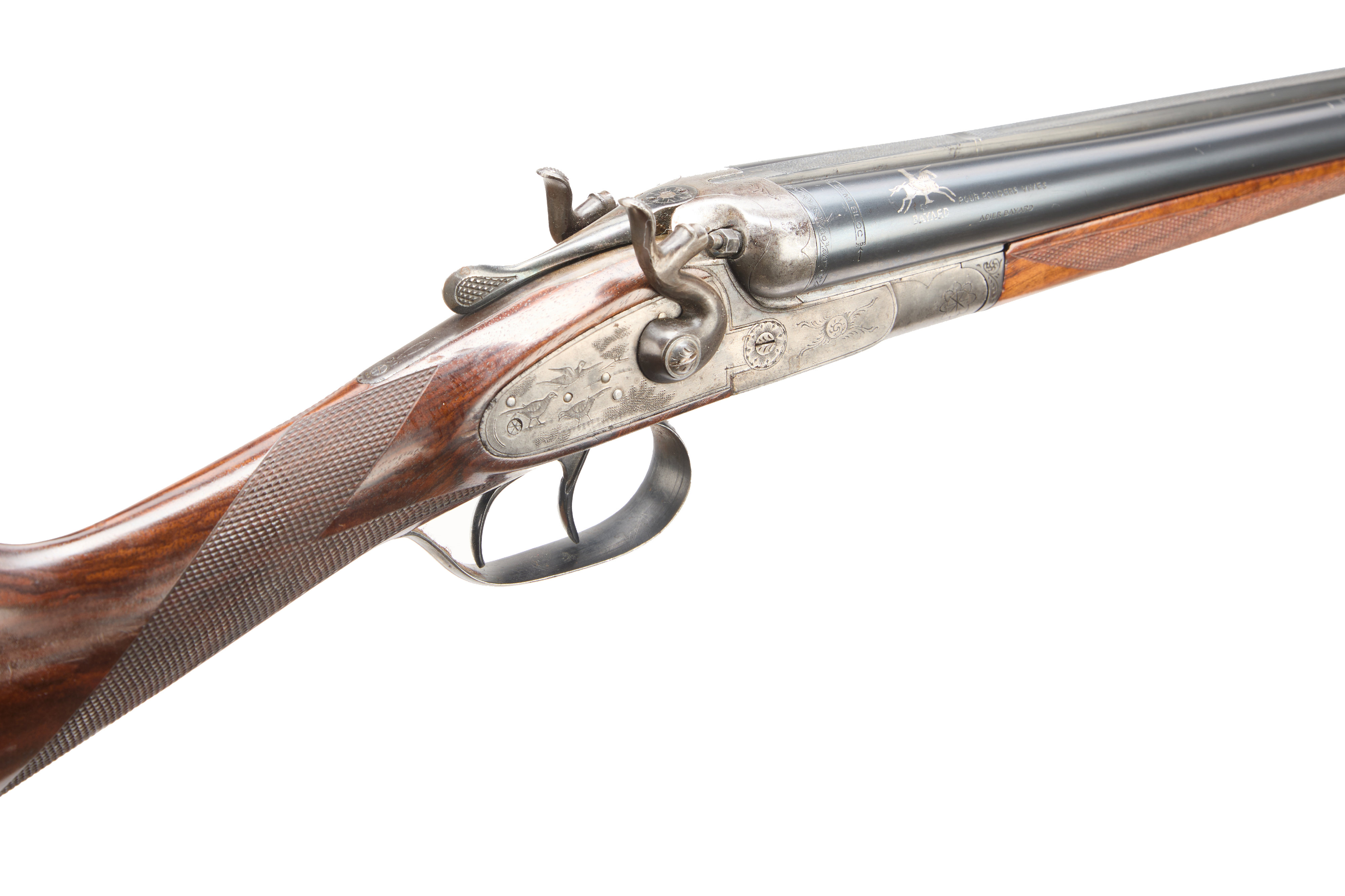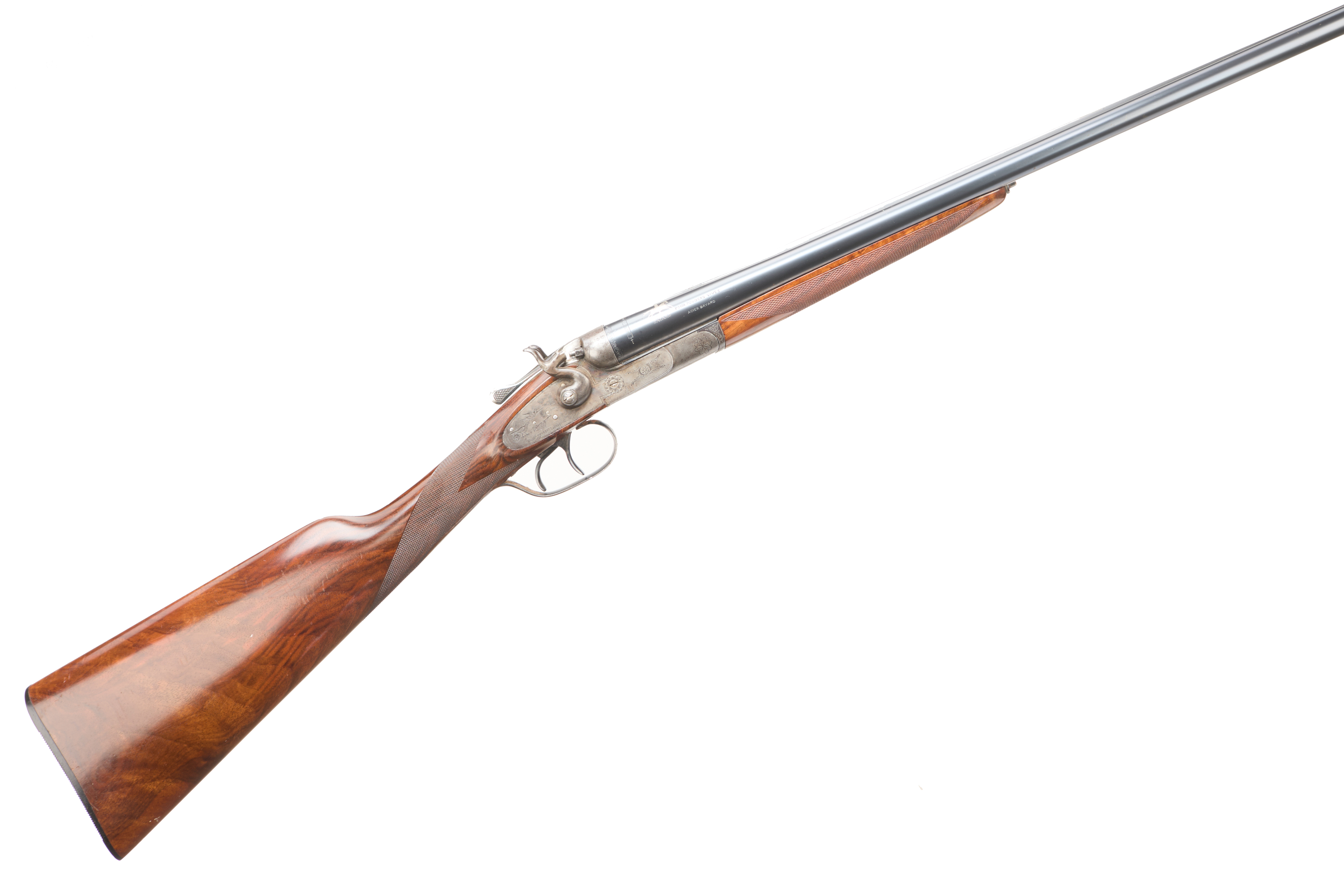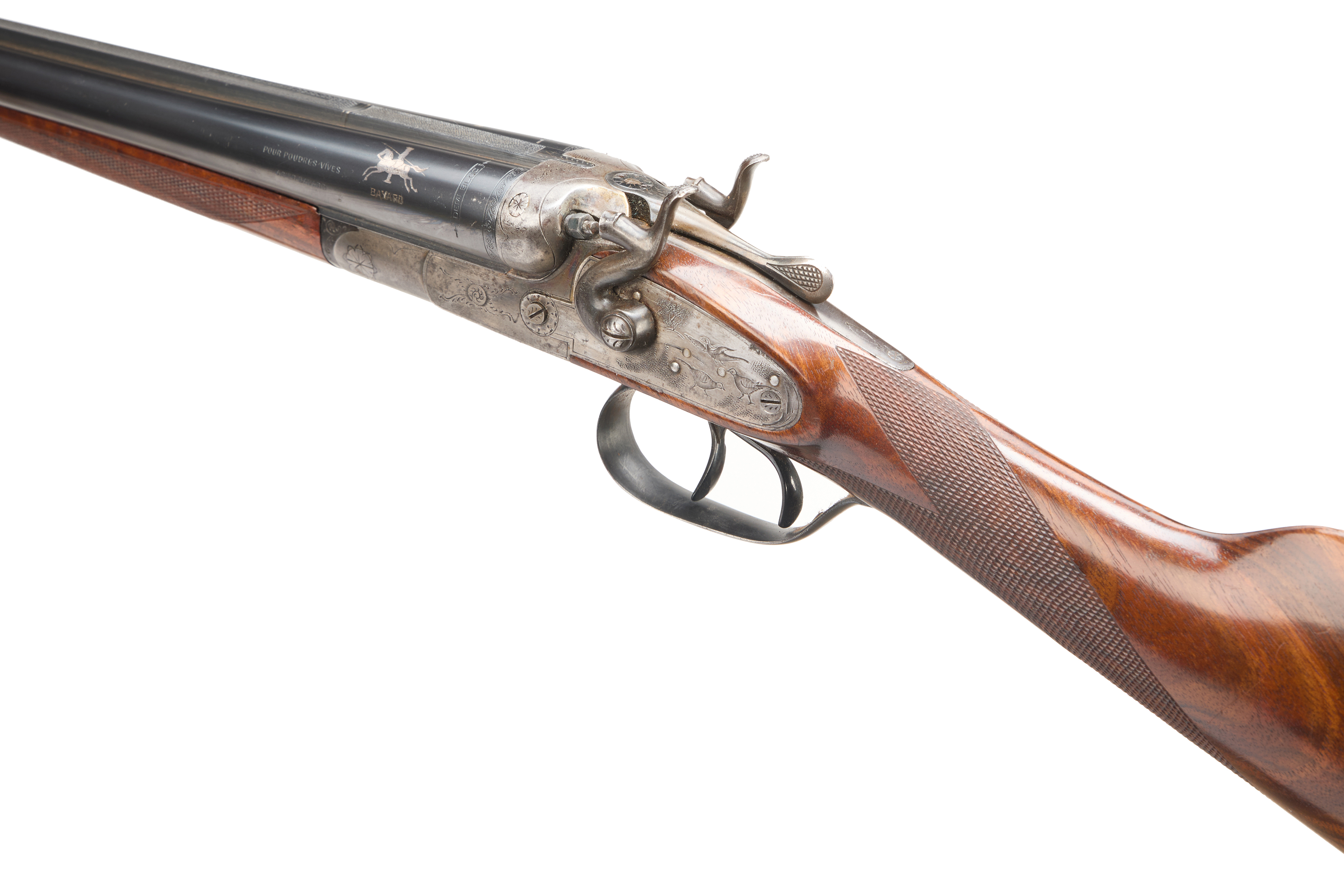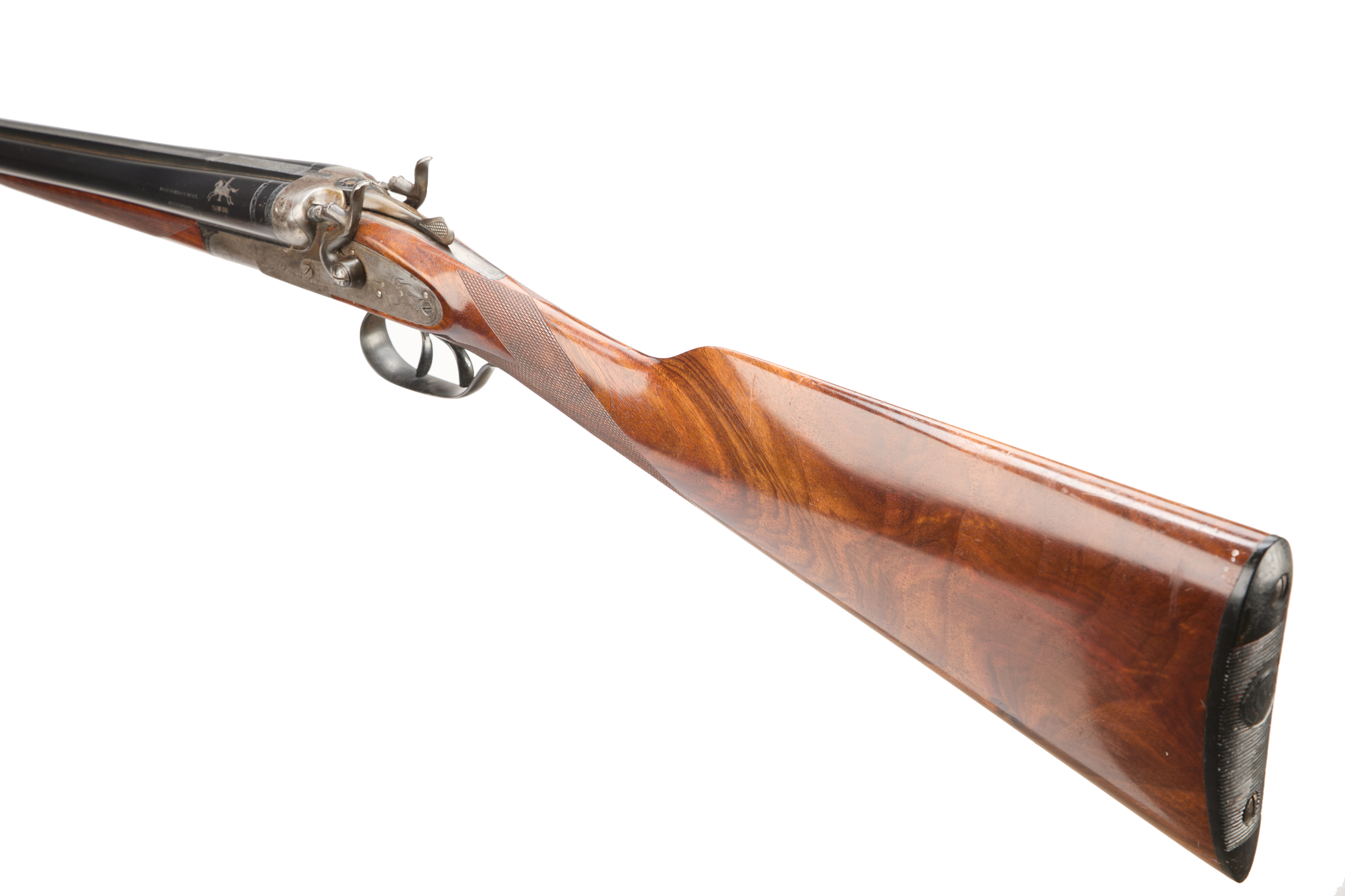 Ribbed horn butt, chequered straight grip and forend. Machine-turned rib engraved ‘ANC. ETABL. PIEPER. HERSTAL. BELGIQUE.’ Platinum inlay of trademark of mounted pikeman. Tubes stamped ‘POUR POUDRE VIVES’, to the breech end stamped ‘DEMI-BLOC’. Cross-bolt extension, back action with non-rebounding locks with naive avian engraving. For 1938. Chambers 65mm