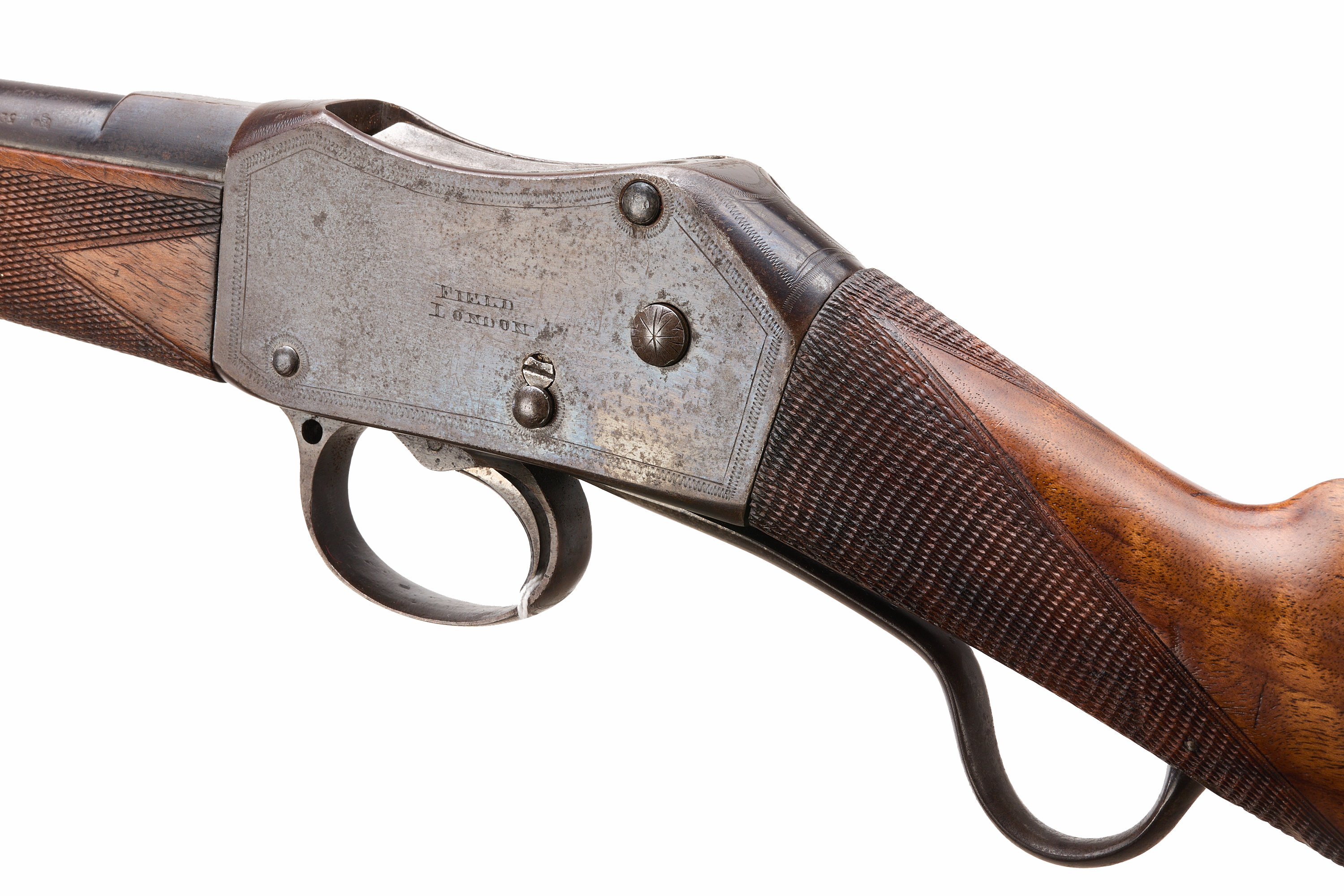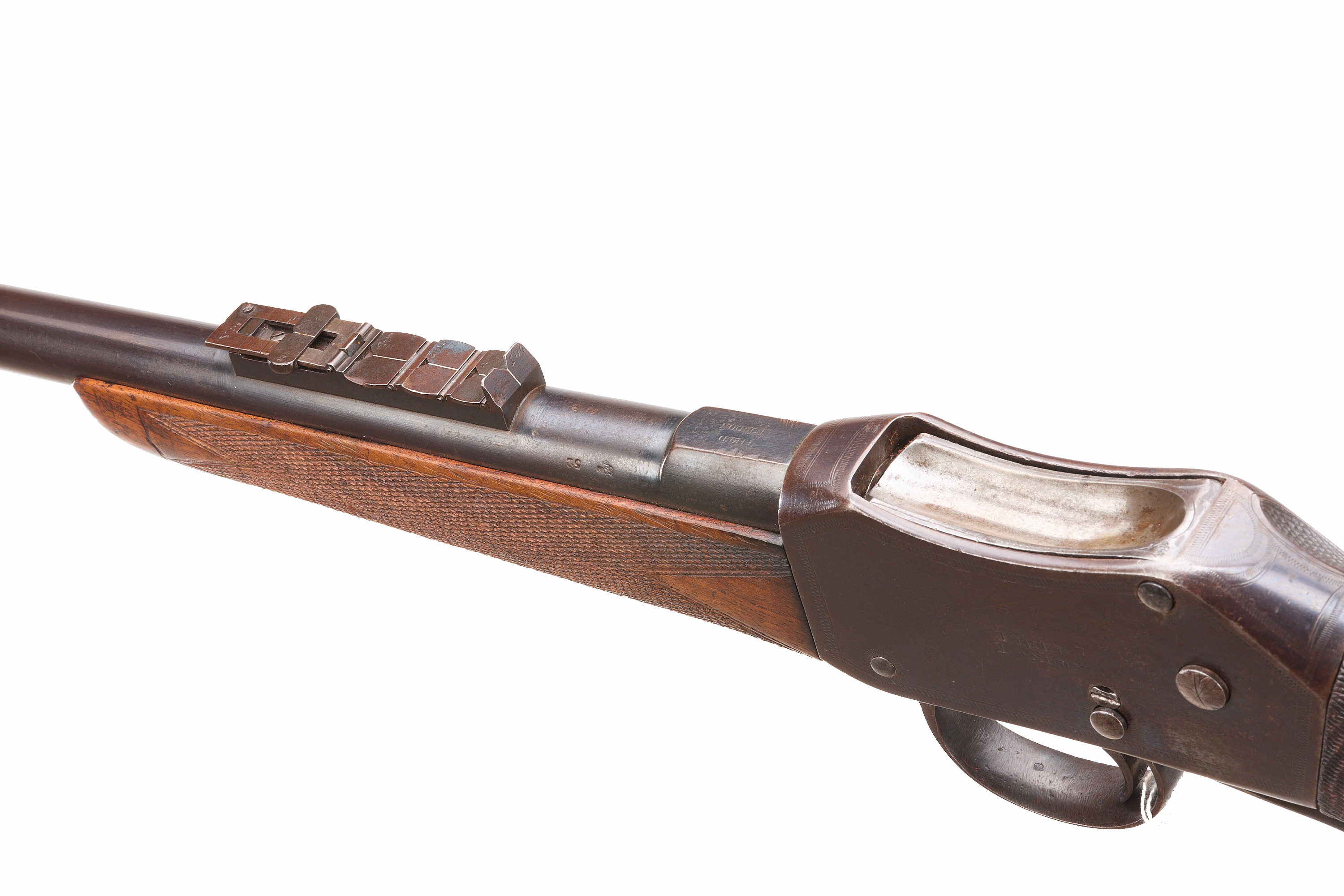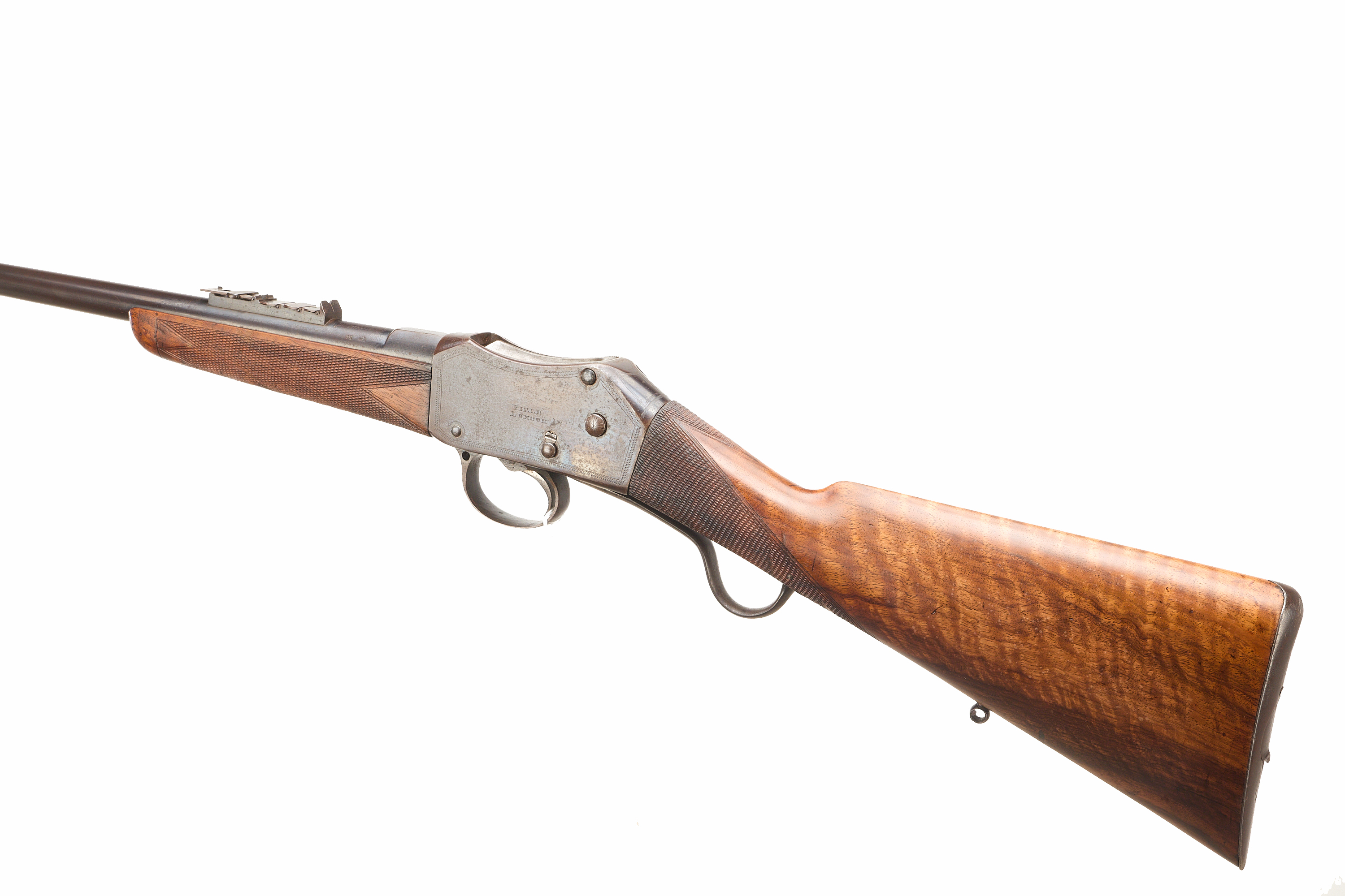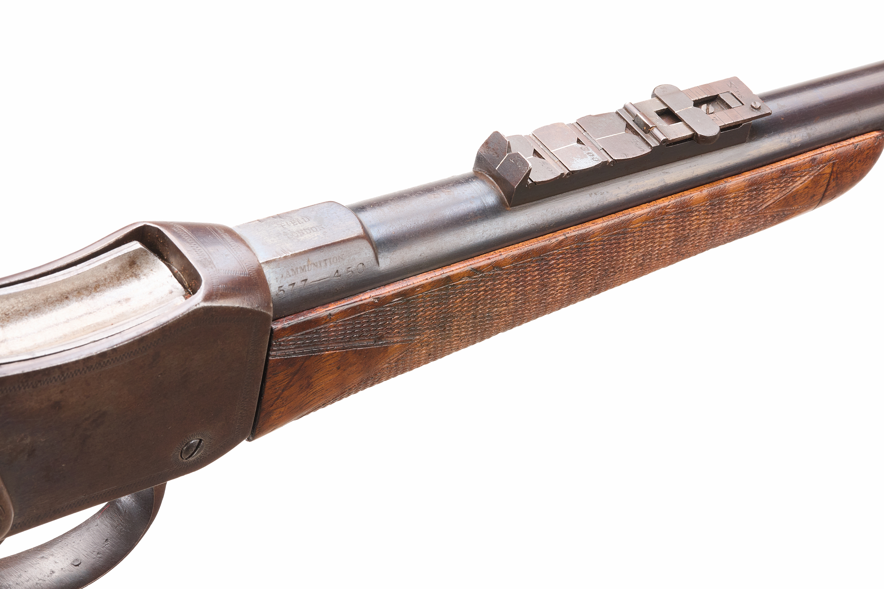 Steel butt with trap door, replaced, nicely figured stock, chequered straight grip and forend. Sling attachments, protected, post foresight, ladder and cape rearsights. The nock’s form engraved ‘FIELD LONDON’ , ‘AMMUNITION 577 – 450’ to the side. The action engraved ‘FIELD LONDON’ with simple border engraving. Barrel 20 5/8"