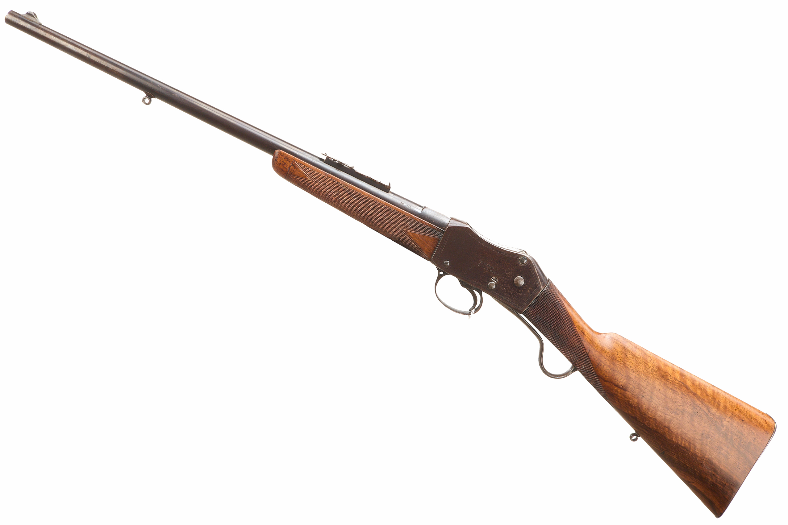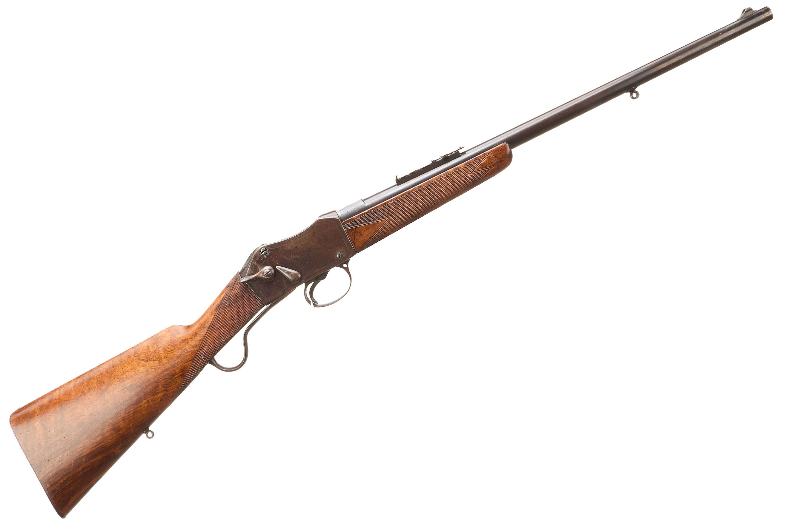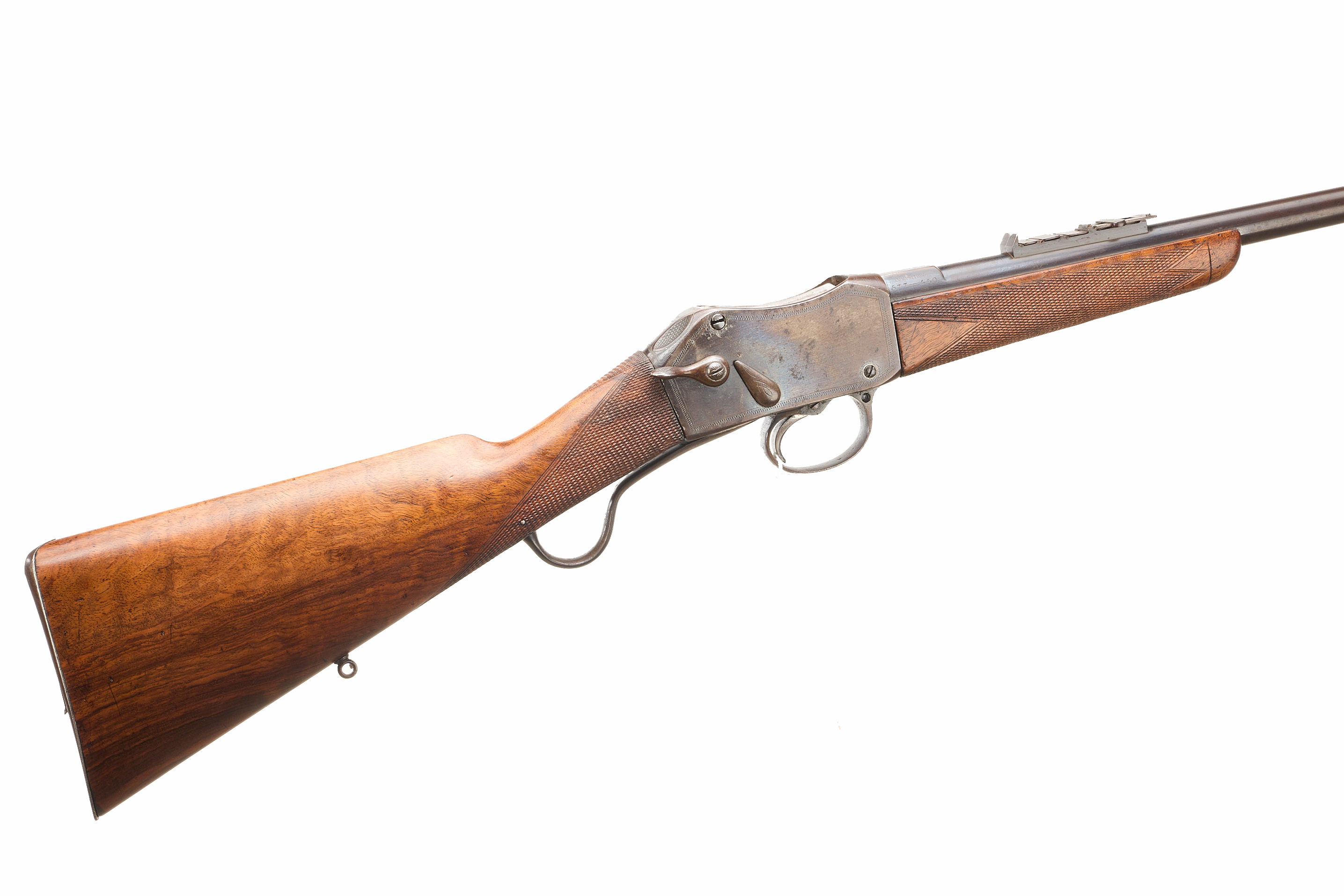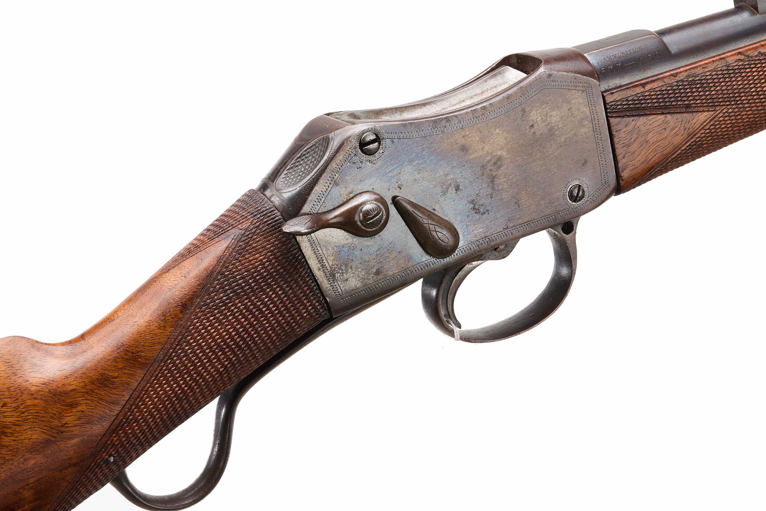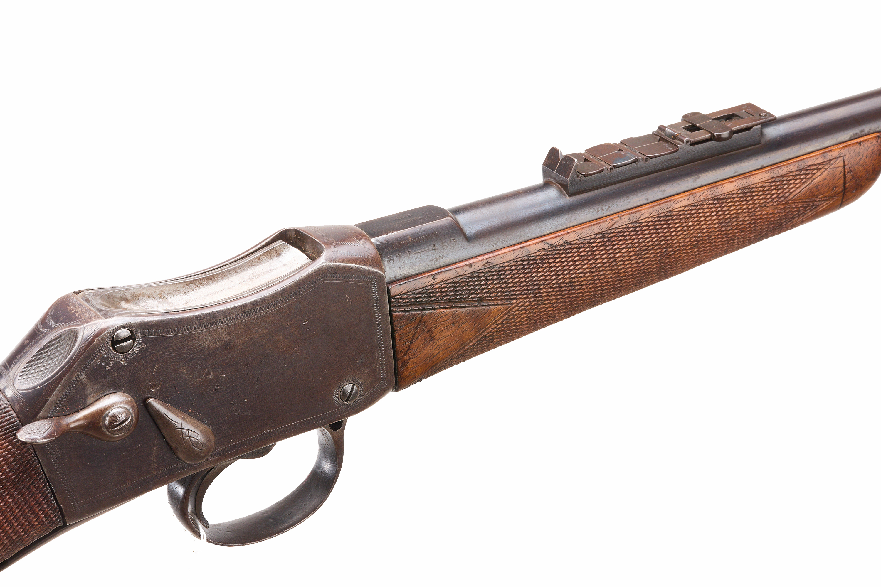 Steel butt with trap door, replaced, nicely figured stock, chequered straight grip and forend. Sling attachments, protected, post foresight, ladder and cape rearsights. The nock’s form engraved ‘FIELD LONDON’ , ‘AMMUNITION 577 – 450’ to the side. The action engraved ‘FIELD LONDON’ with simple border engraving. Barrel 20 5/8"