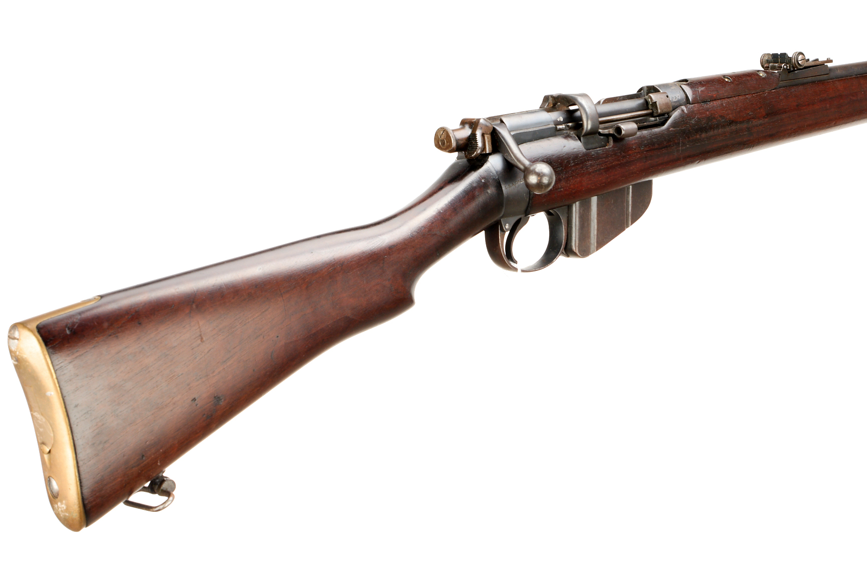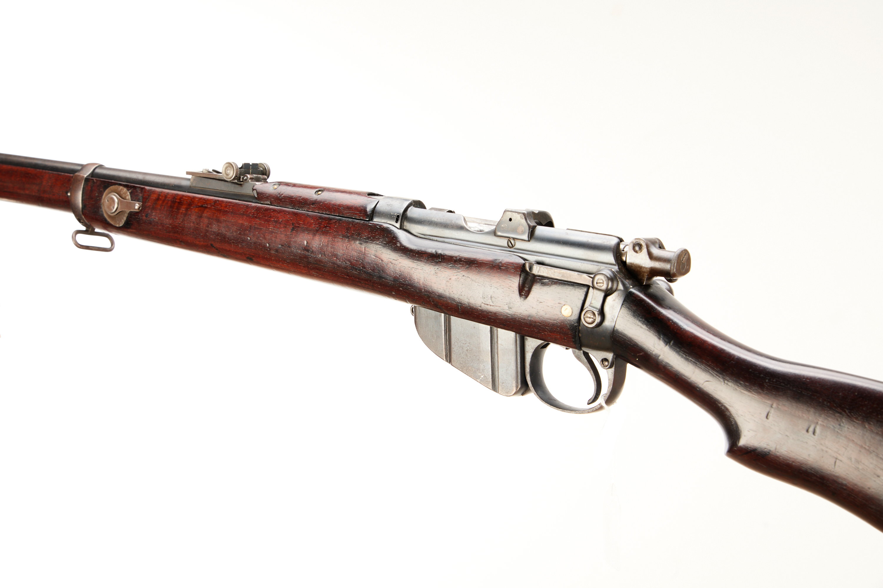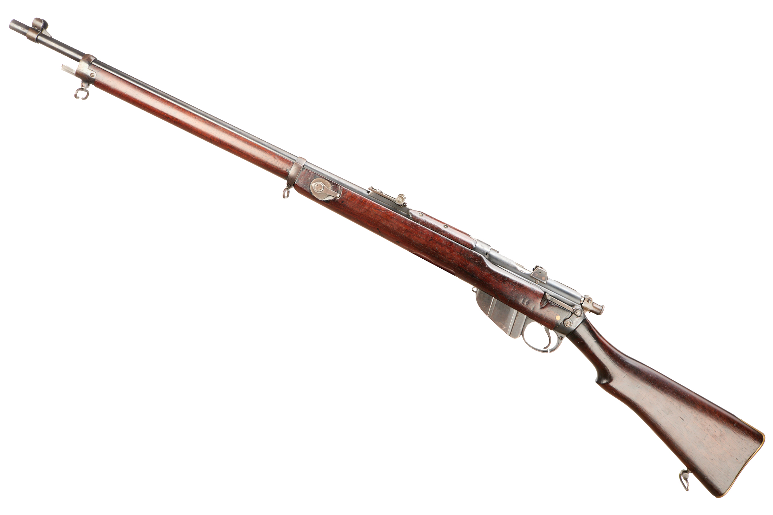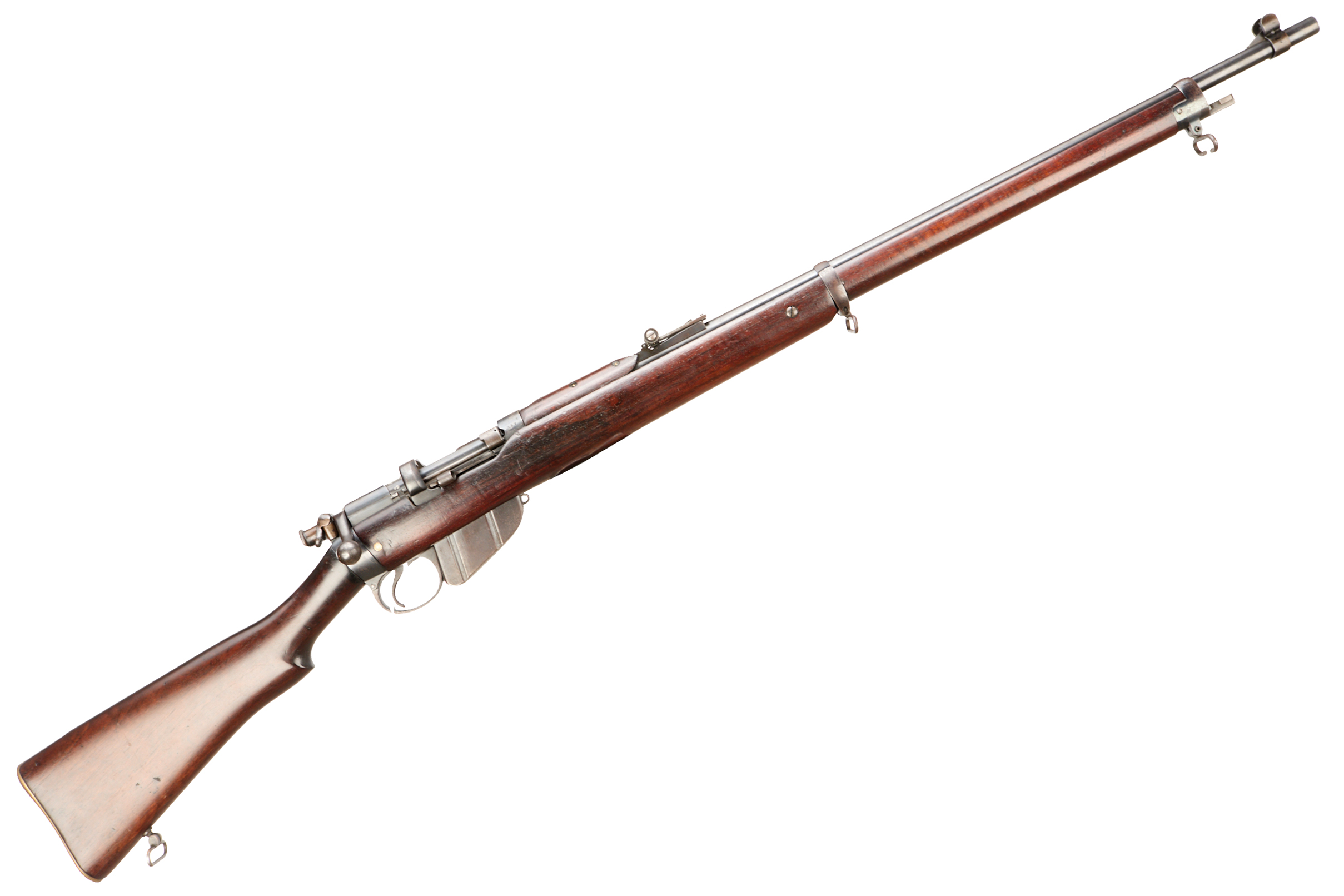 Brass buttplate with compartment cover, half full length stock, sling swivels, post foresight with reduced protectors, ladder rear sight. Breech top cover, magazine cut-off, volley sights. CW detachable box magazine. Country of manufacture: UK,