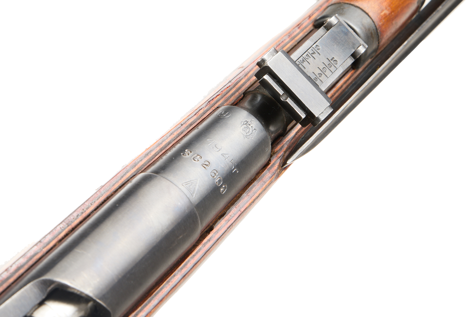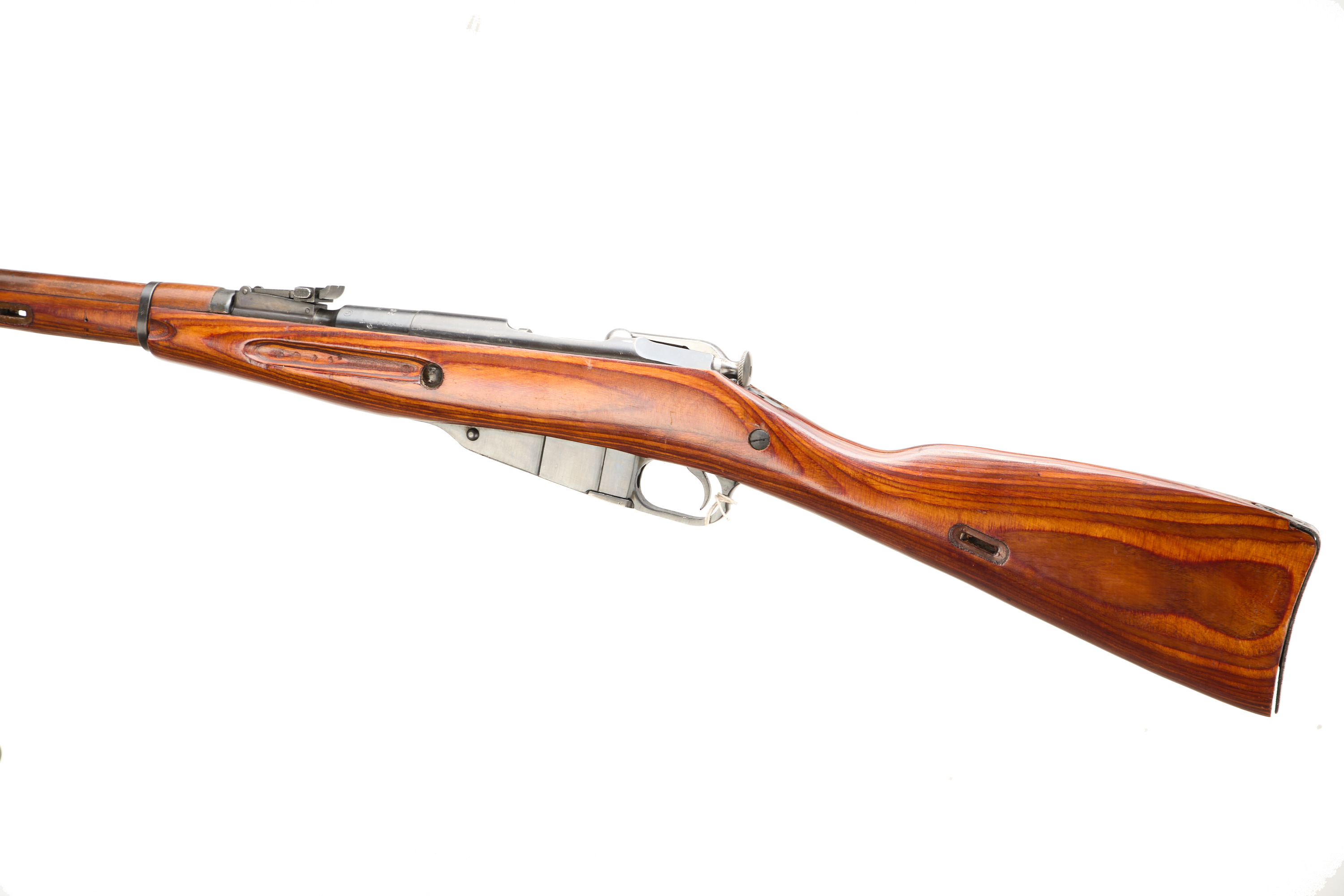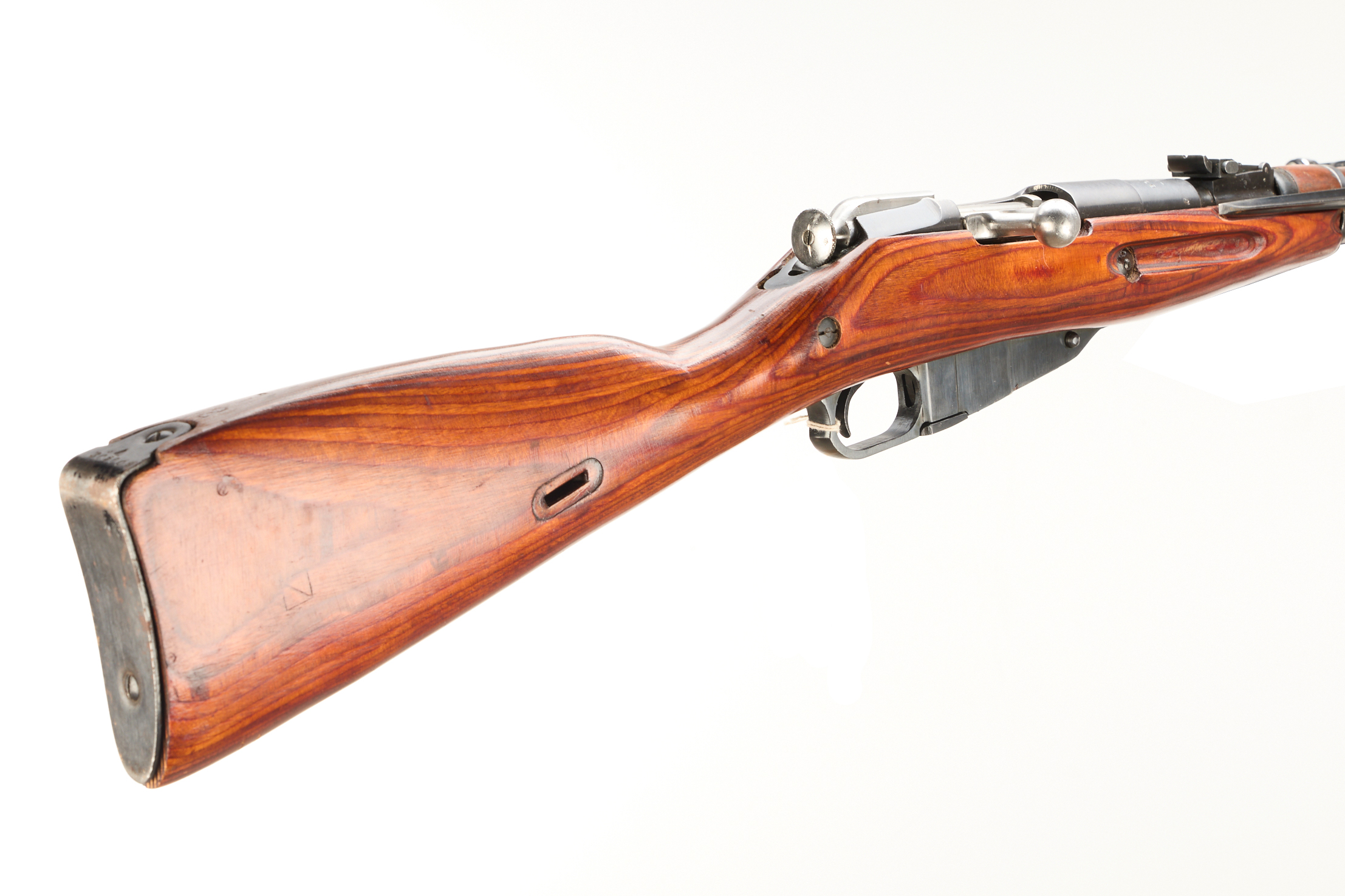A model M44, for 1945, produced in Izhevsk Arsenal, all matching numbers. Steel butt plate, plywood stock with front and rear sling mounting points. Ladder rear sight, hooded post front sight. Country of manufacture: Soviet Union