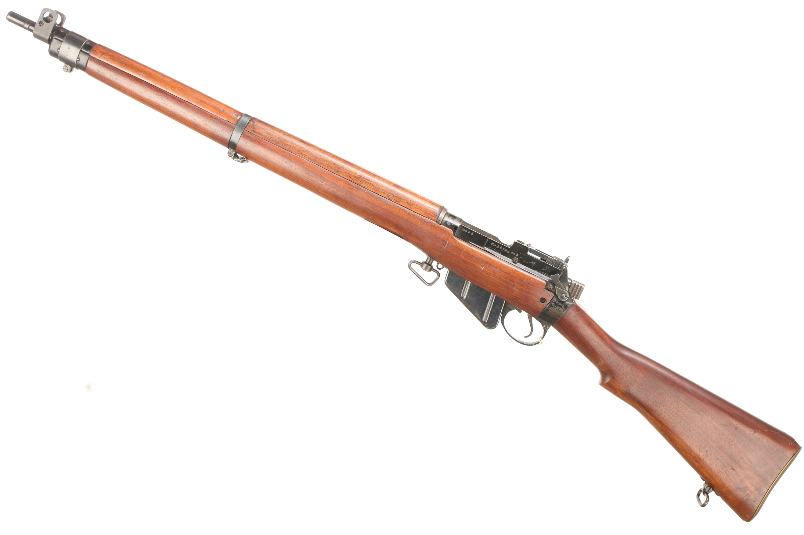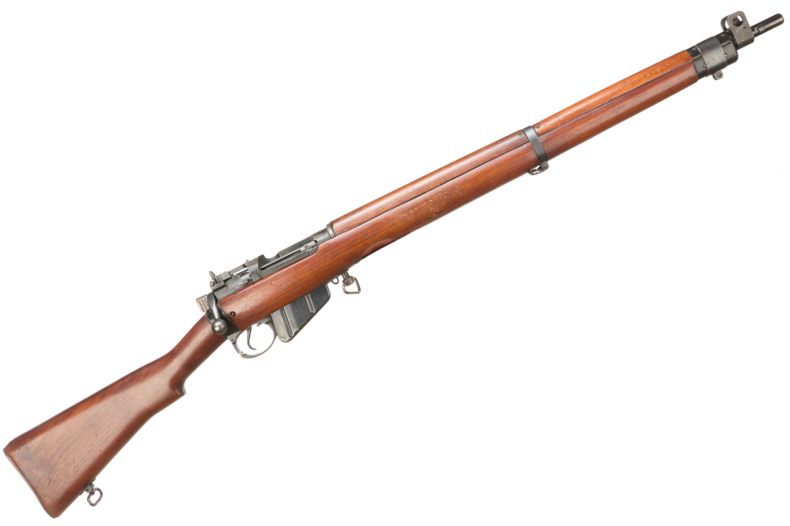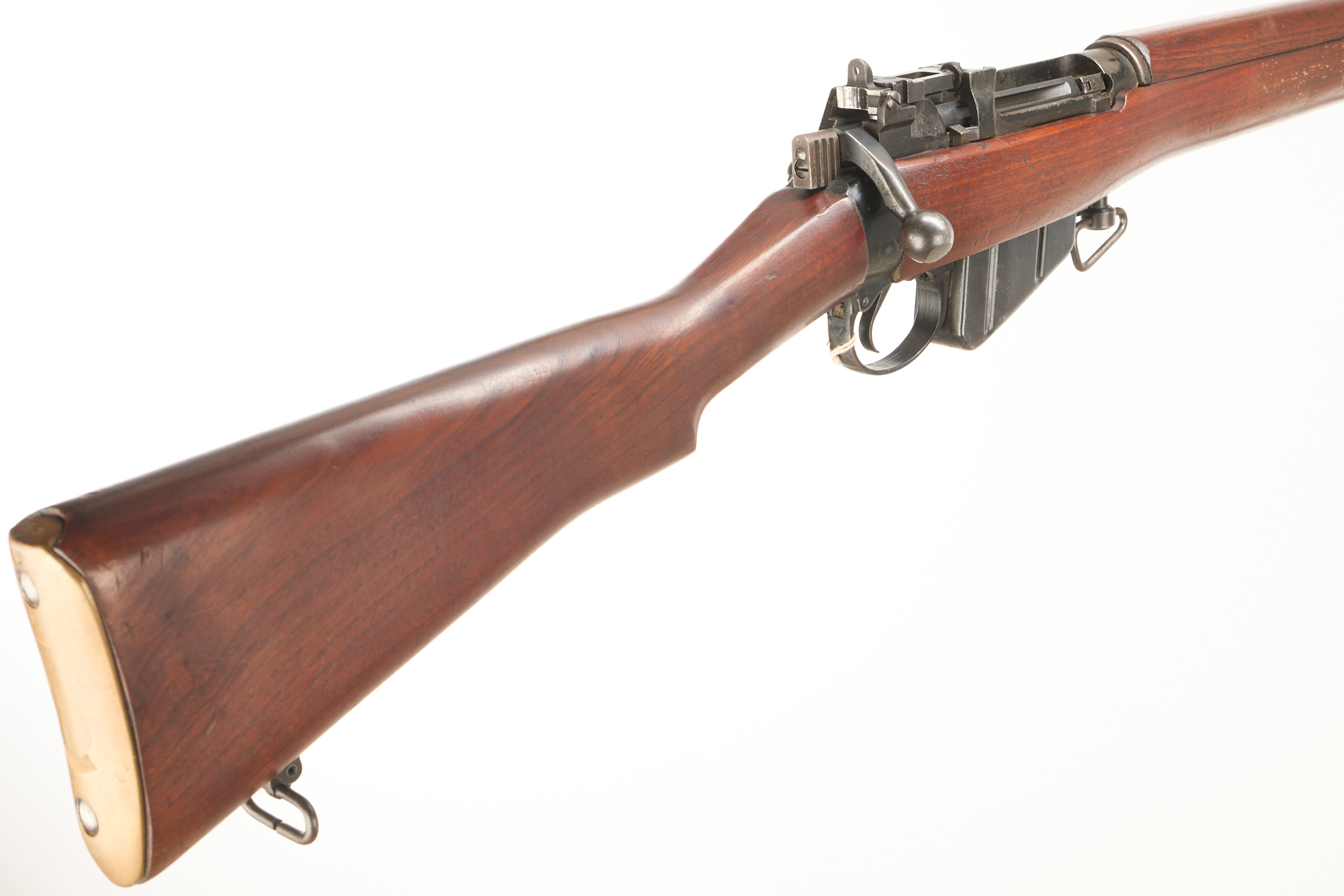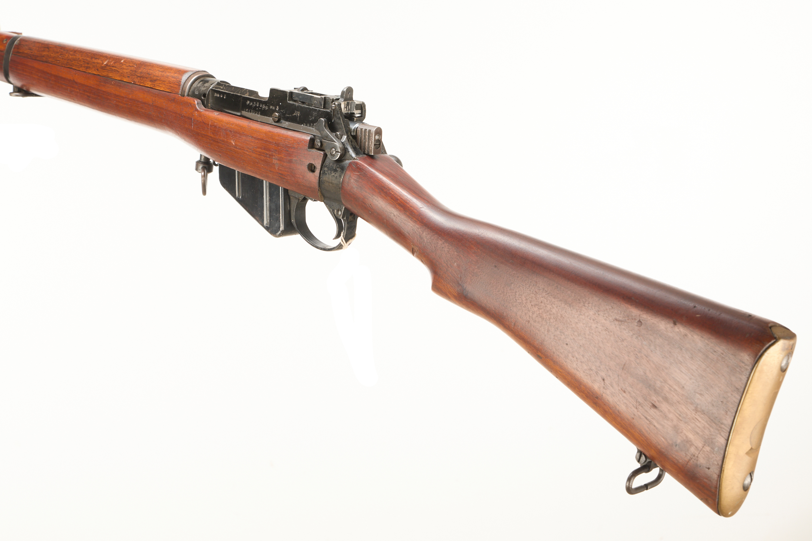 Brass buttplate with compartment cover, full length stock, sling swivels, post foresight with protectors, tangential rear sight. CW detachable box magazine. Non- matching serial numbers. Country of manufacture: UK