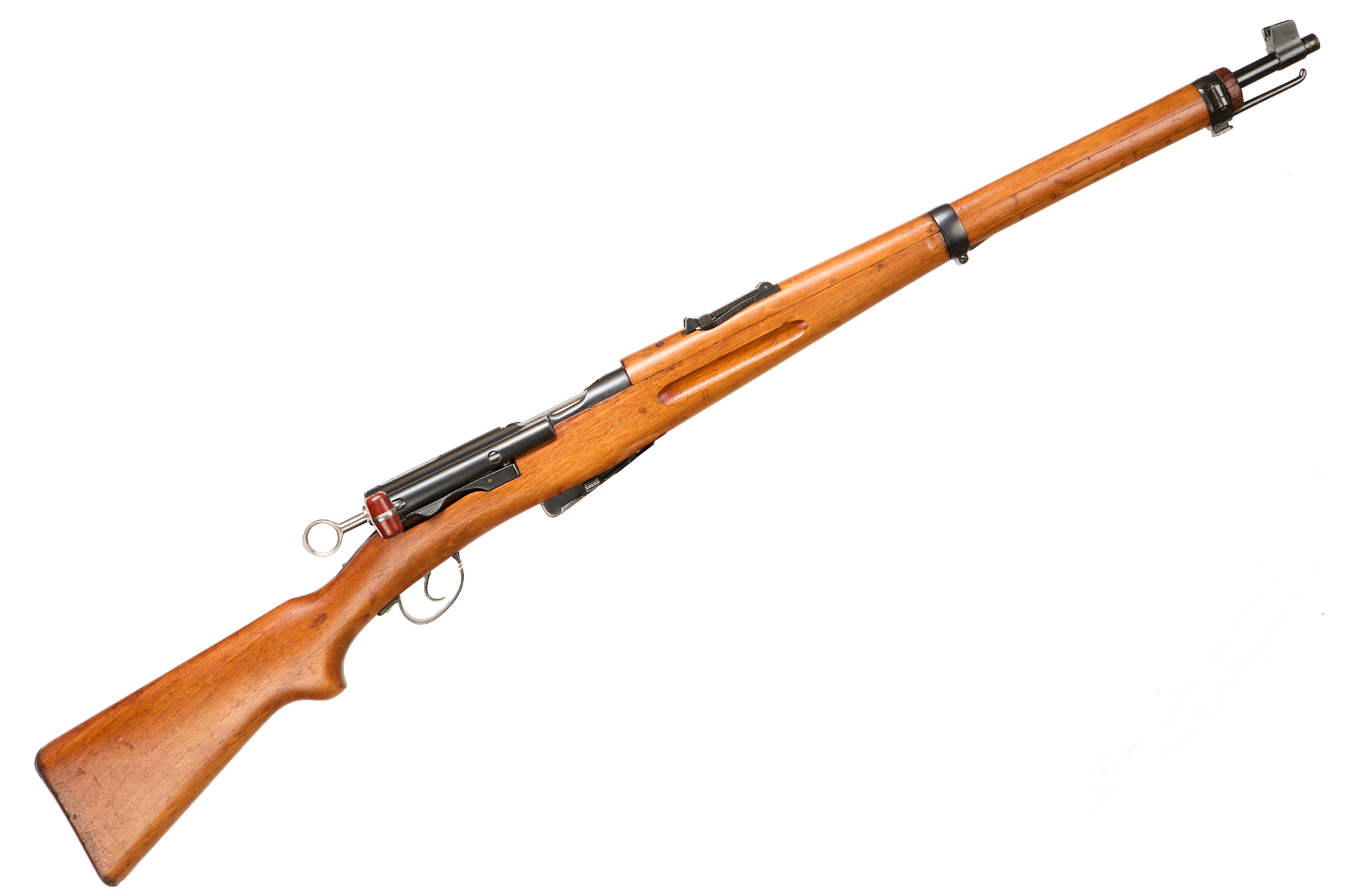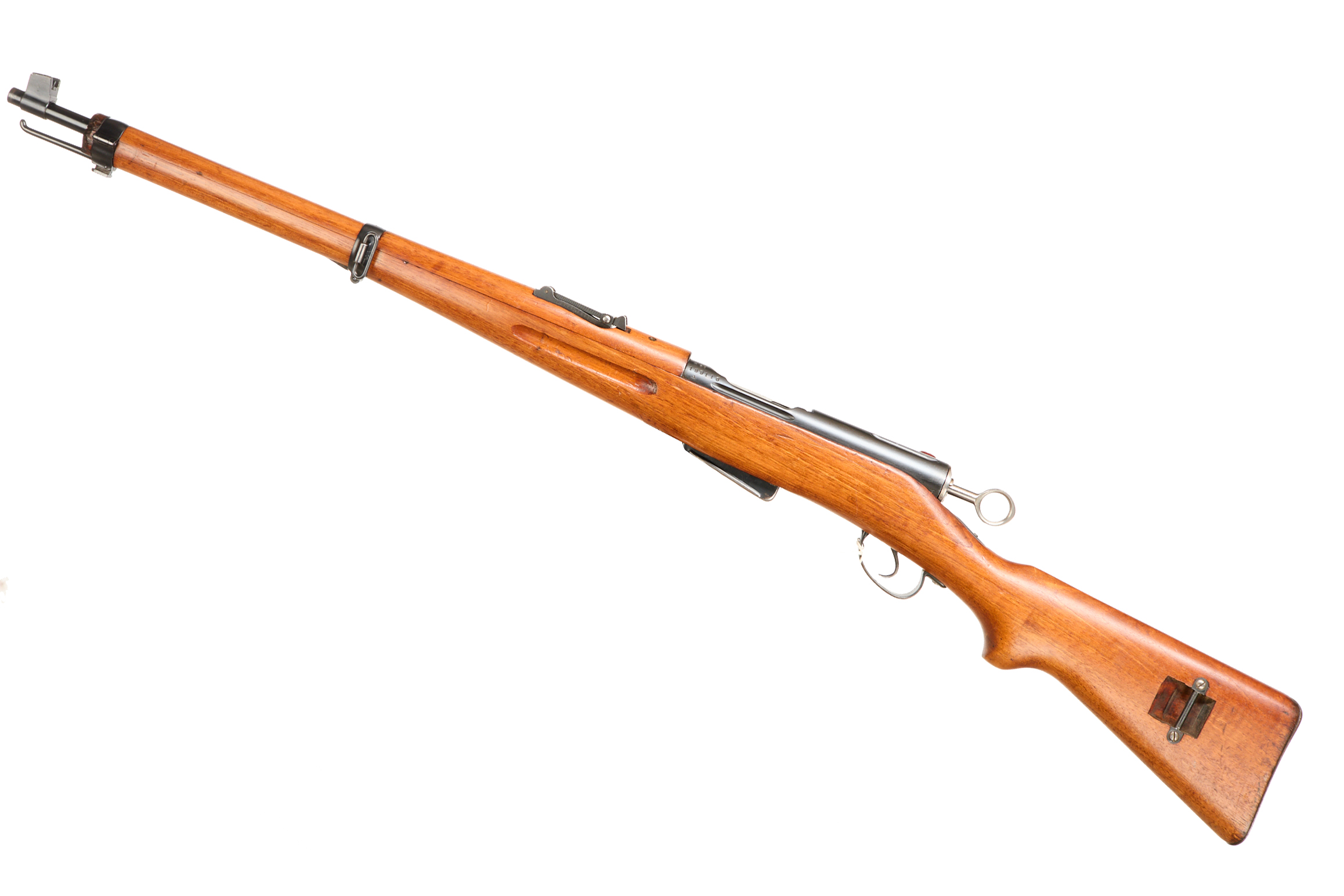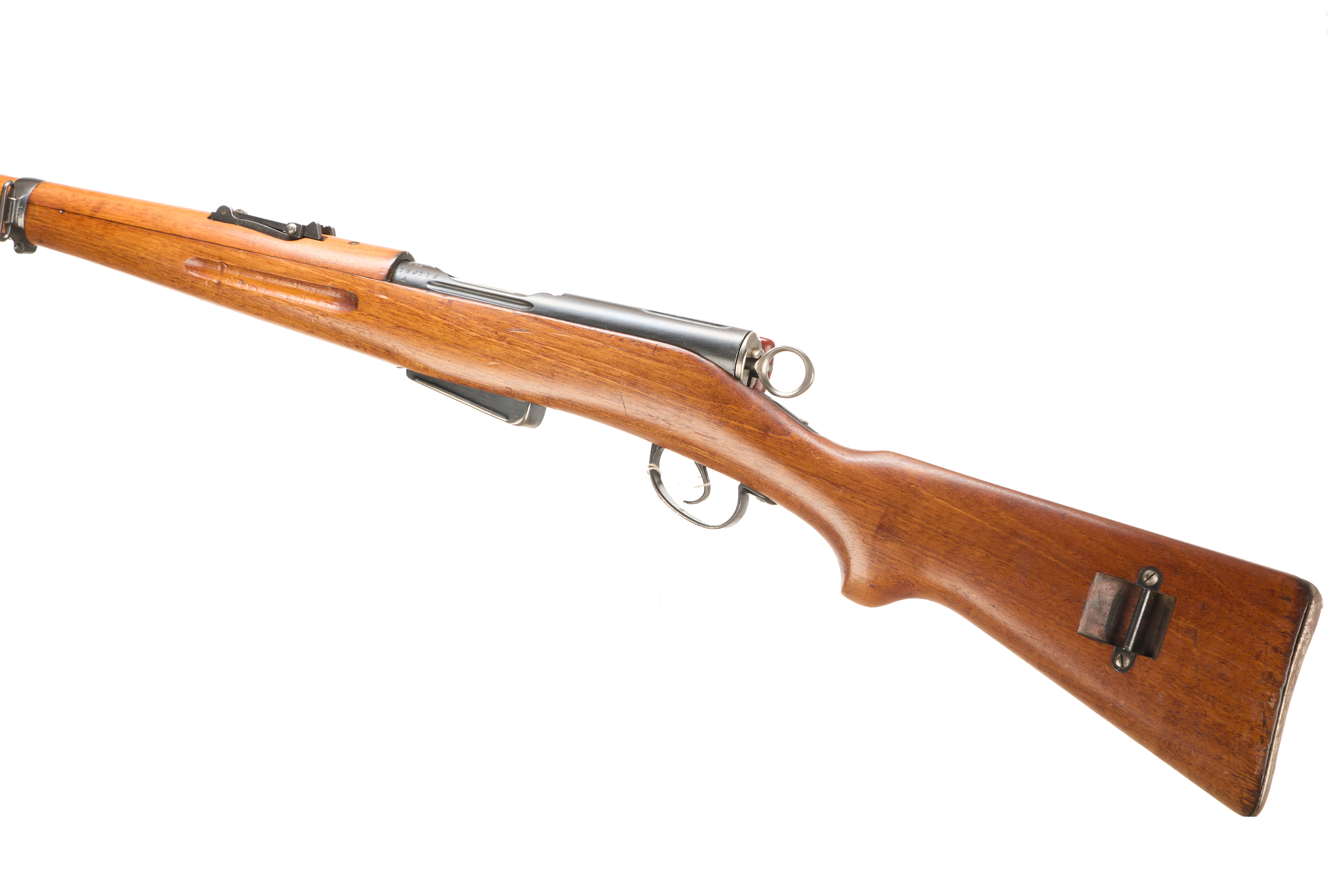 Metal buttplate, sling attachment, full length stock, barrel band with additional sling swivel. Bayonet lug, adjustable post foresight with protectors, ramp rearsight to 1500m. Matching serial numbers. CW detachable magazine. Country of manufacture: Switzerland