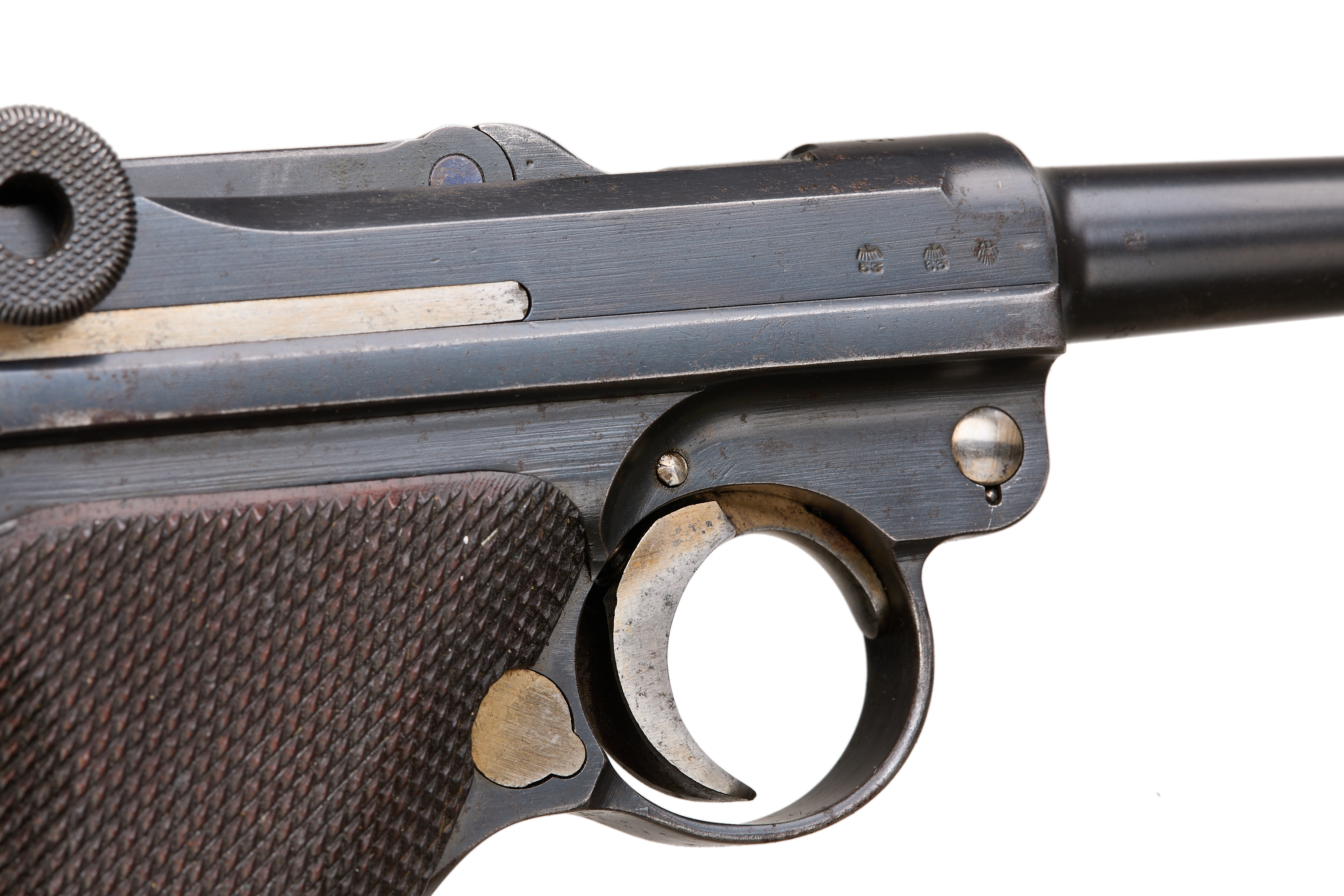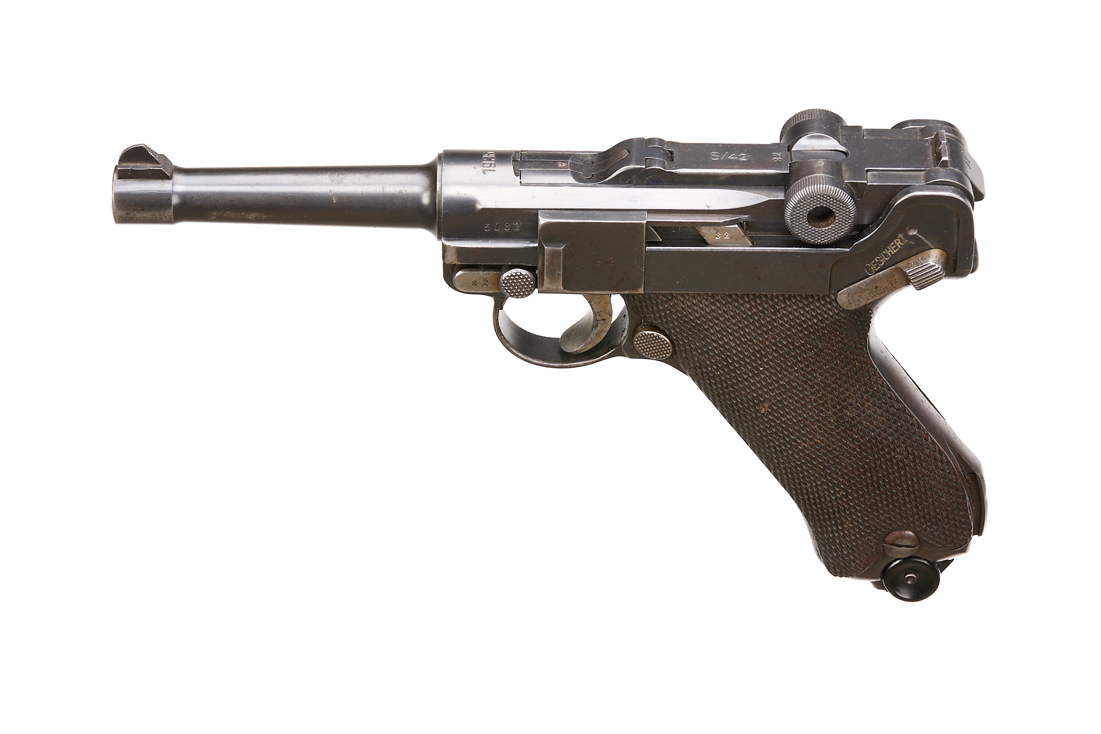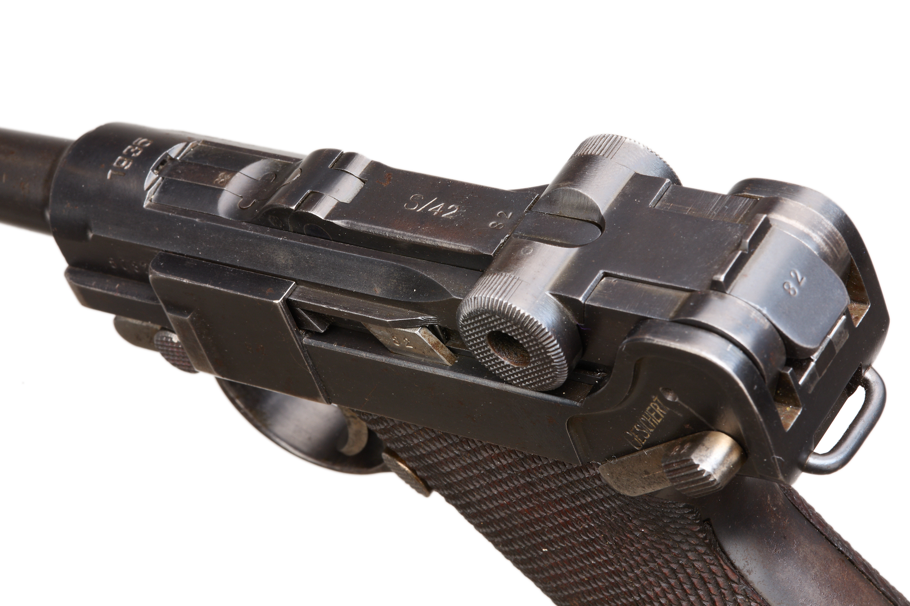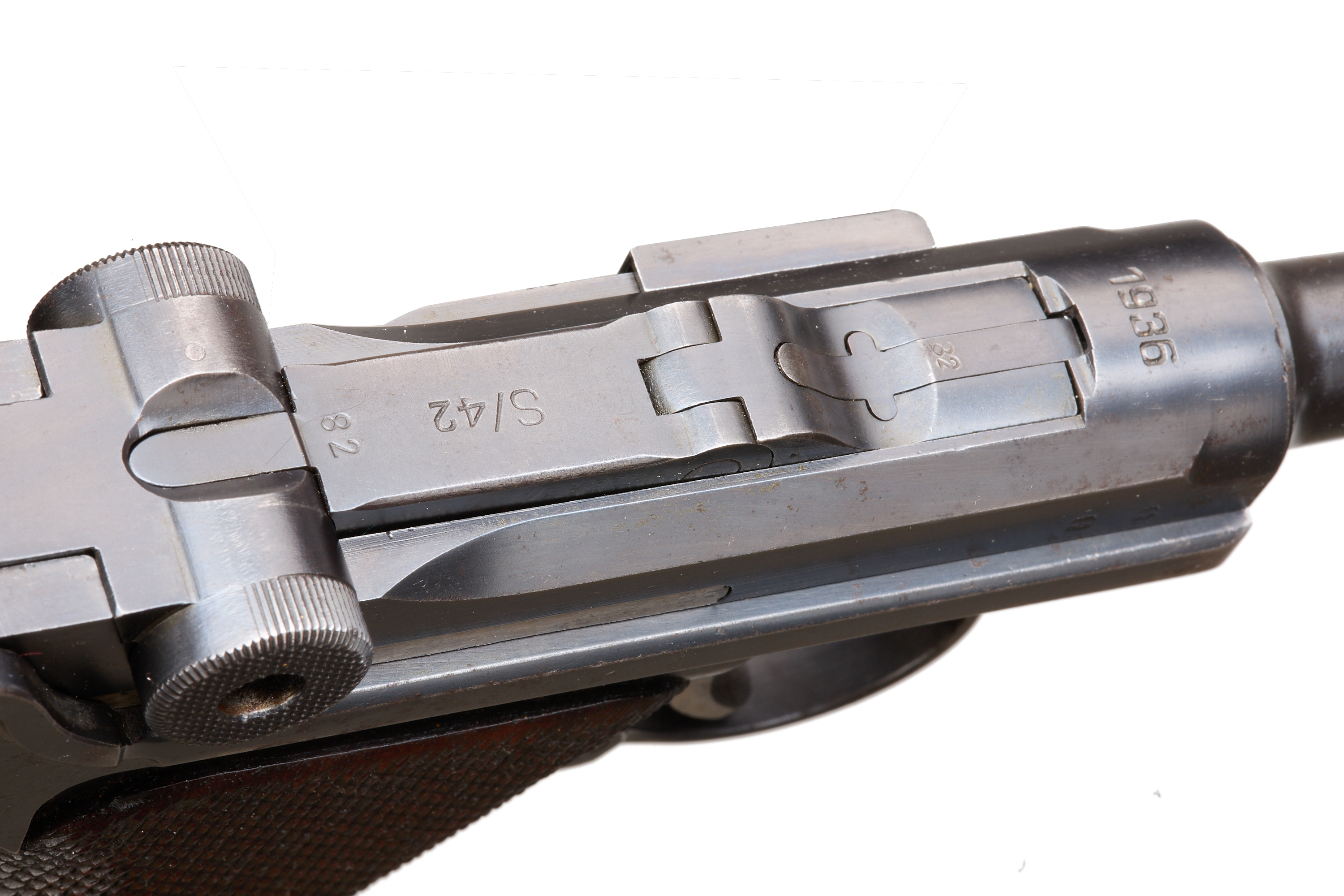 Chequered walnut grips, blued 4in. barrel, dove-tailed fore-sight, fixed notch rear-sight to rear of toggle assembly, the breech dates ‘1936’, toggle-link marked ‘S/42’, blued action and frame, all matching numbers, issue leather holster with Waffenamt stamps, spare magazine and stripping tool. For 1936.