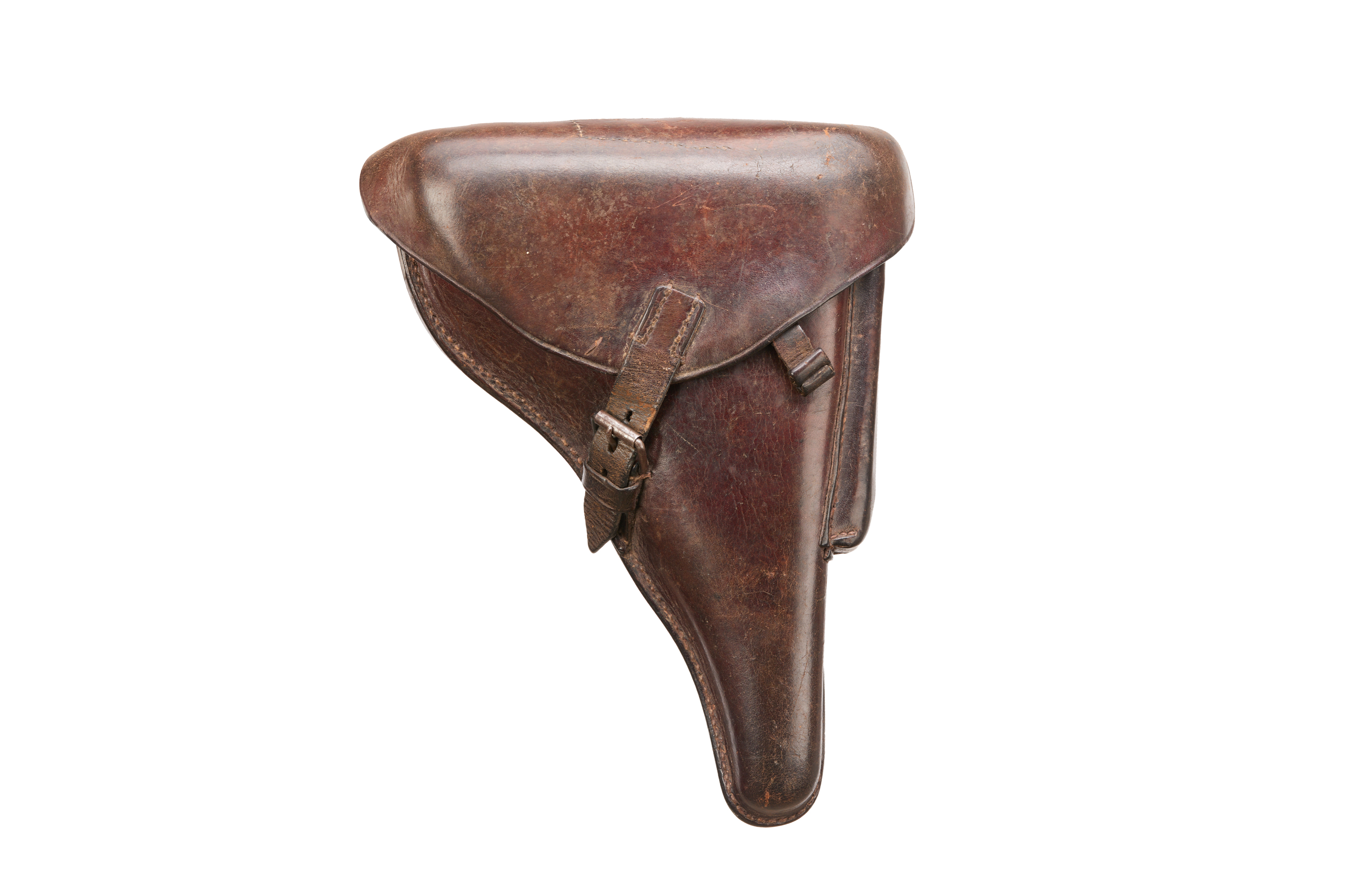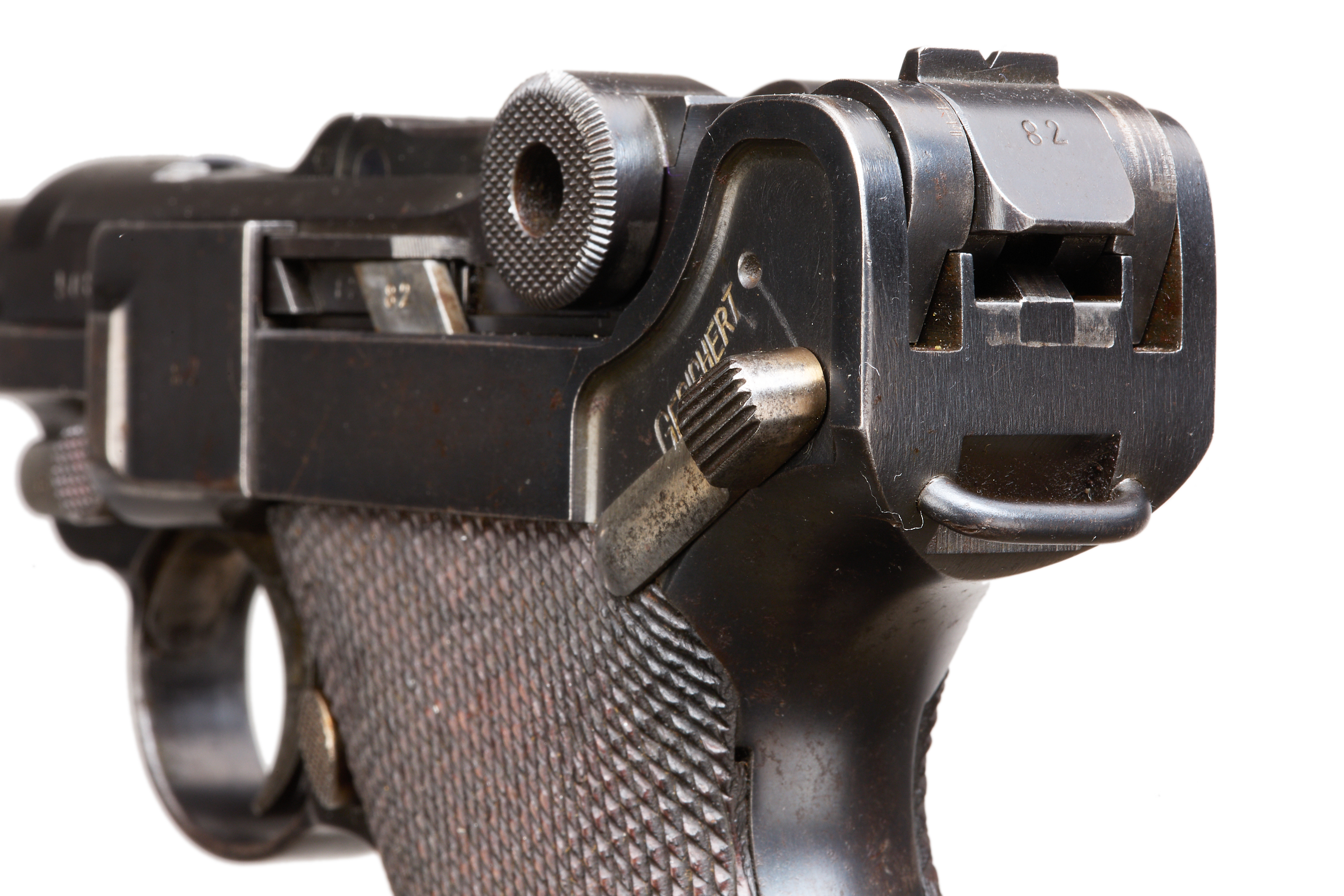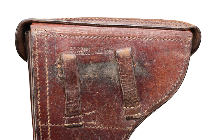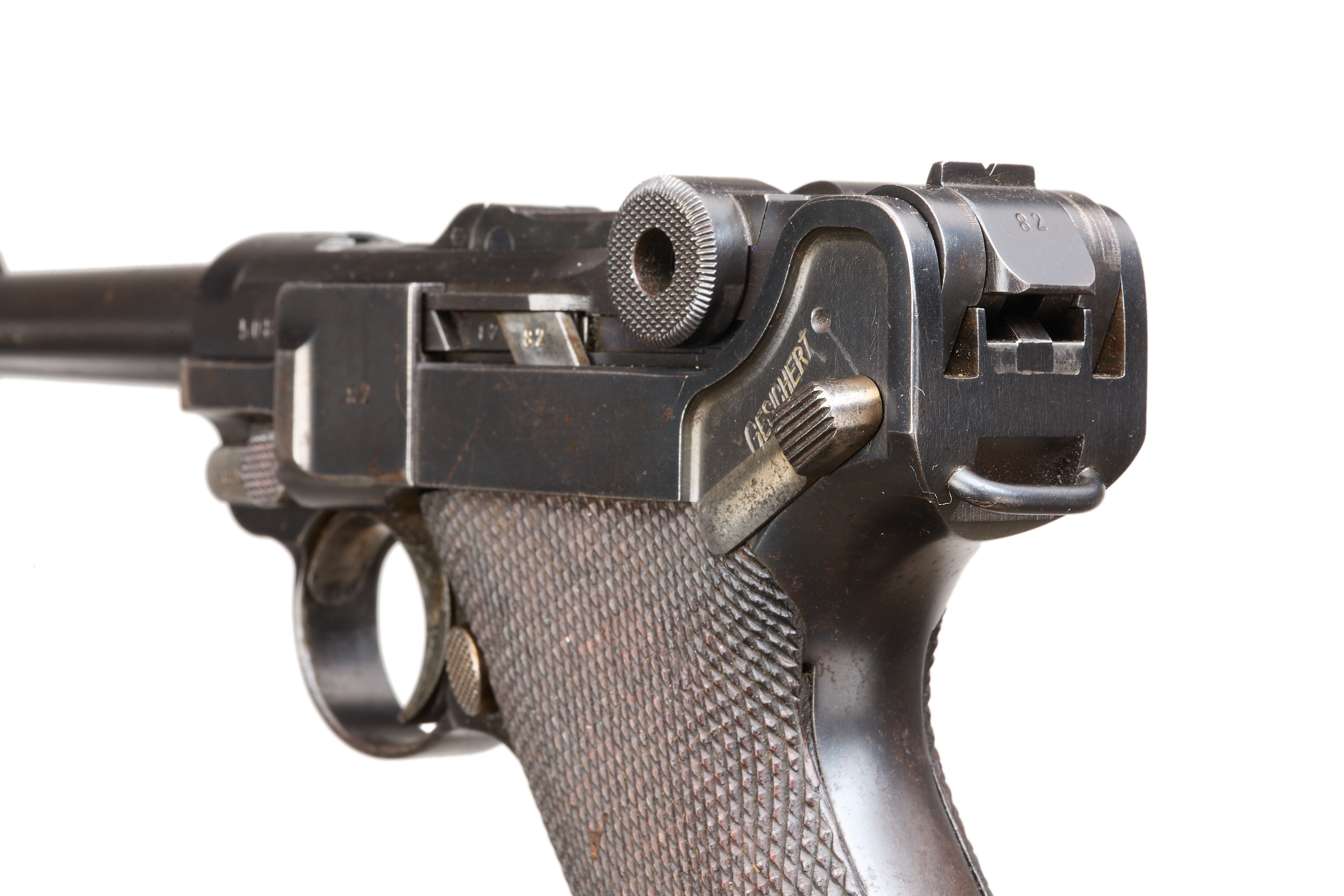 Chequered walnut grips, blued 4in. barrel, dove-tailed fore-sight, fixed notch rear-sight to rear of toggle assembly, the breech dates ‘1936’, toggle-link marked ‘S/42’, blued action and frame, all matching numbers, issue leather holster with Waffenamt stamps, spare magazine and stripping tool. For 1936.