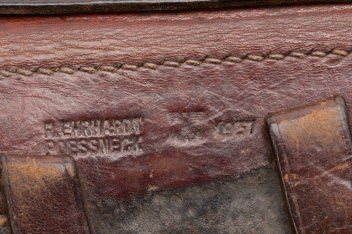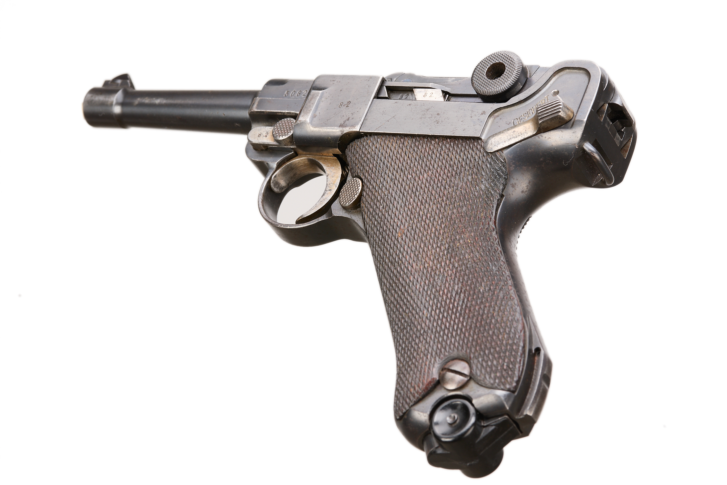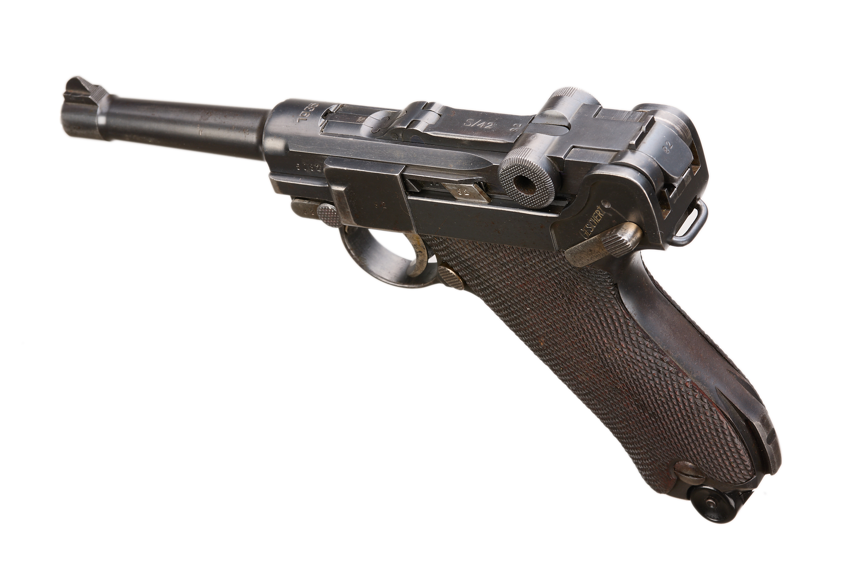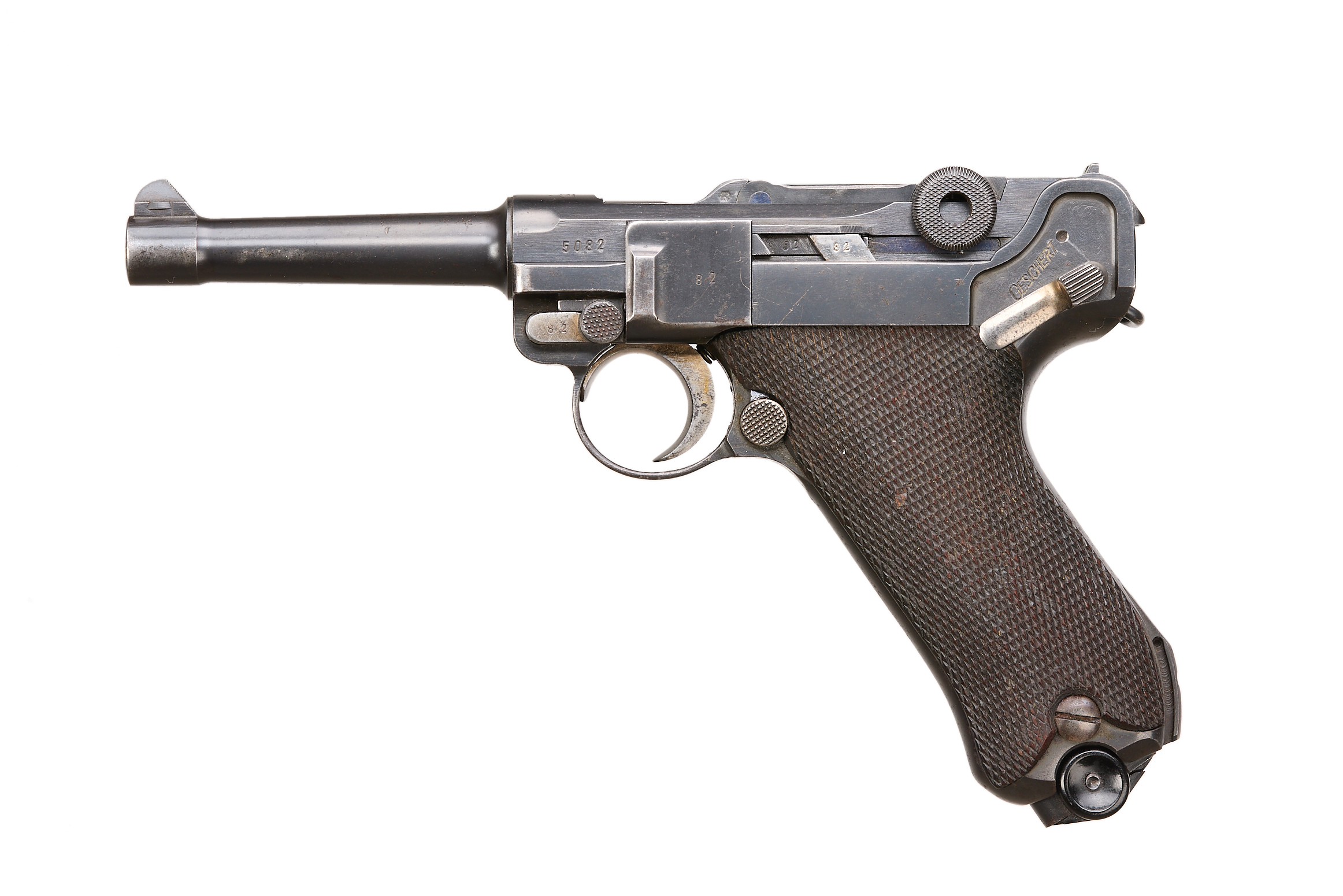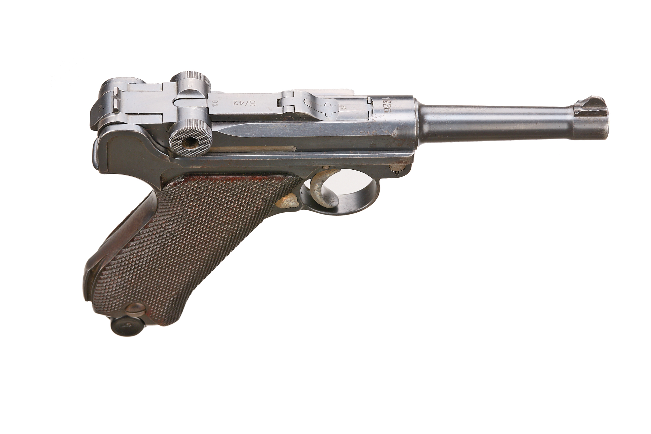 Chequered walnut grips, blued 4in. barrel, dove-tailed fore-sight, fixed notch rear-sight to rear of toggle assembly, the breech dates ‘1936’, toggle-link marked ‘S/42’, blued action and frame, all matching numbers, issue leather holster with Waffenamt stamps, spare magazine and stripping tool. For 1936.