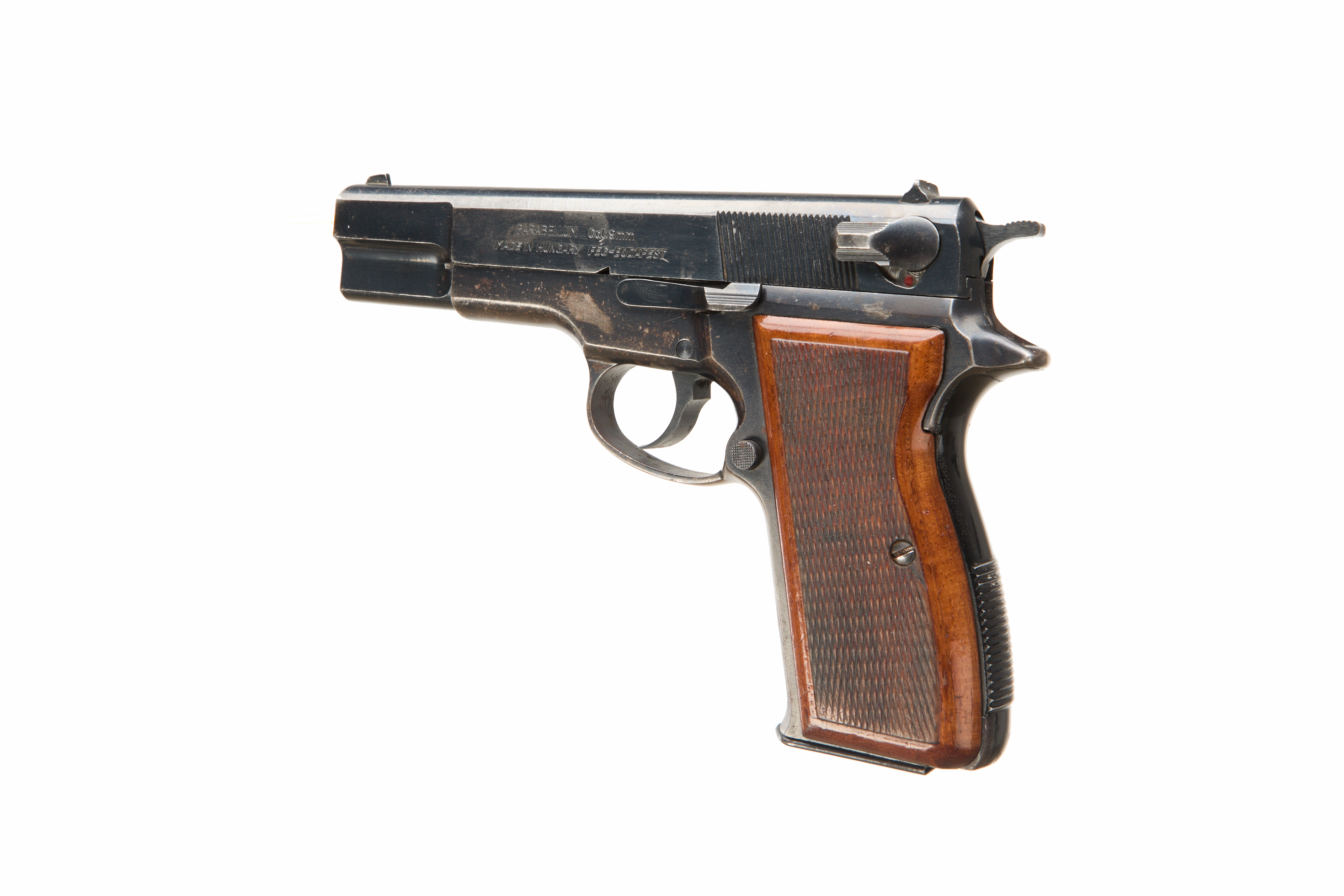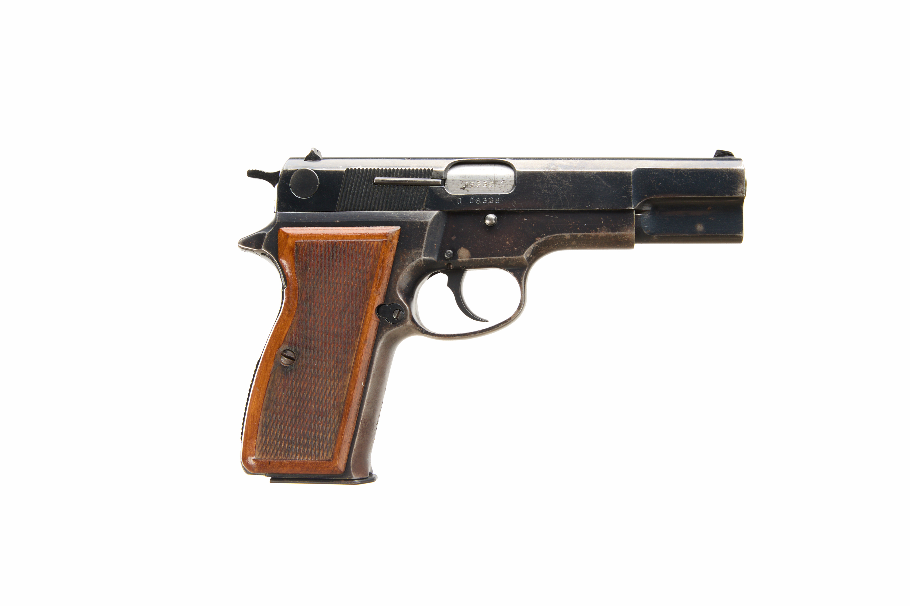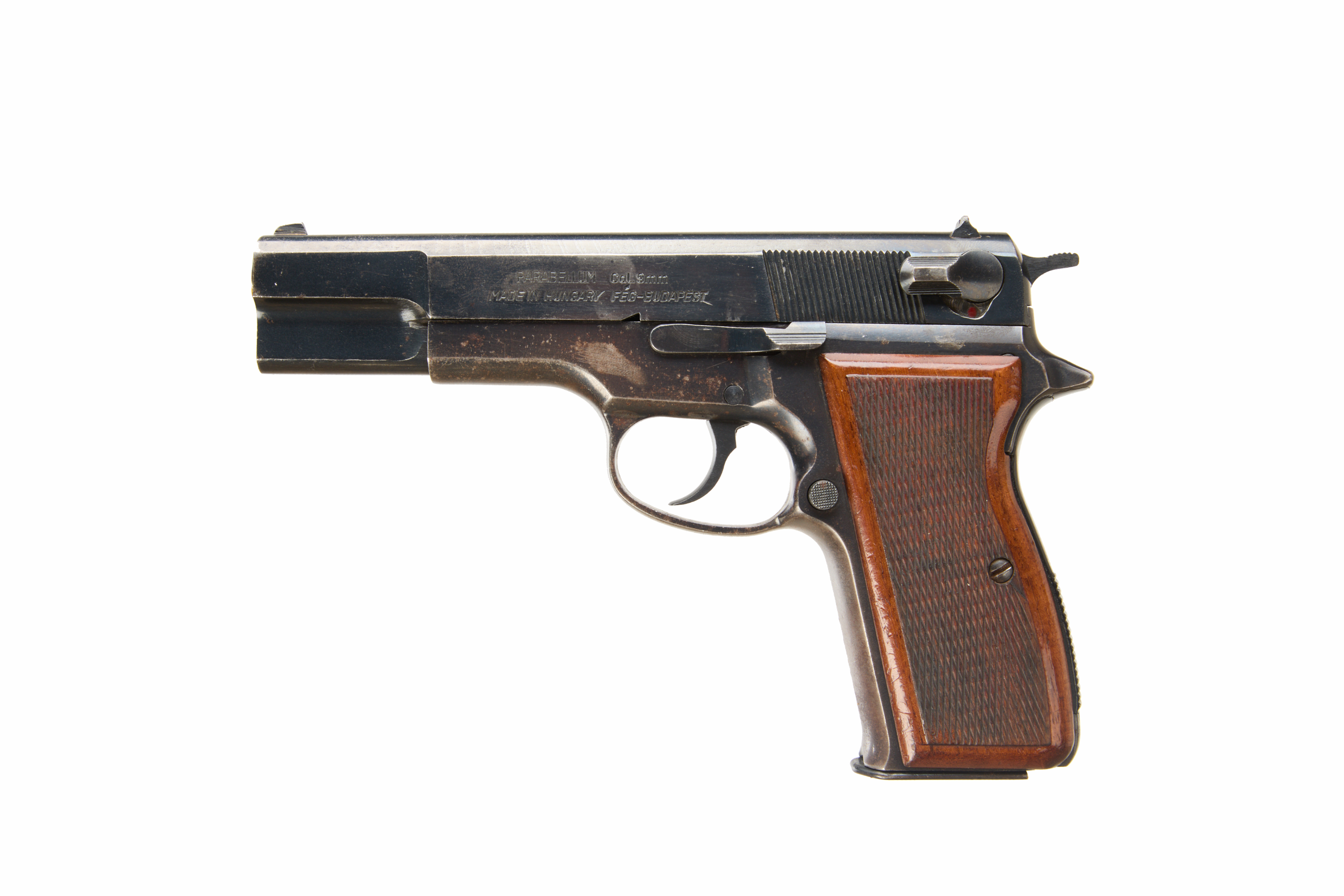 Wood, chequered grips, safety/ decocker, blued frame and slide, 4 1/2" barrel.