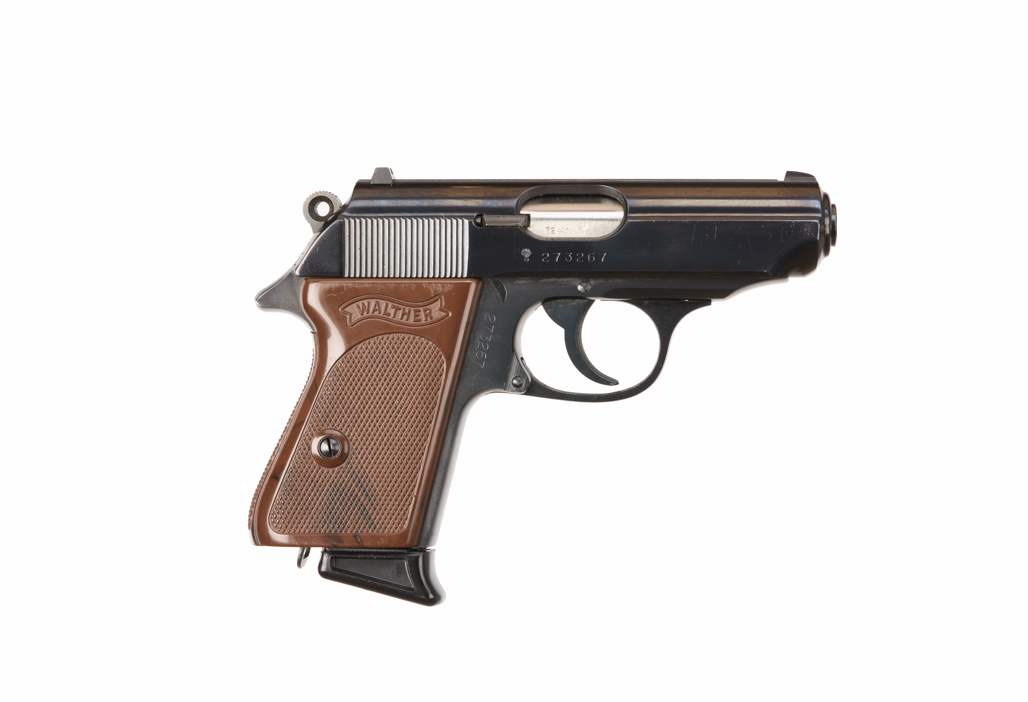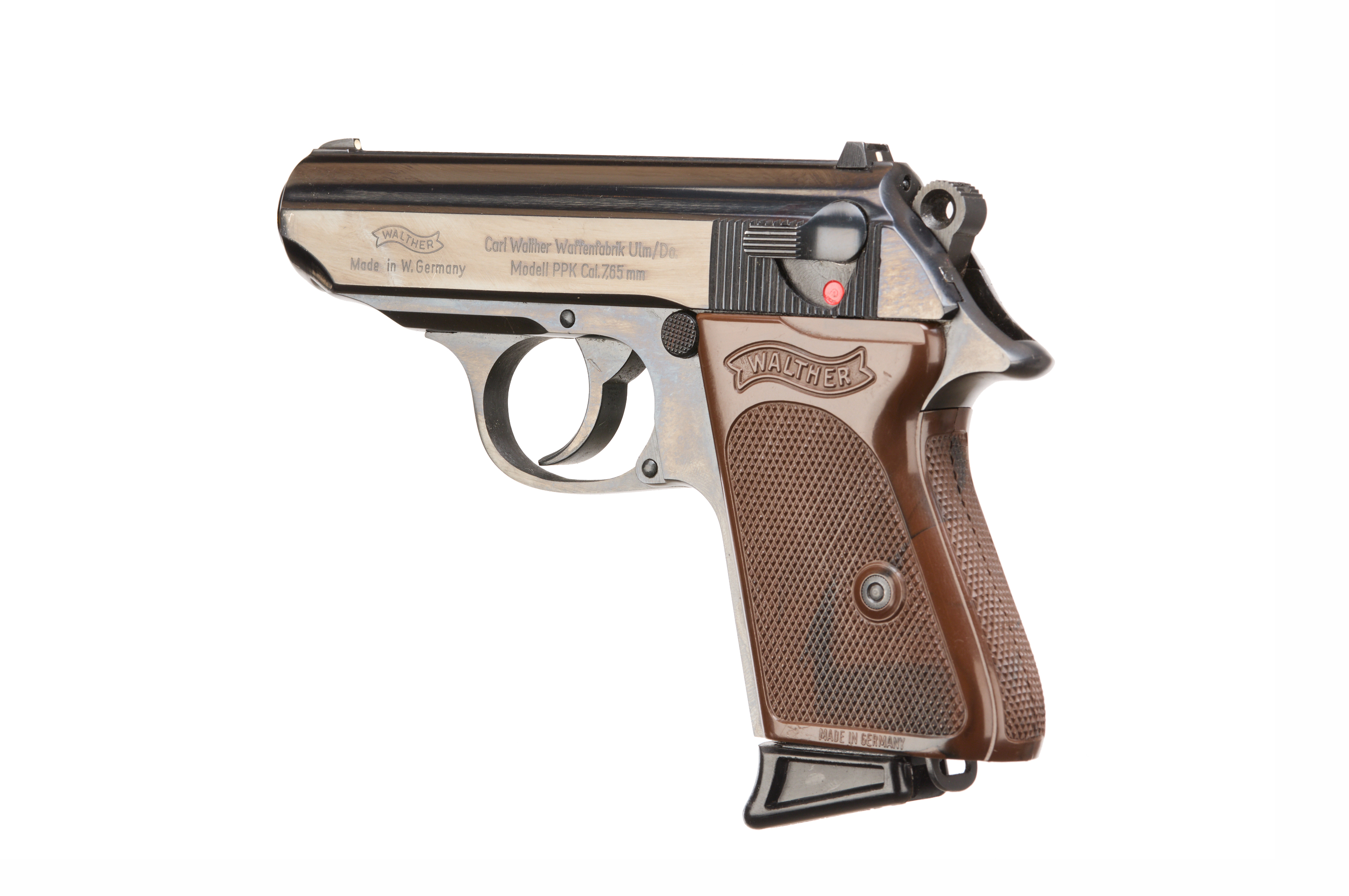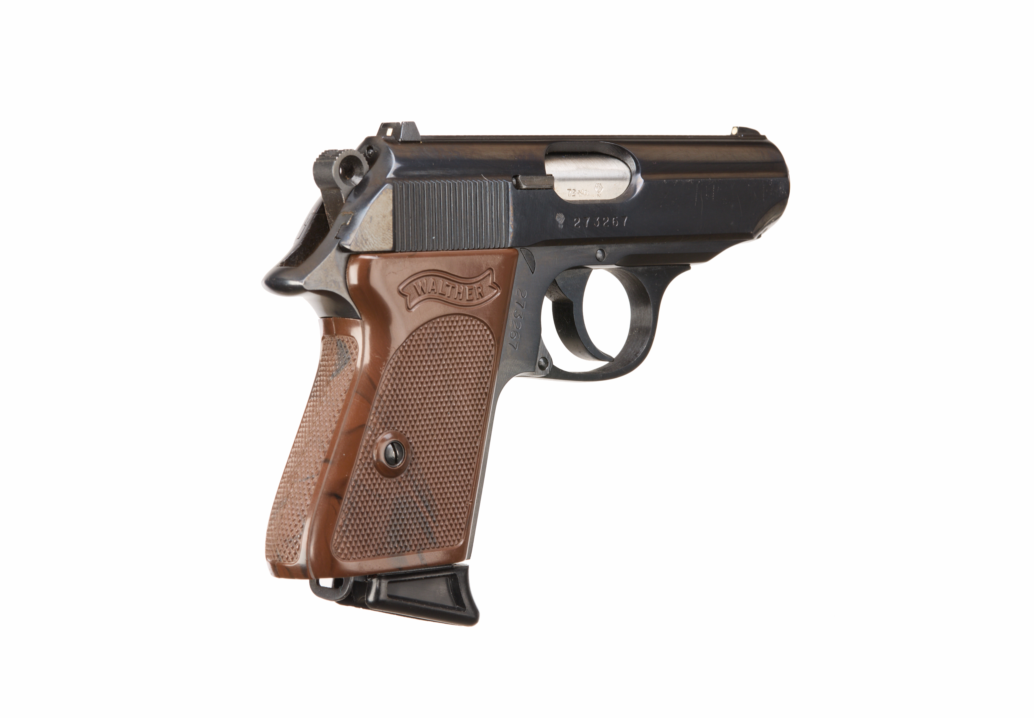 Chequered, brown plastic grips with ‘Walther’ banner, blued frame and slide, 3 1/4" barrel, magazine with finger grip extension.