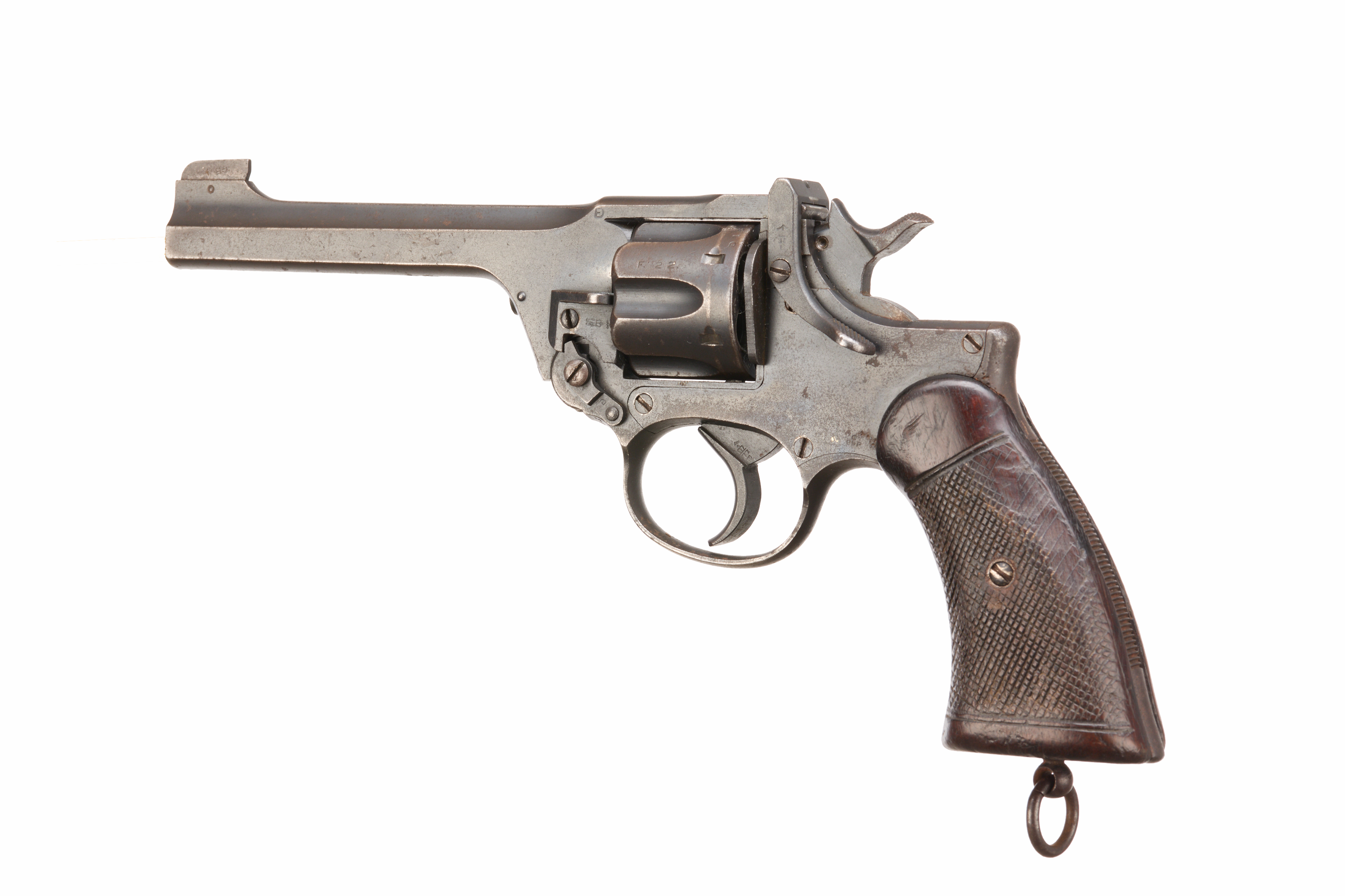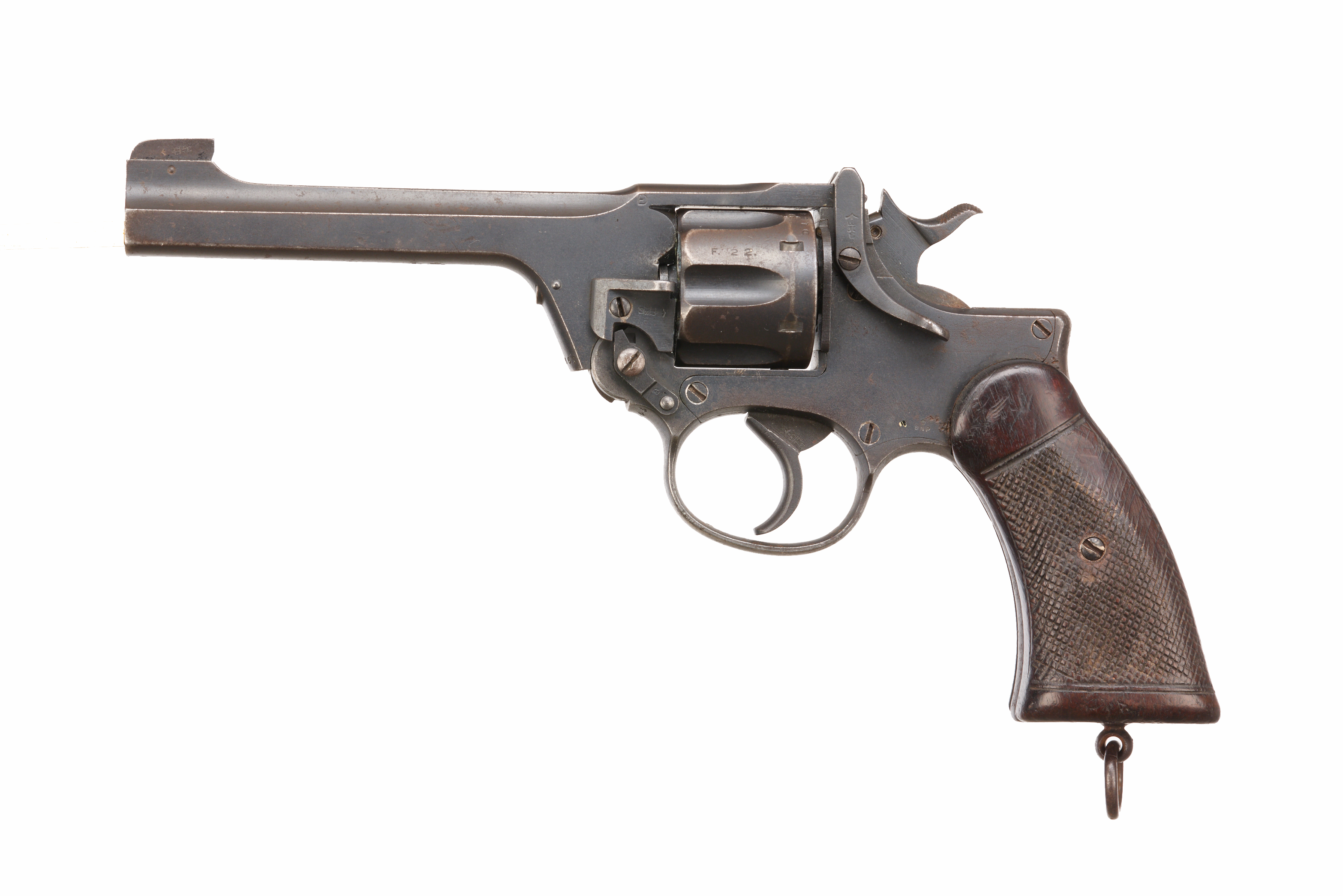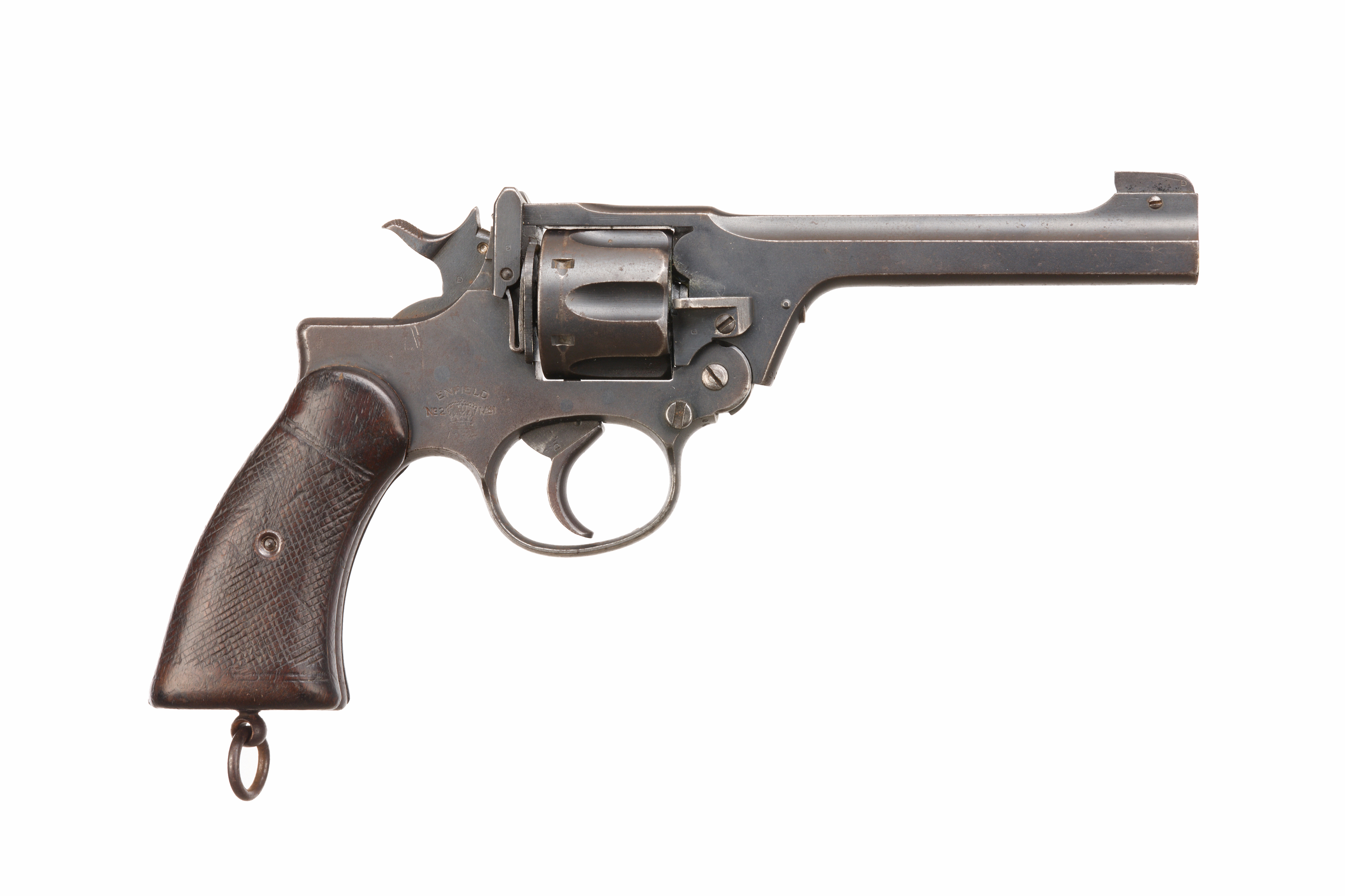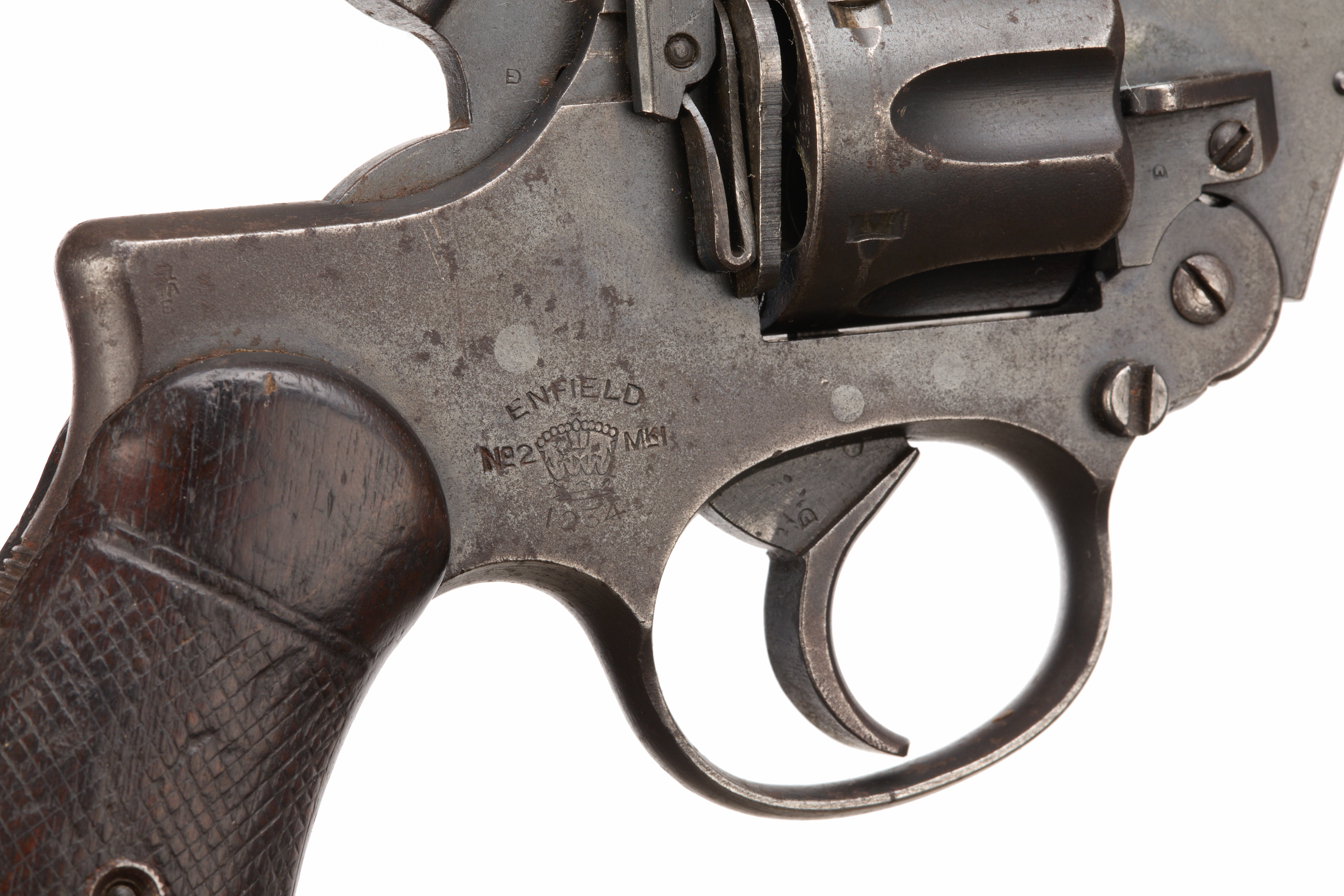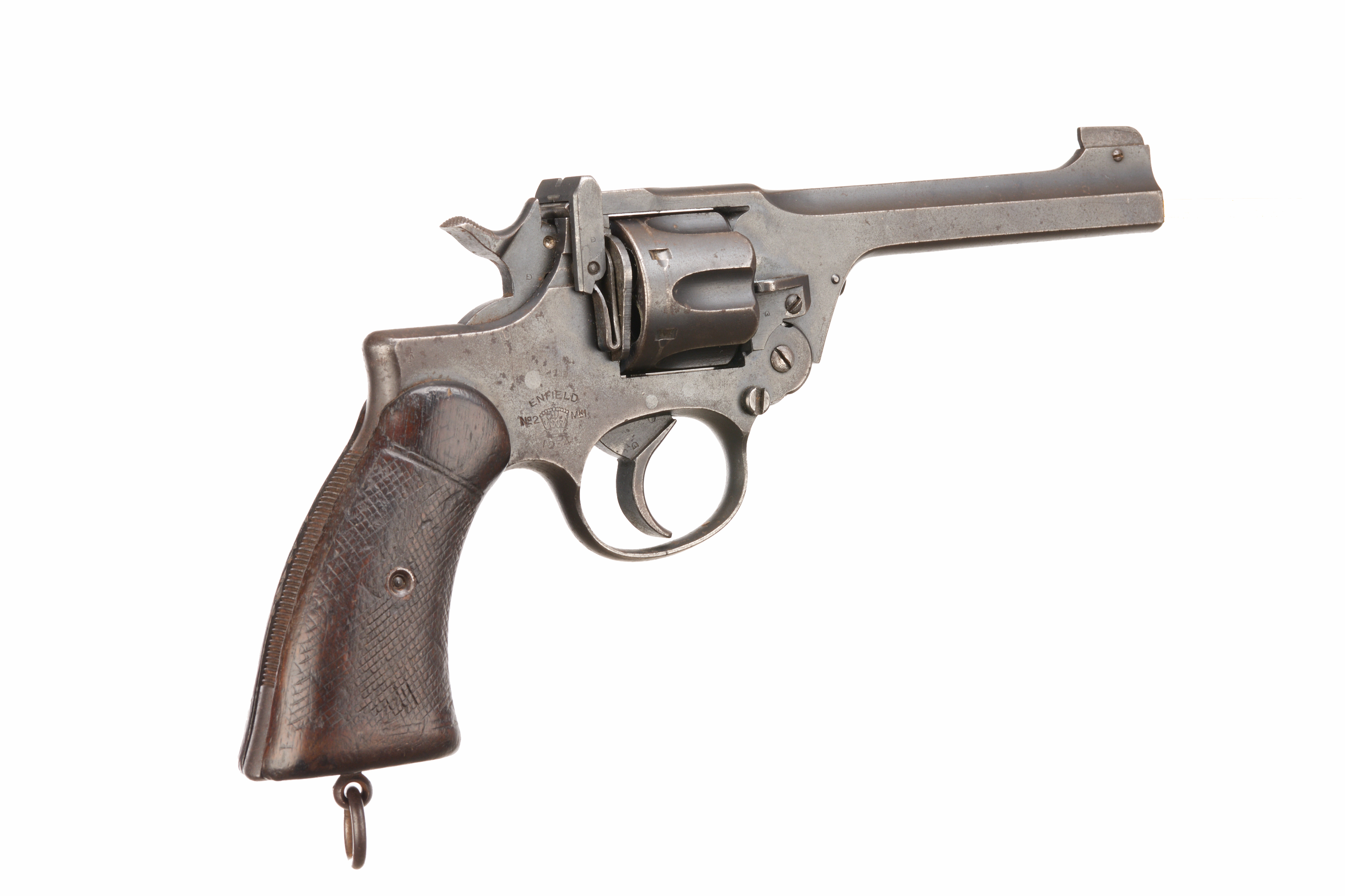 Chequered wooden grips, lanyard loop, post foresight, 5" barrel, break open frame. ‘ENFIELD No2 MK1’ to side. For 1934.