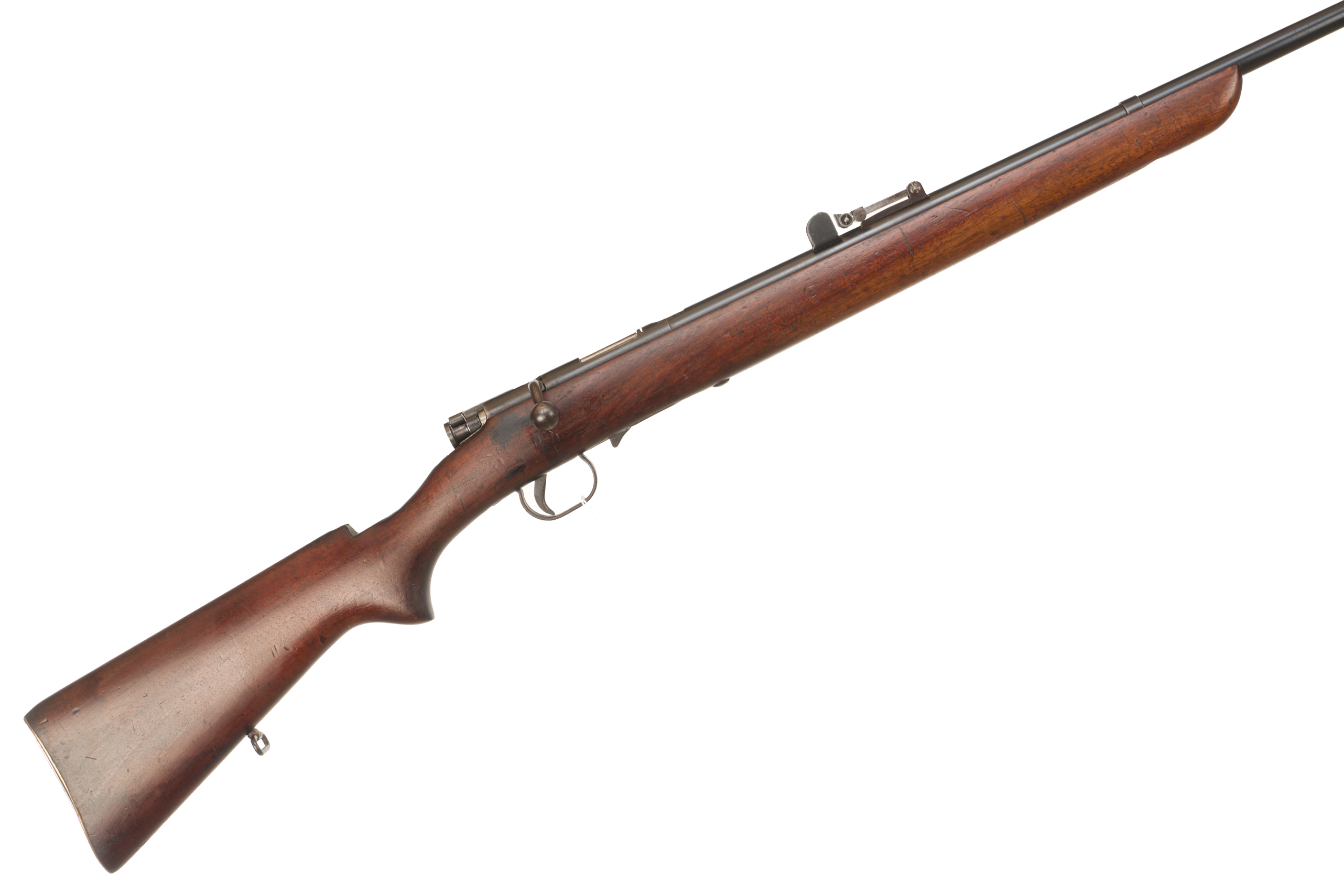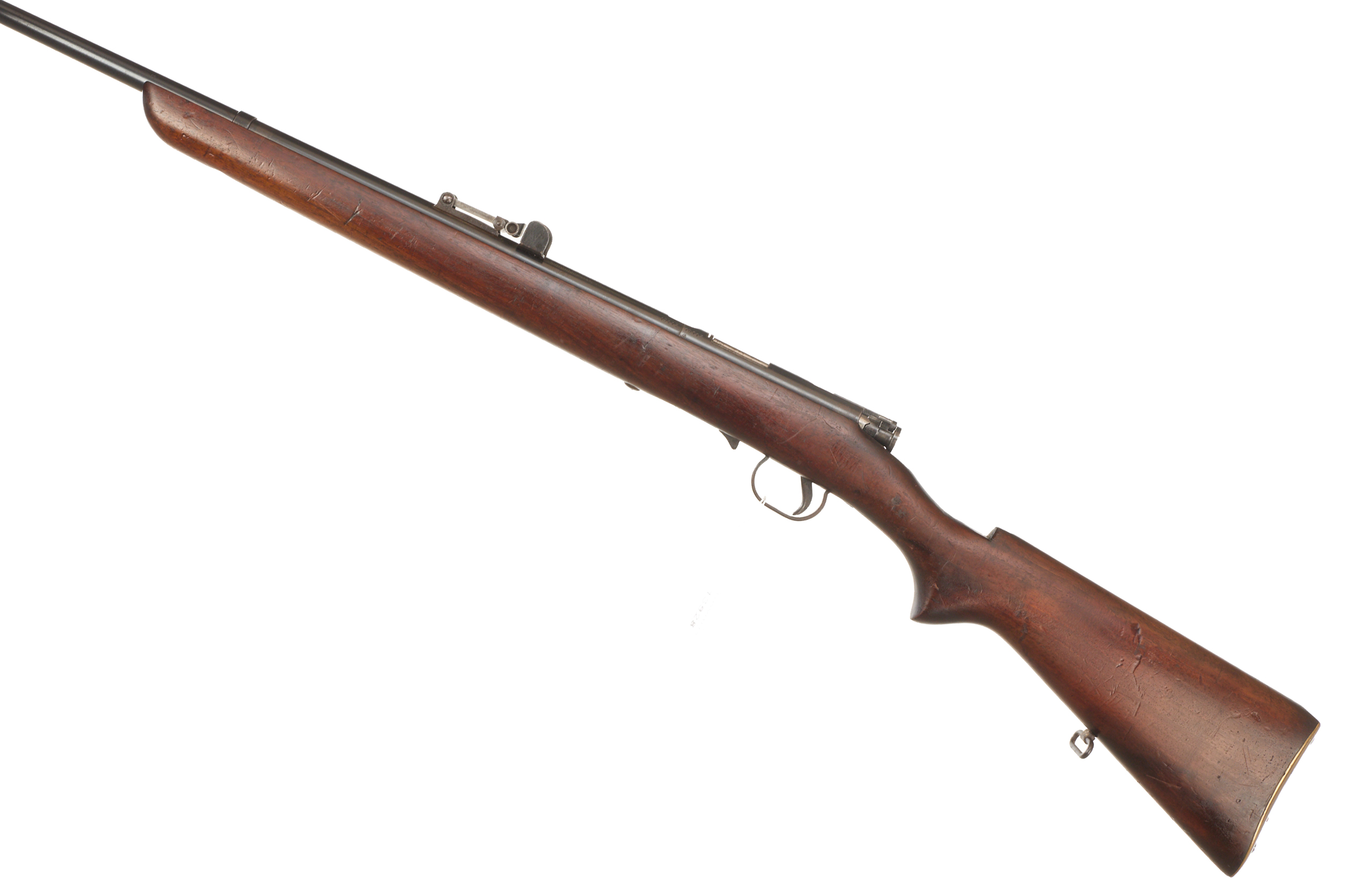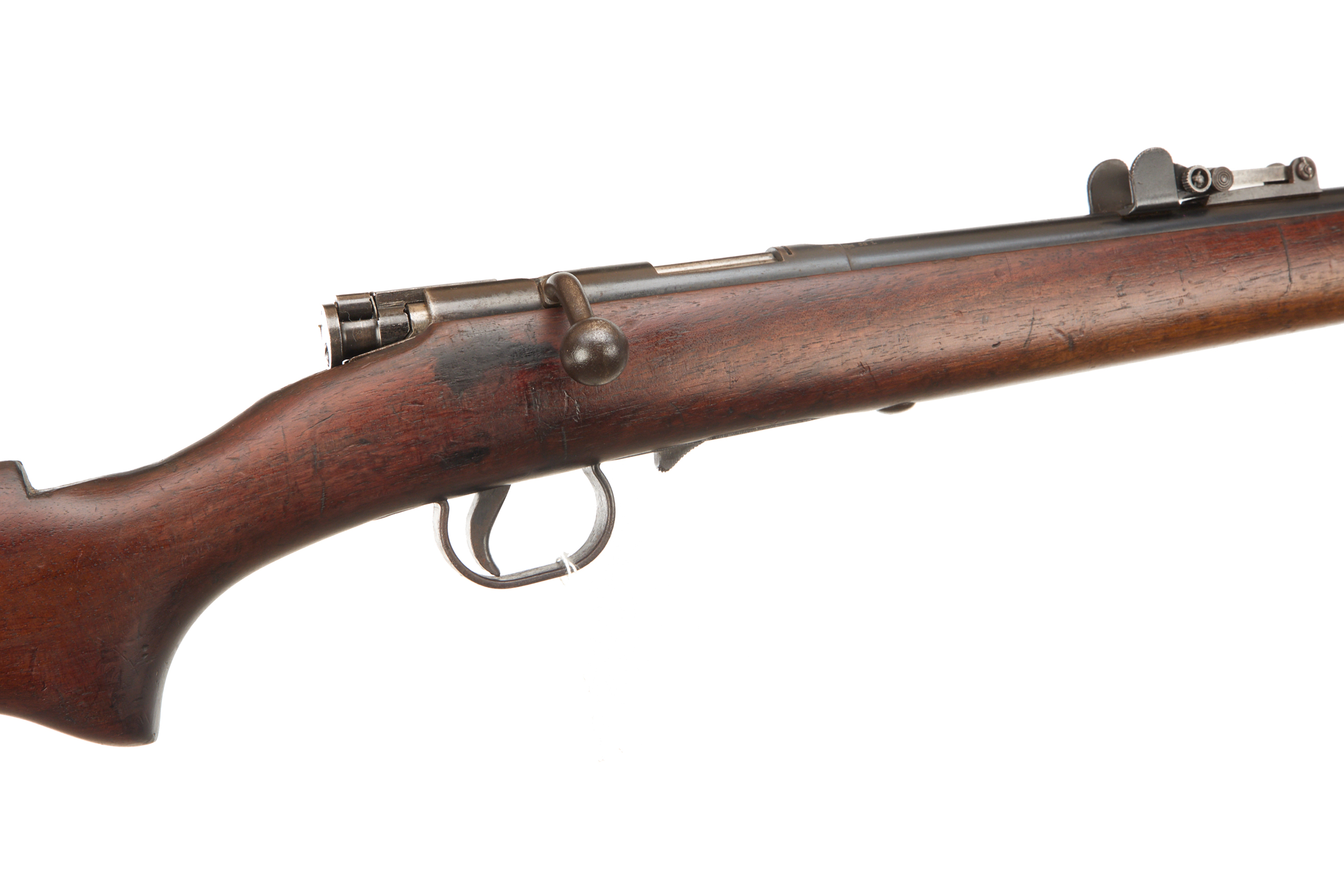Brass butt plate with compartment cover, semi-pistol grip, rounded forend. Screwcut, post foresight, ramp rearsight. Magazine absent, safety.
