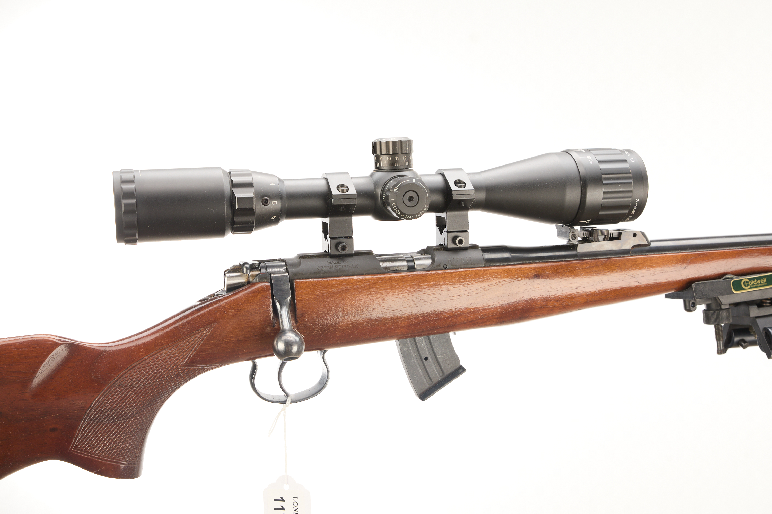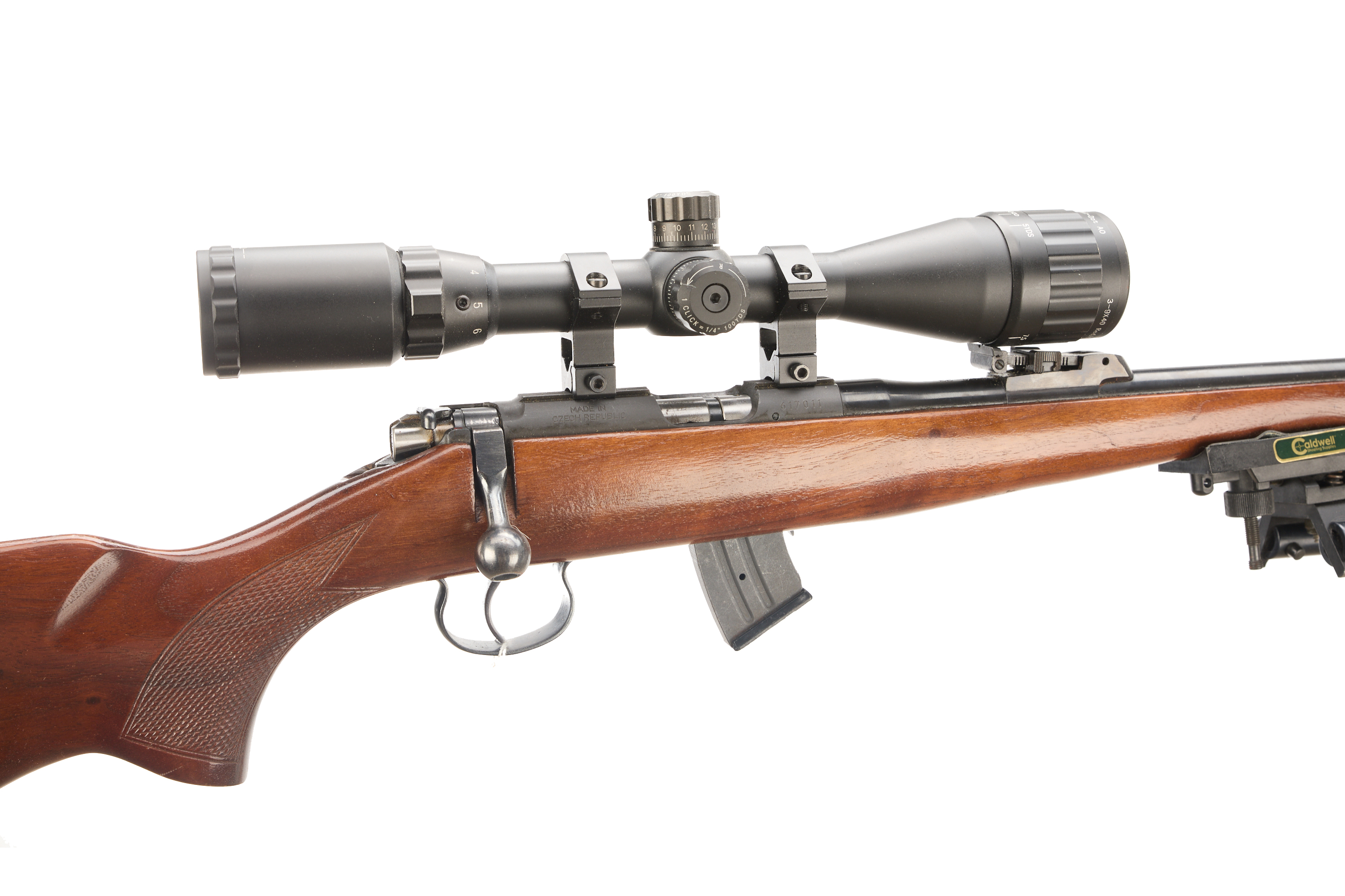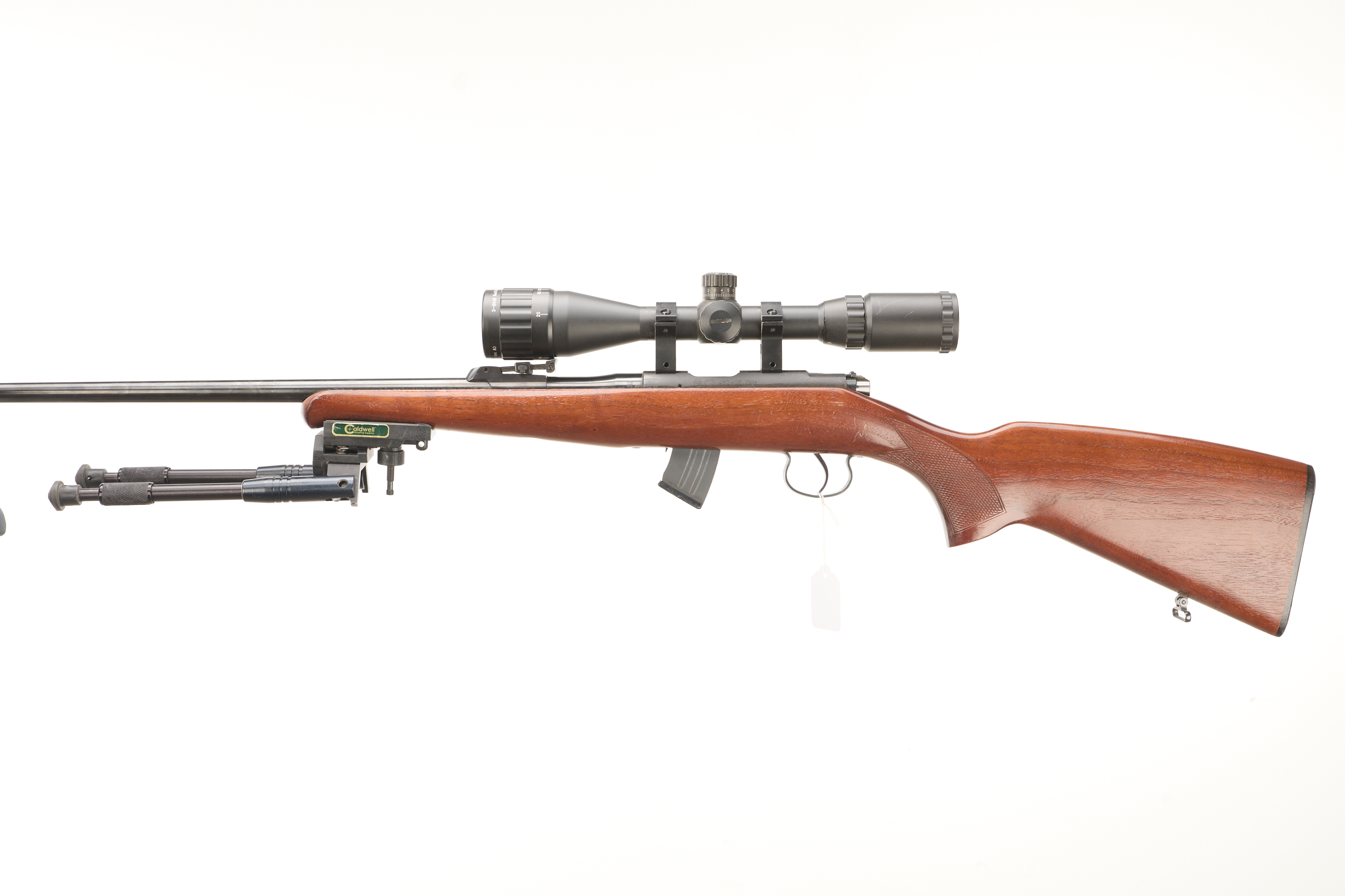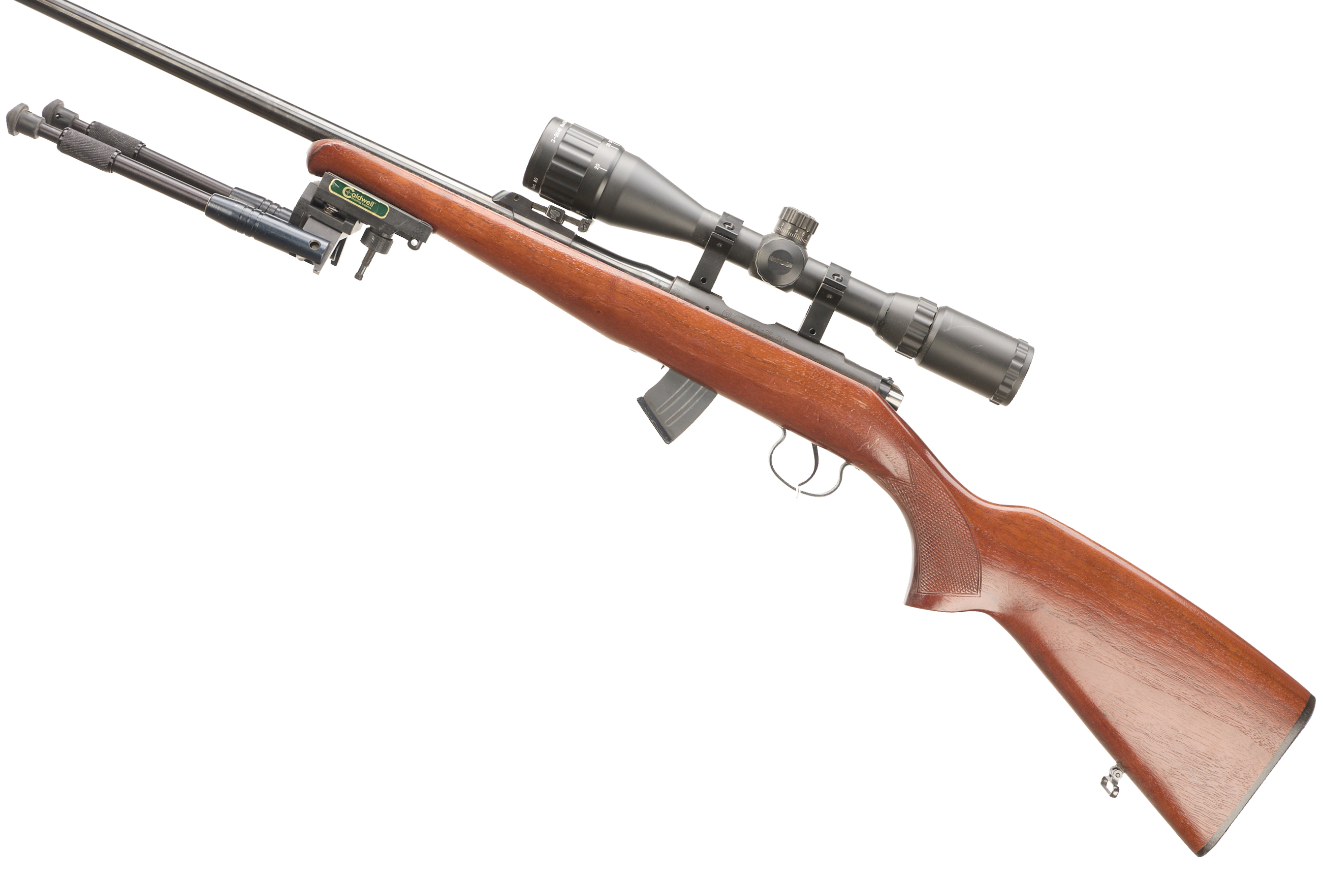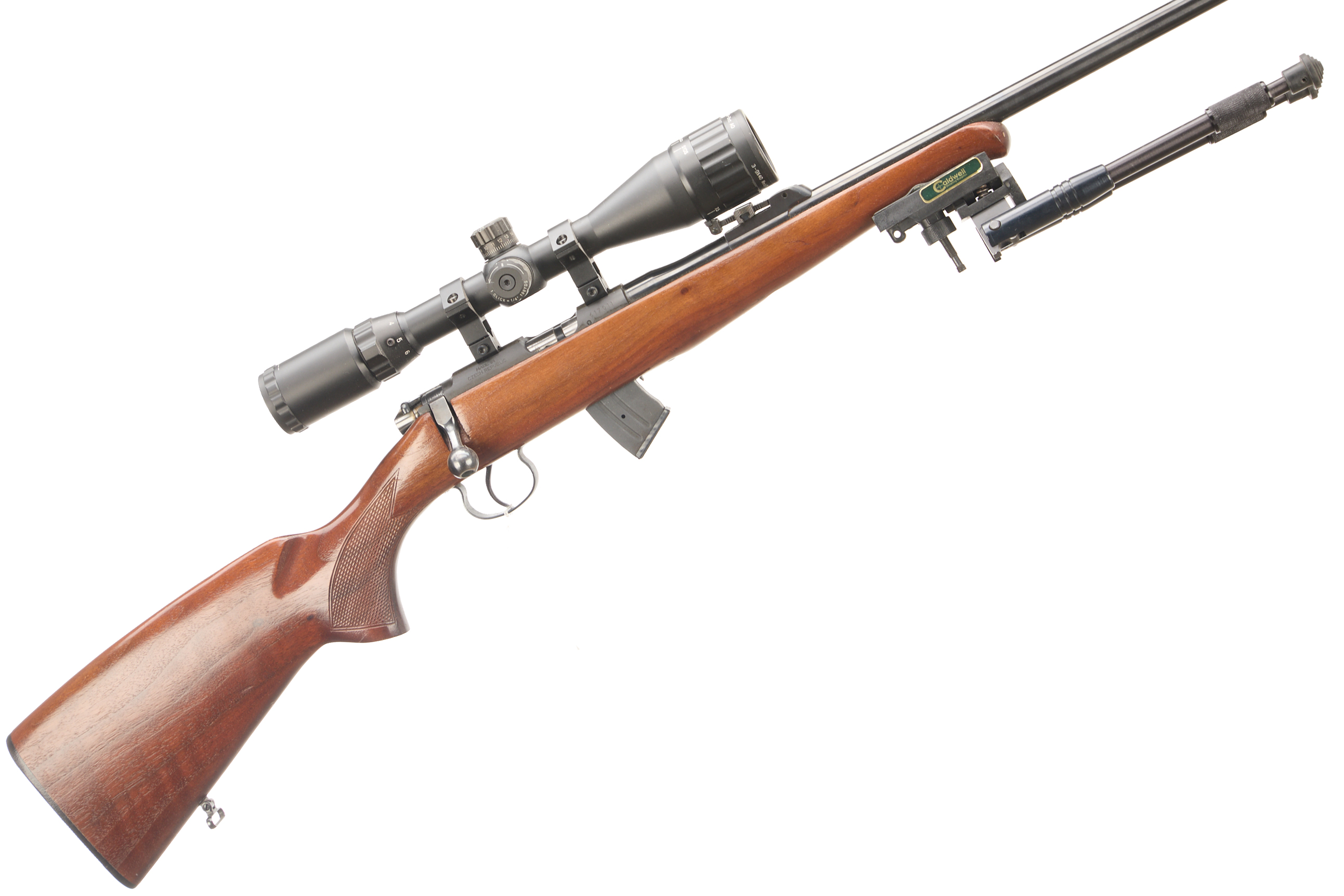 Hard rubber butt pad, screw cut, chequered pistol grip and foreend, hooded fore sight and rear sight. Thumb safety. Detachable magazine. Caldwell bi-pod. 3-9×40 mil-. scope.