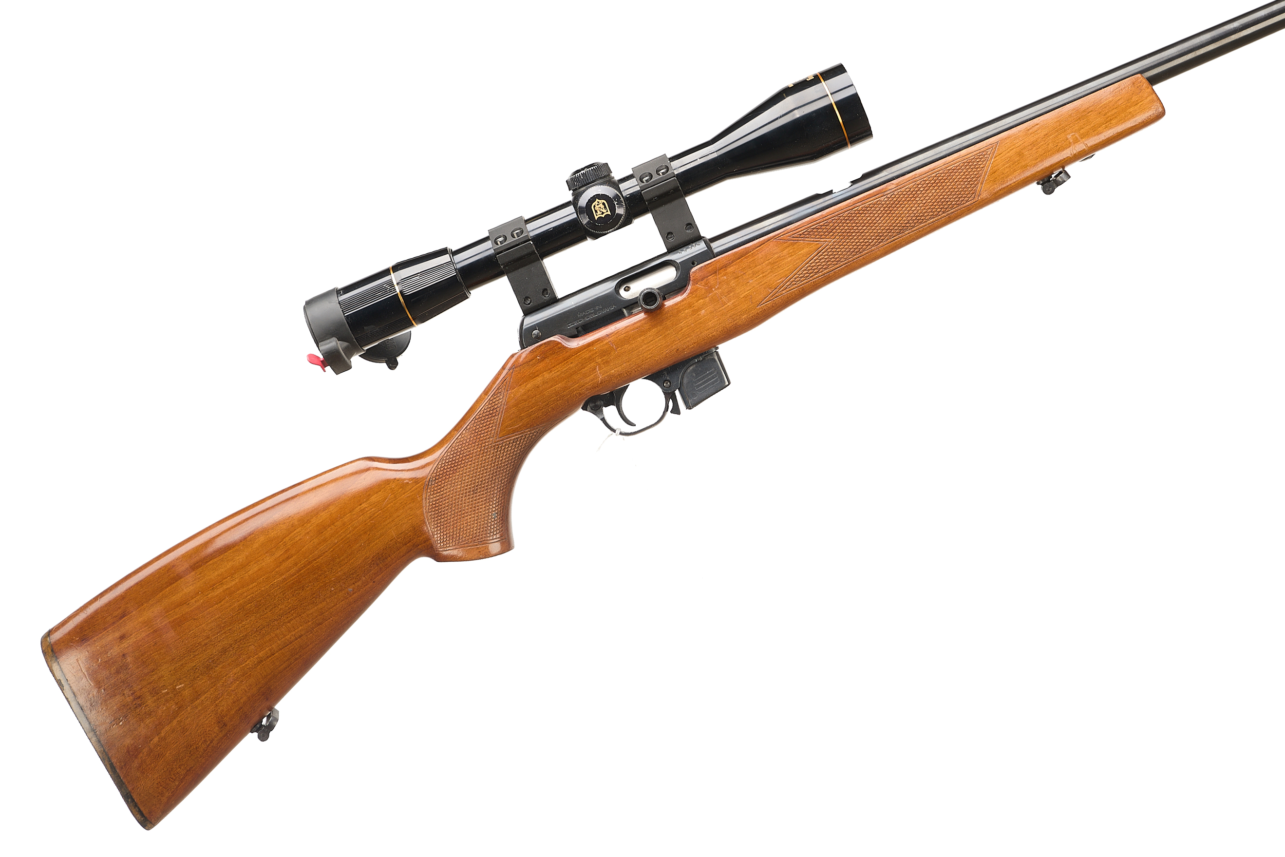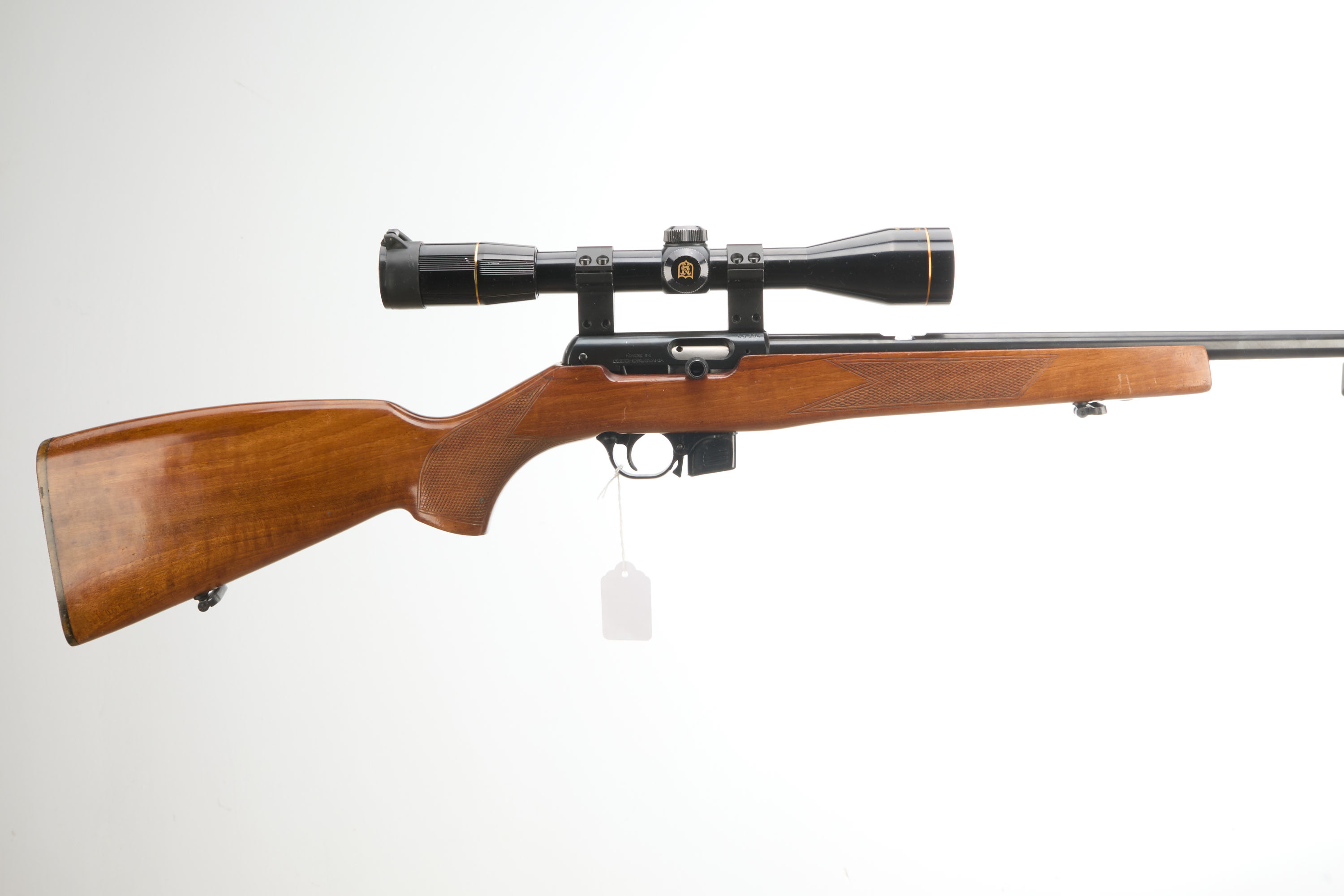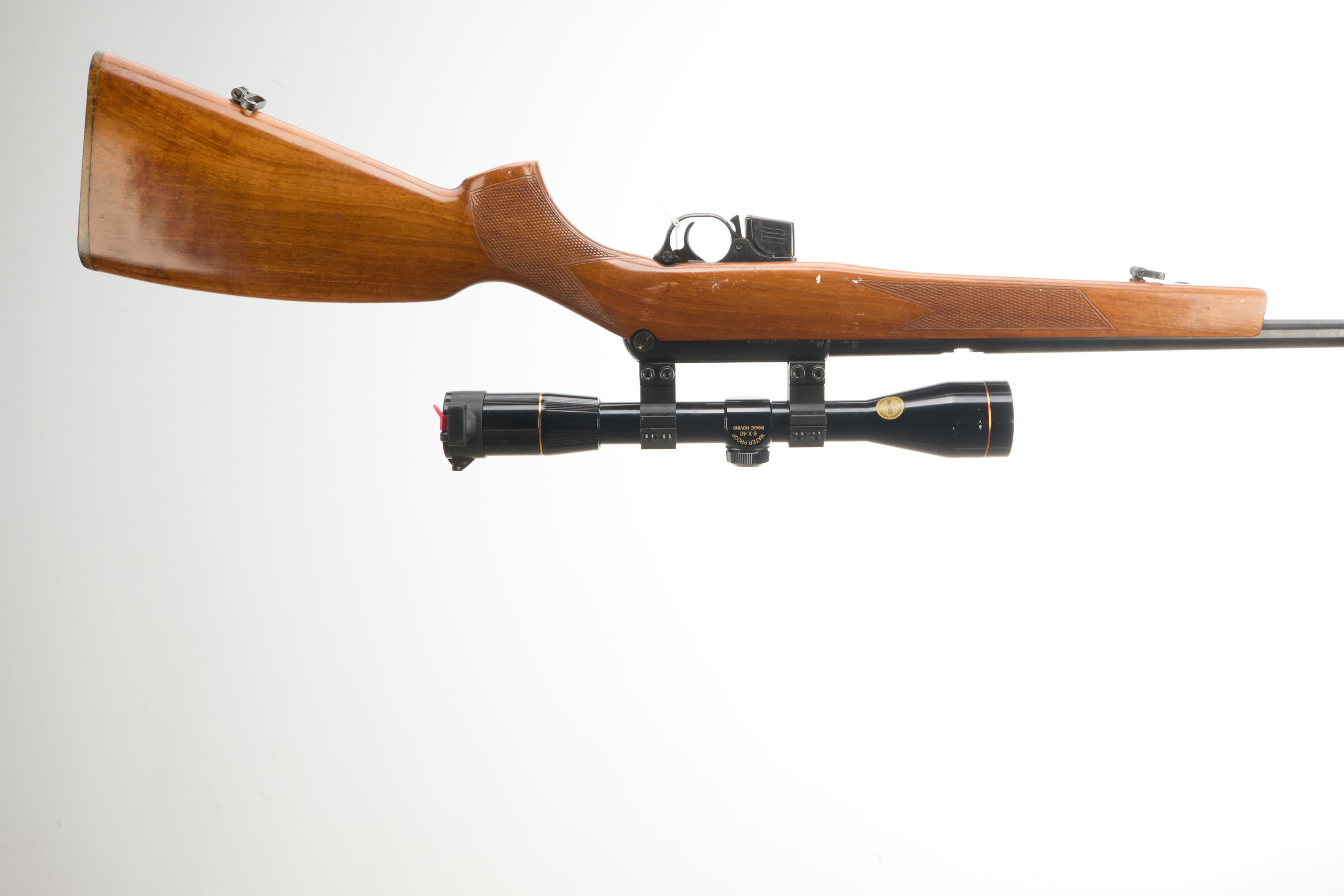 Hard rubber butt pad, chequered pistol grip and foreend, hooded fore sight, rear sight missing. Through safety. Detachable magazine. Nikko Sterling Gold Crown 46×40 scope.