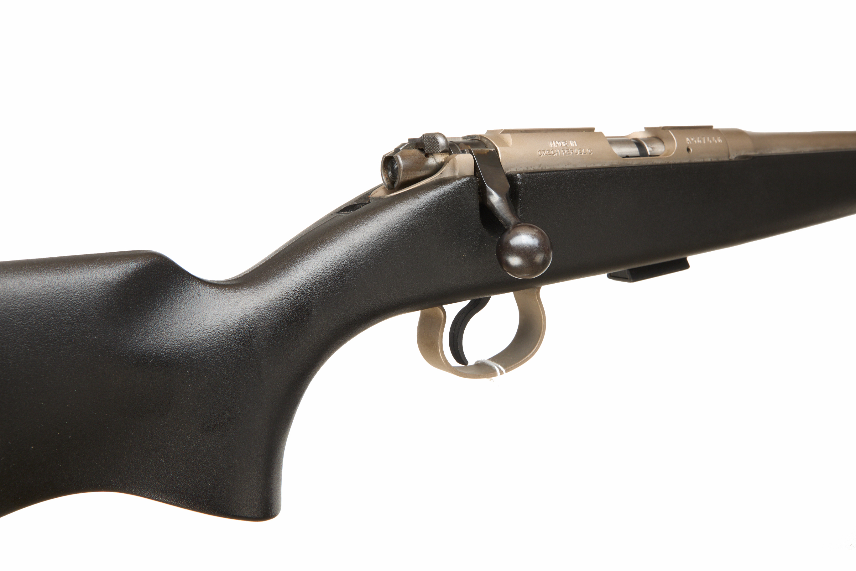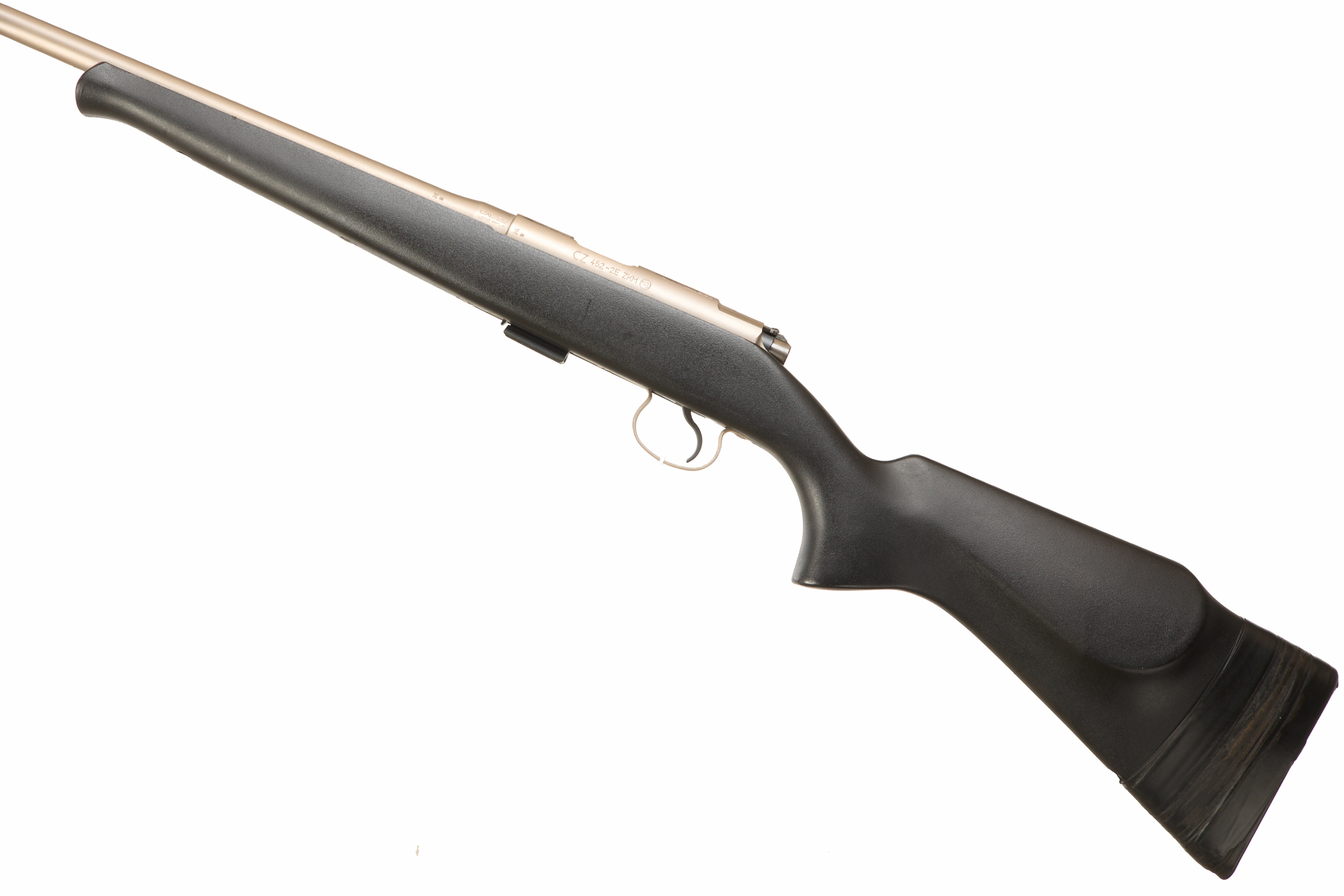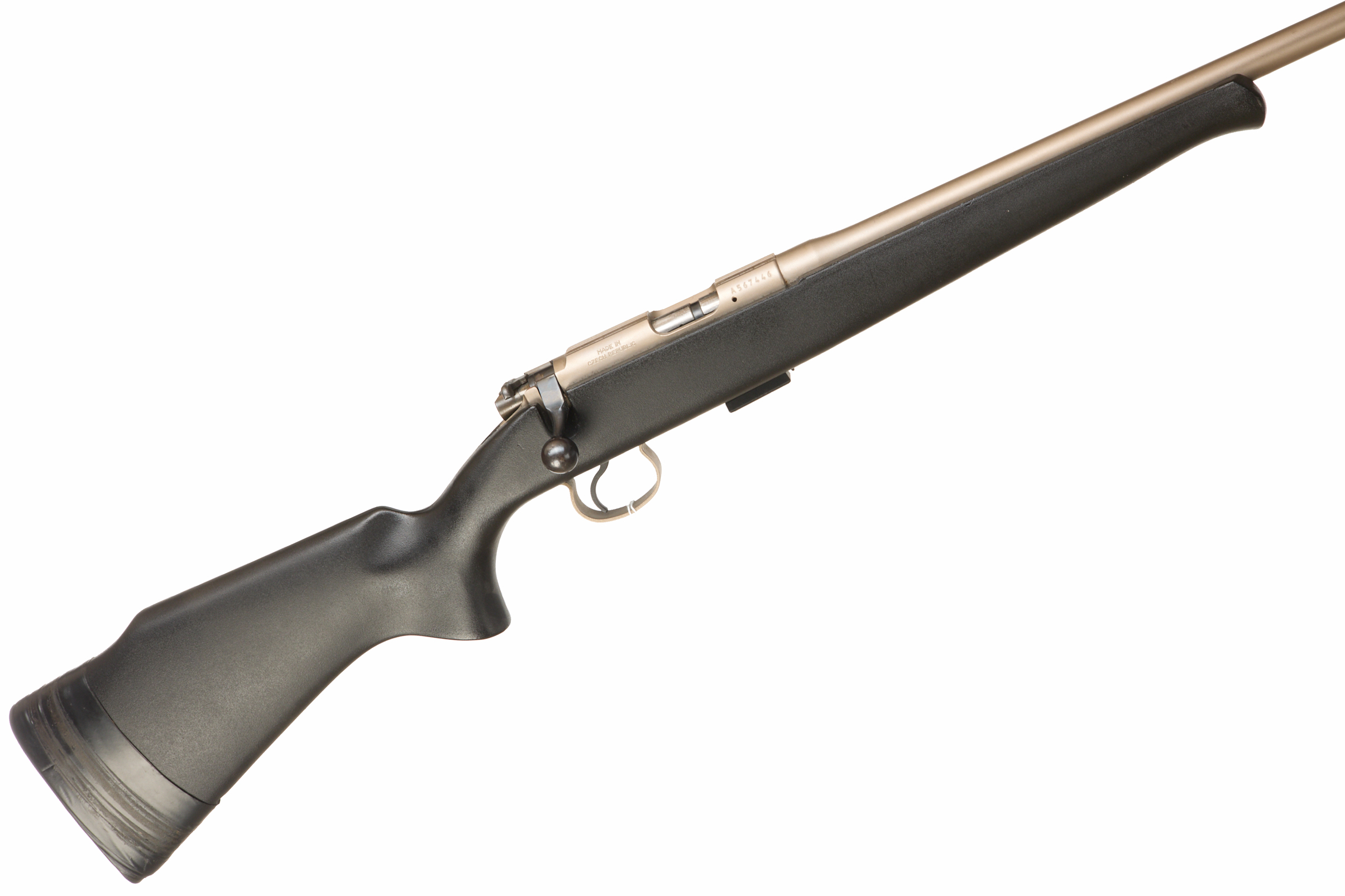 Rubber butt pad. Unadorned synthetic semi pistol grip and schnabel forend with raised cheek piece, unsighted barrel with muzzle break and original scope mounts. Thumb safety. Barrel 18”, OAL 37 1/4”