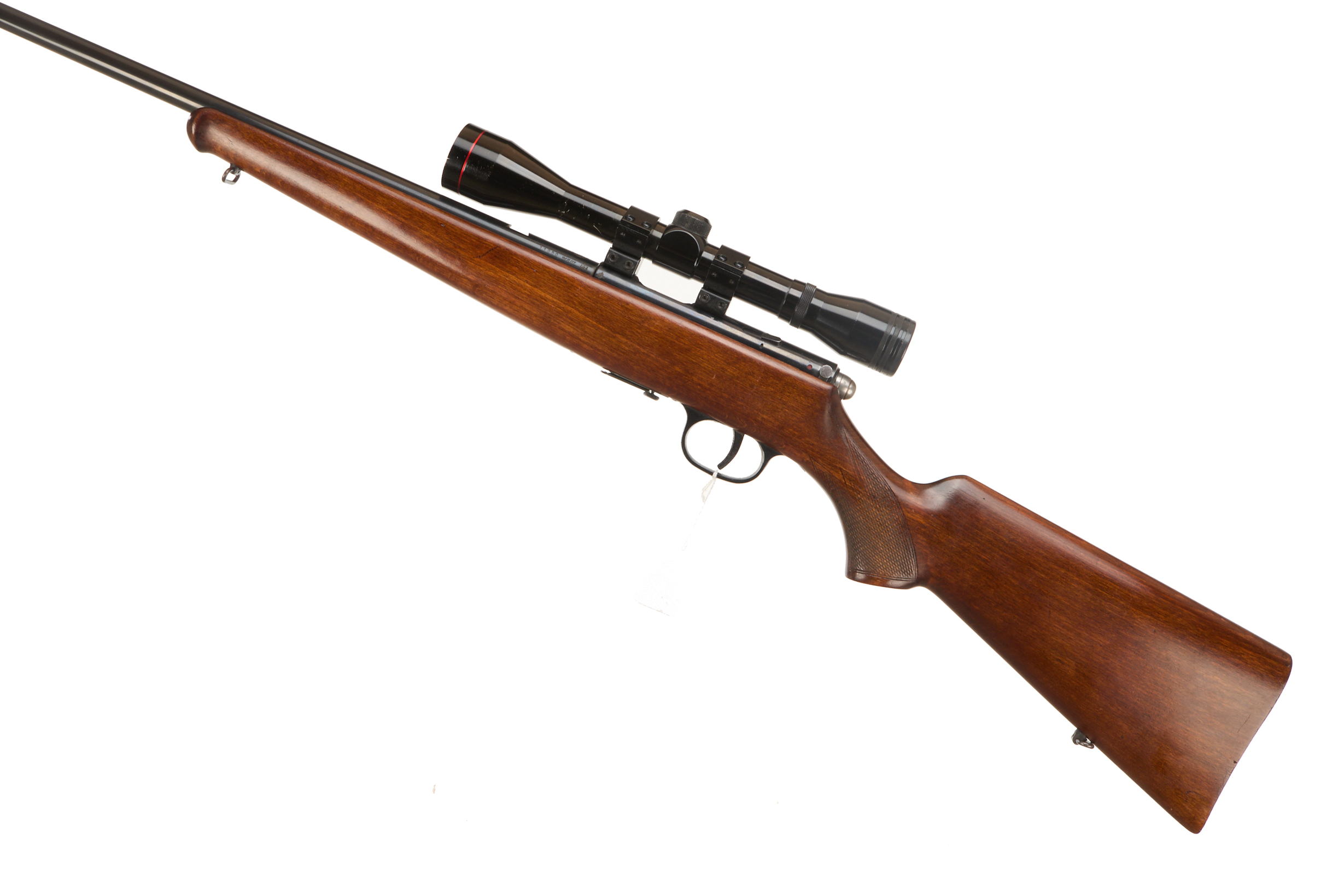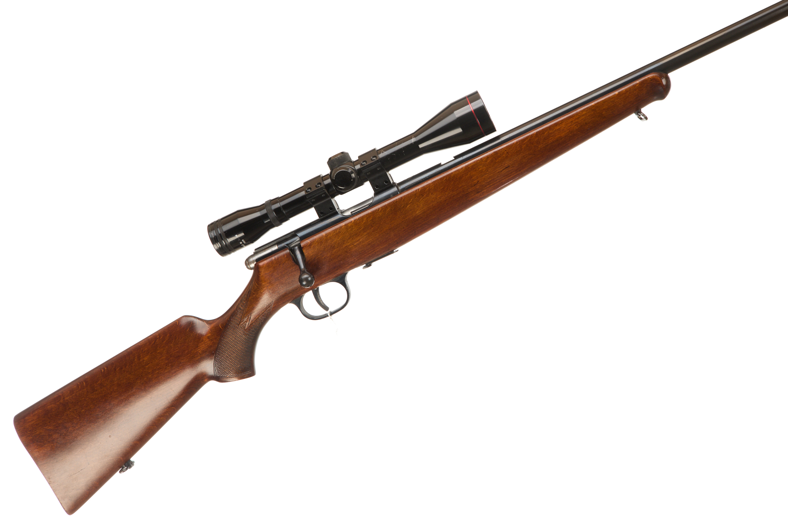 Wooden butt plate chequered semi-pistol grip Schnabel forend. Screwcut, ramp blade foresight. 4×40 scope on Parker Hale mounts, sling swivels. Detachable magazine, thumb safety. Barrel 22 3/4”, OAL 41 3/4”
