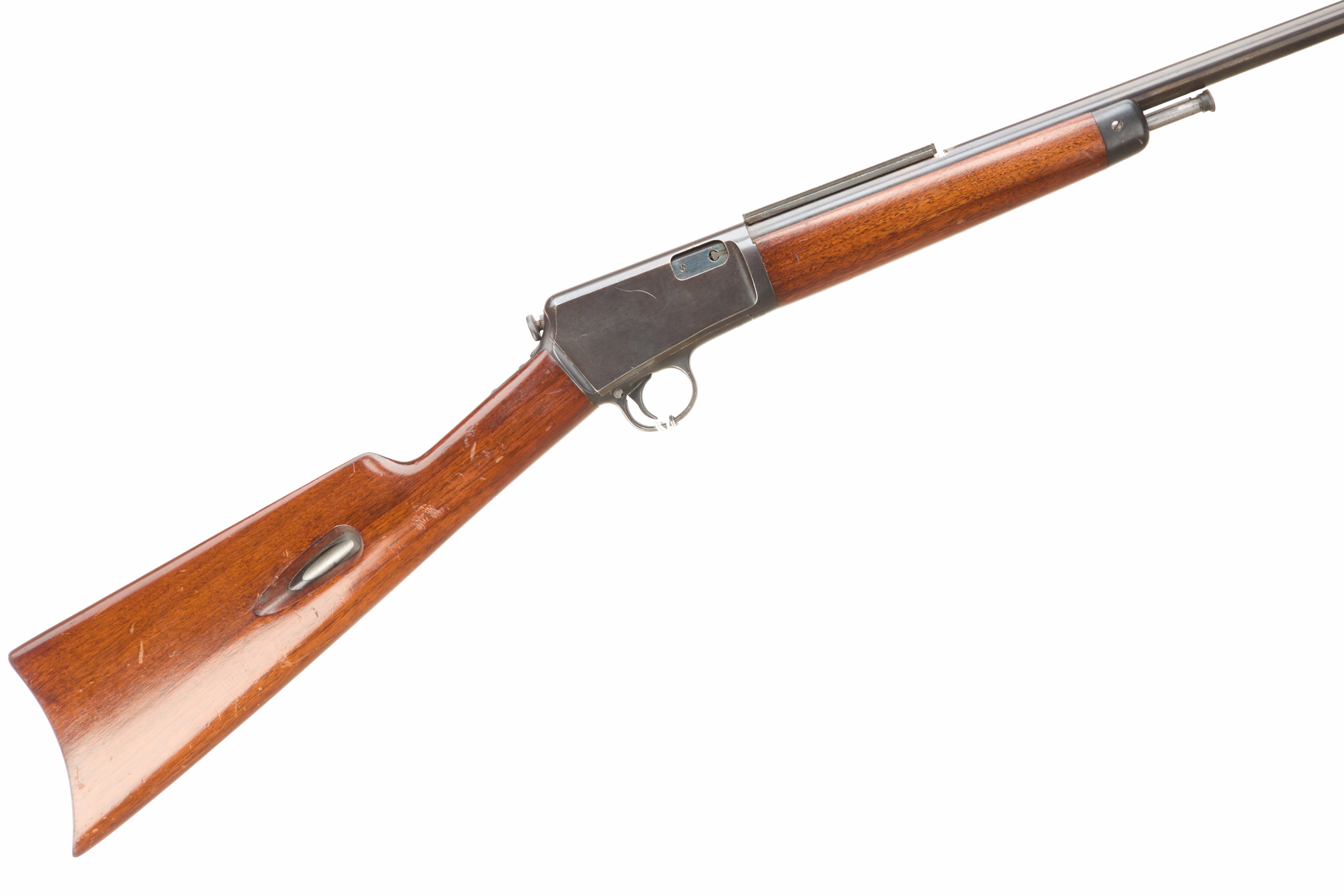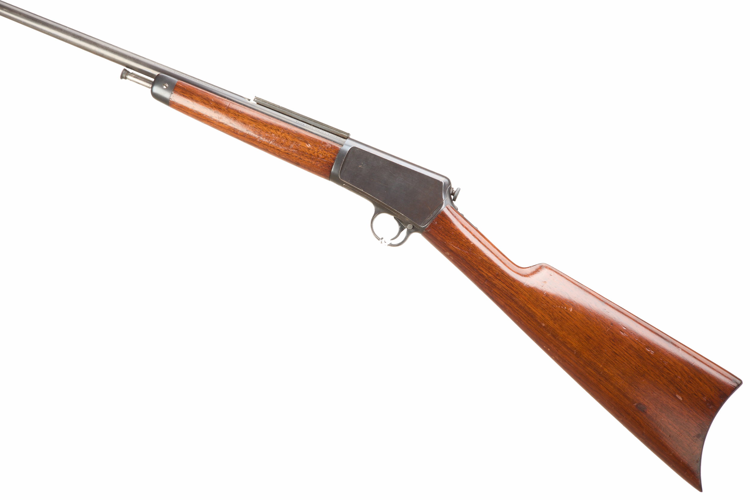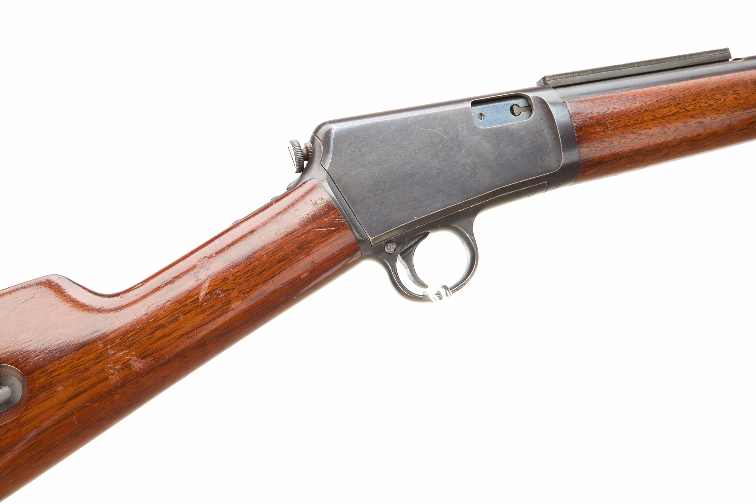 Steel buttplate with integral tubular magazine. Smooth walnut stock and forend. Post front sight, rear sight absent. Dovetail scope rail mounted to barrel. Cross-bolt safety.