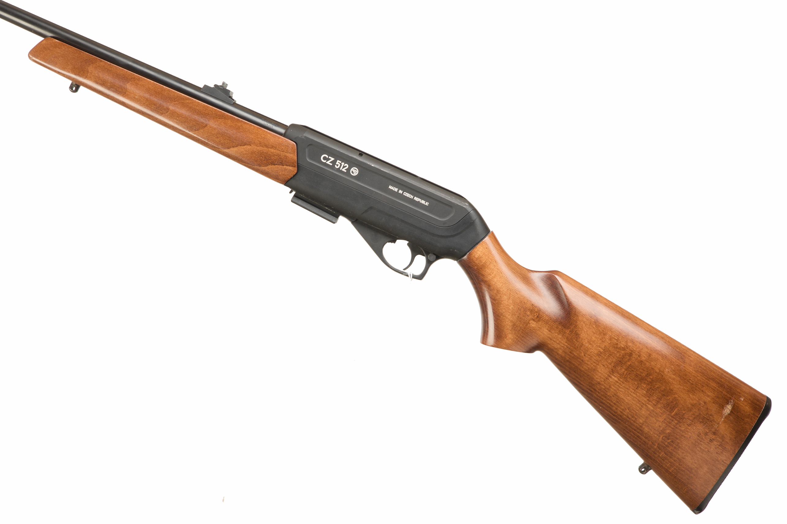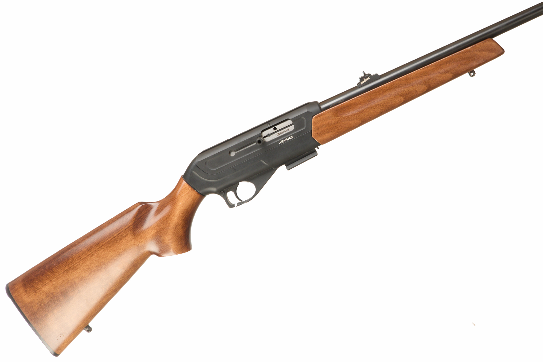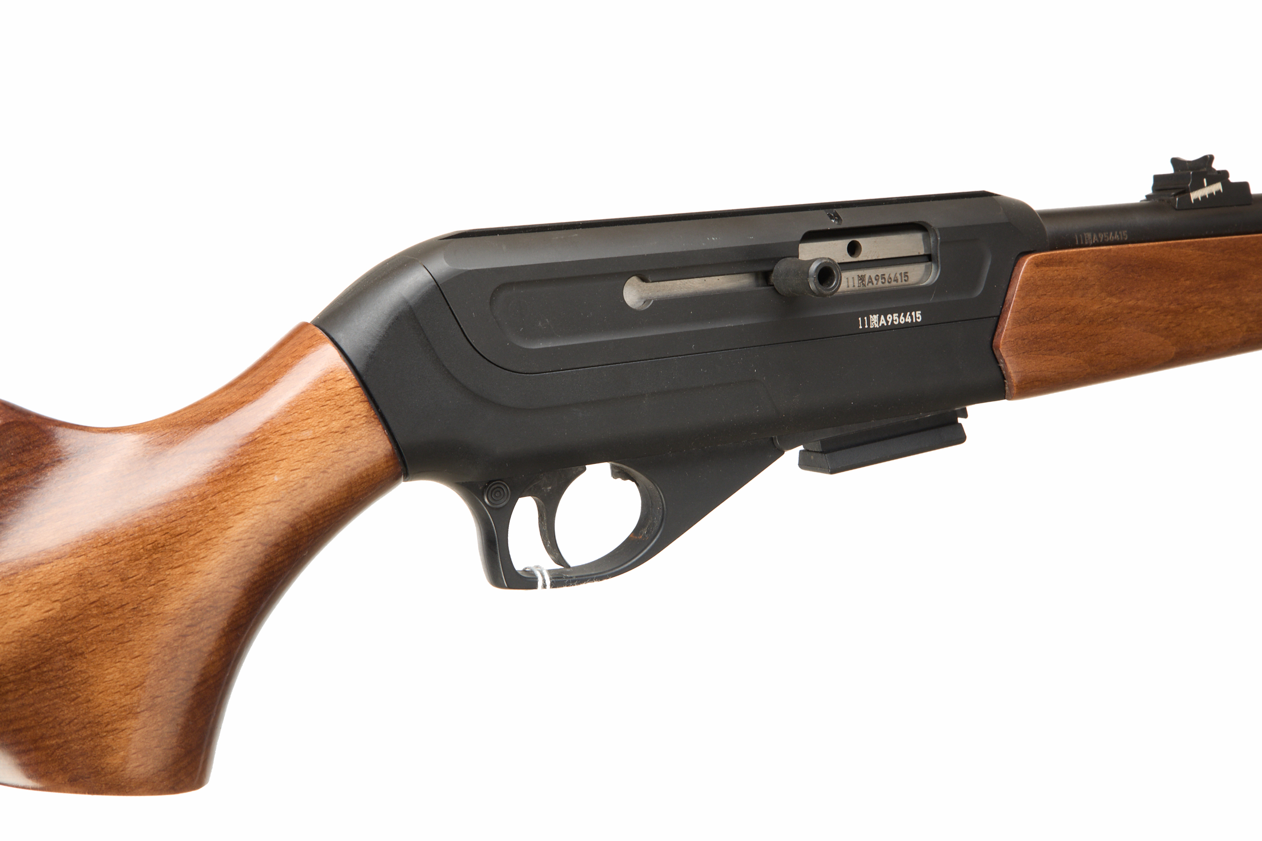 Hard plastic butt plate, plain semi pistol grip and forend with sling studs, ramped rear and foresights. Detachable magazine, push safety. Barrel 19 1/8”, OAL 39 1/8”