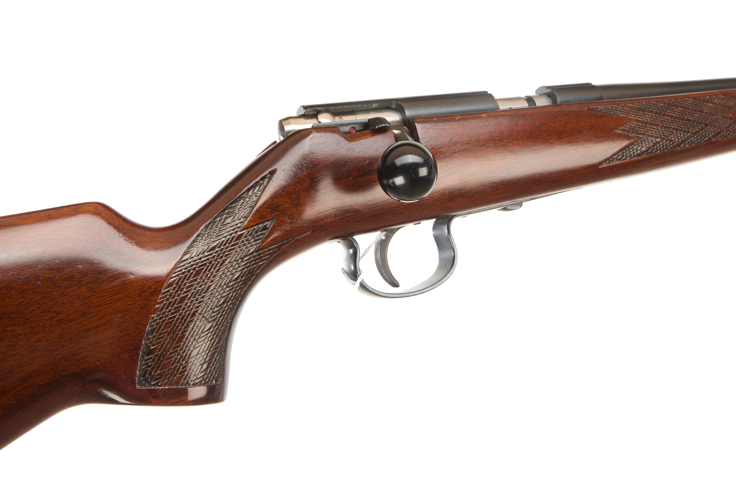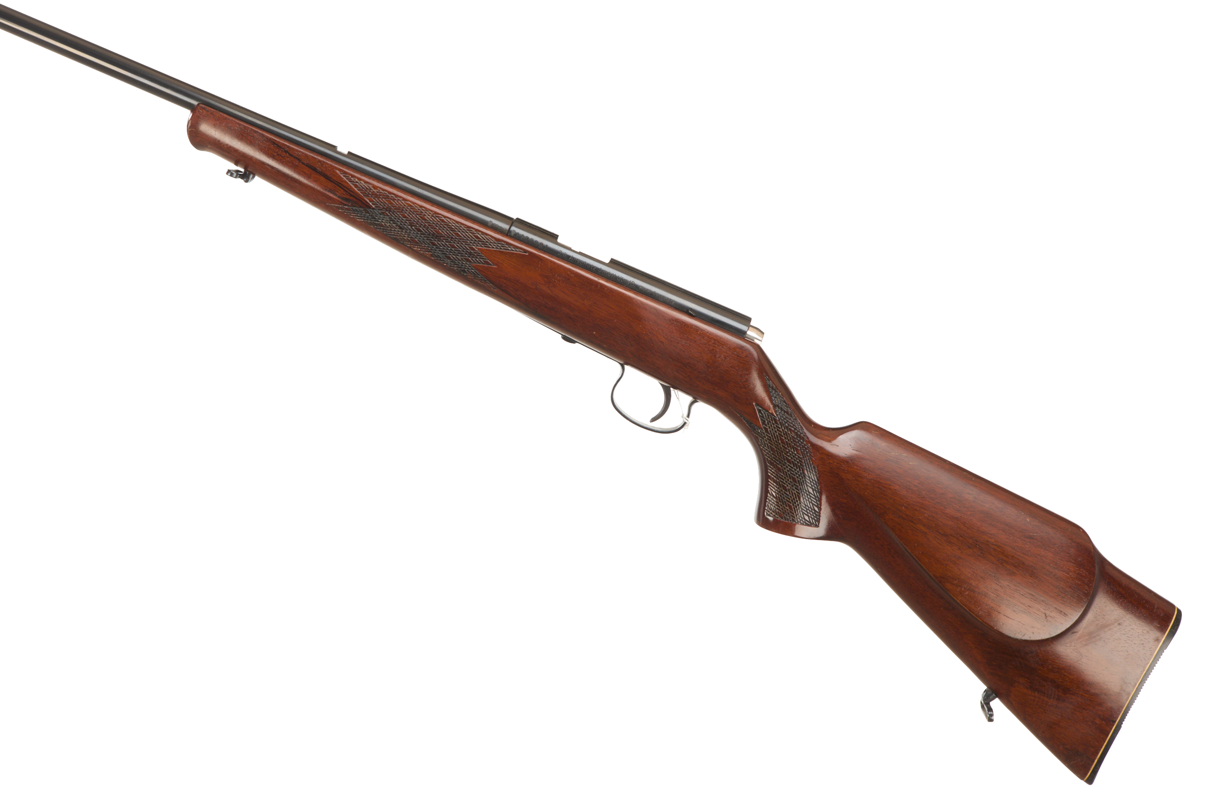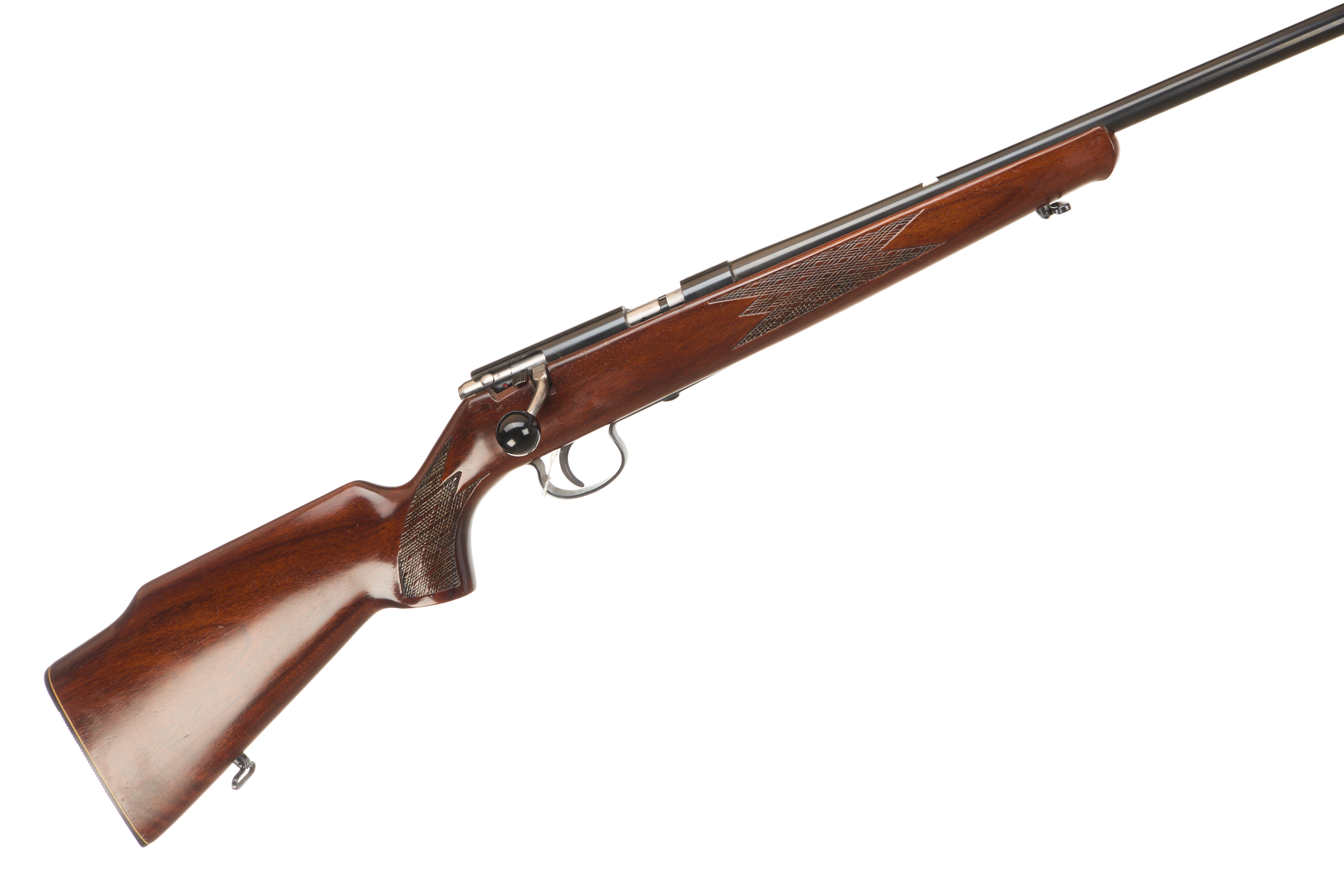 Ebonite butt plate chequered semi-pistol grip and forend with raised cheek piece. Sling swivels. Screwcut barrel with hooded foresight. Missing magazine, thumb safety. Barrel 21 3/8”, OAL 40 5/8”