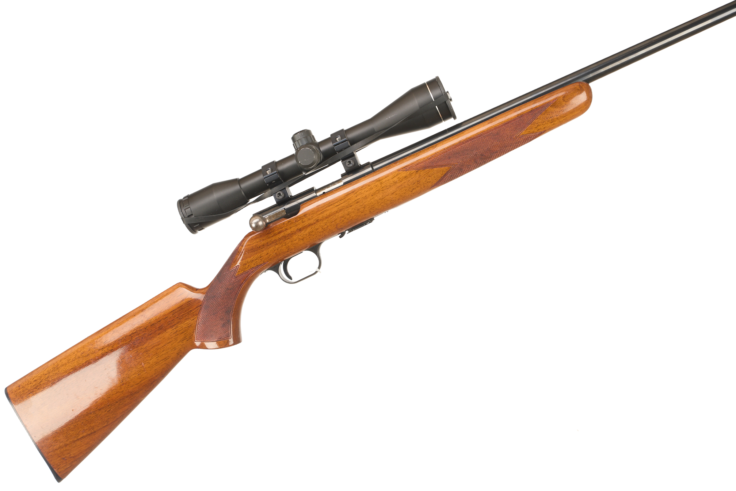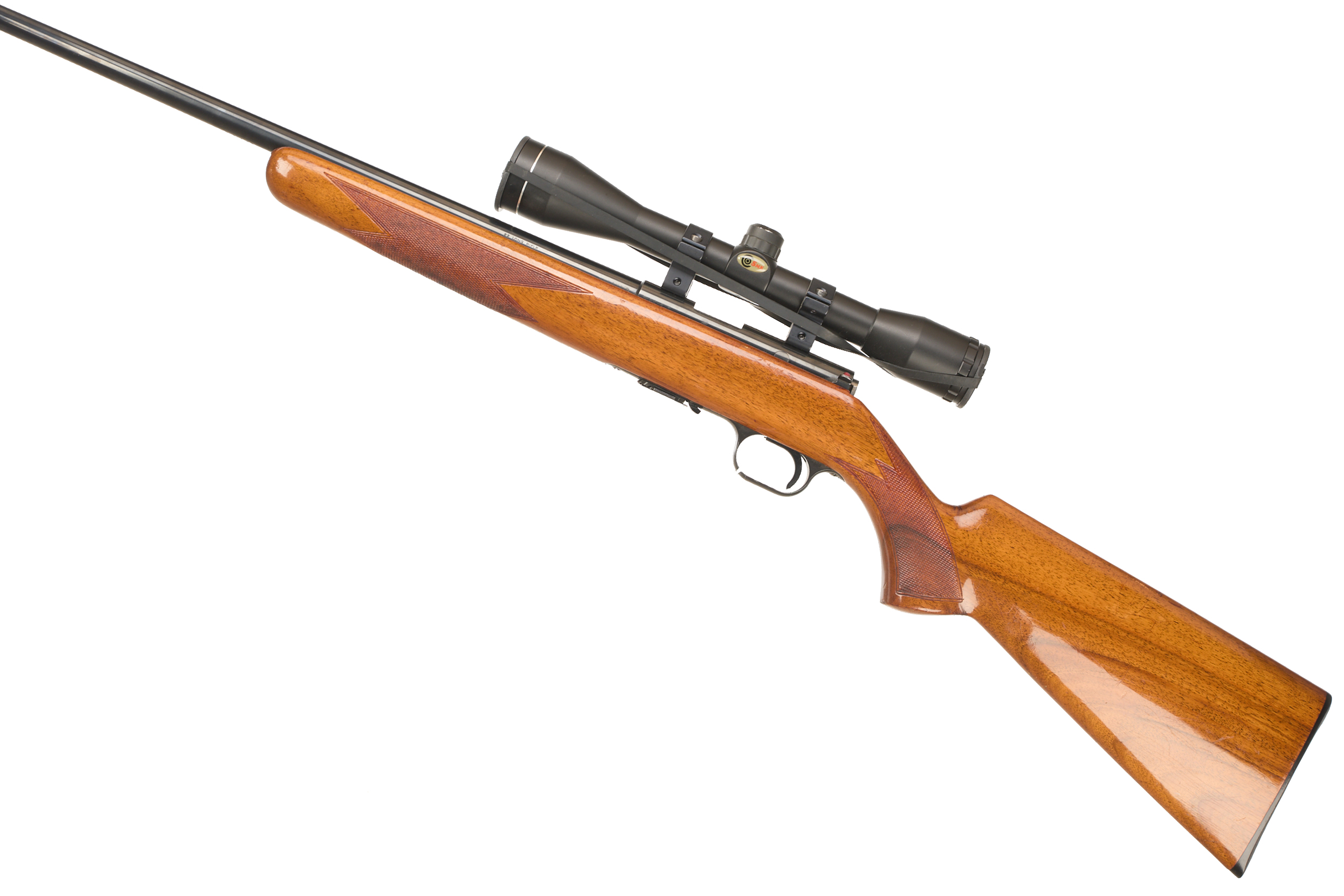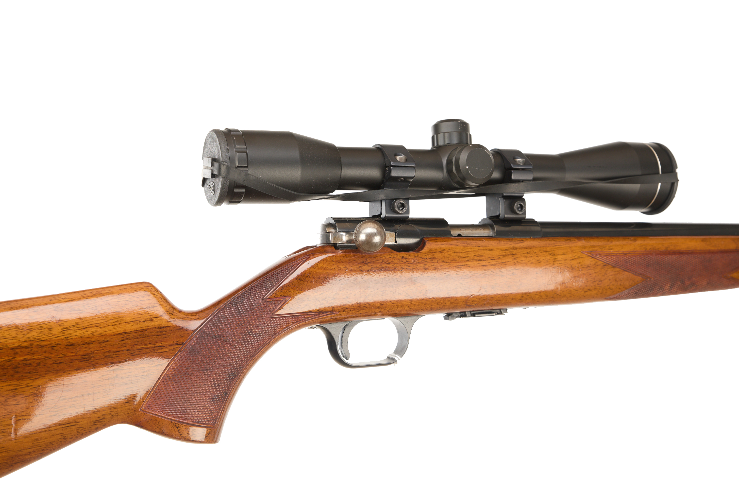 Plastic butt plate, stock with chequered grip and forend. Post front sight, rear sight absent, integral dovetail scope rail. CW detachable magazine and SMK 4×40 scope.