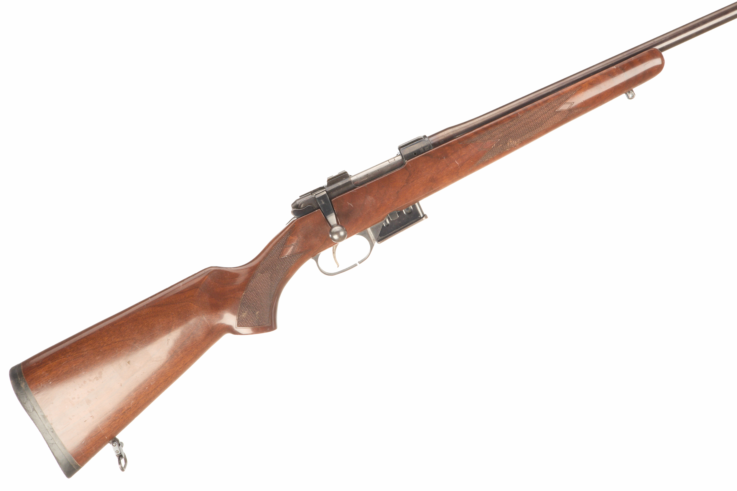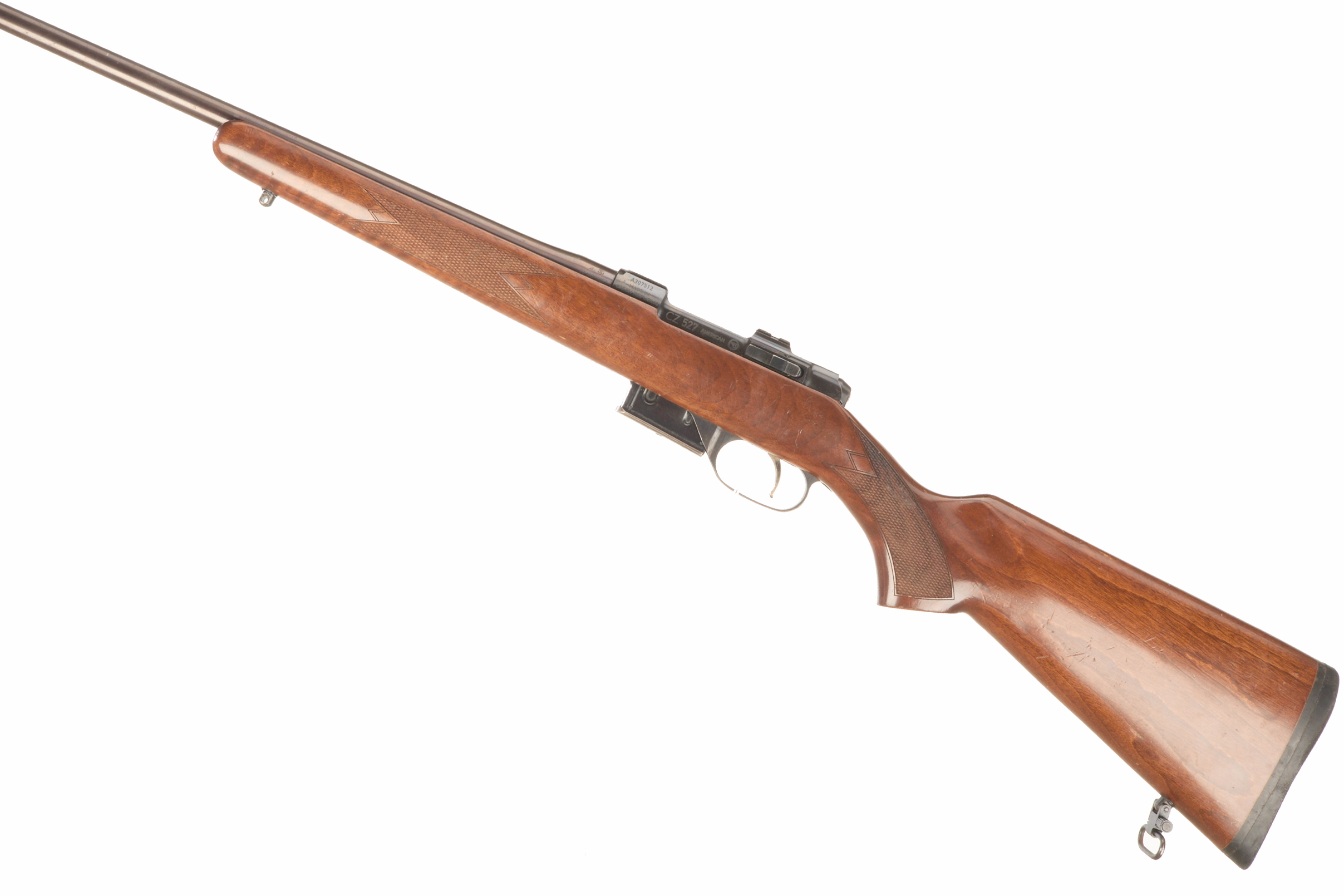 Rubber butt pad, chequered grip and forend, front and rear sling studs (rear sling loop), screw cut barrel, dovetail scope rail. CW detachable box magazine.