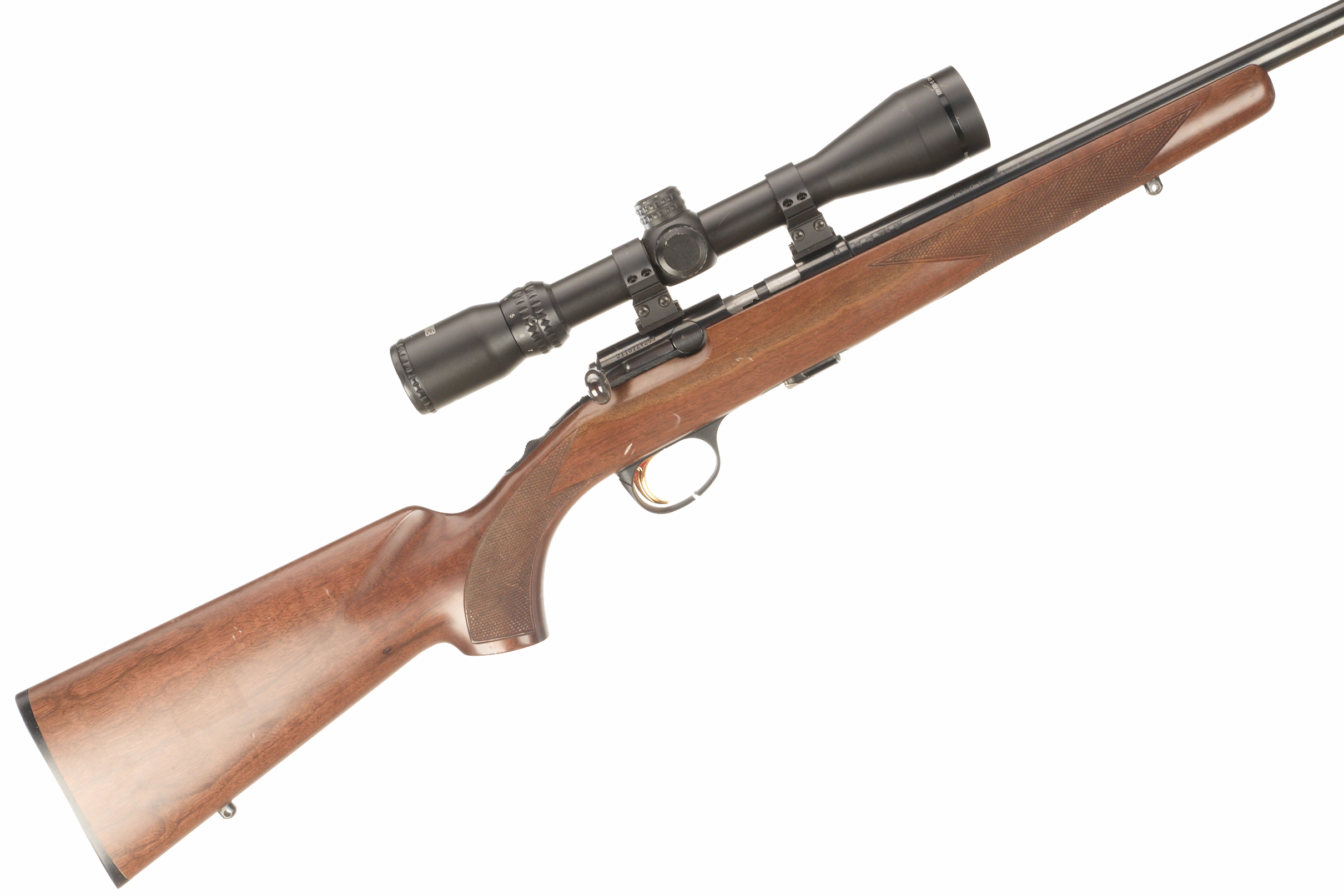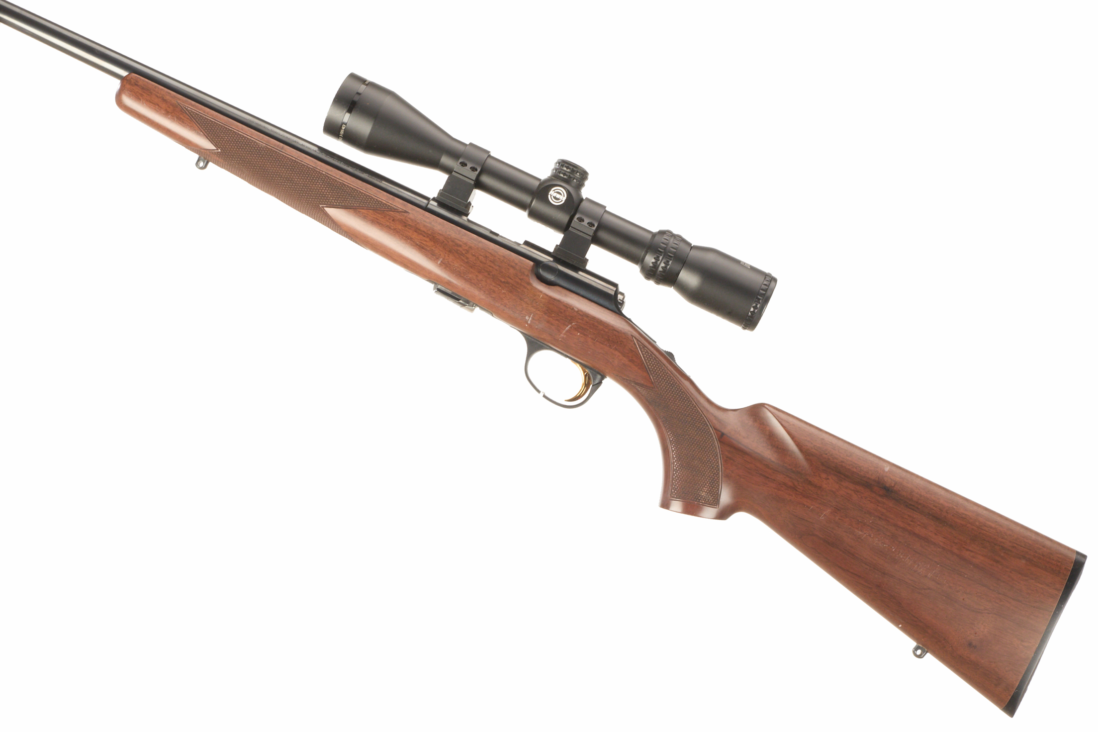 Plastic butt pad, chequered grip and forend, front and rear sling studs. Gold washed trigger, CW 3-9×40 HAWKE scope. Screw cut barrel CW thread protector and detachable box magazine.