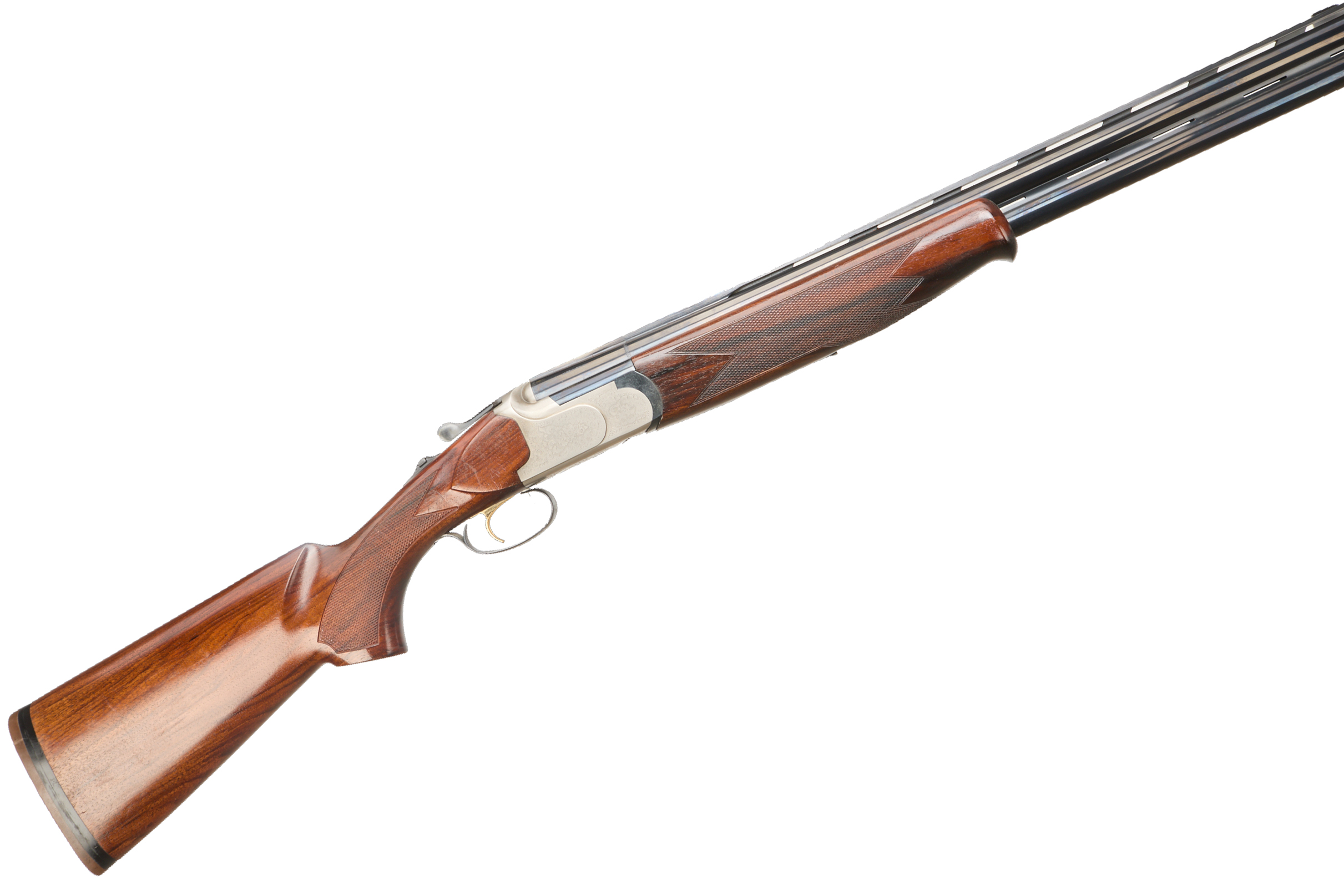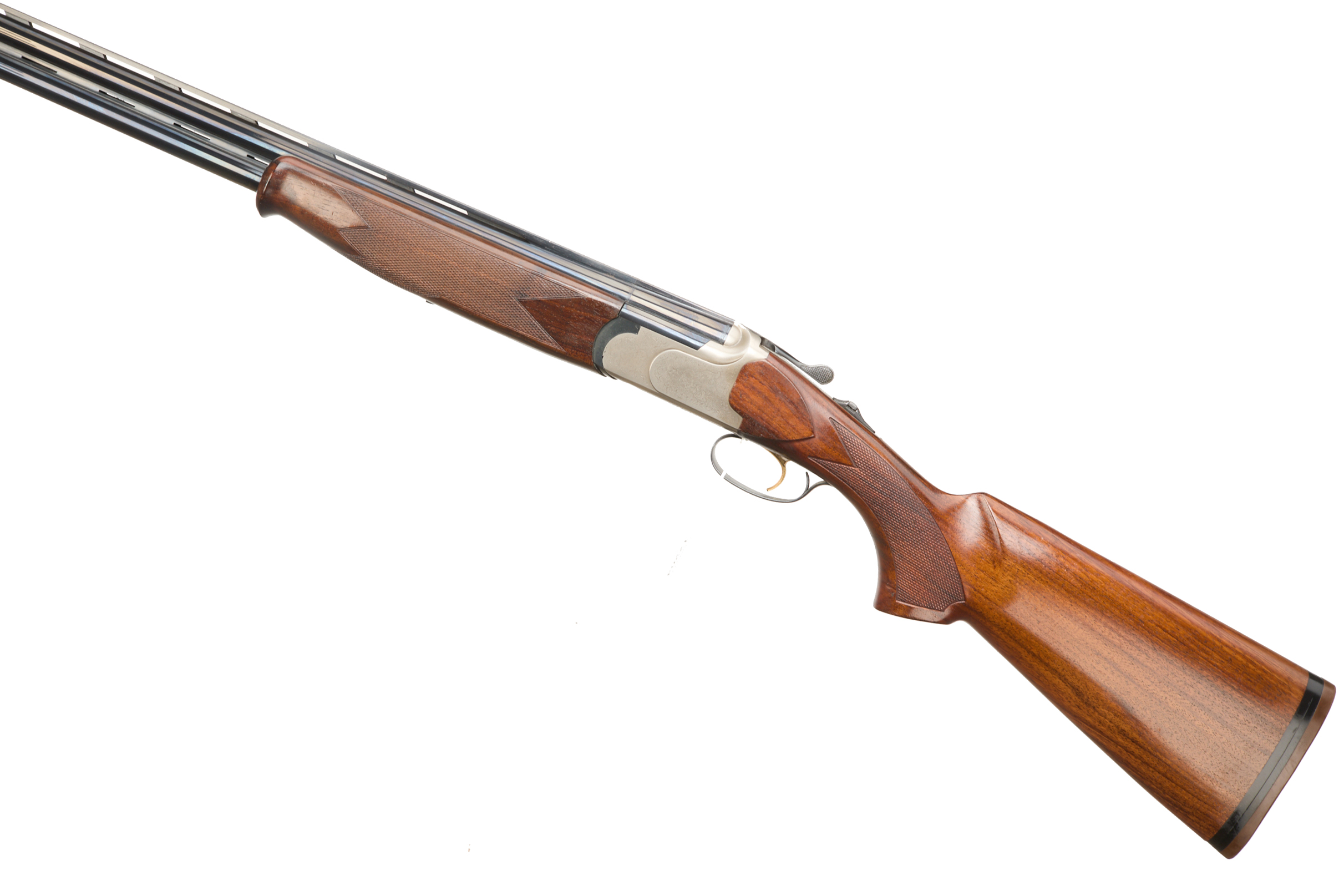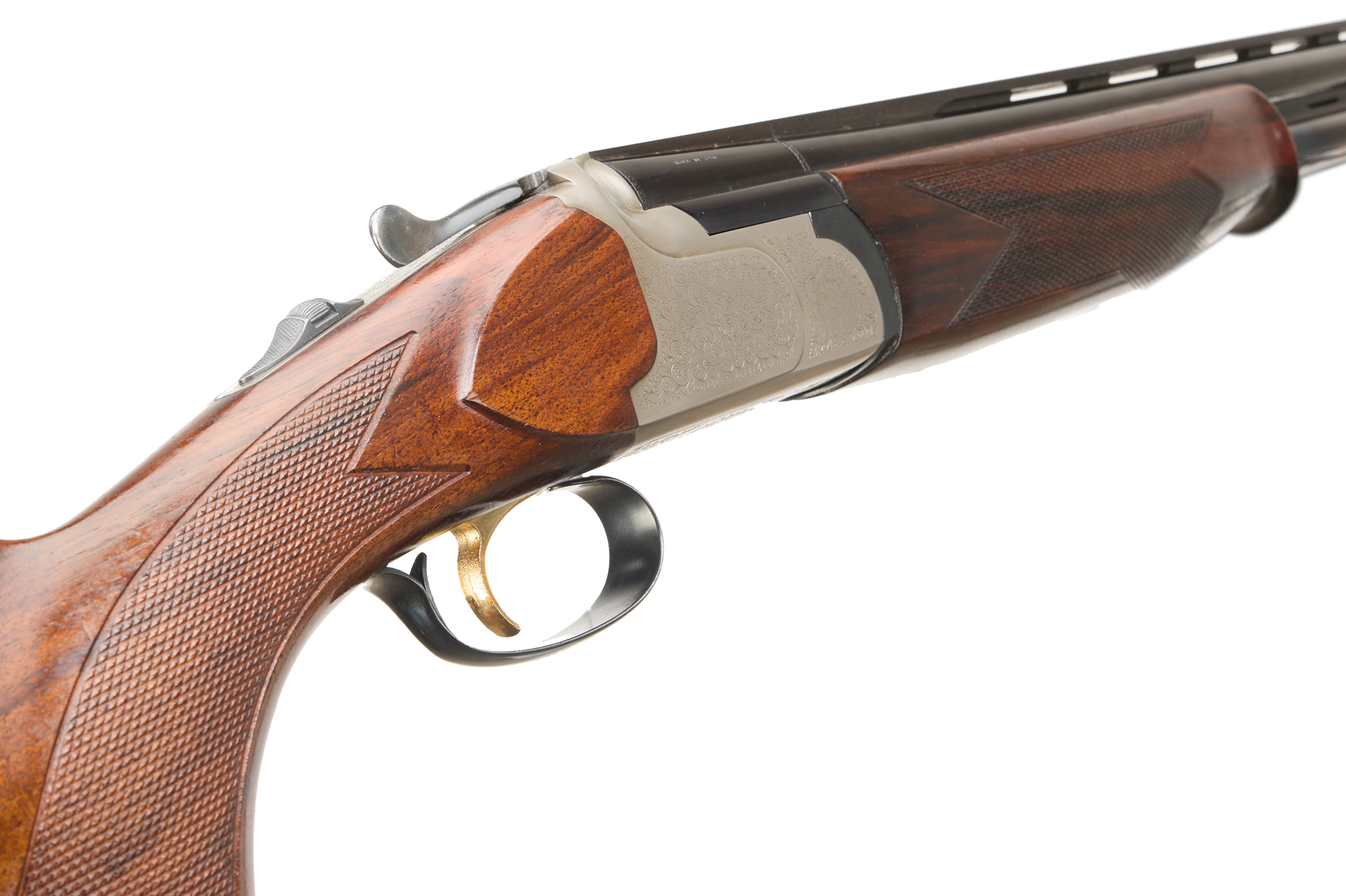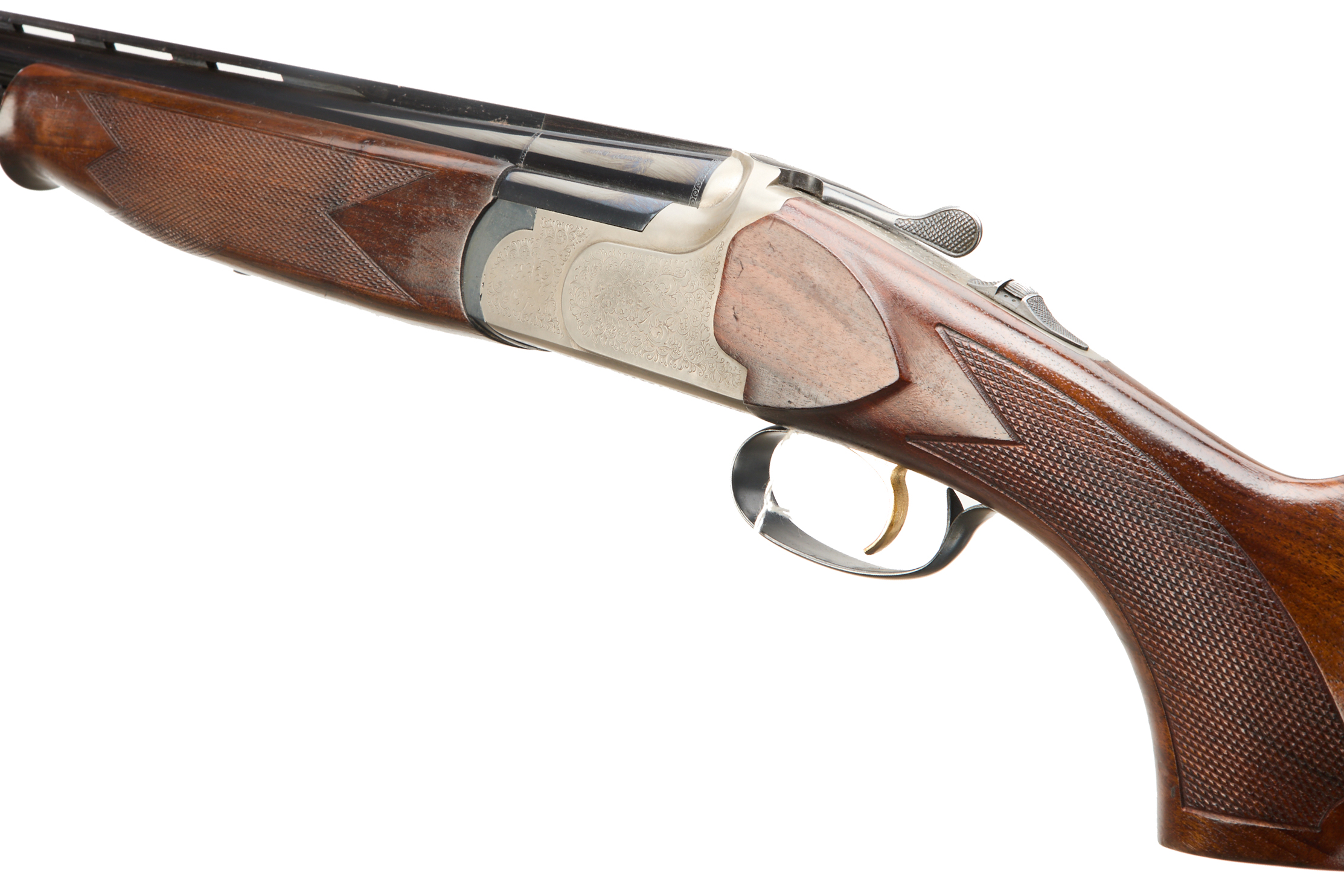 Rubber butt pad, chequered full-pistol grip and forend, ventilated top and mid rib. Acanthus scrolls to action. Gold wash trigger, integrated barrel selector (selective single trigger) and safety.