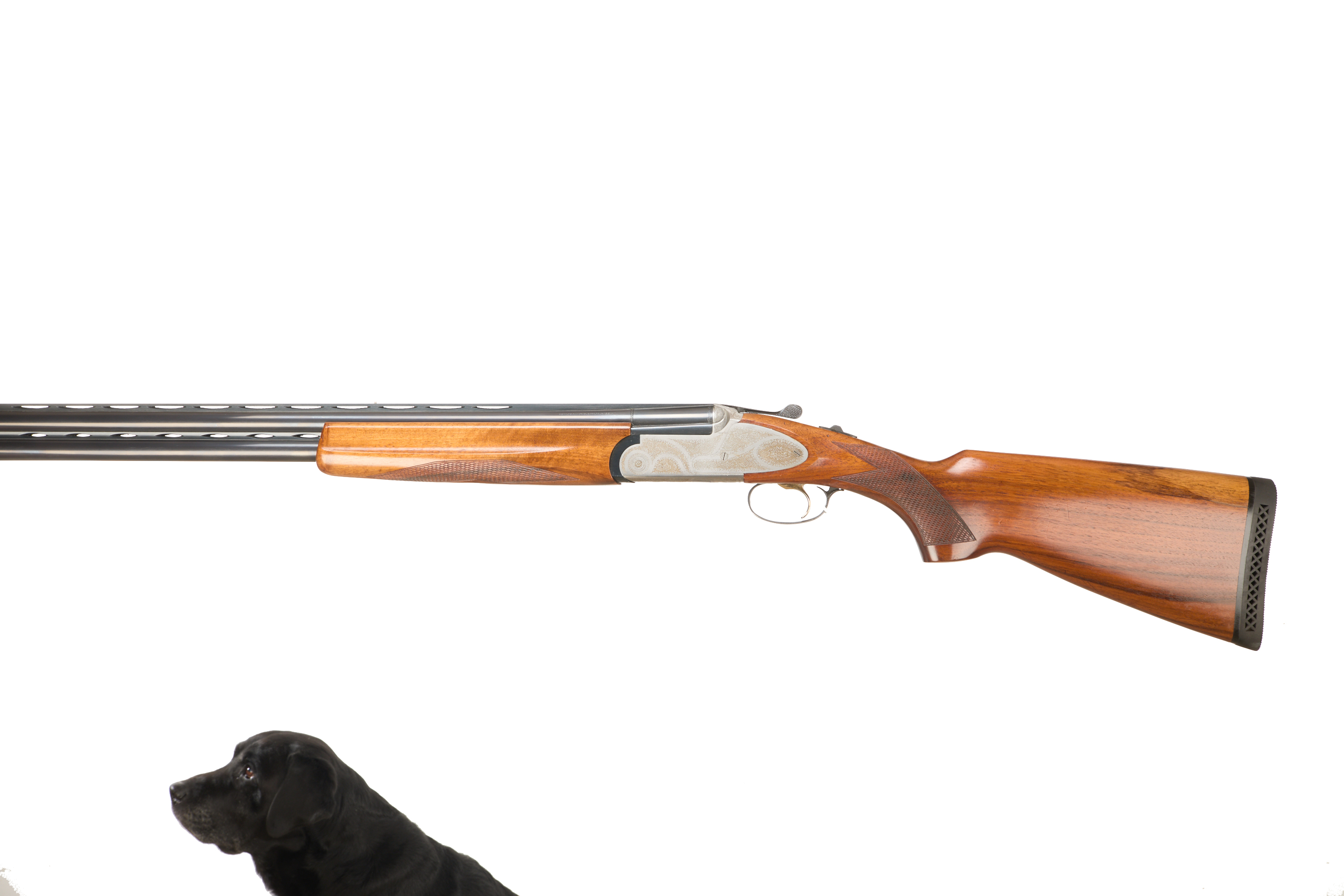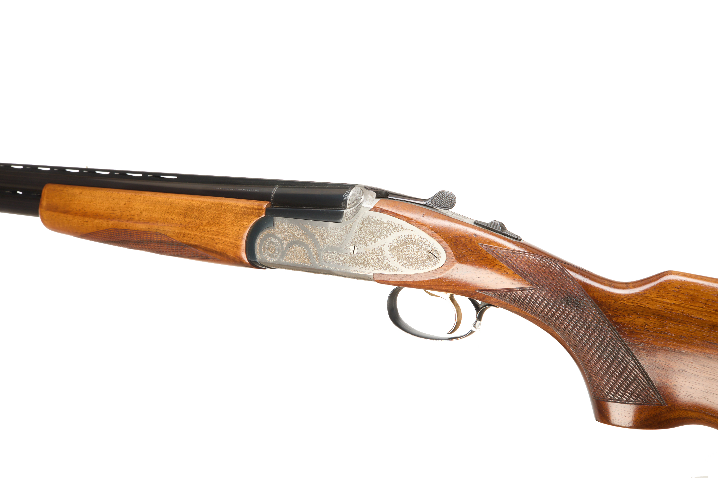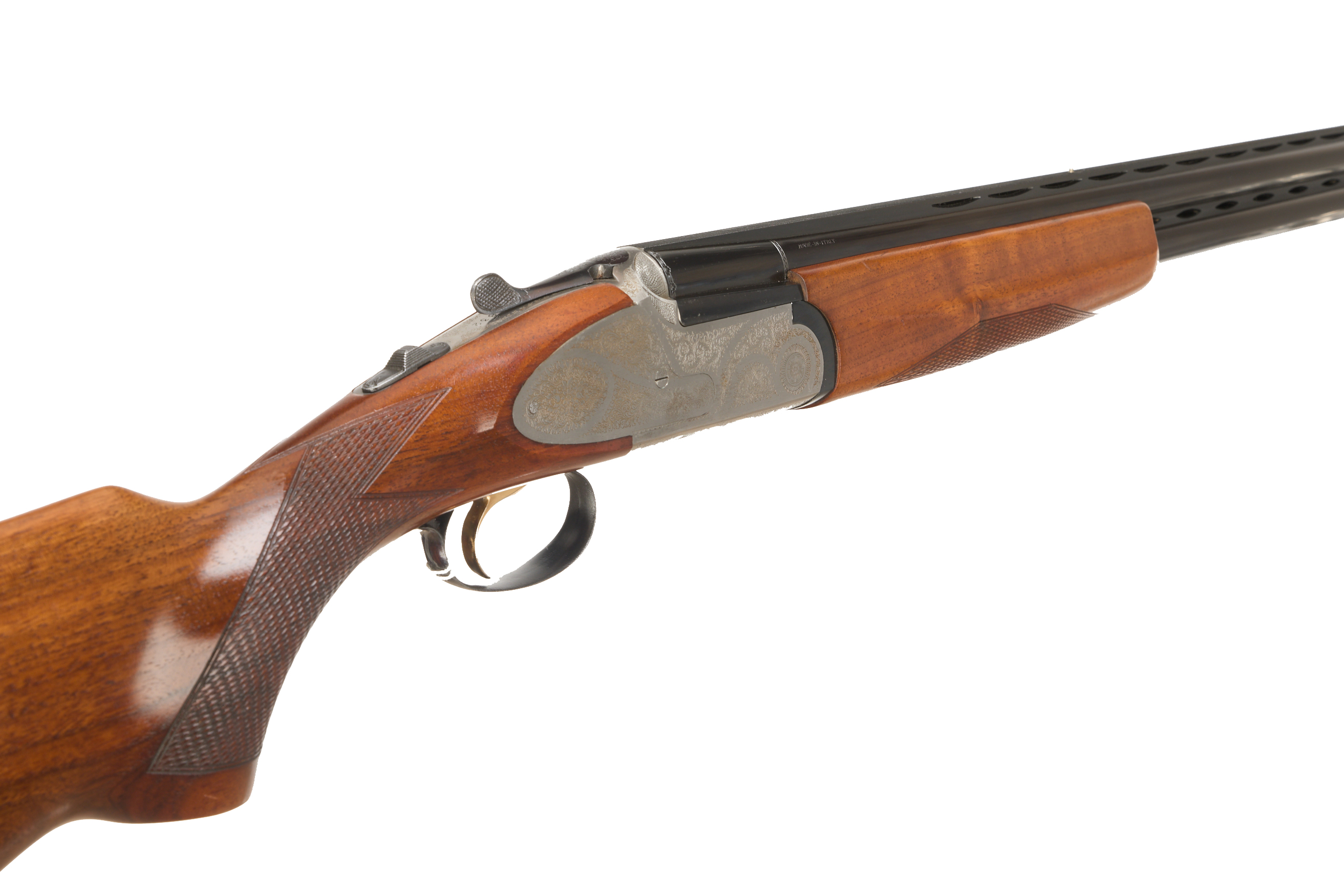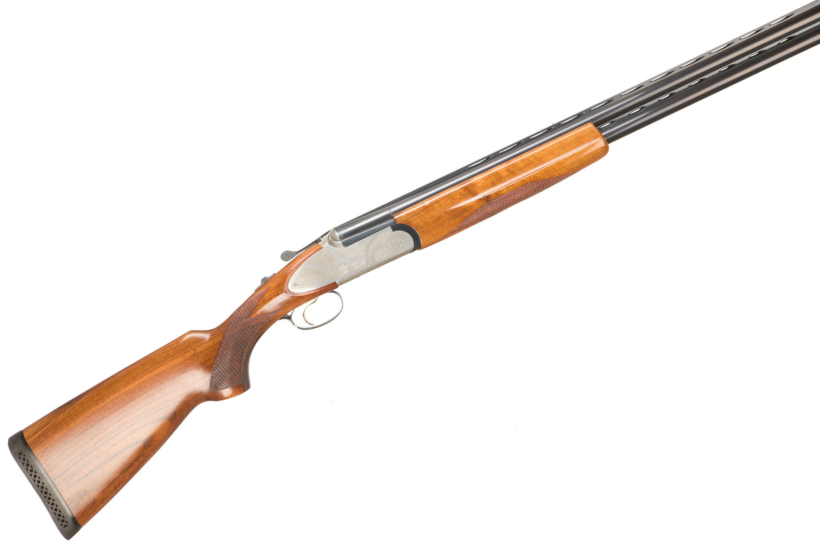 Ventilated butt pad, chequered semi-pistol grip and forend, ventilated top and mid rib. Acanthus scrolls to action. Gold wash trigger, integrated barrel selector (selective single trigger) and safety. With extending multi-chokes and spares.