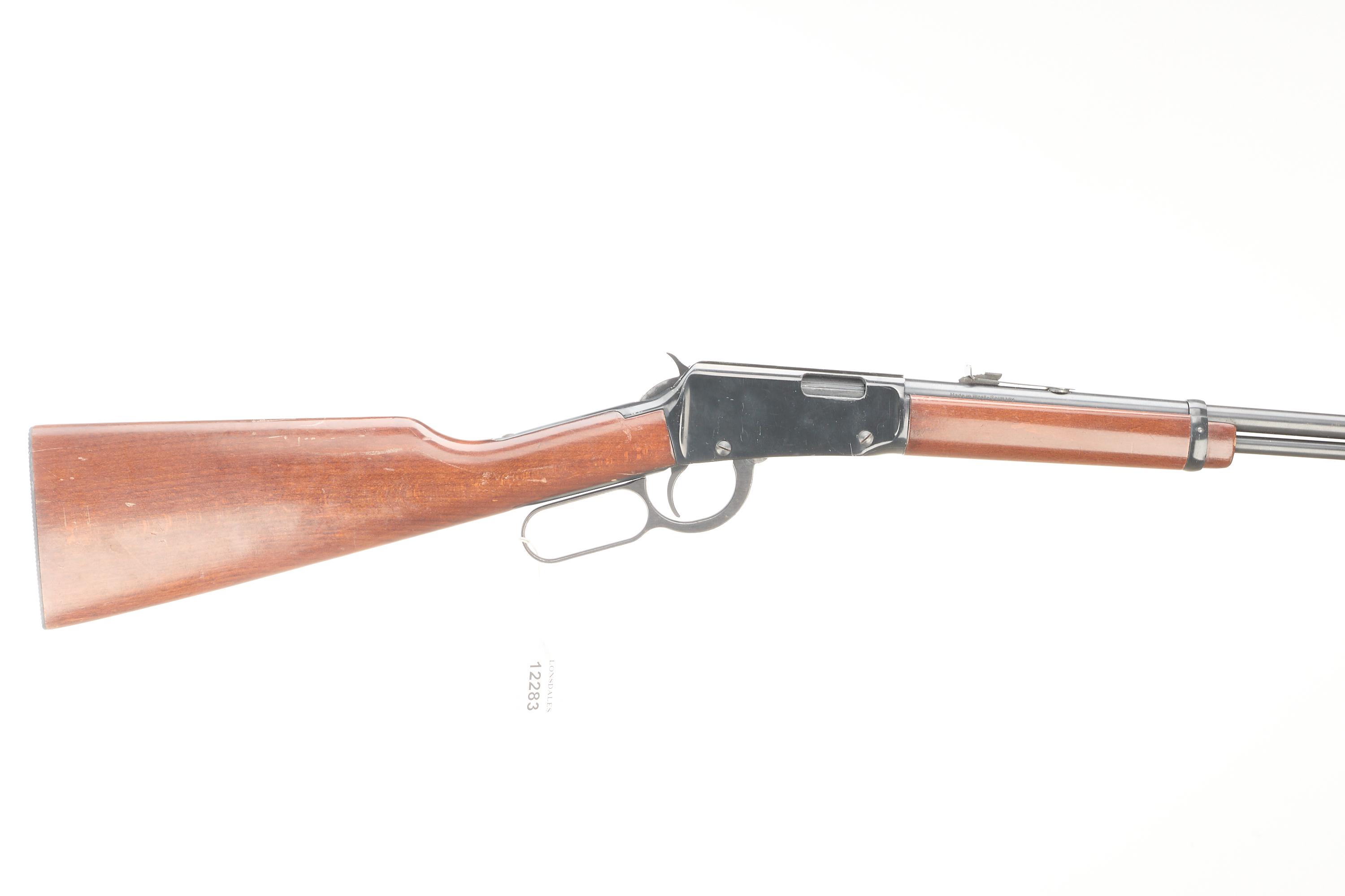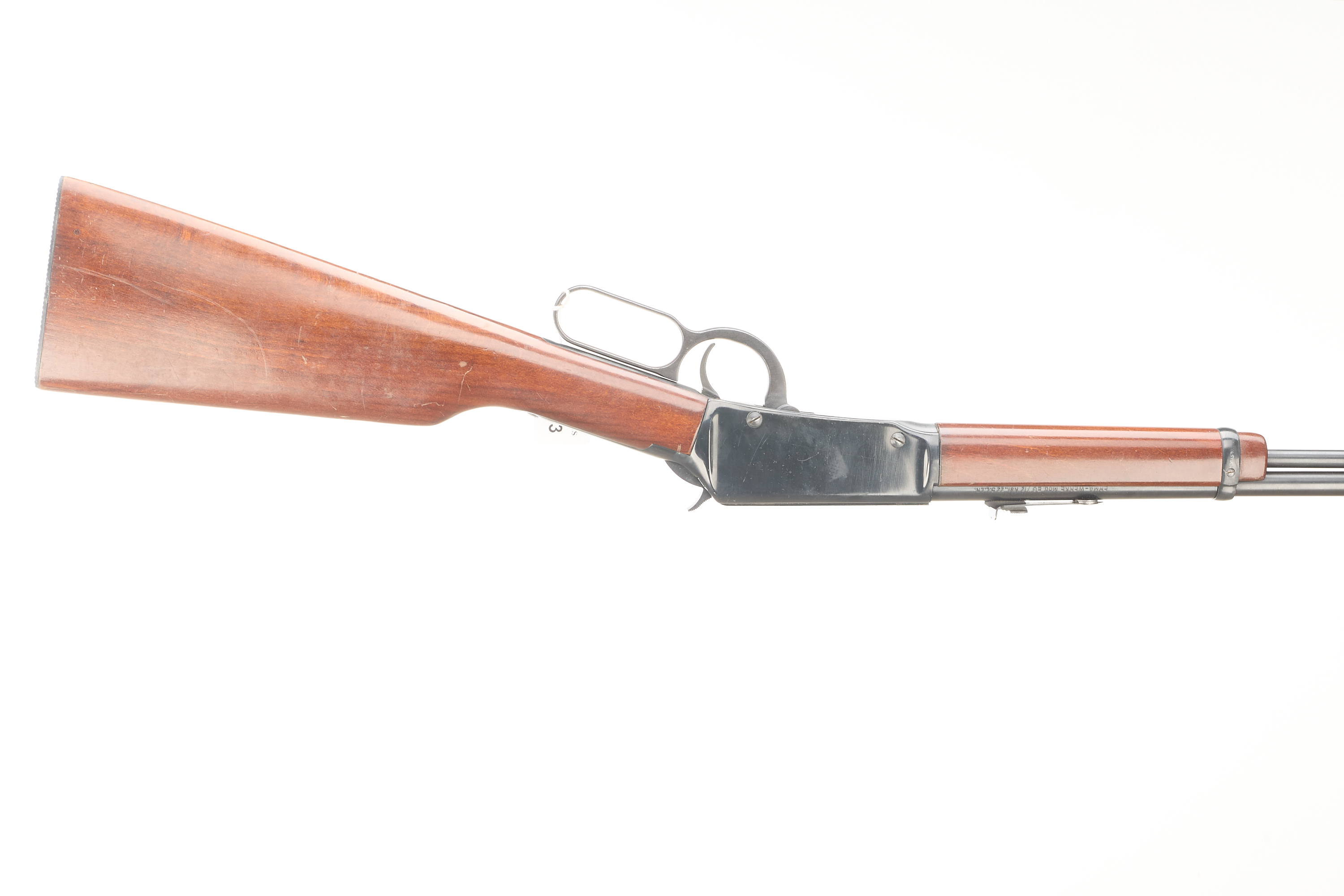 Plastic butt pad, smooth walnut stock and forend, post front sight, notch rear sight. Integral tube magazine, dovetail scope rail.