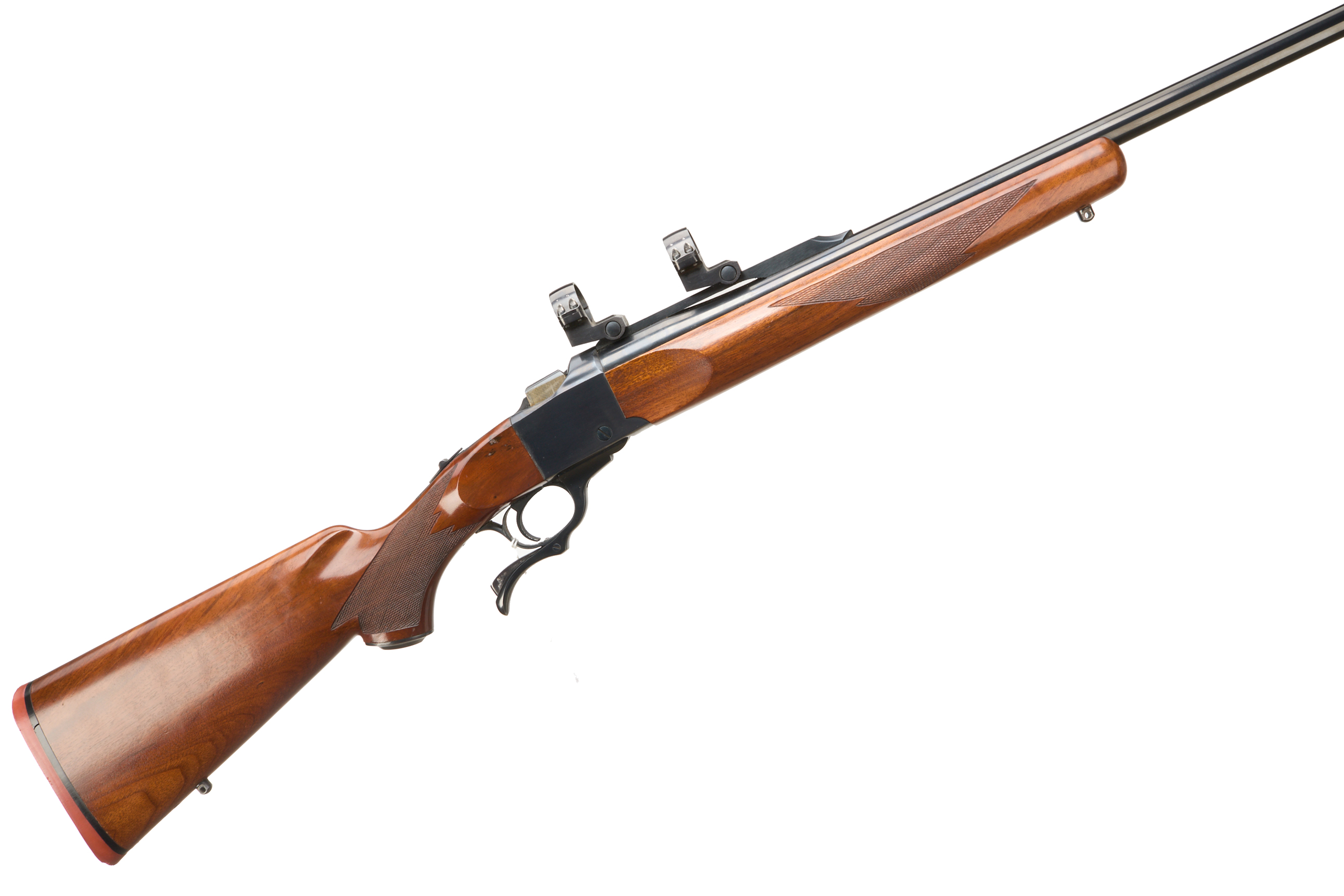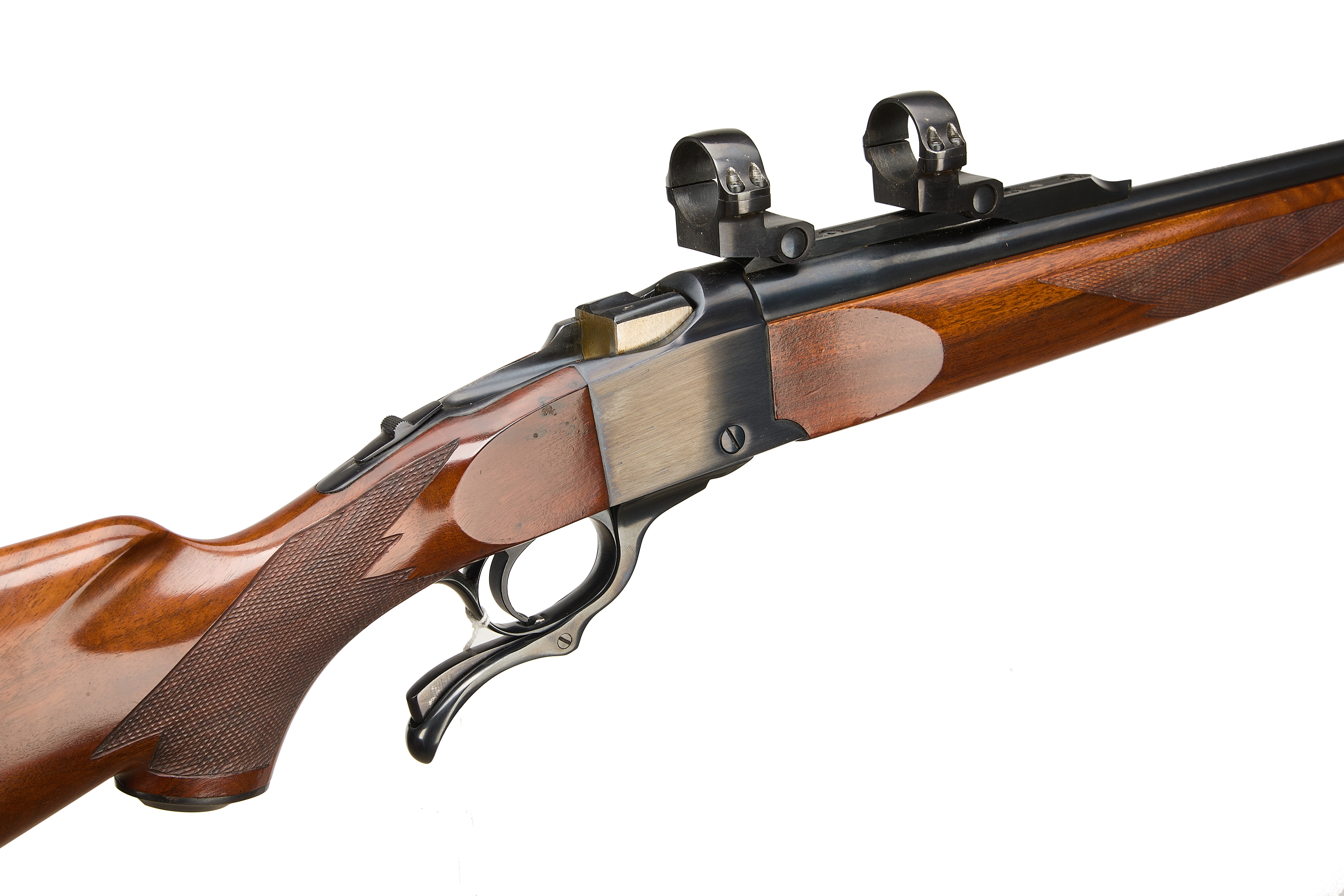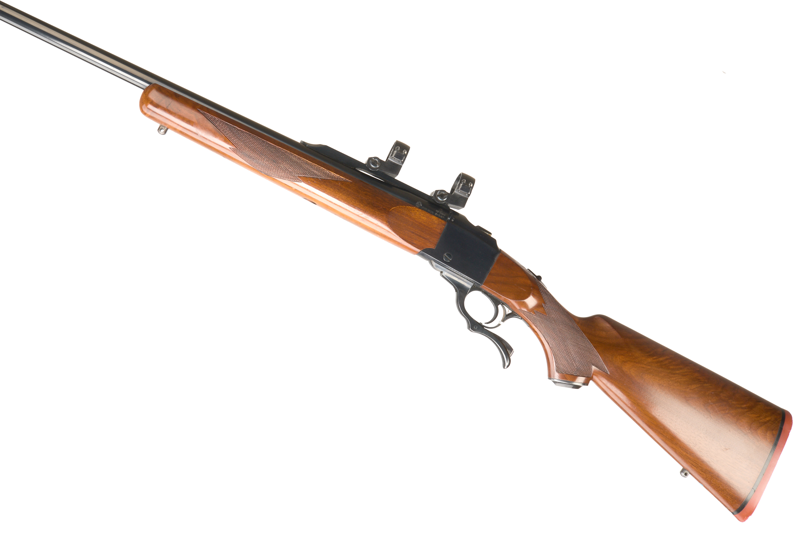 Rubber butt pad, chequered grip and forend, unsighted barrel. Front and rear sling studs. CW Ruger scope rail and 1in scope rings.