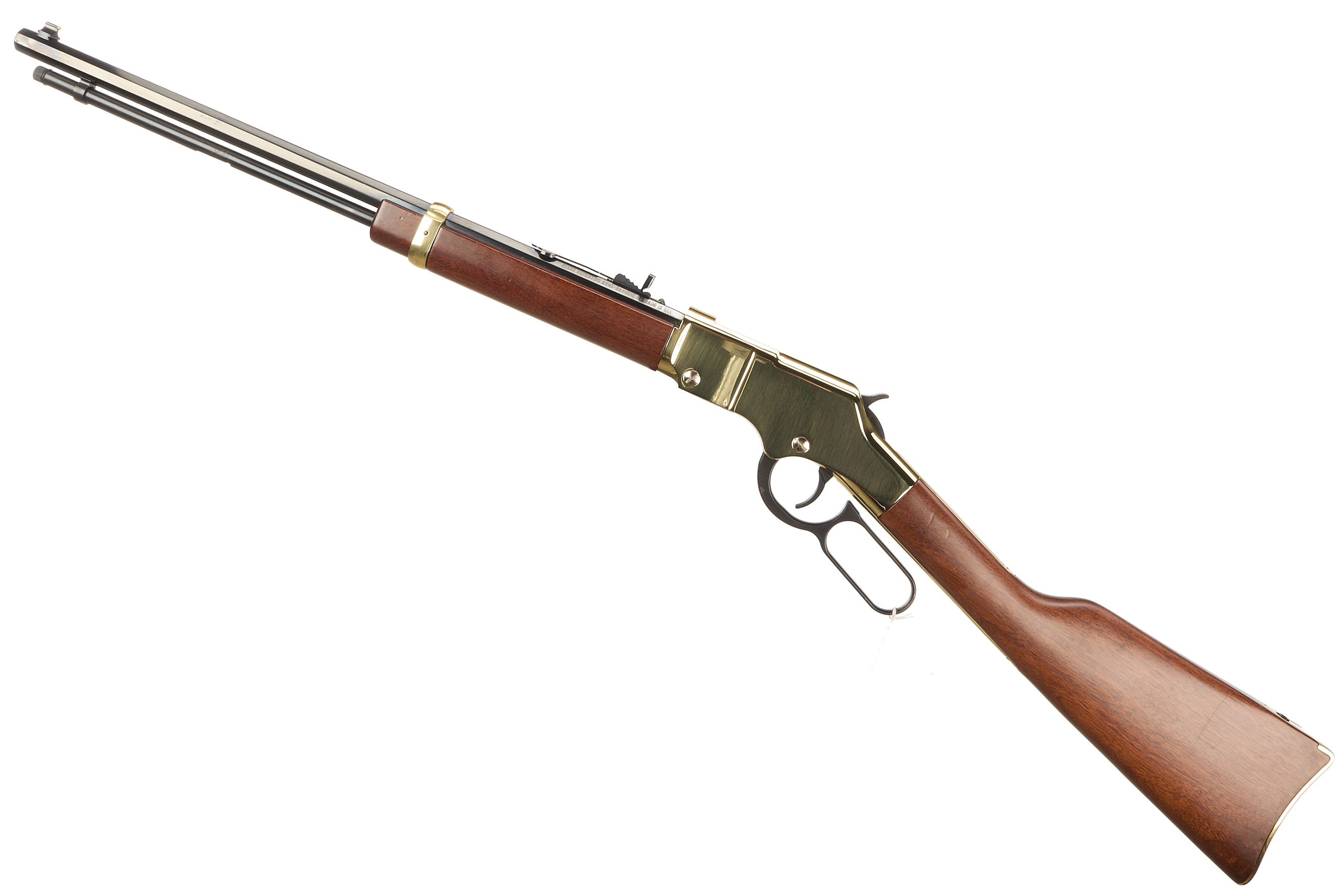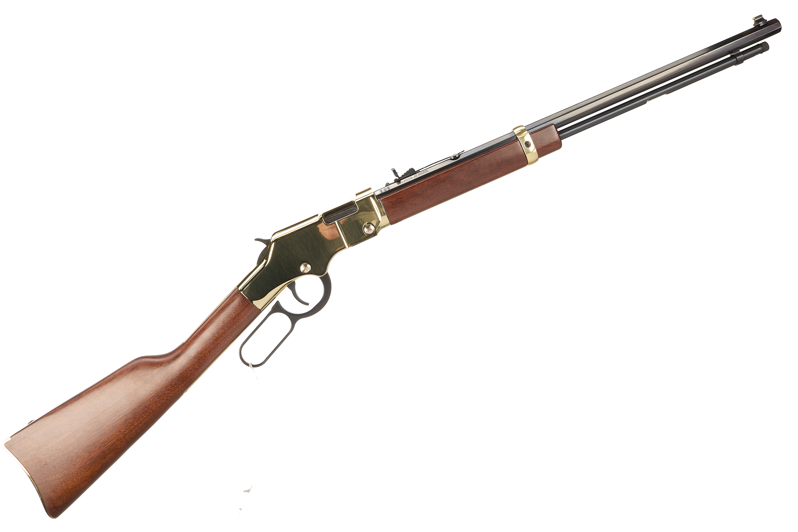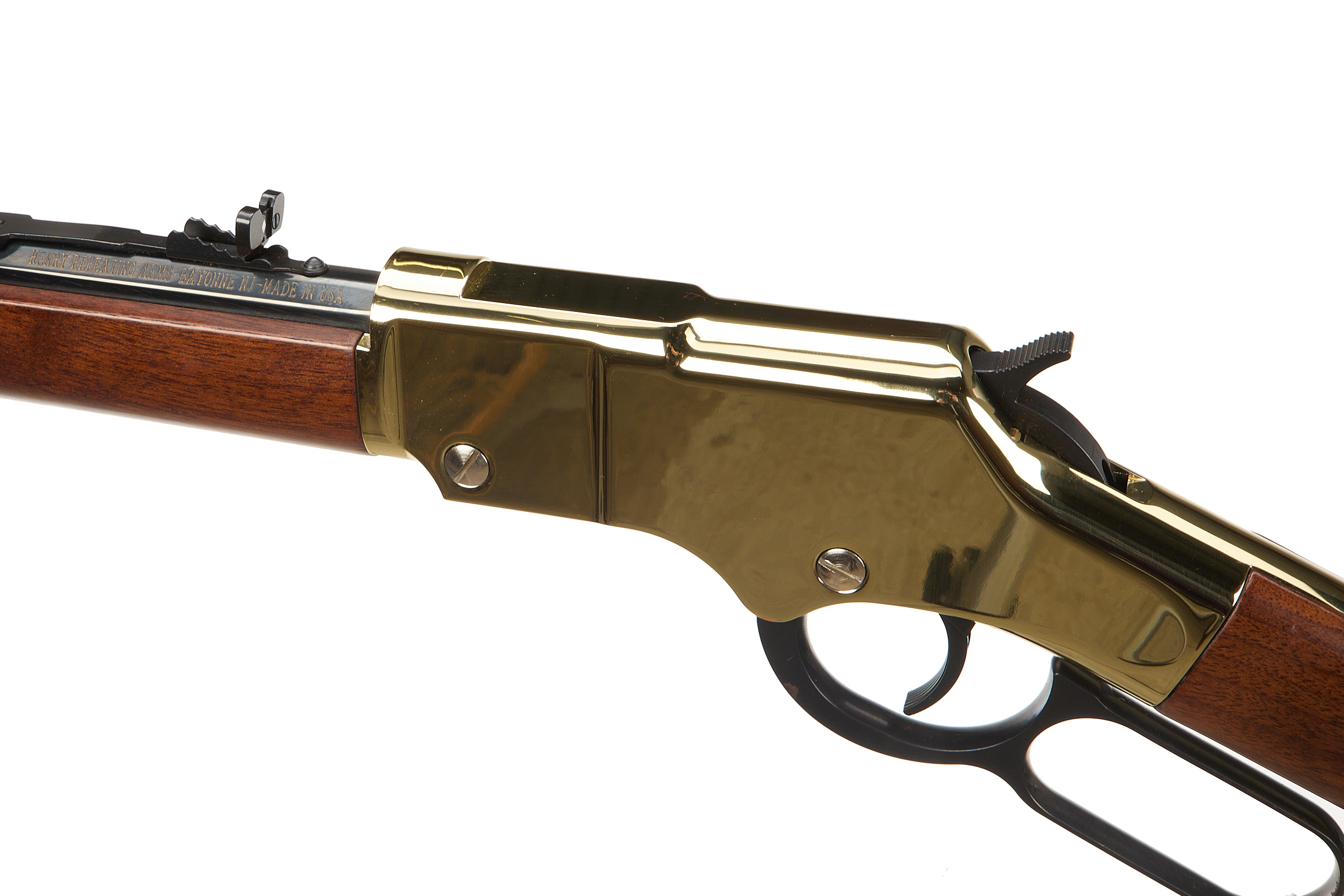 Polished brass buttplate, smooth walnut stock and forend. Polished brass action and octagonal blued barrel engraved "CALIBERS .22 S/L/LR" and "HENRY REPEATING ARMS-BAYONNE NJ-MADE IN USA" inlaid in gold. Polished brass barrel band. Post front sight with brass bead, adjustable semi-buckhorn rear sight. Half cock safety. Integral tube loaded magazine.