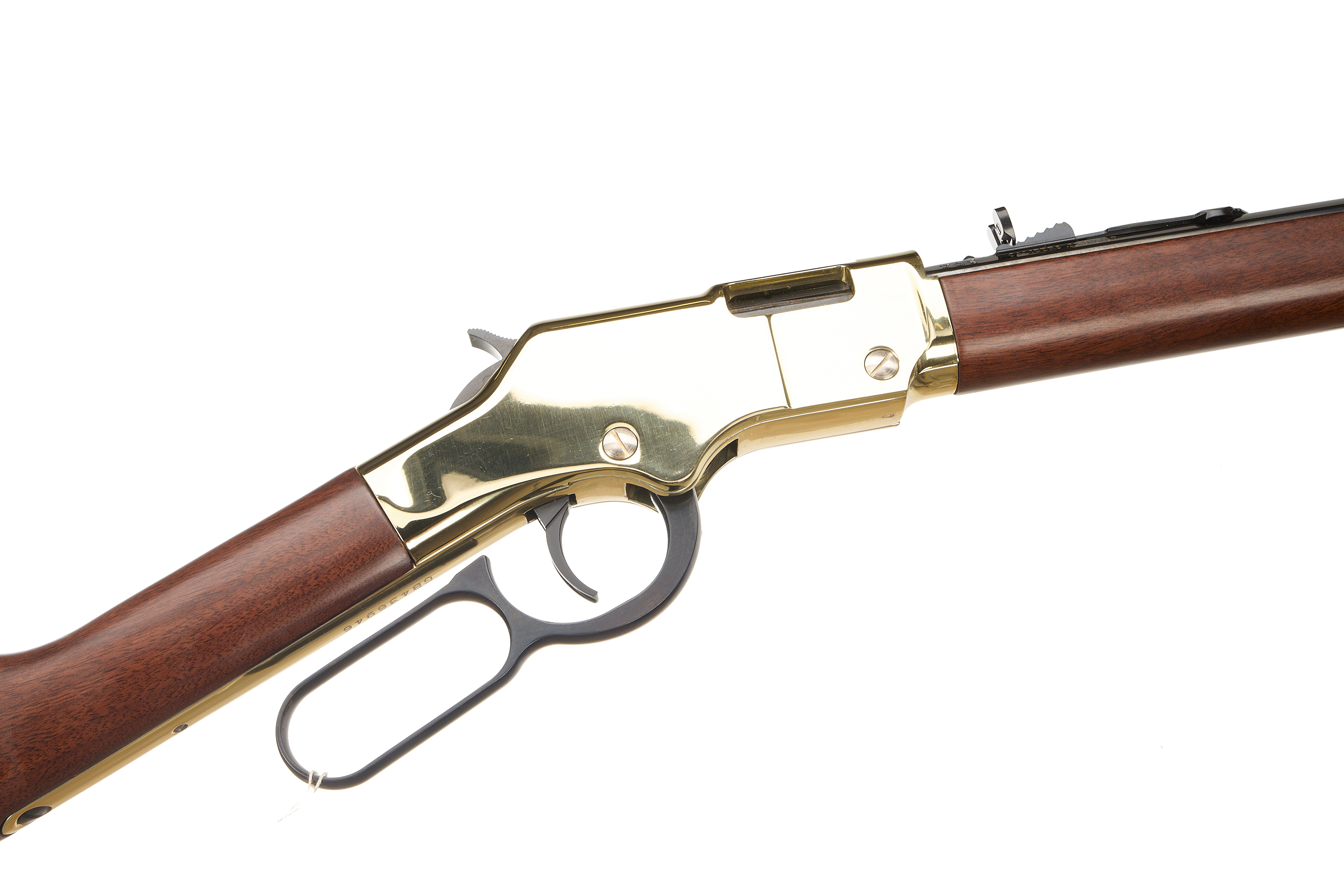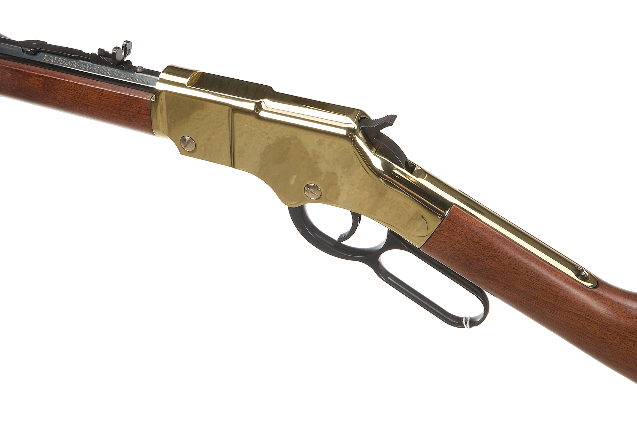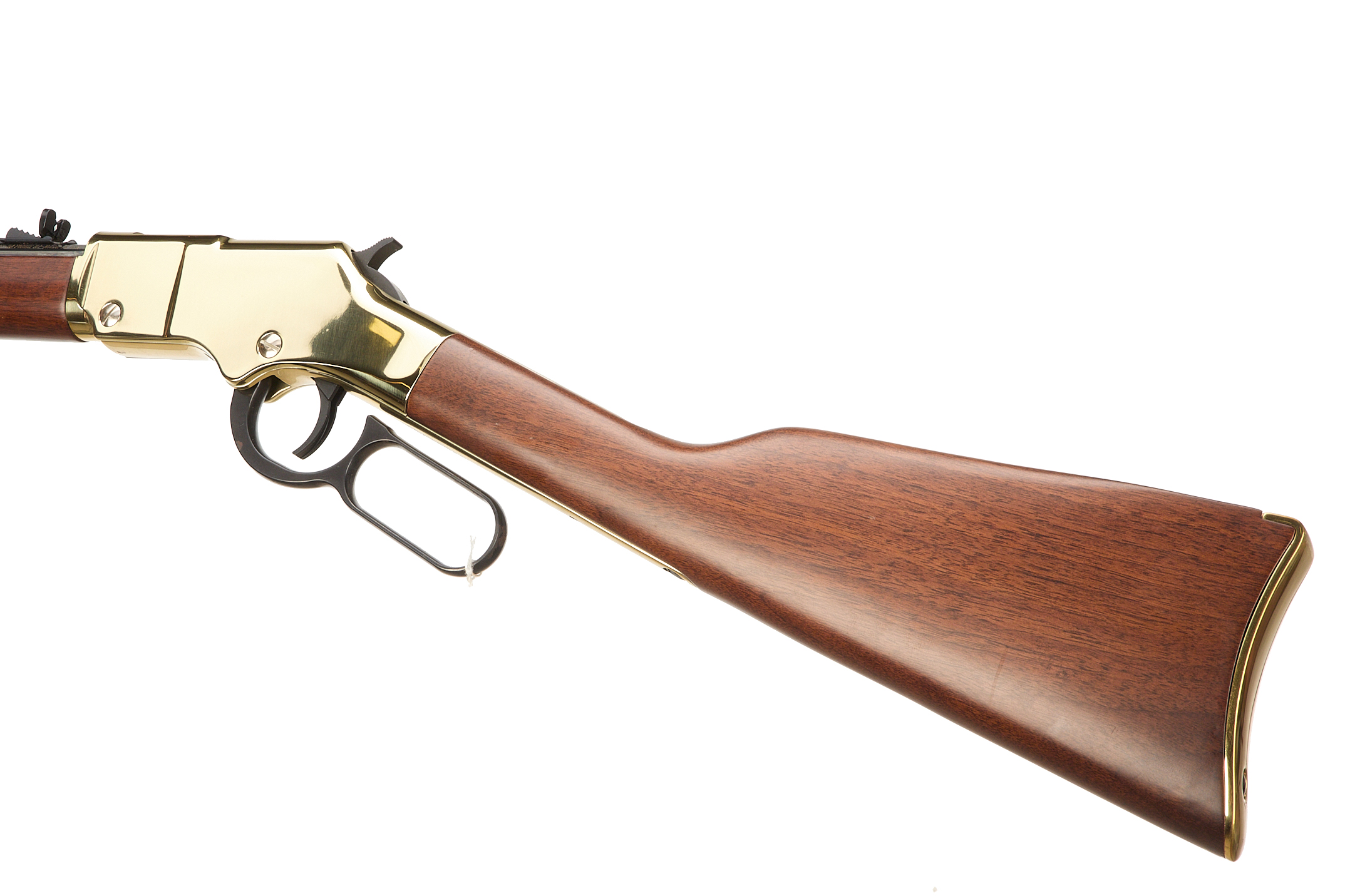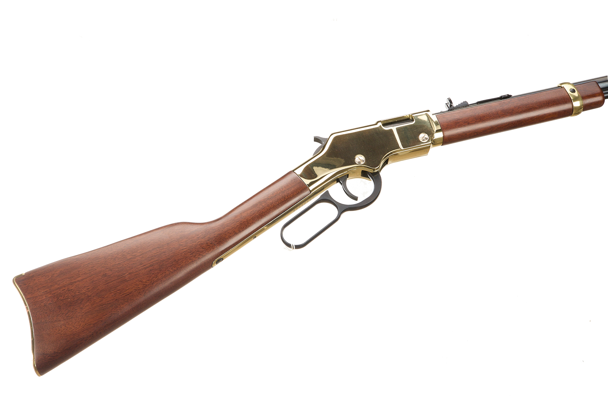 Polished brass buttplate, smooth walnut stock and forend. Polished brass action and octagonal blued barrel engraved "CALIBERS .22 S/L/LR" and "HENRY REPEATING ARMS-BAYONNE NJ-MADE IN USA" inlaid in gold. Polished brass barrel band. Post front sight with brass bead, adjustable semi-buckhorn rear sight. Half cock safety. Integral tube loaded magazine.