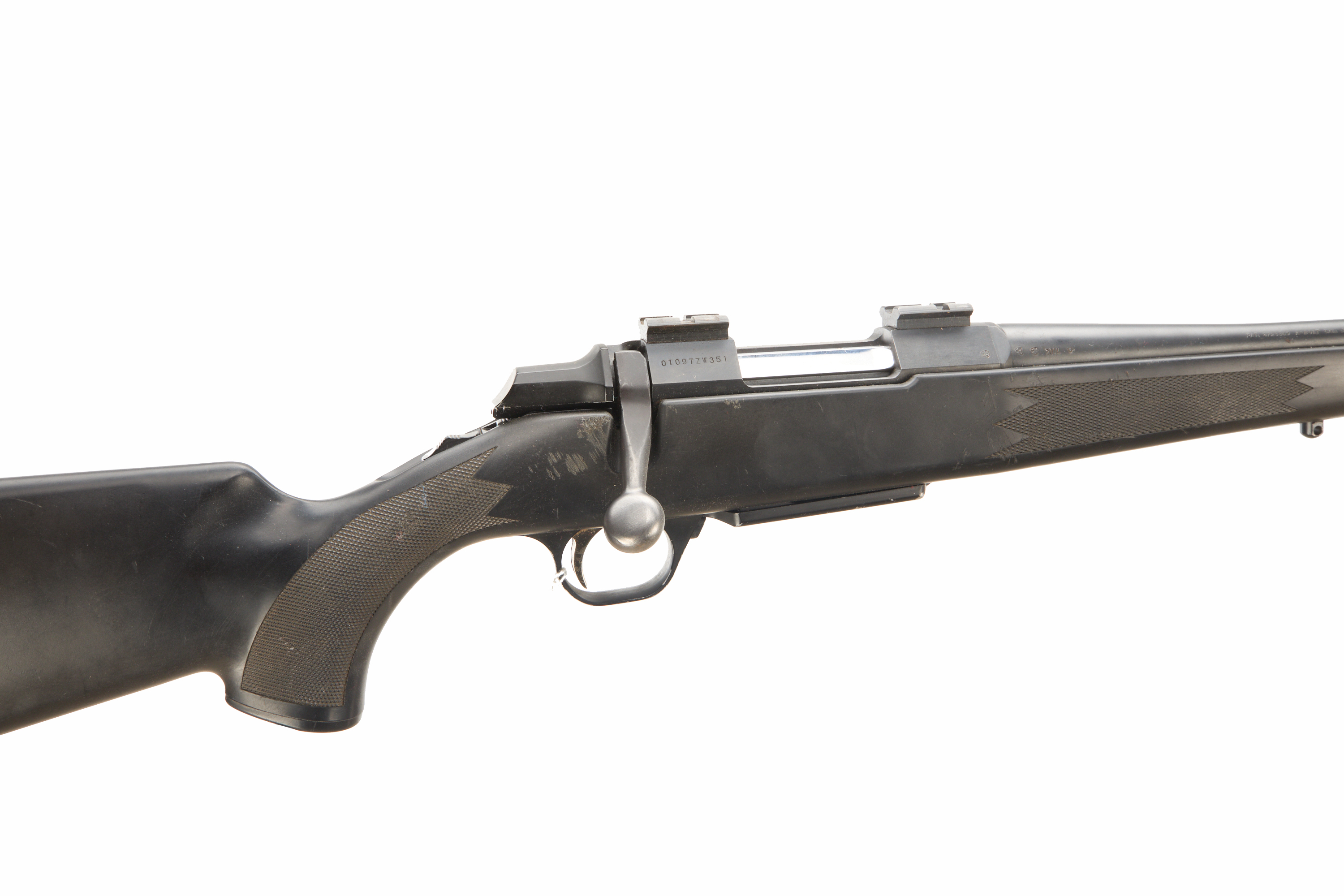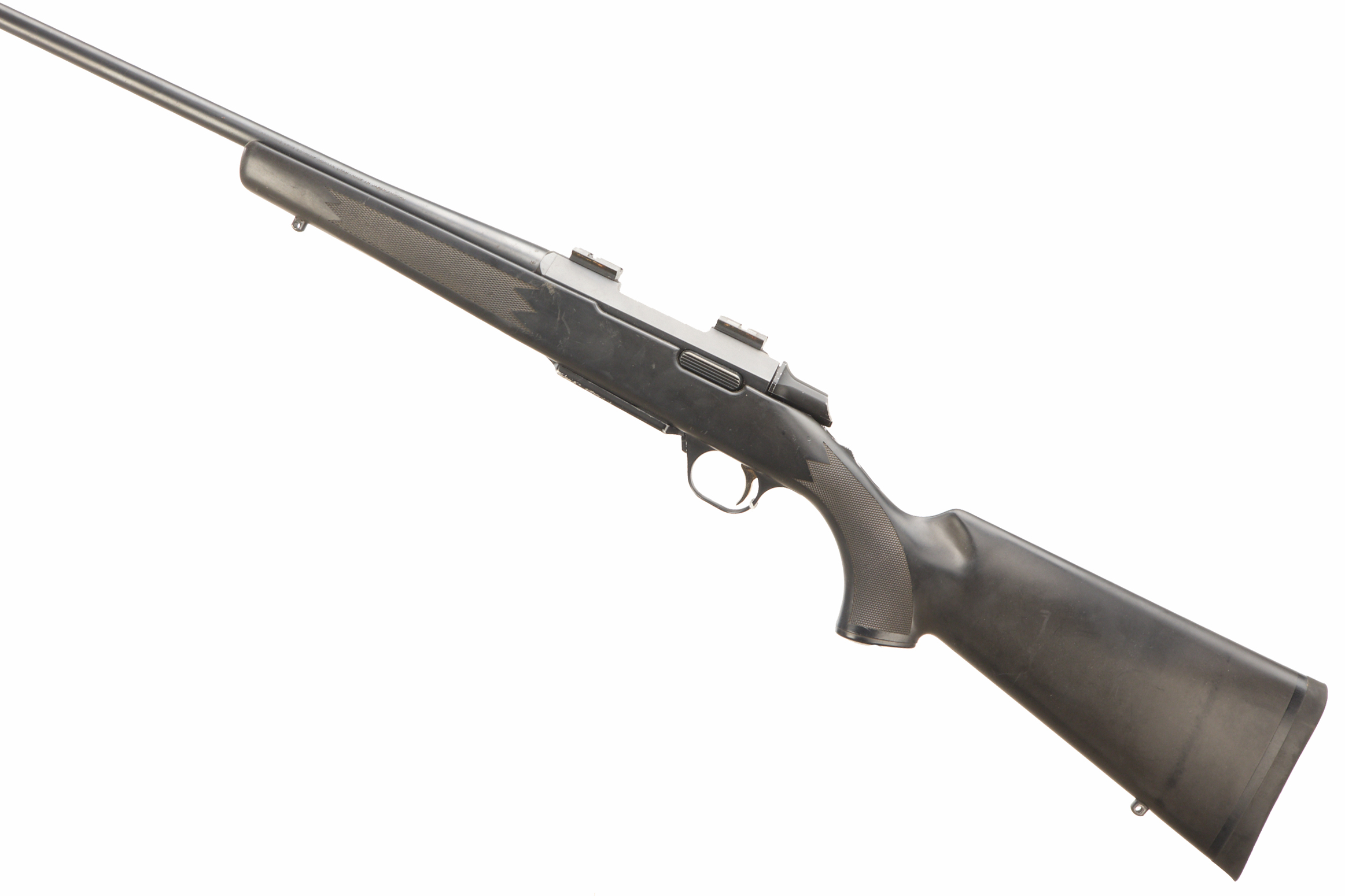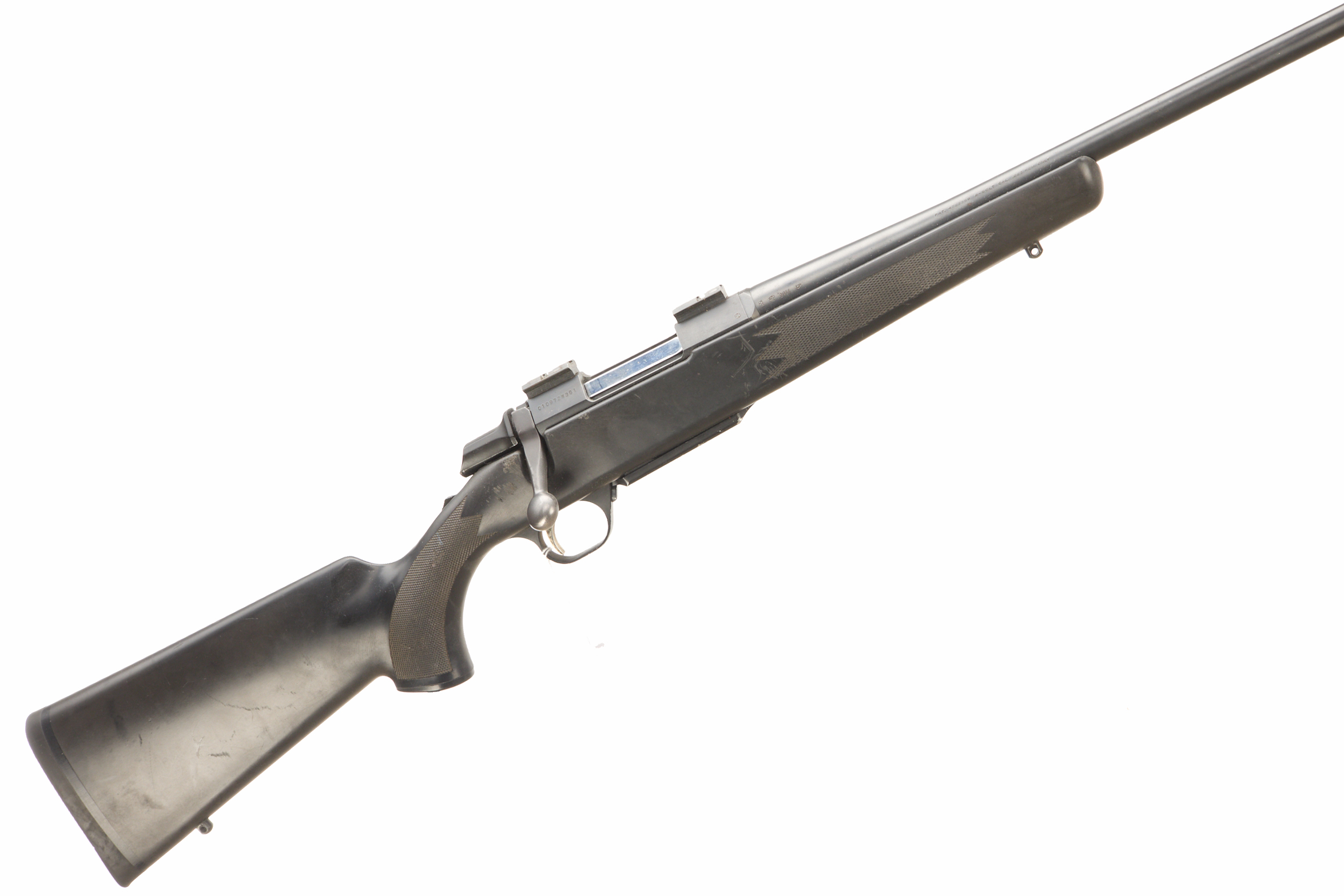 Rubber butt pad, synthetic stock with chequered grip and forend, front and rear sling studs, integral box magazine. Screw cut (thread protector absent). Action fitted with picatinny scope rail.