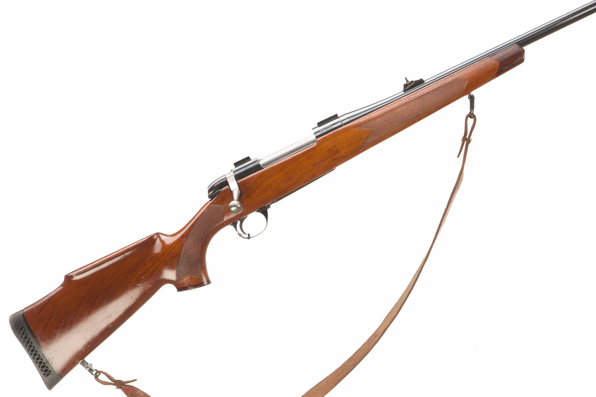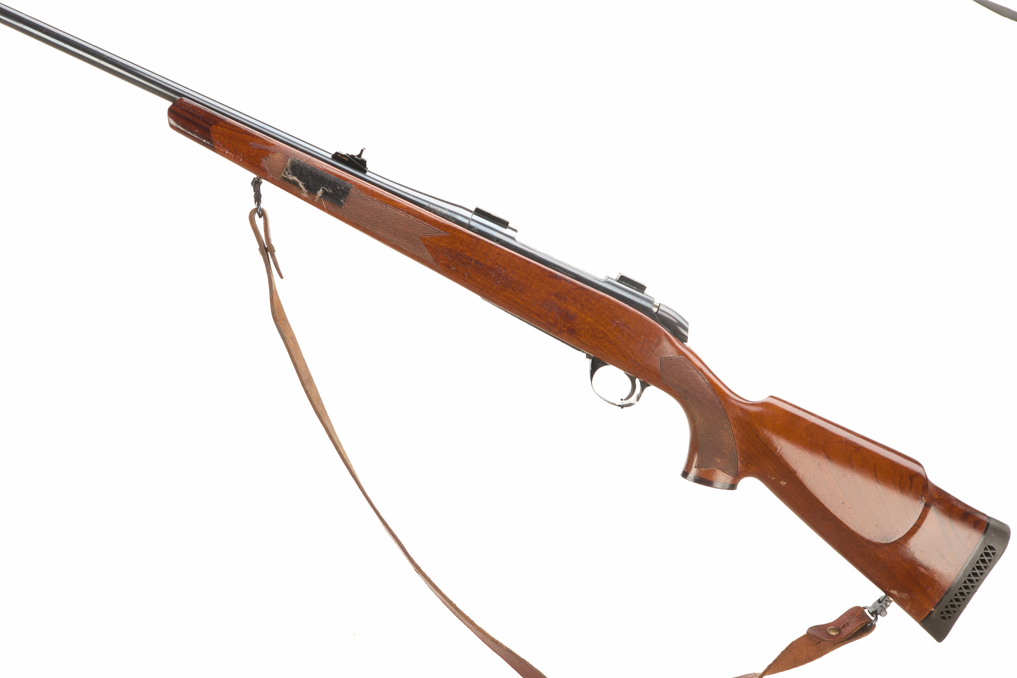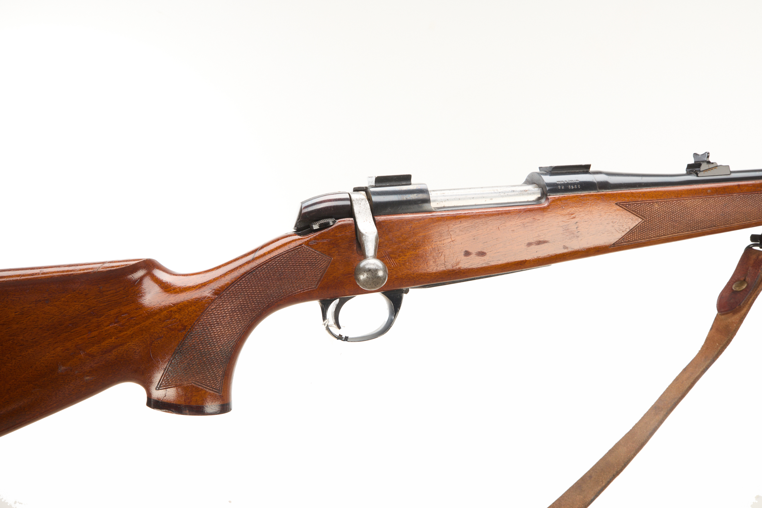 Ventilated rubber butt pad, wood stock with integral cheek piece, chequered grip and forend with decorative forend tip and grip cap. Post front sight, notch rear sight. Receiver fitted with dovetail scope mounts. CW sling and front and rear sling loops.