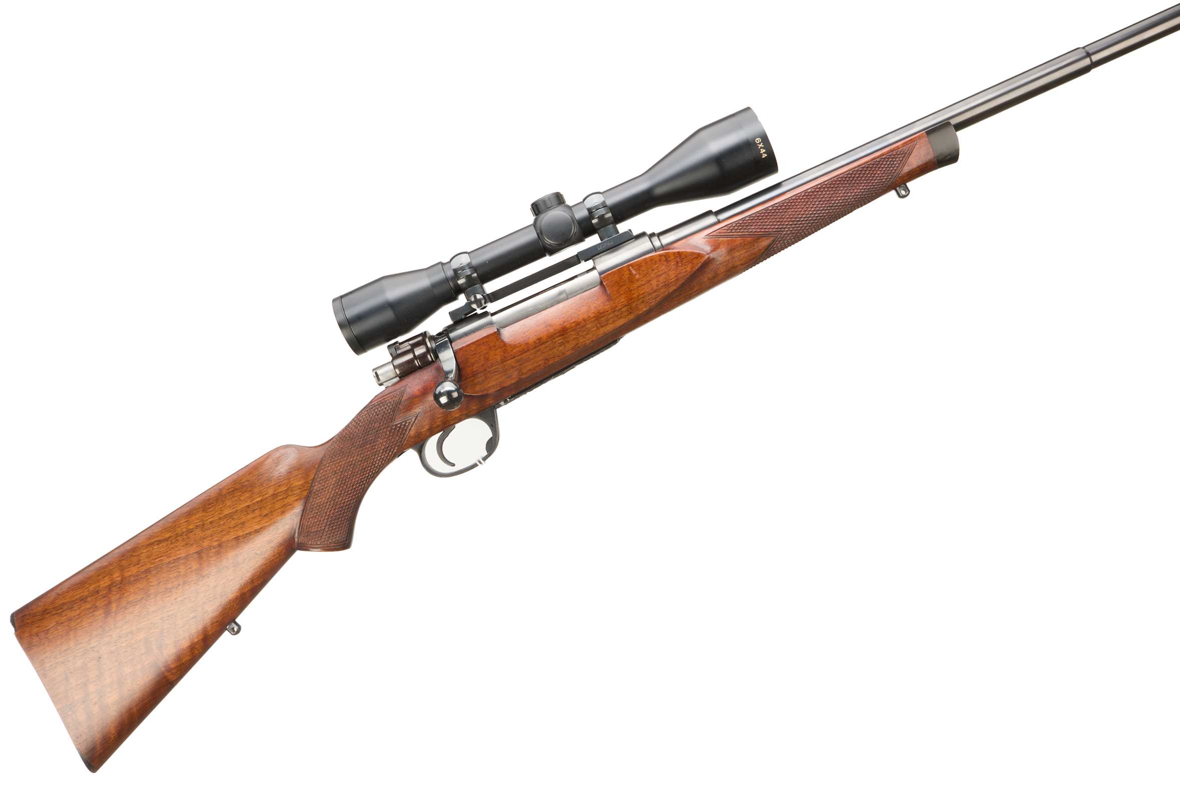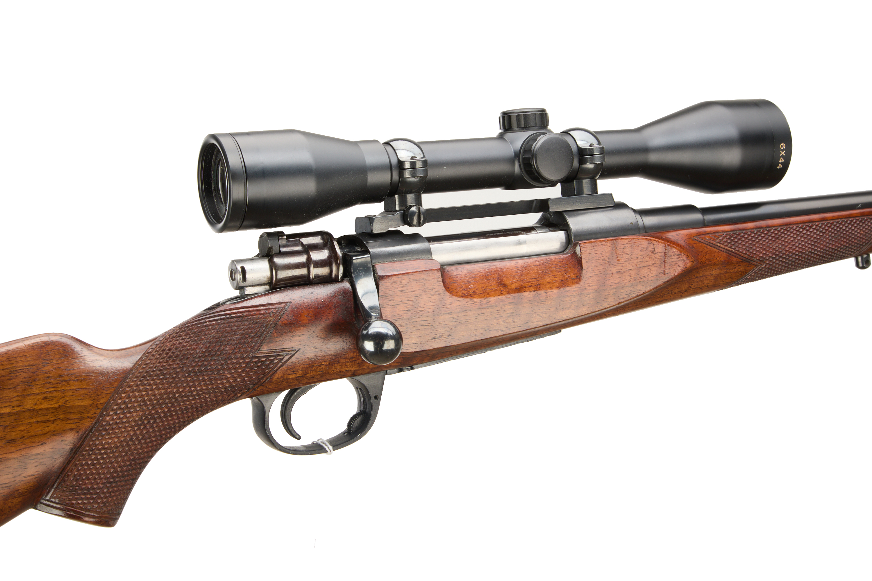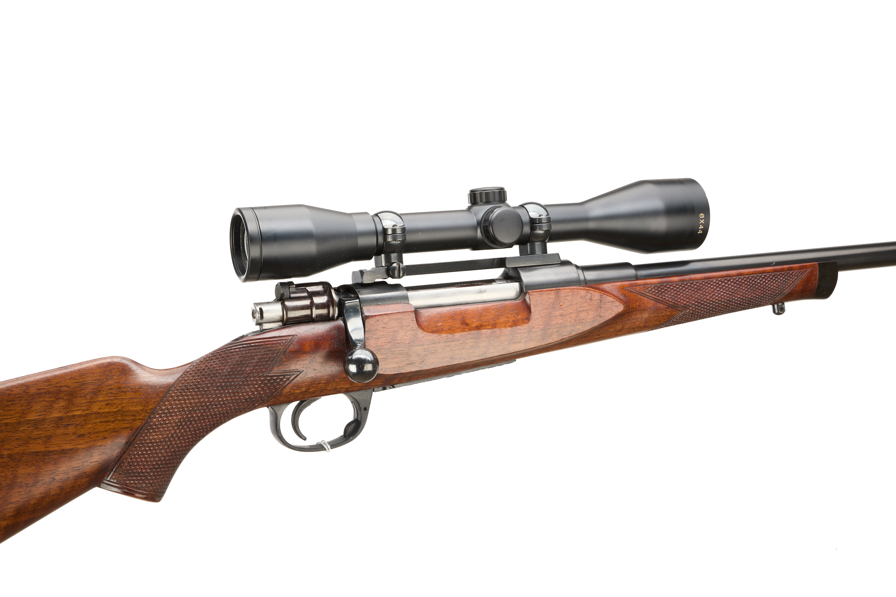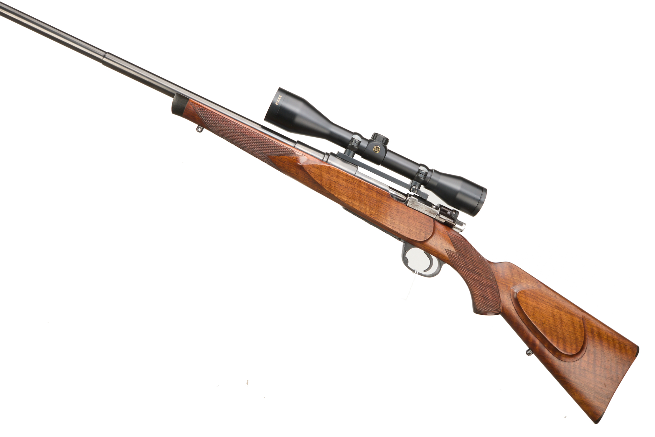 Chequered grip and forend, ebony forend tip, front and rear sling studs. CW an Edgar Brothers 6×44 scope on Leupold mount. Screw cut barrel with thread protector.