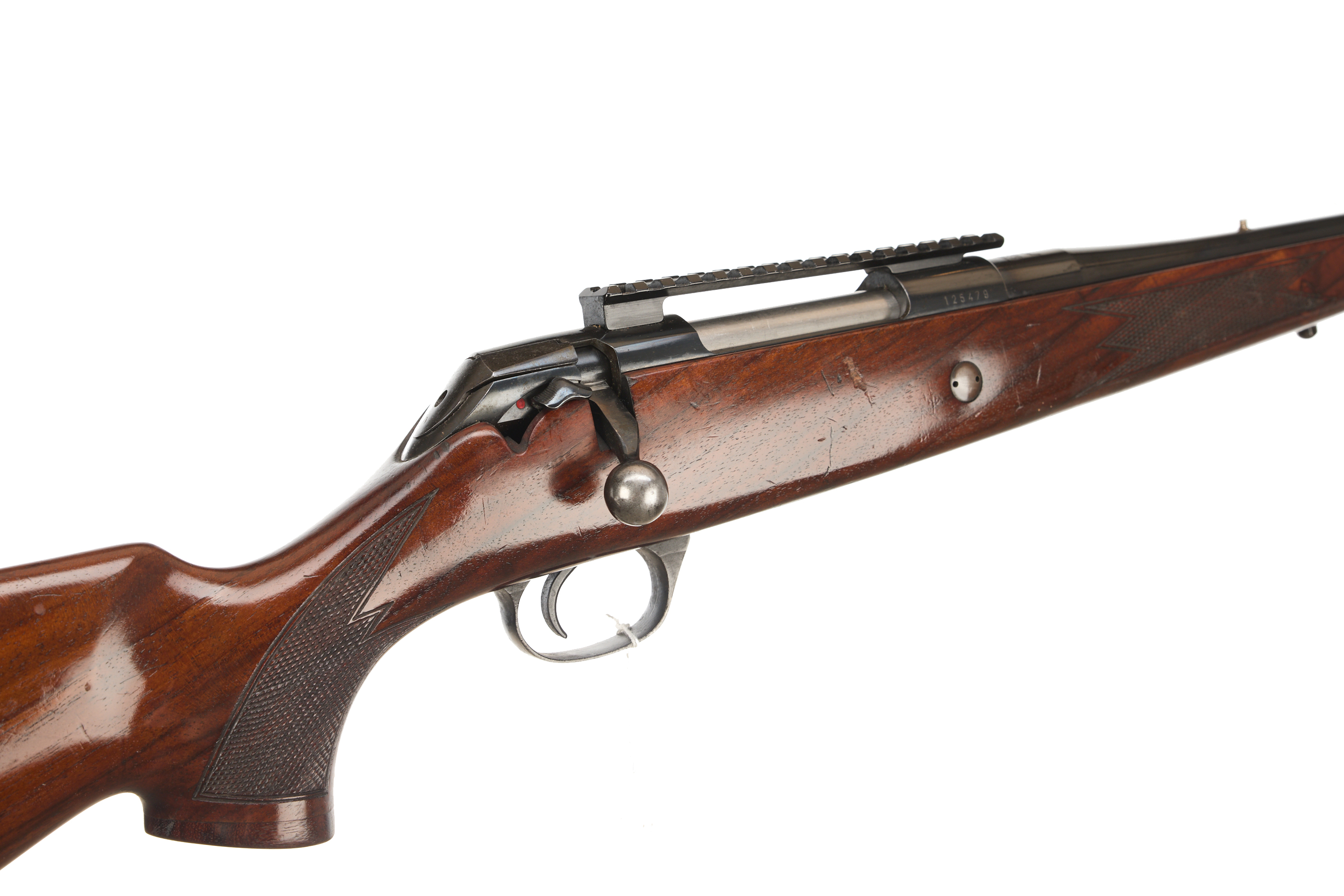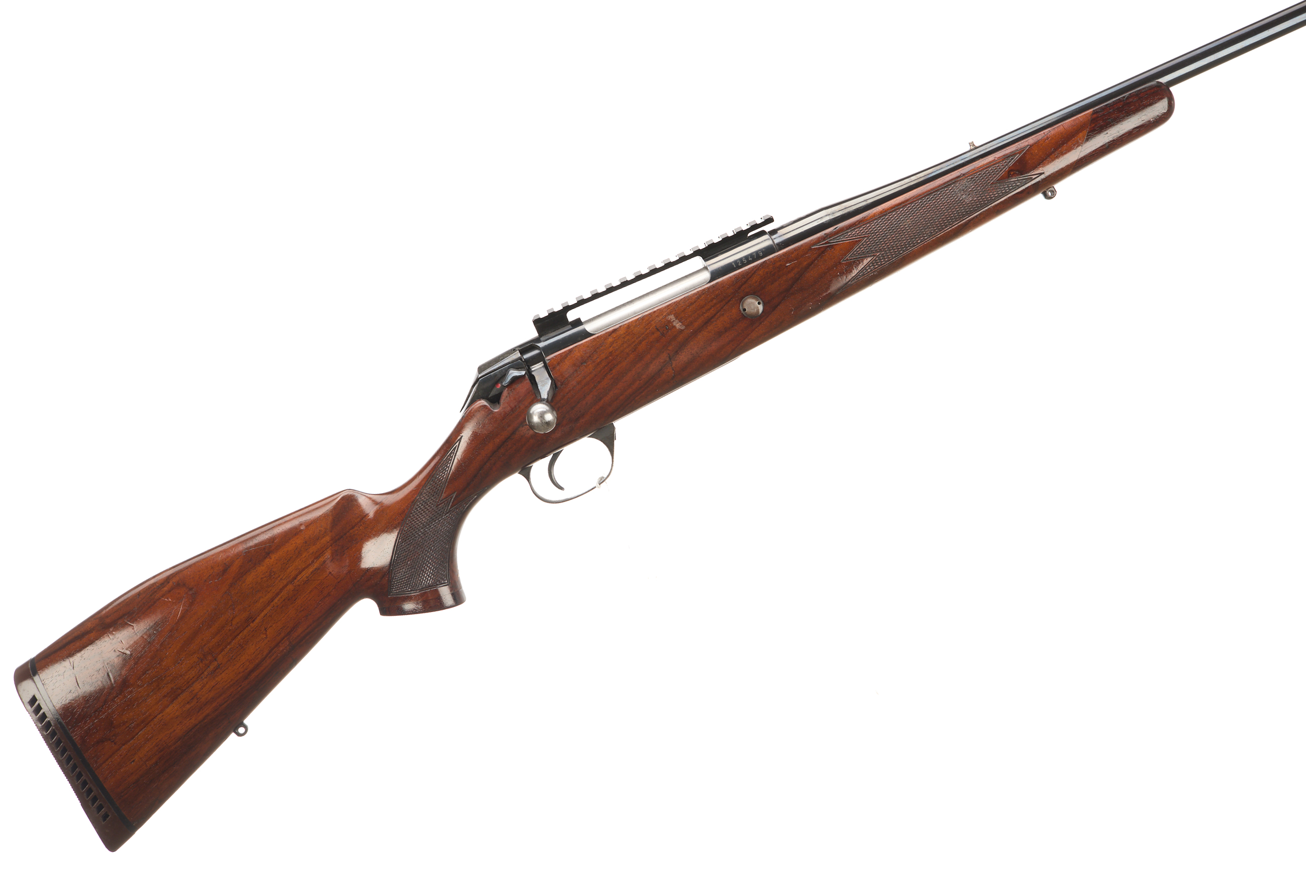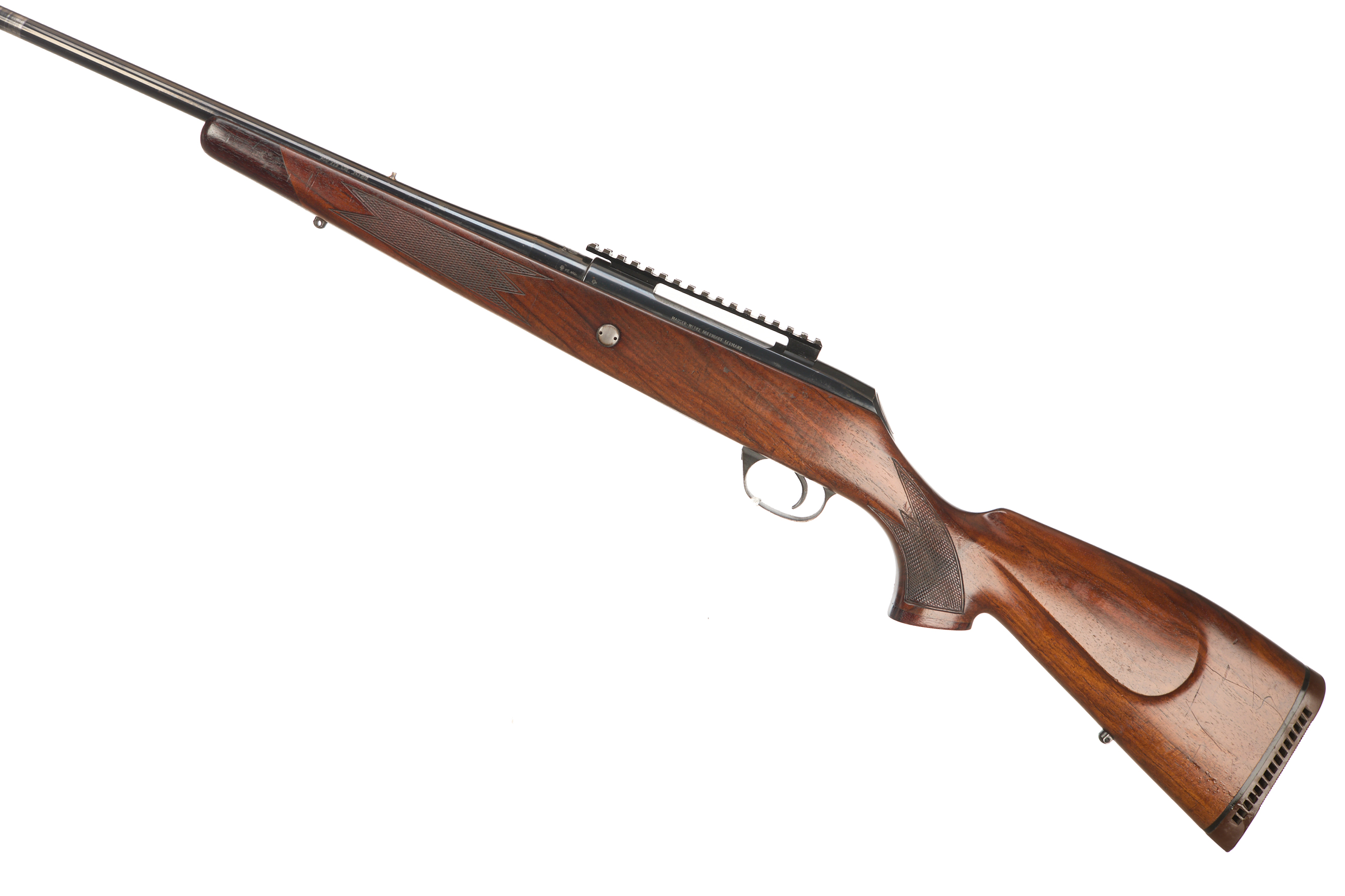 Cushioned butt, semi-pistol grip with palm swell, rounded, rosewood forend. Sling attachments. Screwcut, unsighted barrel, threaded post and Picatinny rail. Internal magazine with hinged floor plate. Side safety, cocking indicator.