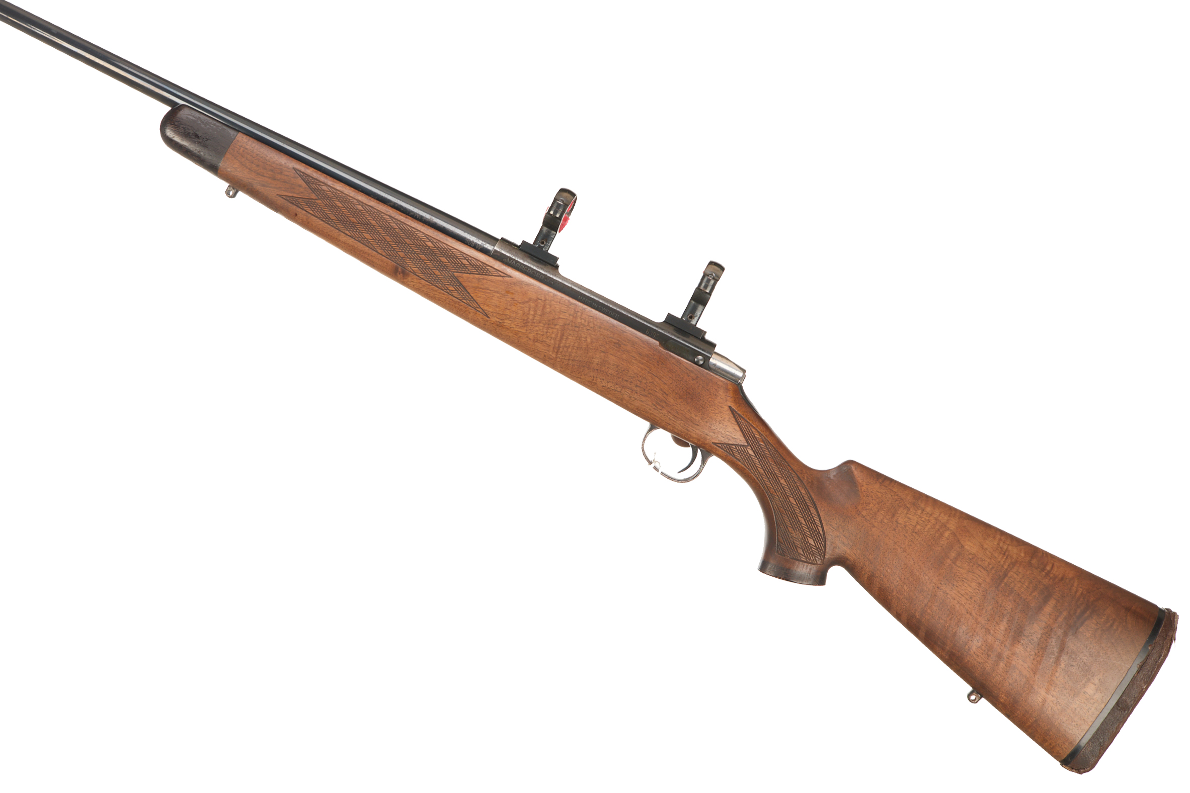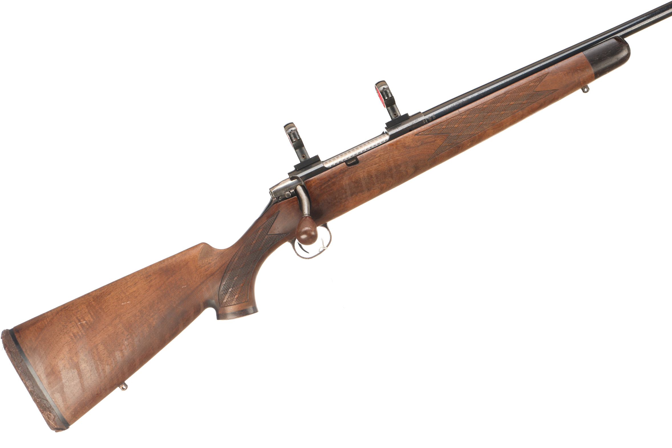 Perished rubber butt pad, right handed stock with chequered grip and forend, ebony forend tip and grip cap. Screw cut barrel (thread protector absent). Front and rear sling studs. Jewelled bolt. CW 30mm scope rings.