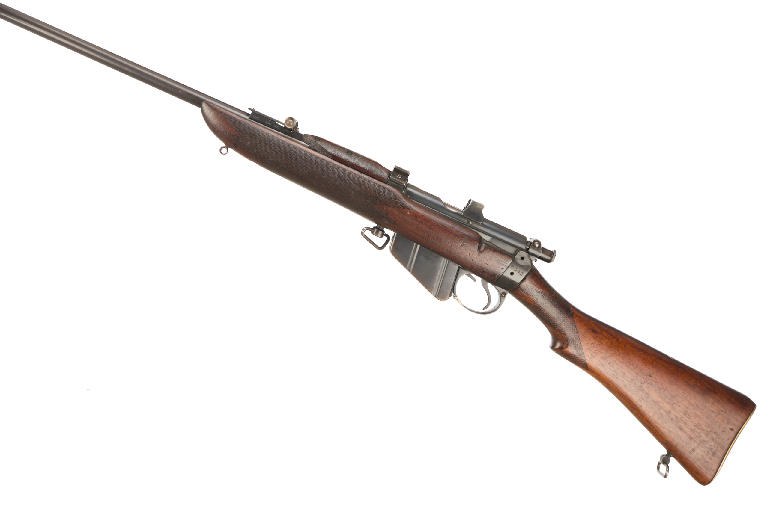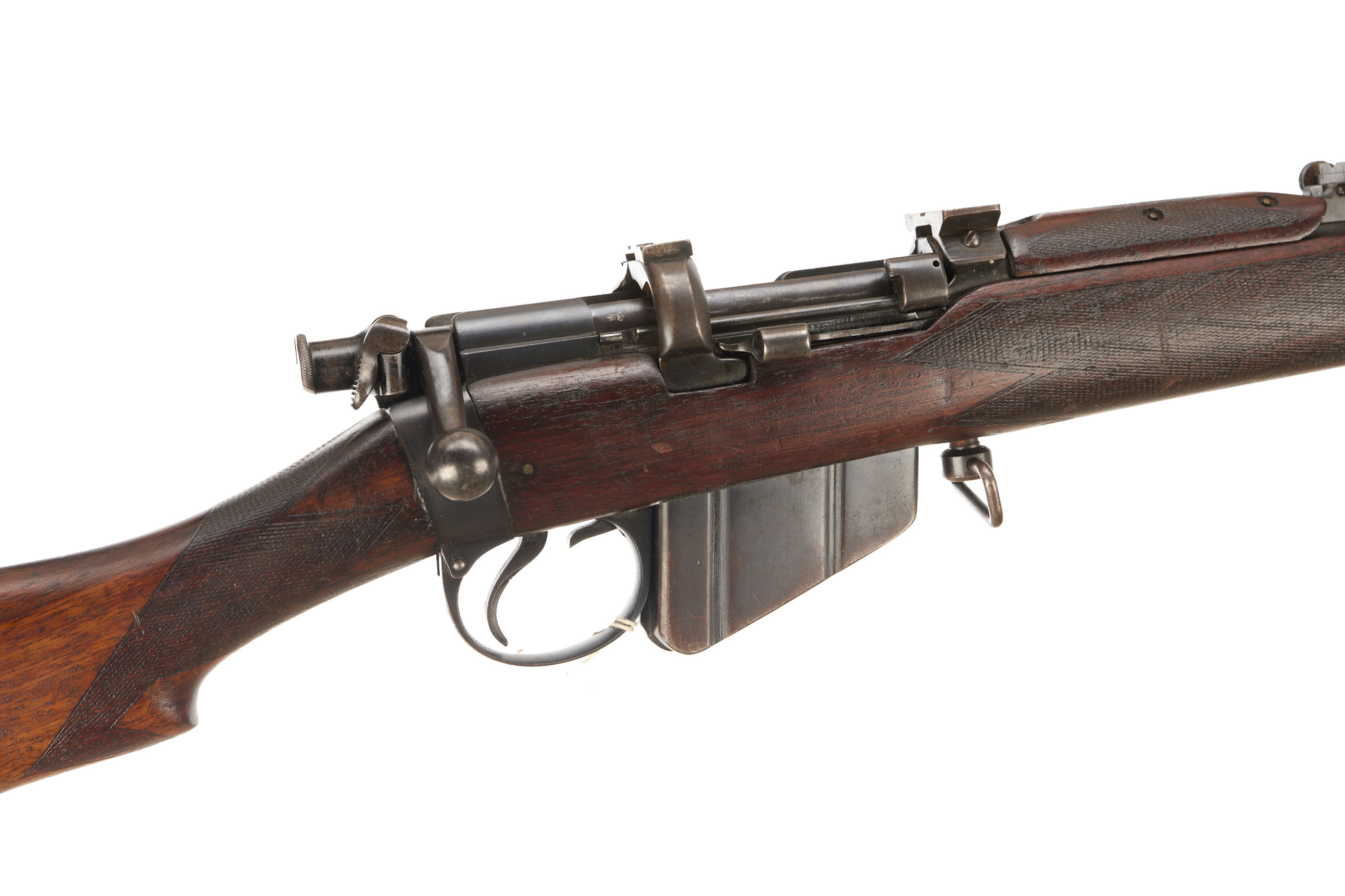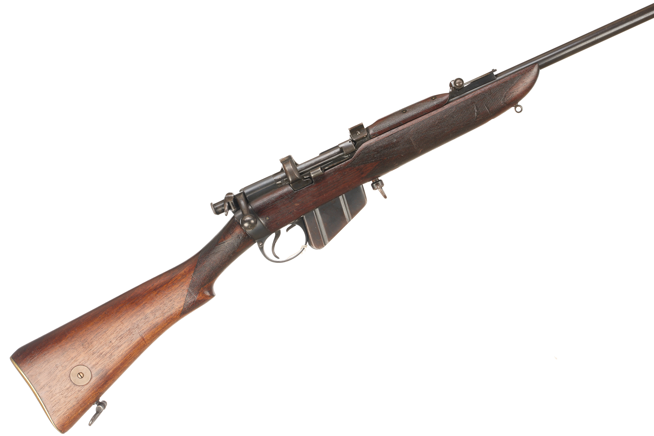 Brass butt plate, wood stock with chequered grip and forend, front, mid and rear sling loops. Post front sight, adjustable notch rear sight. CW detachable magazine.