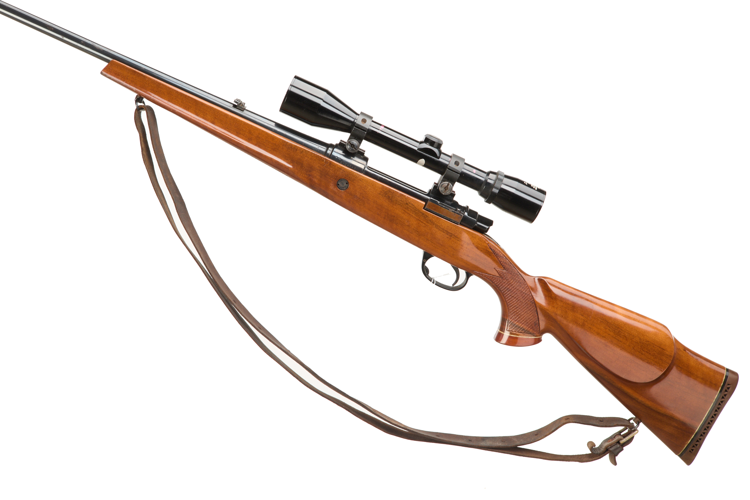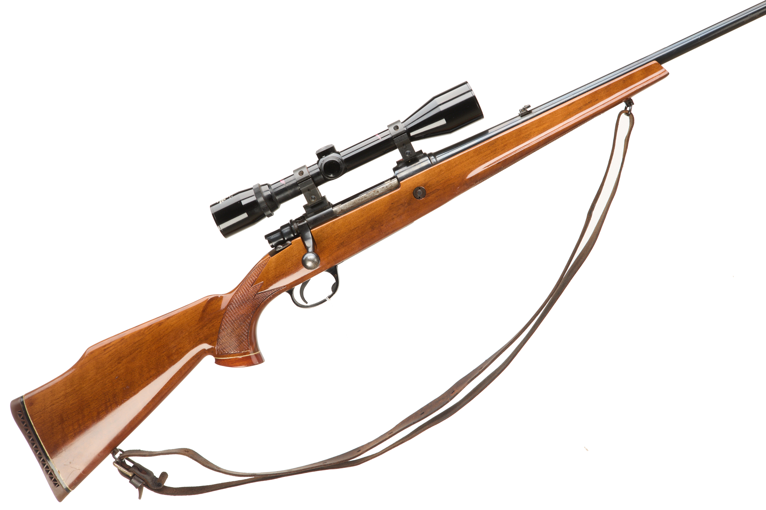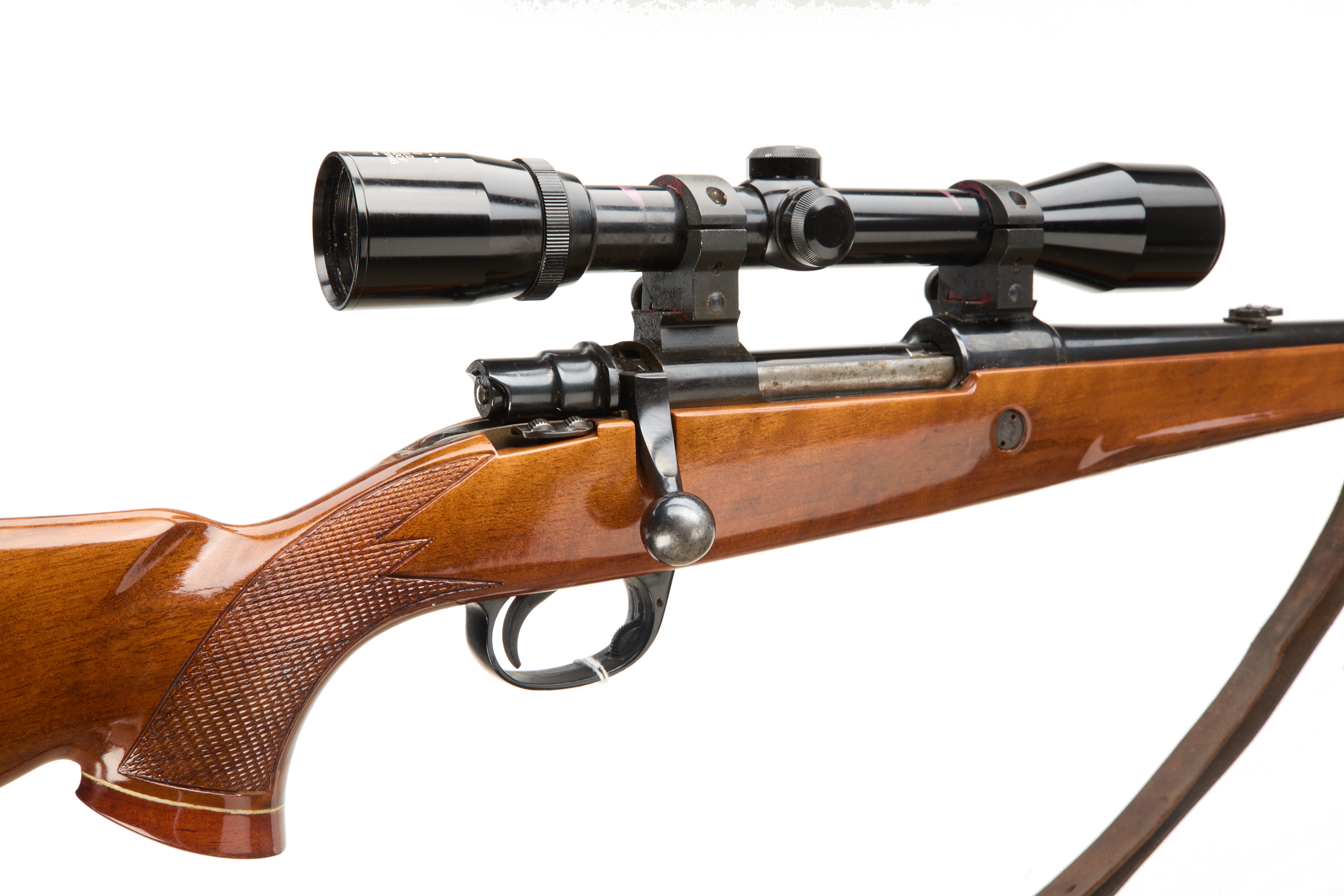 Ventilated butt pad, chequered semi pistol grip with other wood end caps and chequered palm grip on forend. Raised cheek piece. Sling swivel attachments with leather sling. Screw cut. ASI 4X40 scope, internal magazine , hinged floor plate and thumb safety.