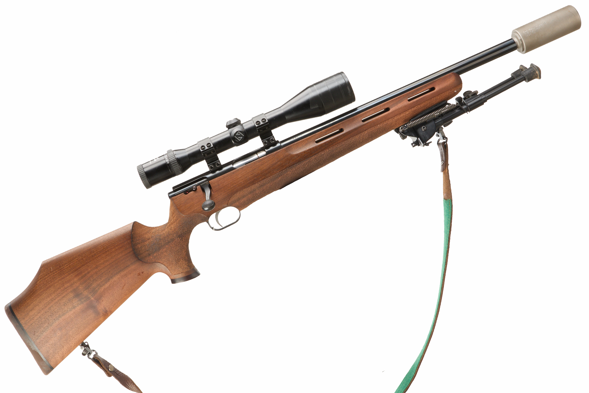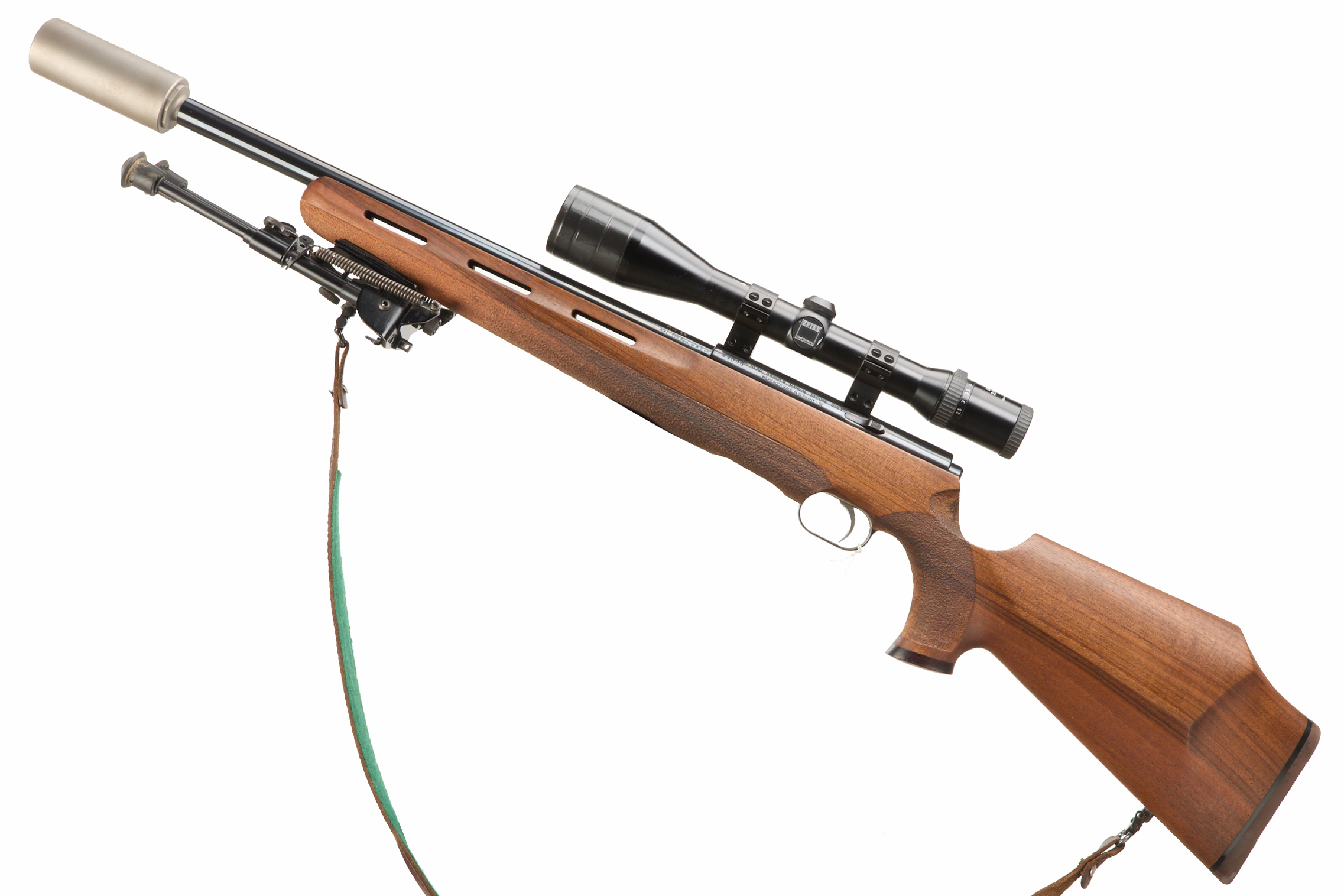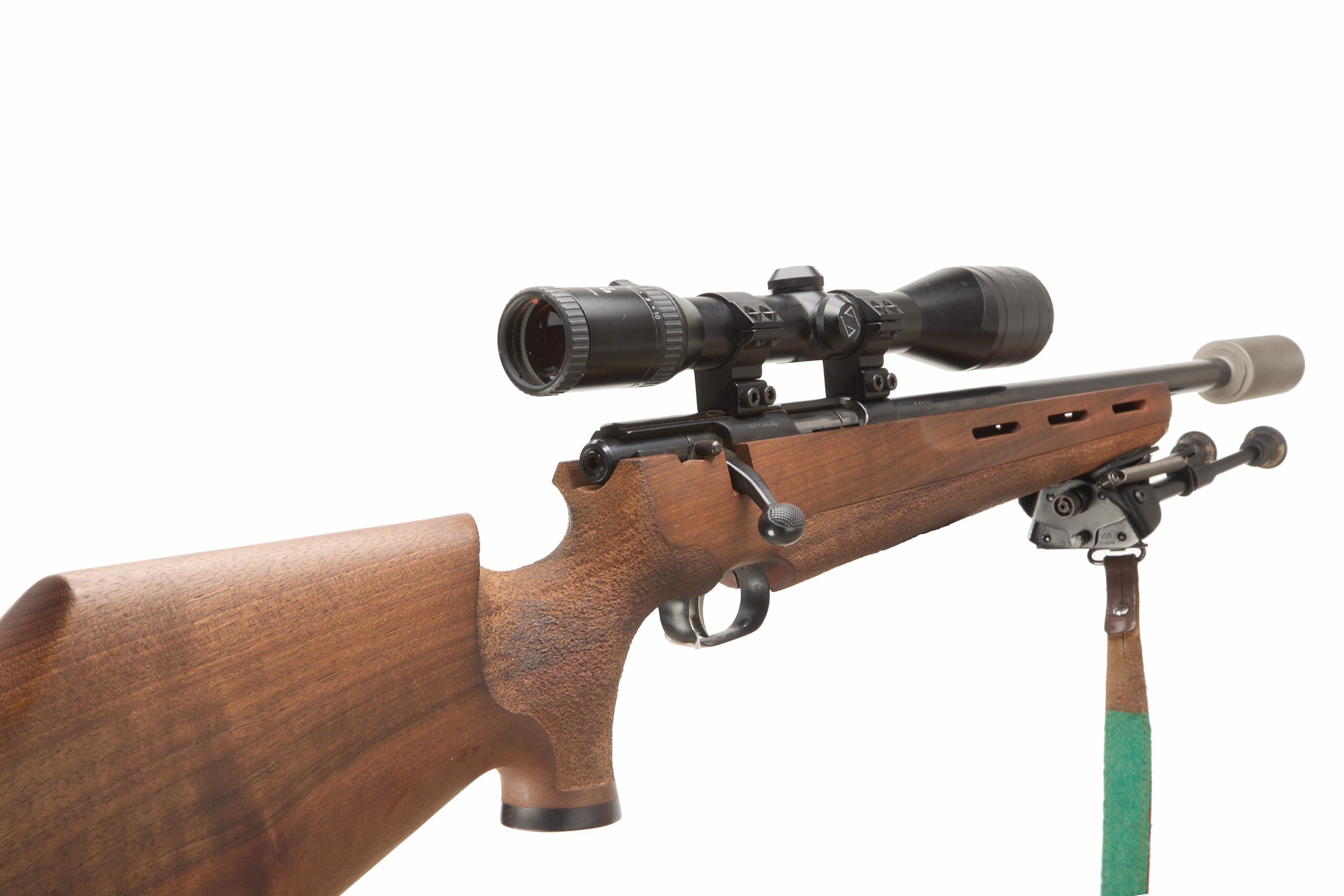 Rubber butt, fully formed stock, rounded forend. Sling attachments and leather sling. Screw – cut muzzle, unsighted heavy barrel. ASE ultra S moderator. Magazine absent. CW Zeiss Diavari-z 2.5 – 10 x 48, Harris SBR Bi-pod.