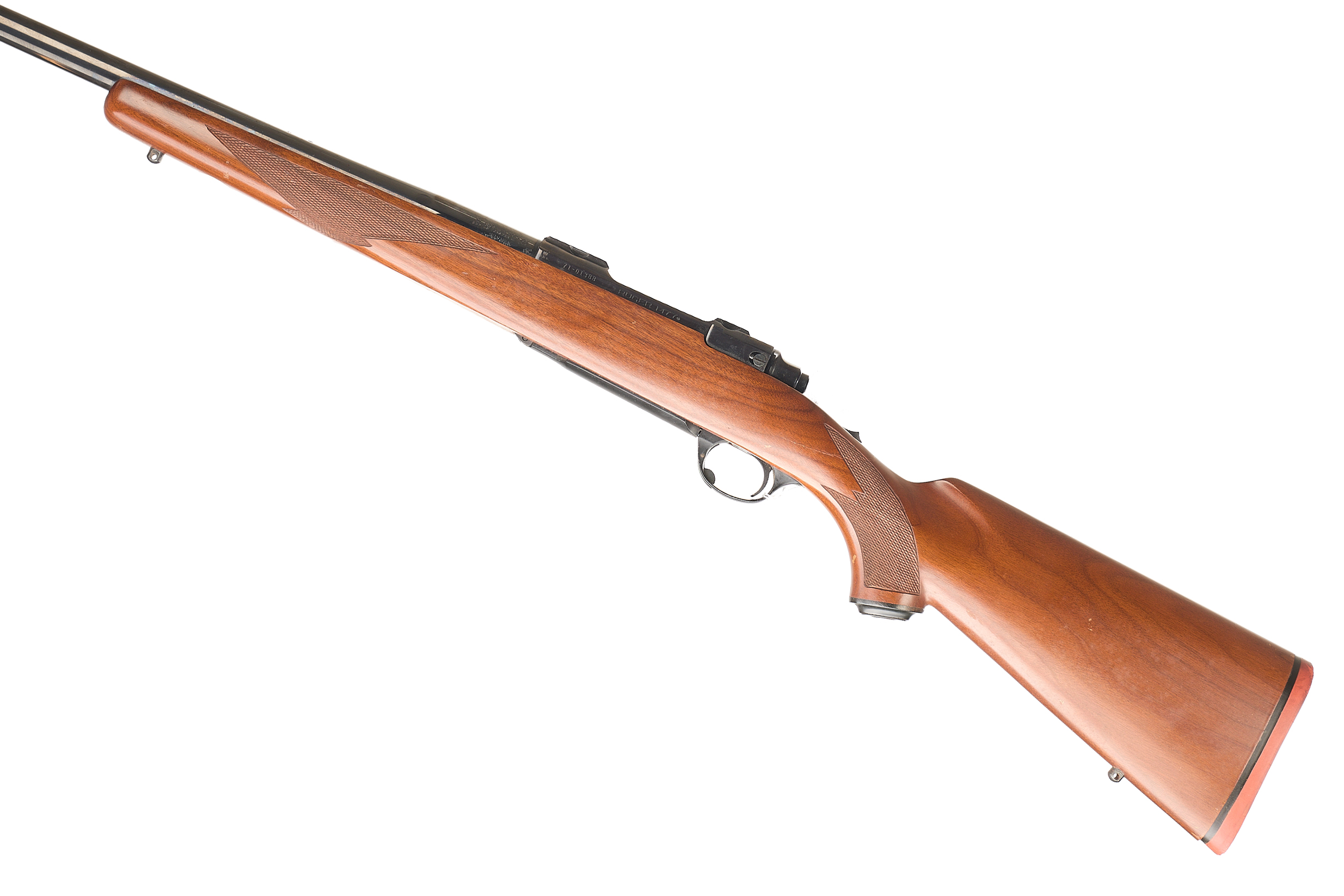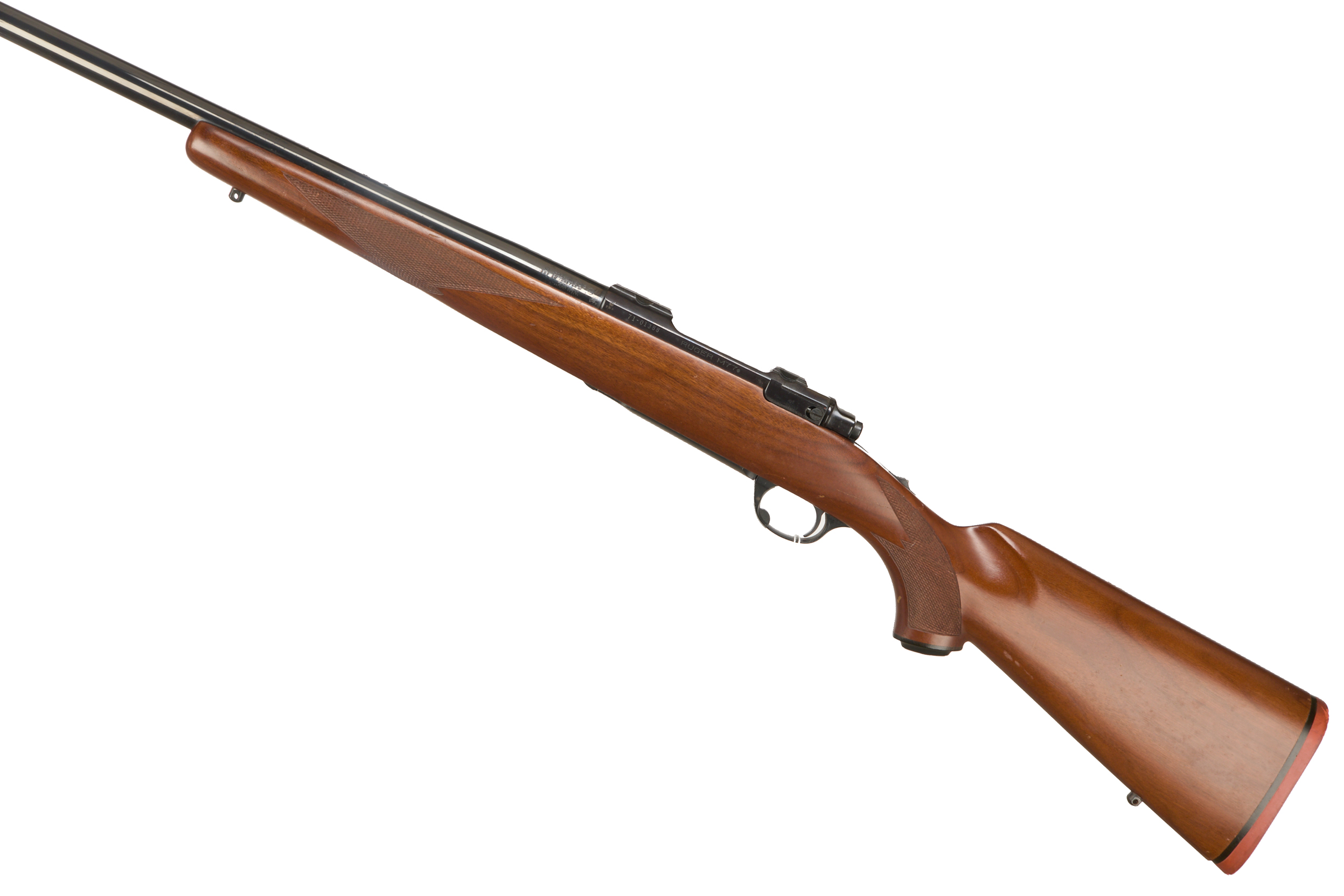 Rubber butt pad, chequered full pistol grip and rounded forend with ebonite end-cap. Plain heavy barrel, unsighted. Internal magazine with hinged floor plate. Thumb safety.