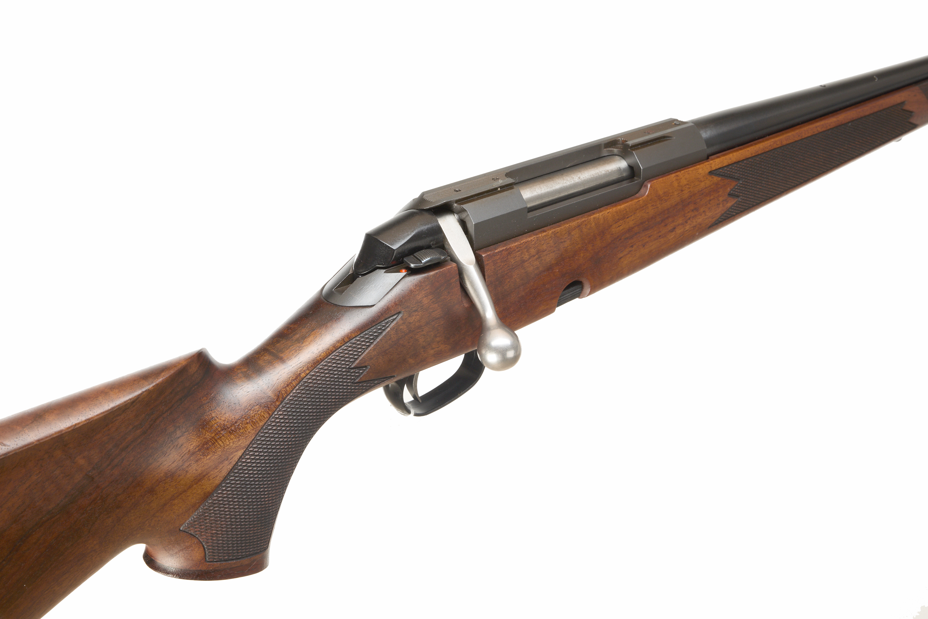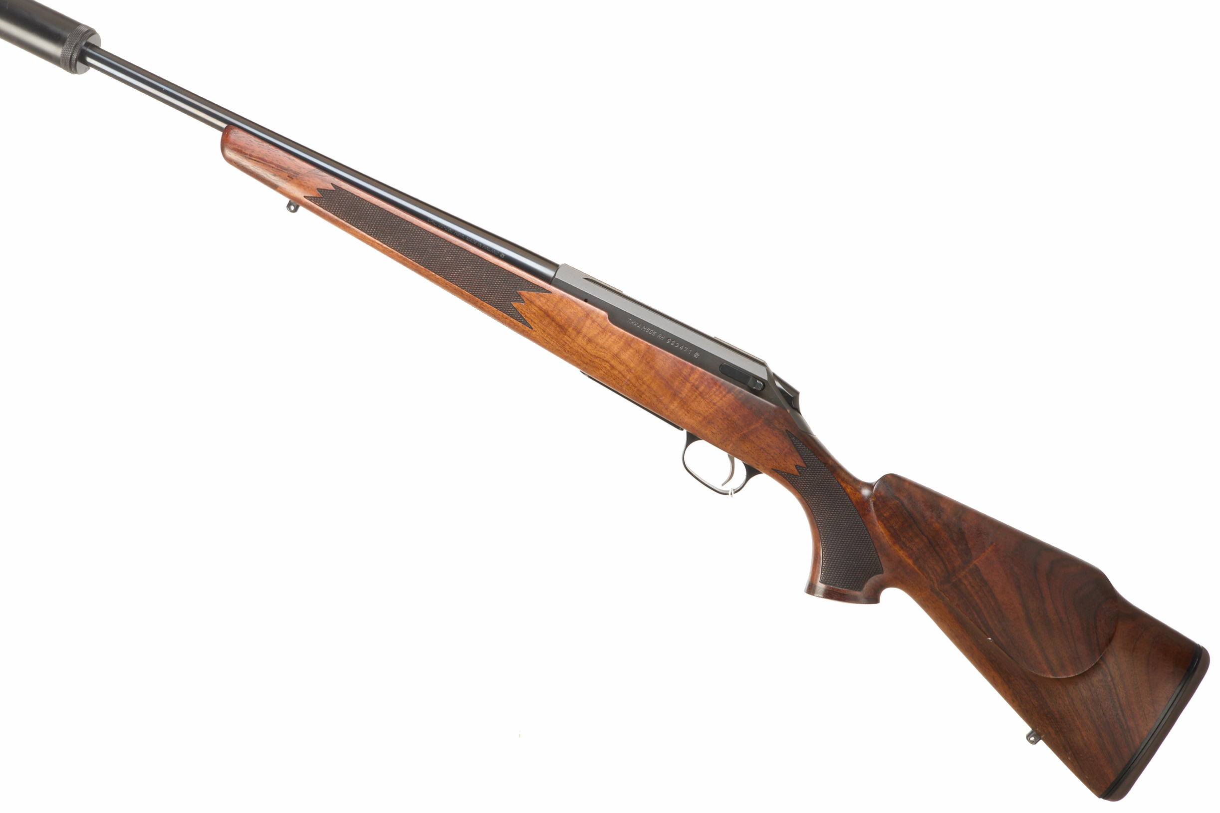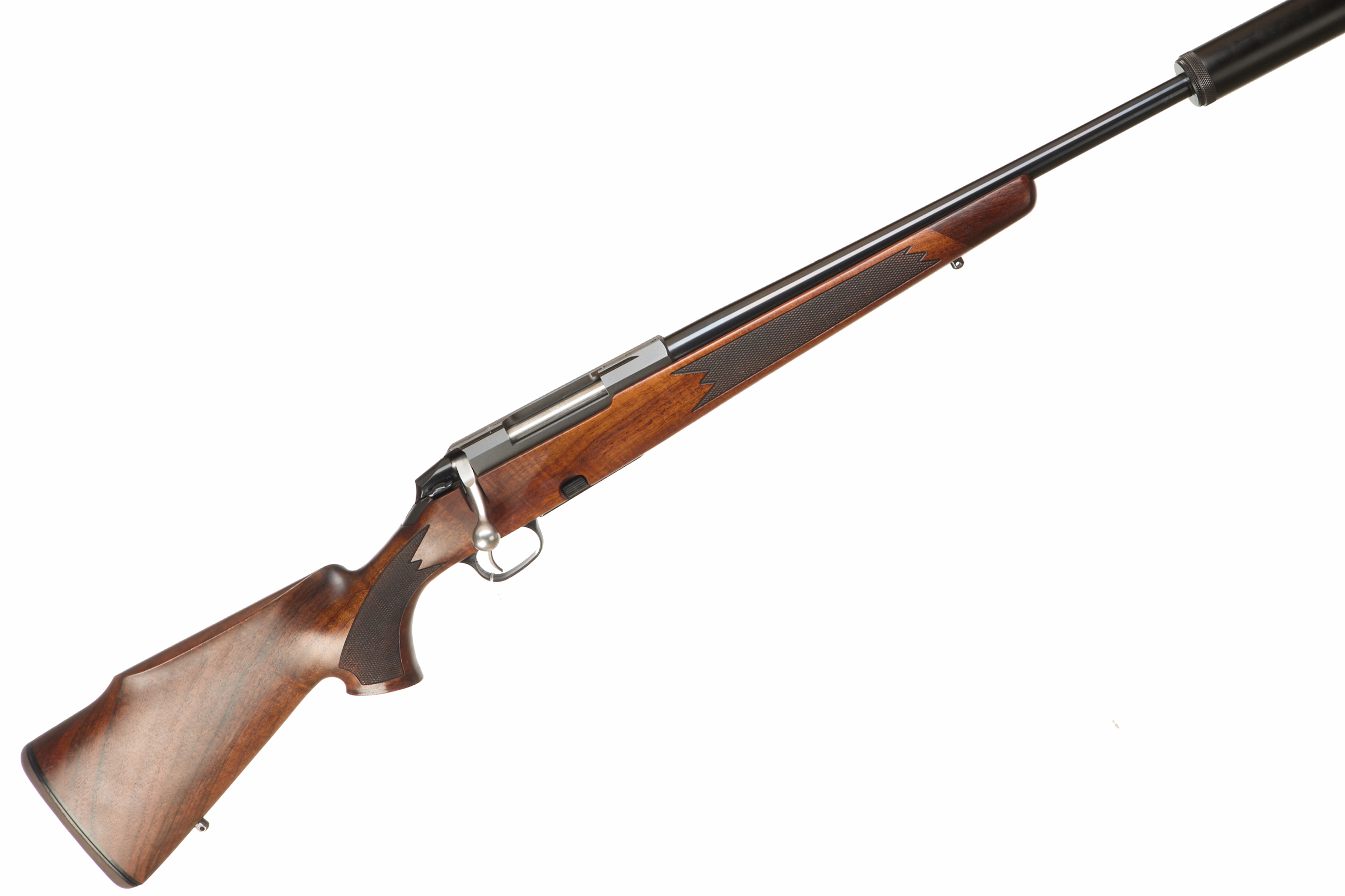 Soft rubber butt pad, chequered full pistol grip and forend with mahogany end caps to same. JMS arms moderator original scope mounts, internal magazine with hinged floor plate. Thumb safety. Barrel 21 1/2”, OAL 47 3/4”