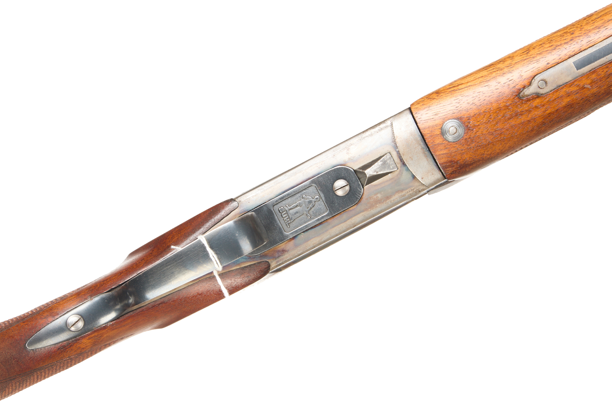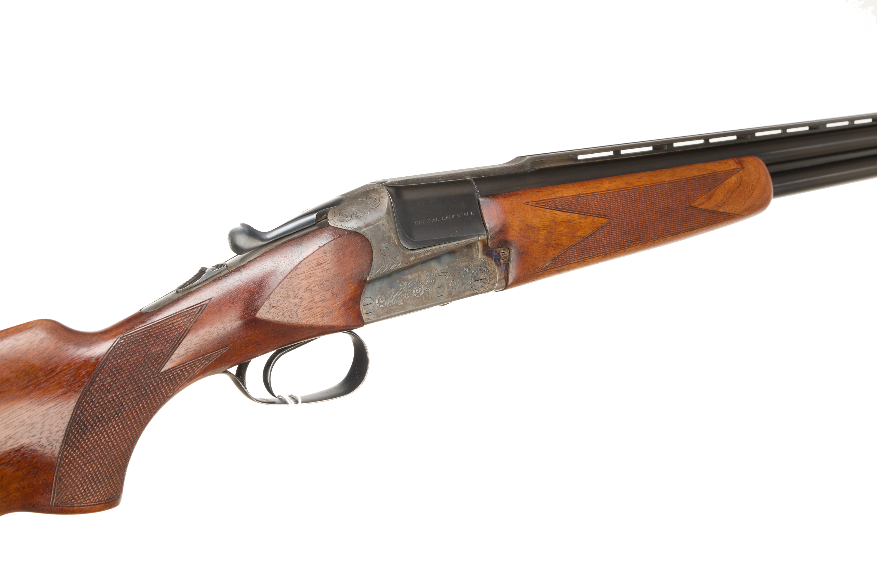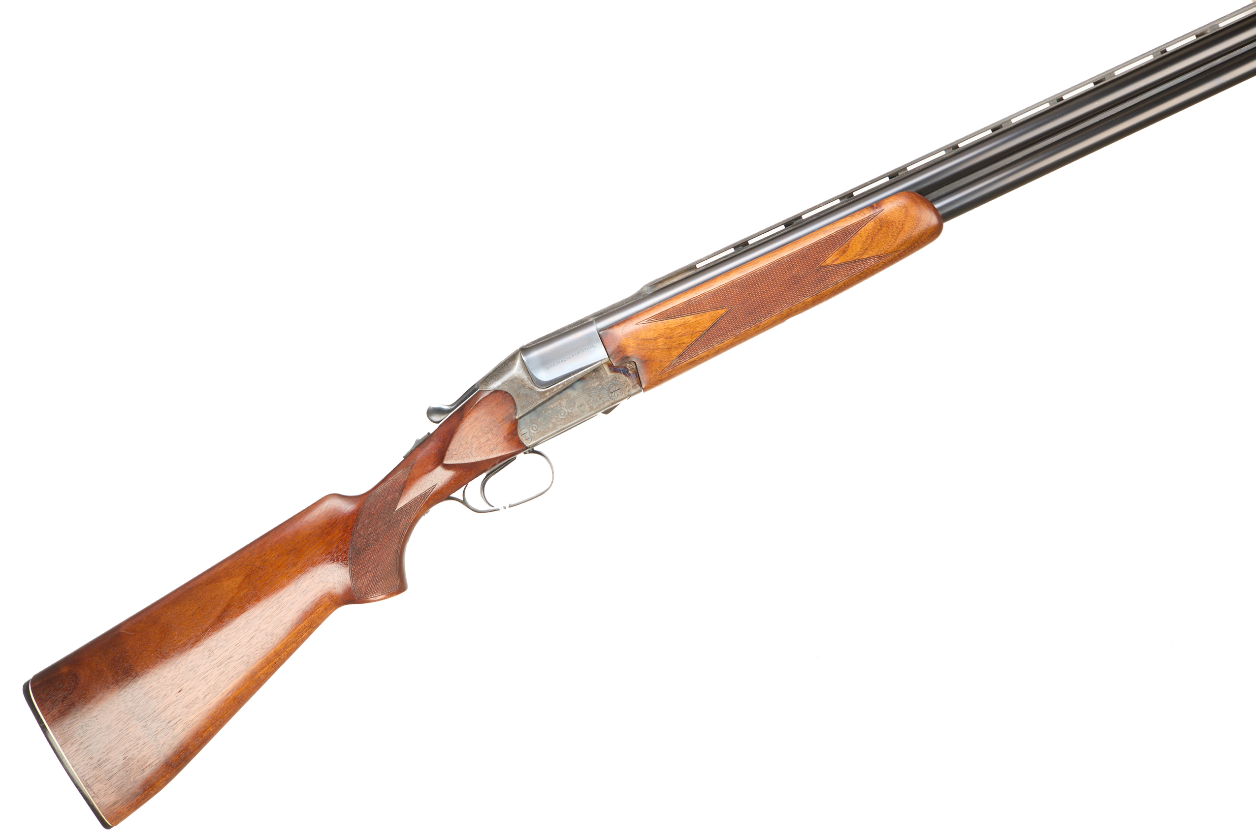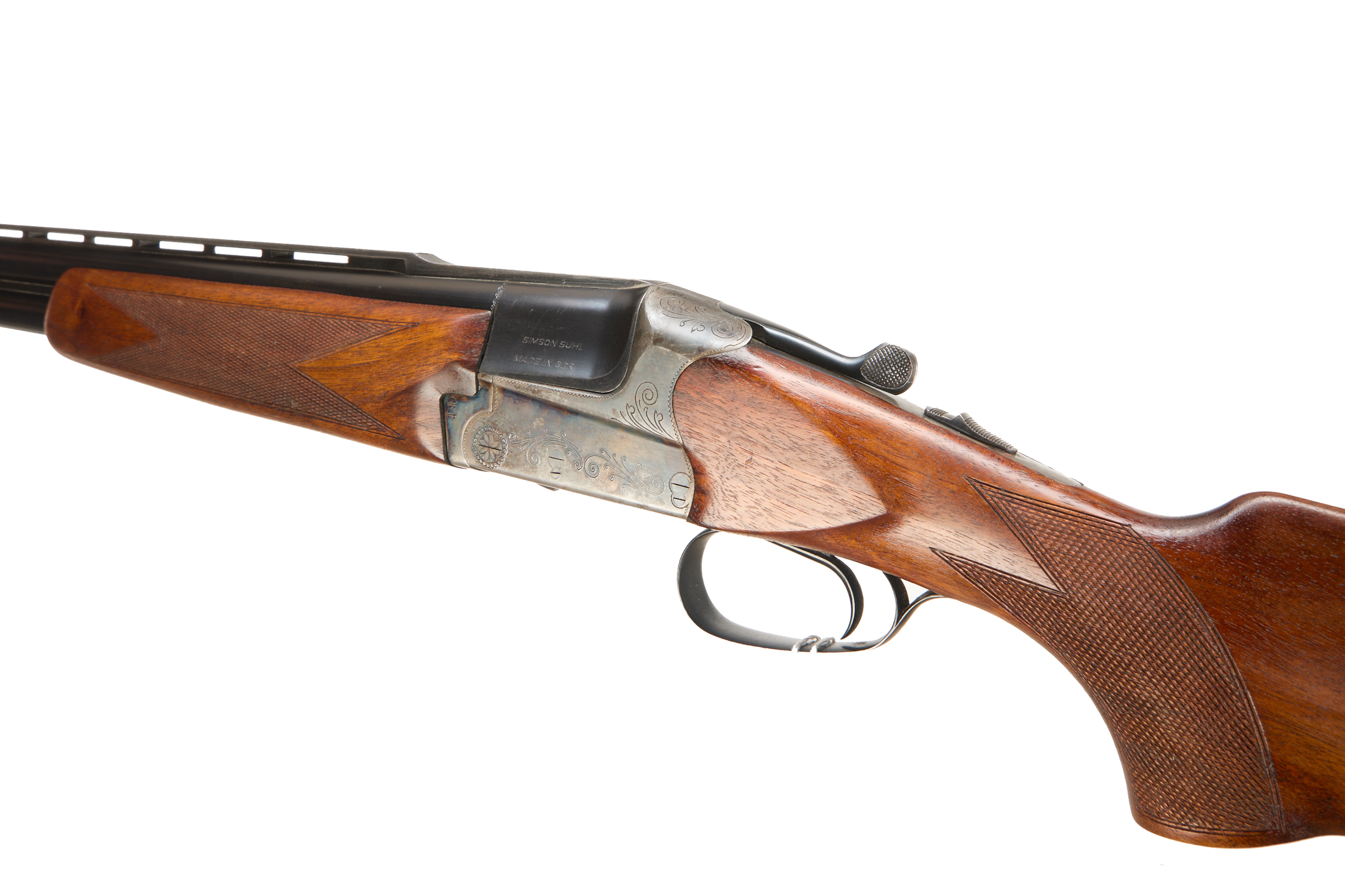 Ebonite butt pad, chequered semi-pistol grip and forend, ventilated top rib. Swirling motifs to action. Integrated barrel selector (selective single trigger) and safety.