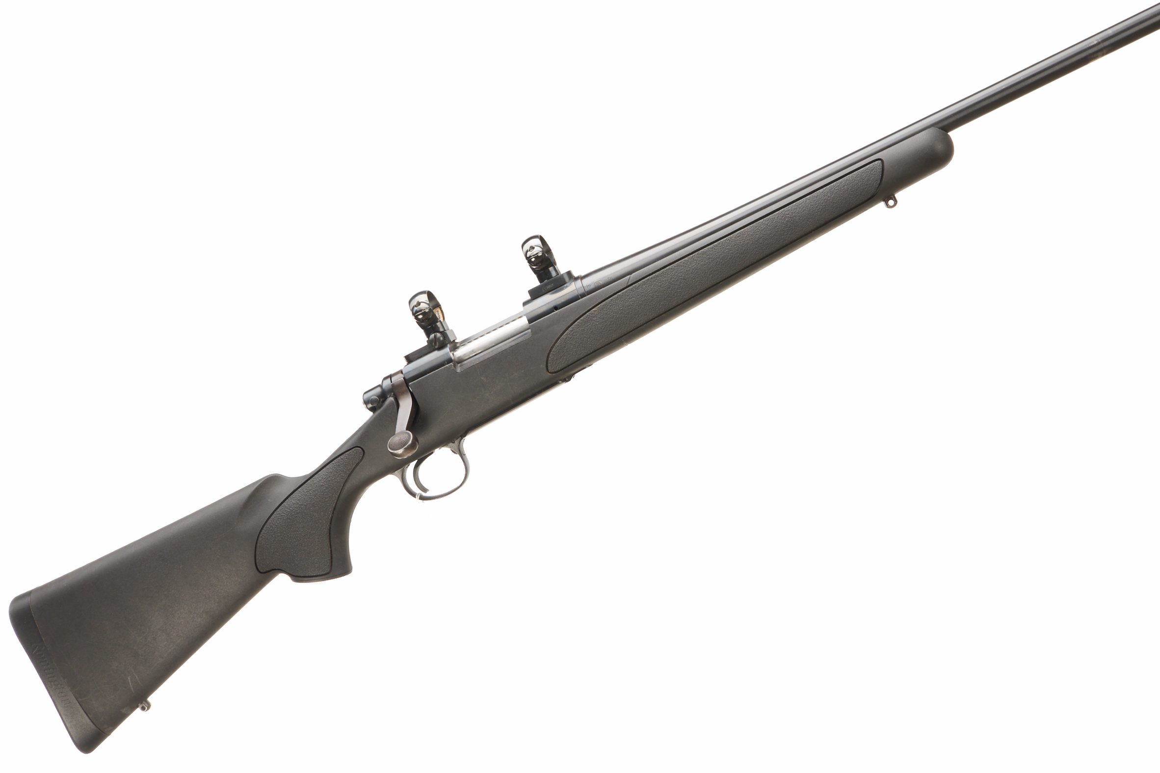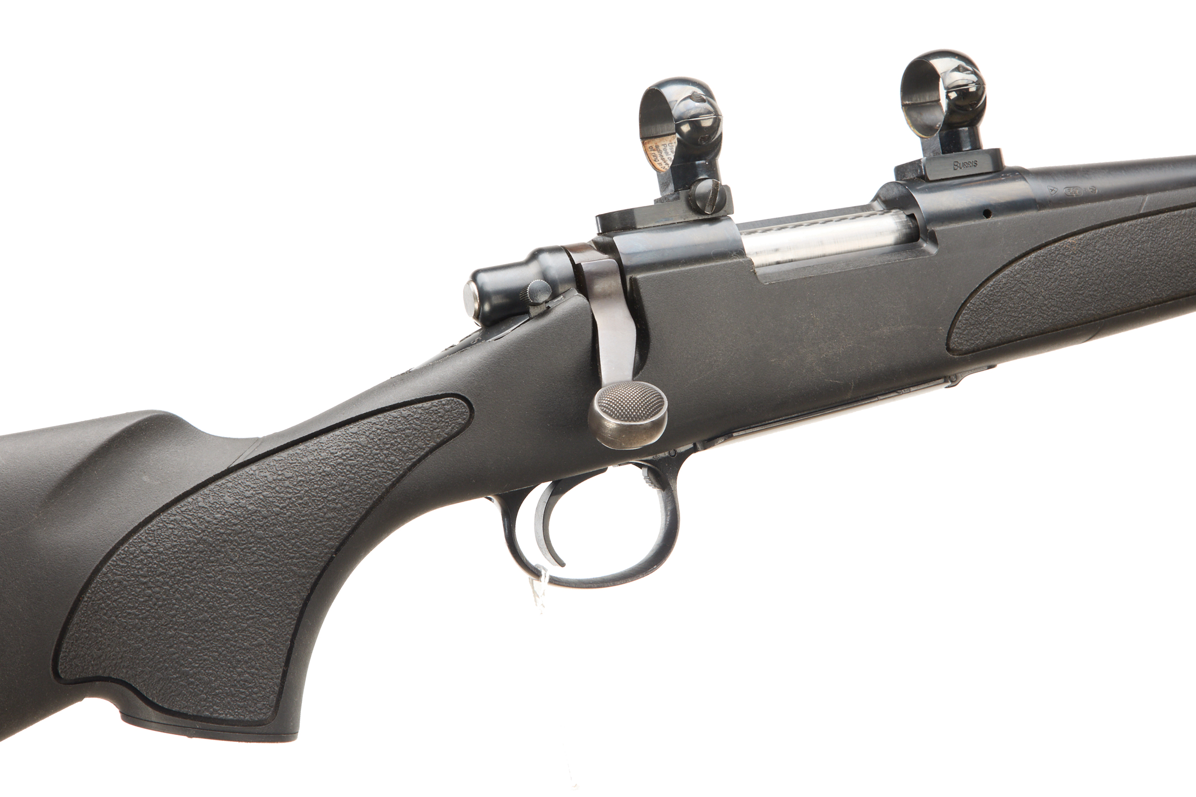 Soft rubber butt pad, textured semi-pistol grip and forend, with raised cheek piece. Screw cut barrel with Parker Hale scope mounts. Internal magazine with hinged floor plate, thumb safety. Barrel 23”, OAL 43 1/2”