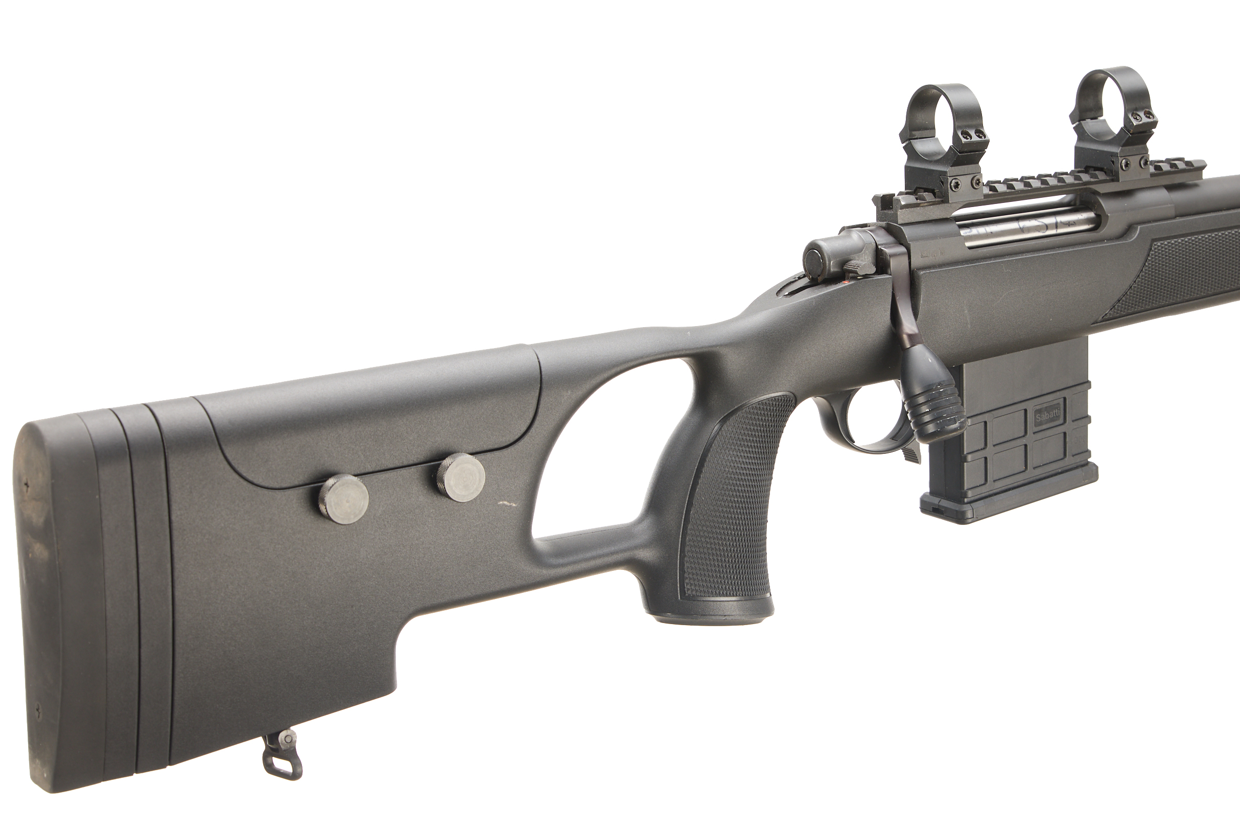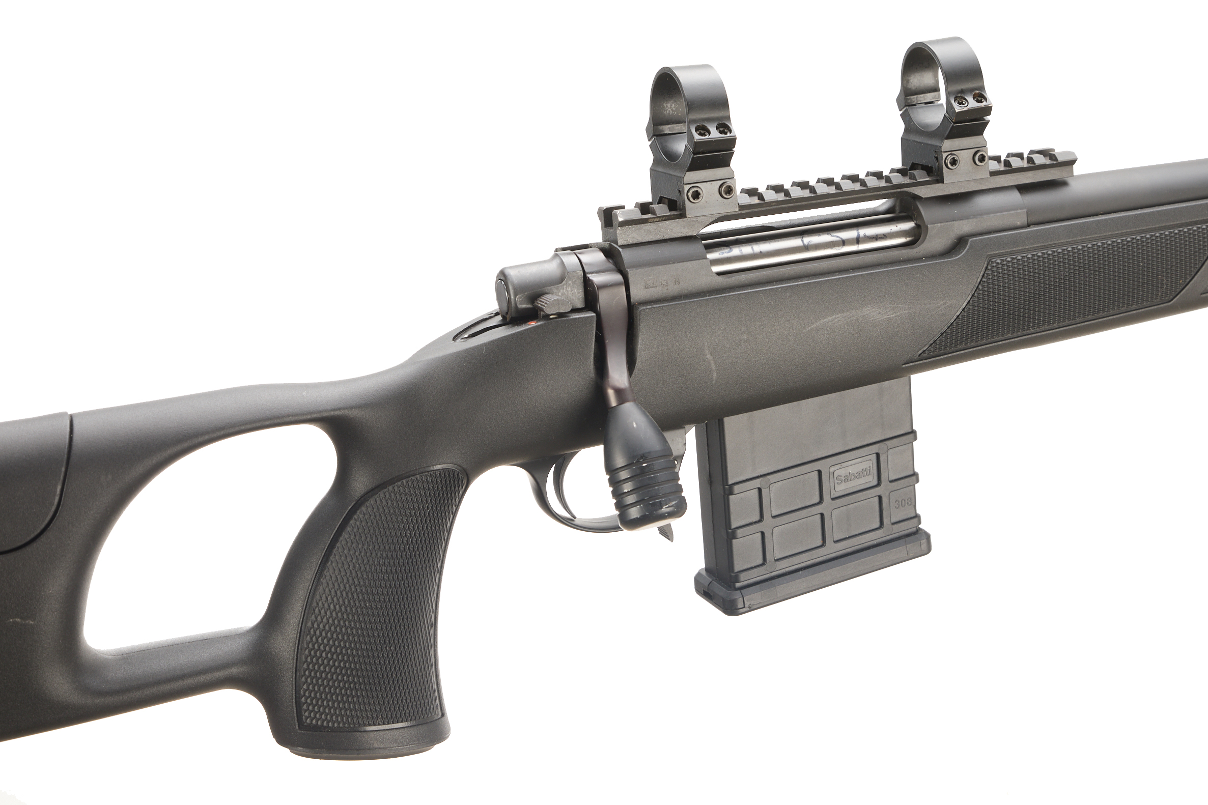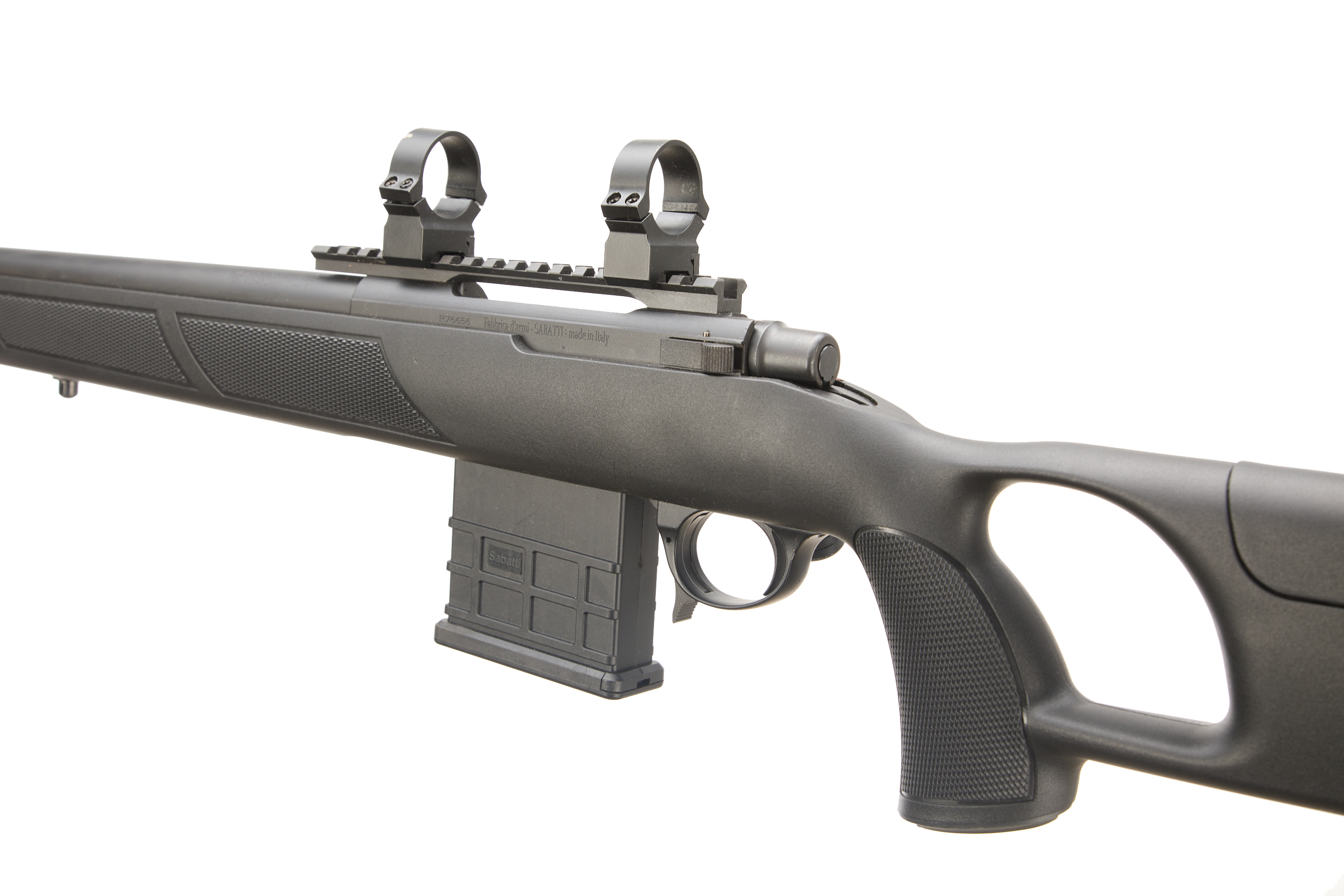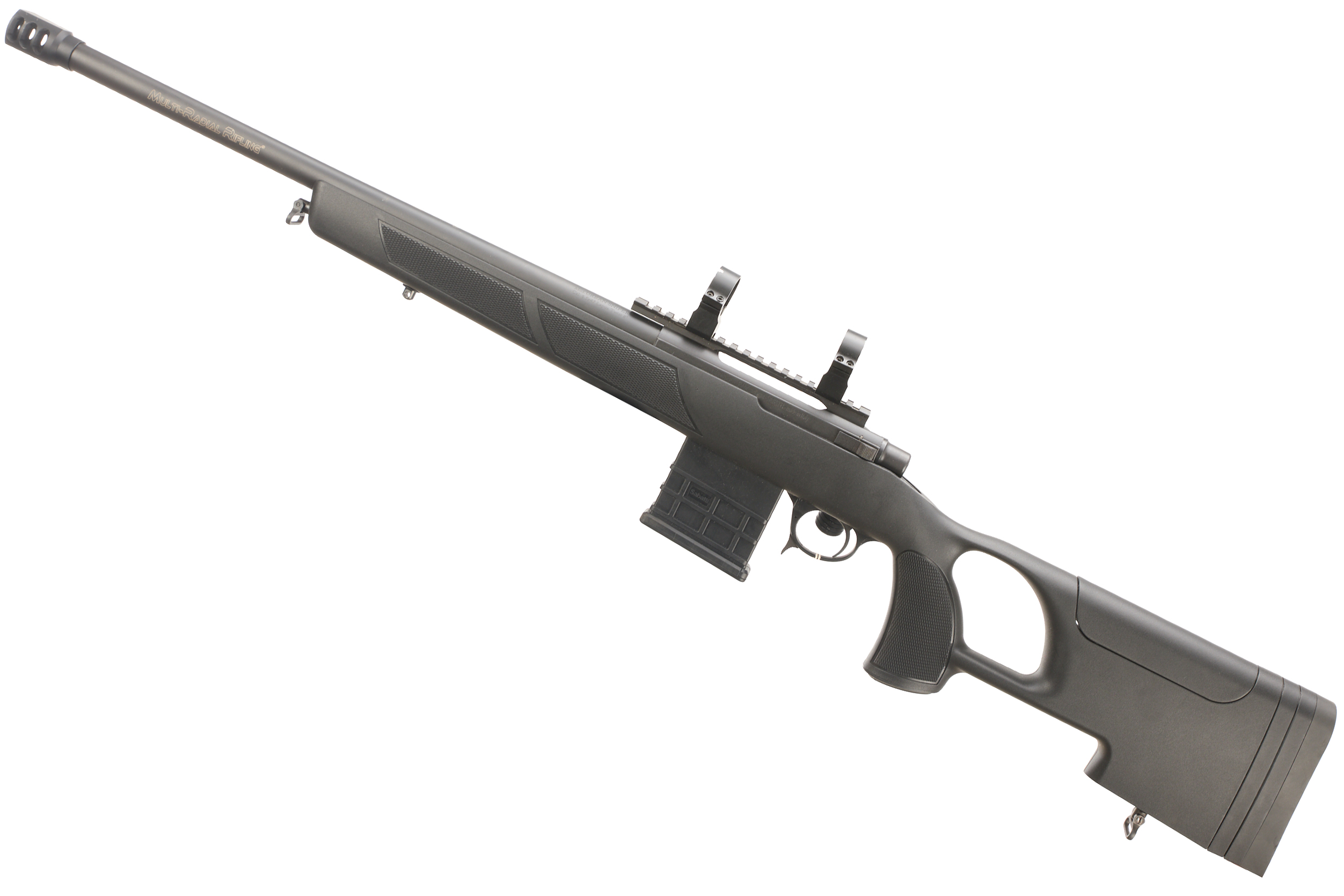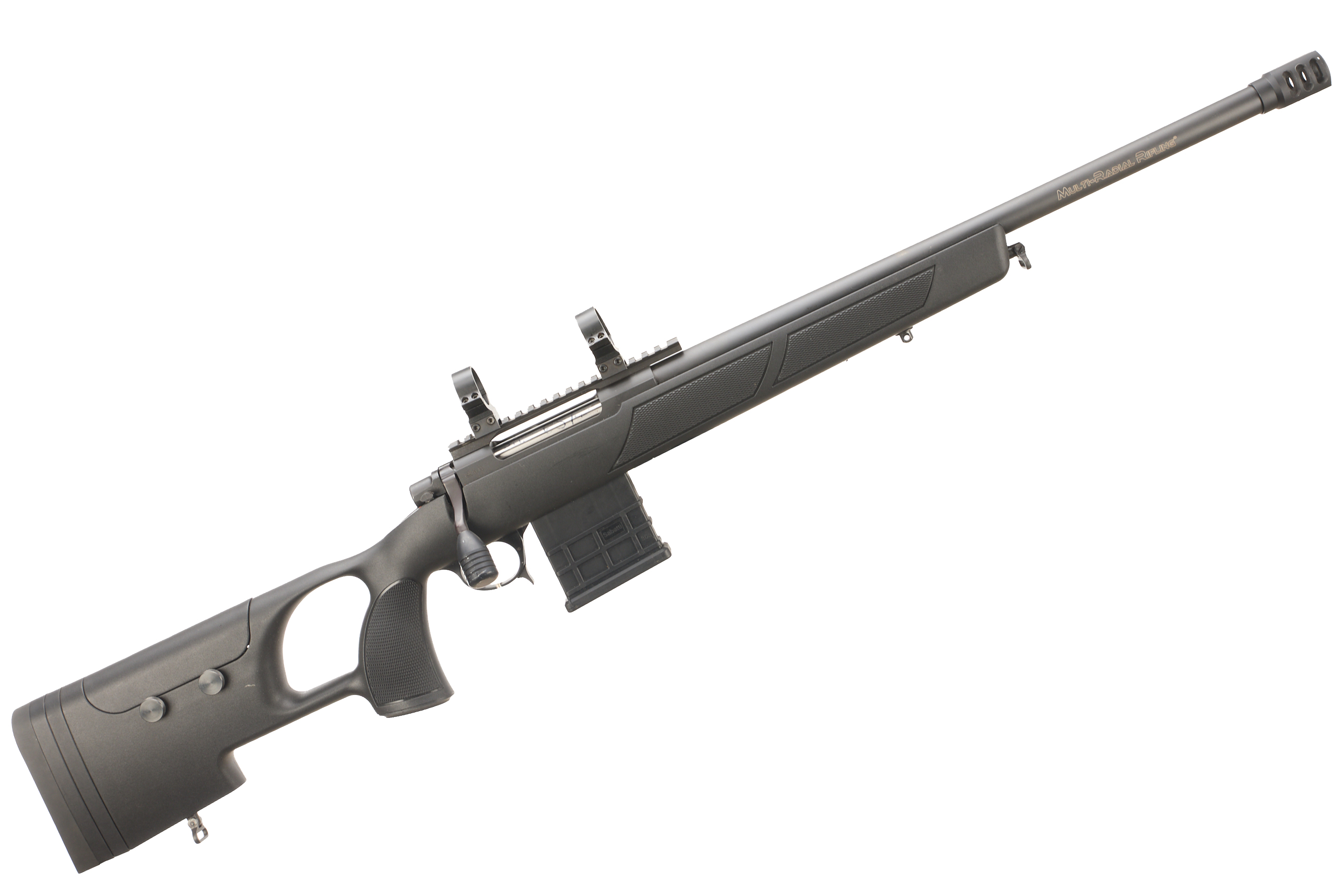 Adjustable rubber butt and cheek piece, thumb hole, fully formed chequered pistol grip with palm swell. Muzzle brake, "MULTI-RADIAL RIFLING" on barrel, 8in twist. Picatinny scope rail with 34mm scope rings. 10 round detachable magazine. Thumb safety. Country of manufacture: Italy