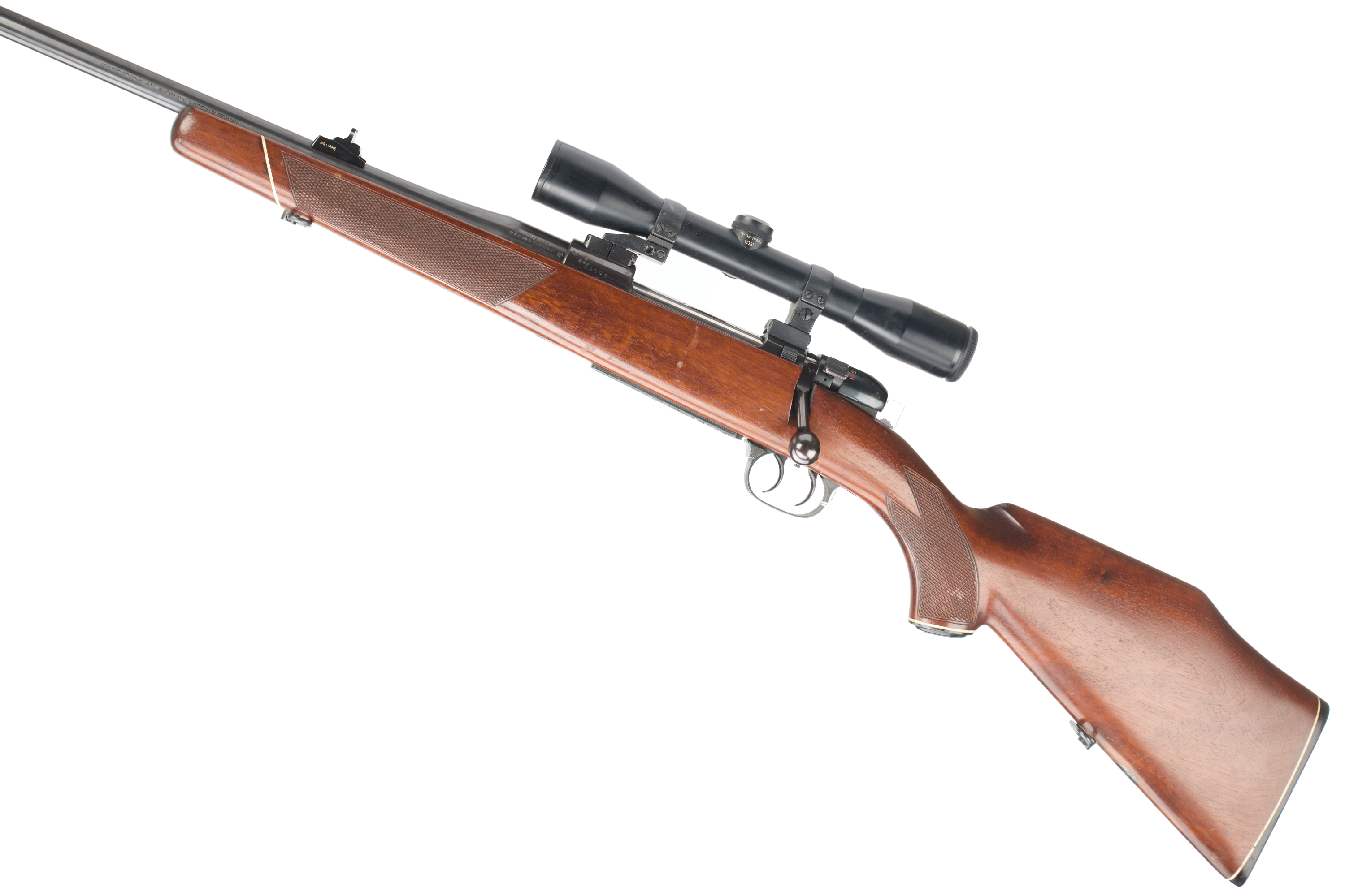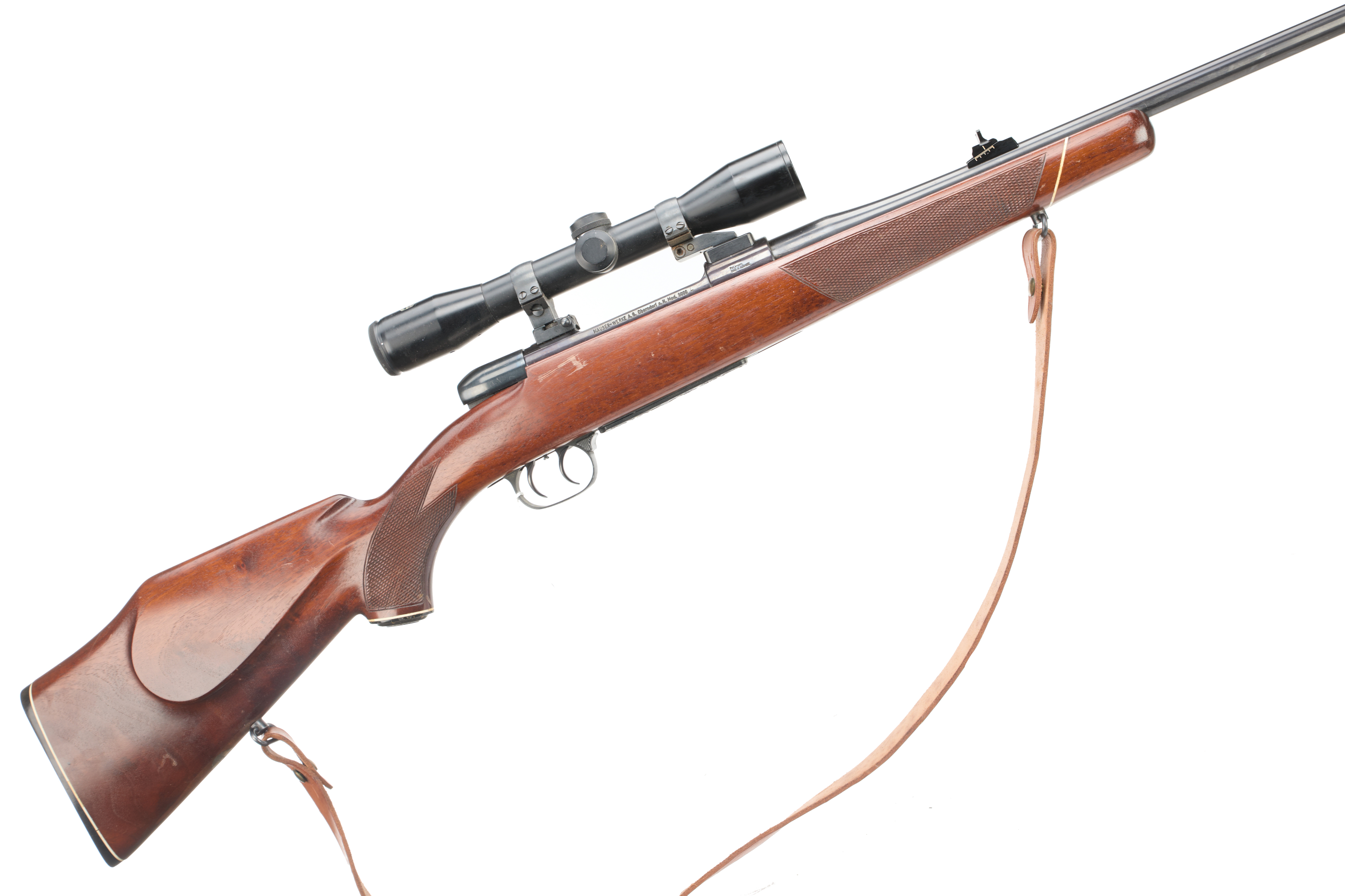 Hard plastic butt pad, chequered pistol grip and foreend, raised cheek piece. Left handed action. Set triggers. Schmidt & Bender 4×36 scope with iron sights. Integral with a hinged floor plate. Sling swivel with leather sling.
