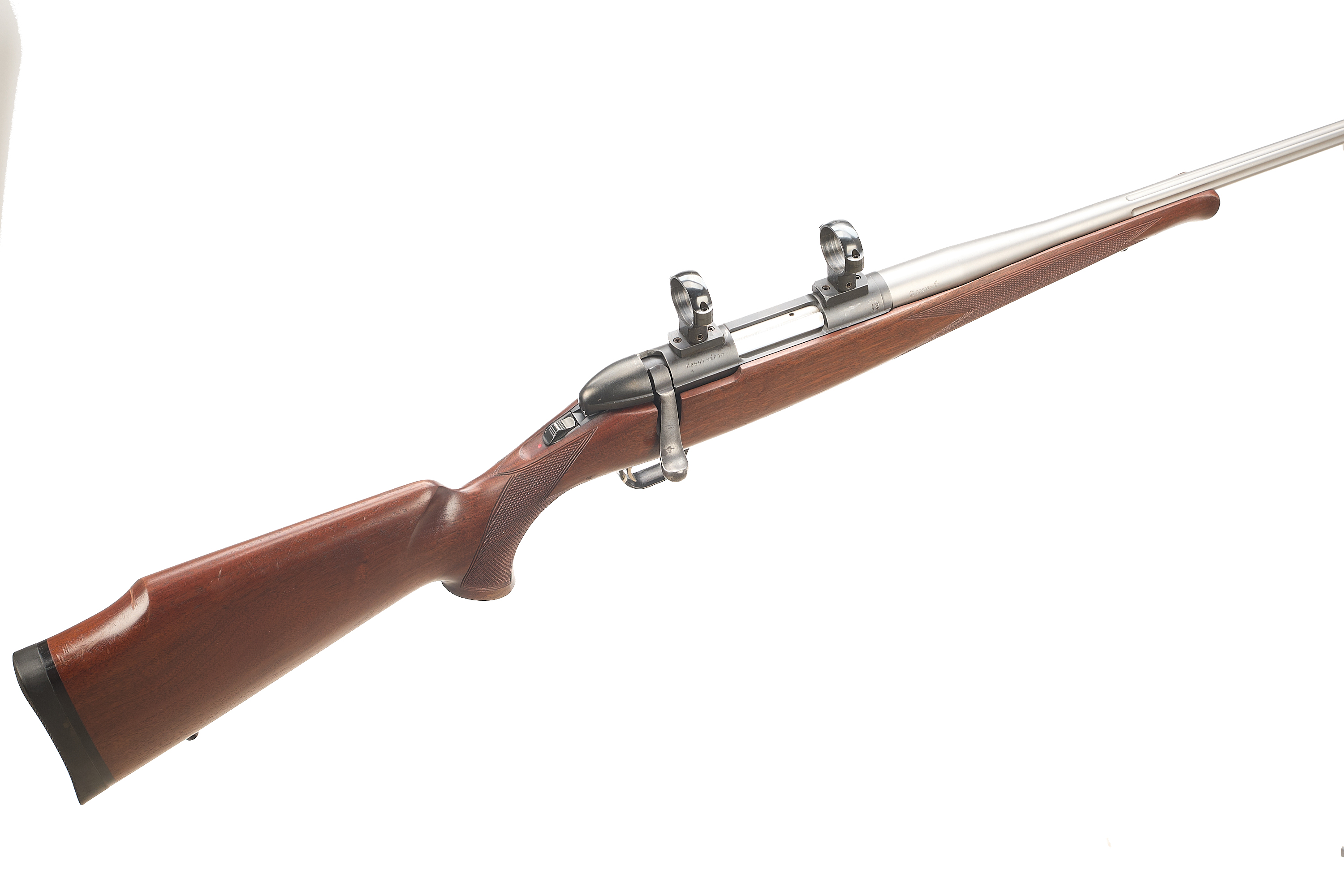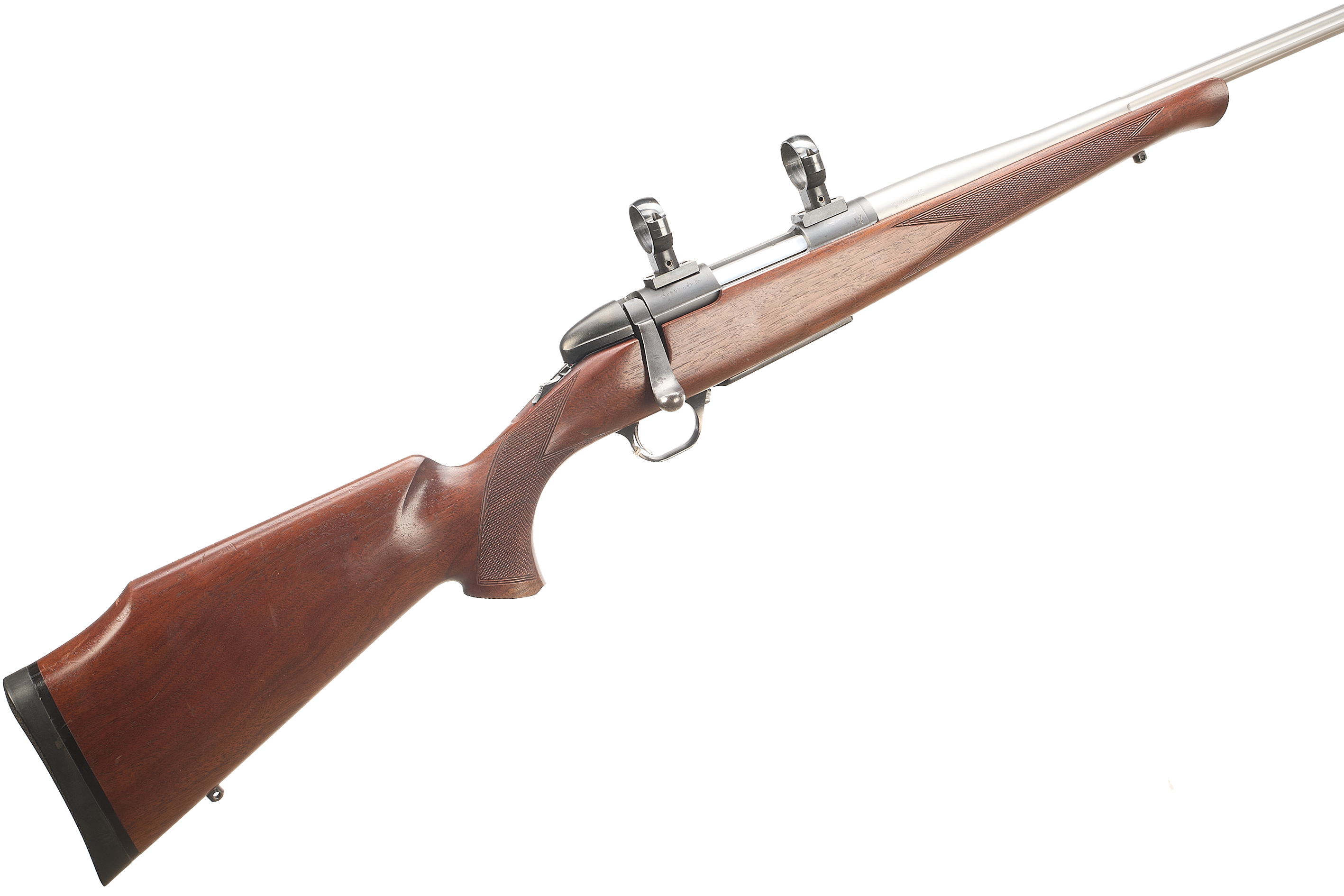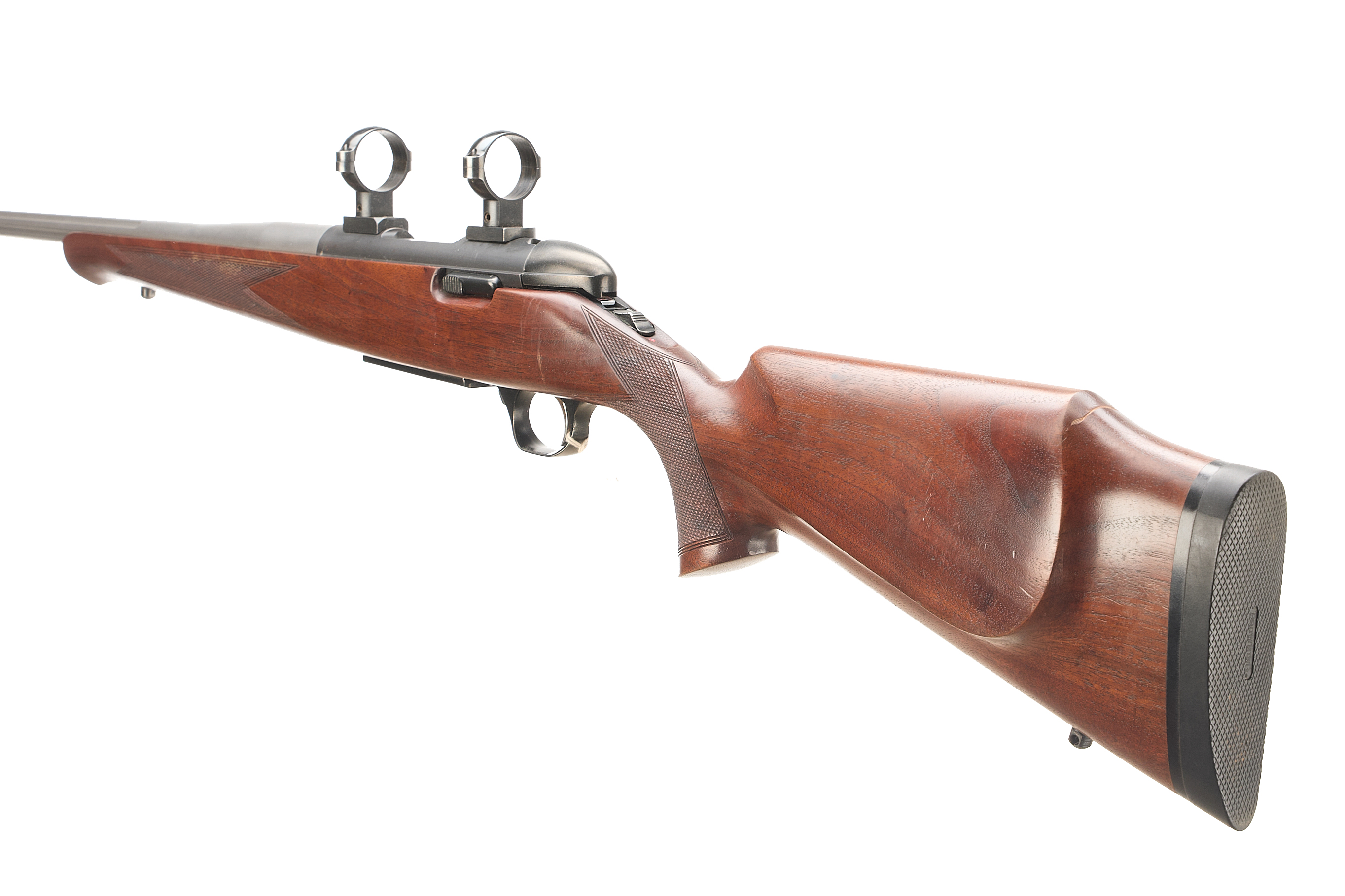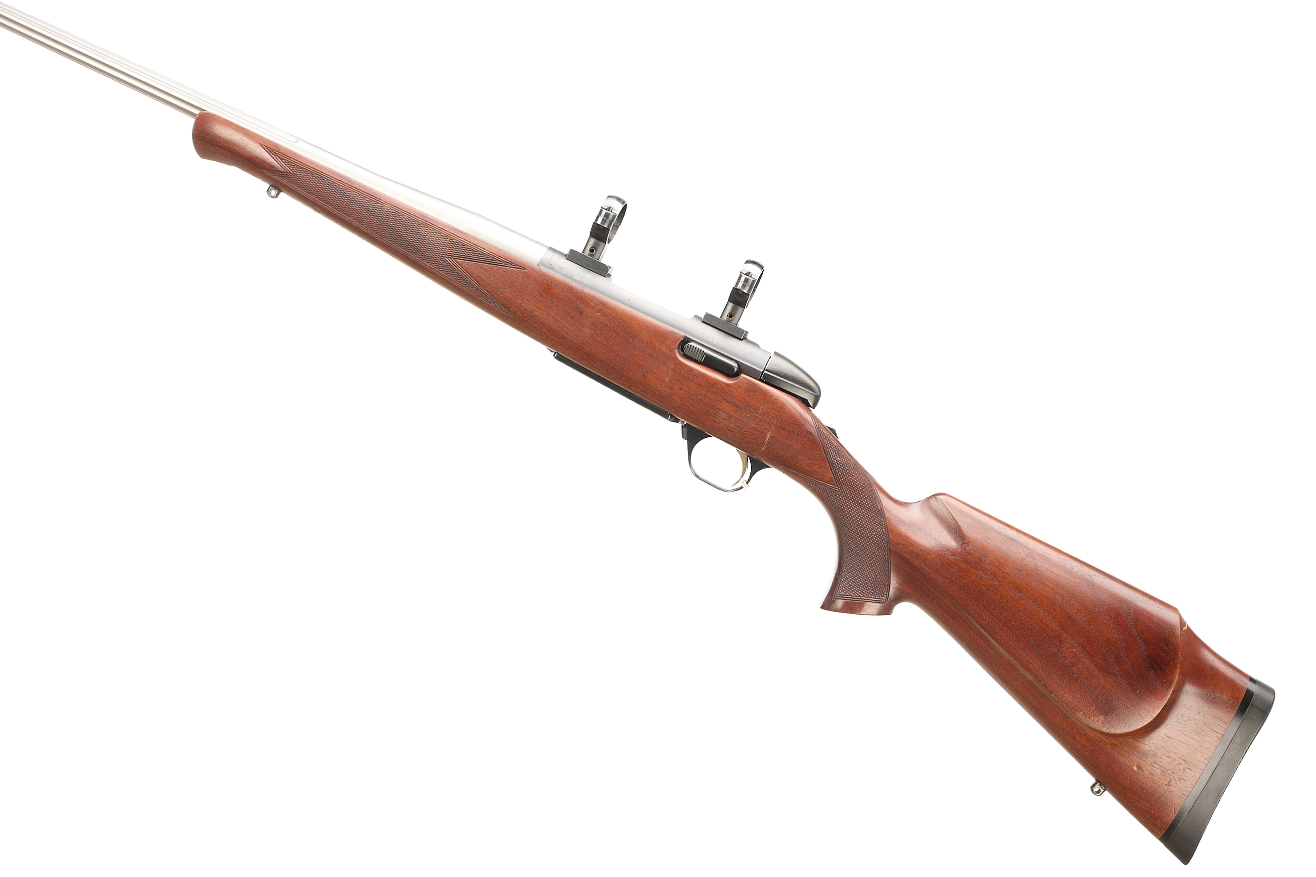 Threaded, fluted stainless barrel, proofed 2011, front and rear sling studs. Full pistol grip with palm swell. Releasable magazine floorplate. CW 30mm scope rings.