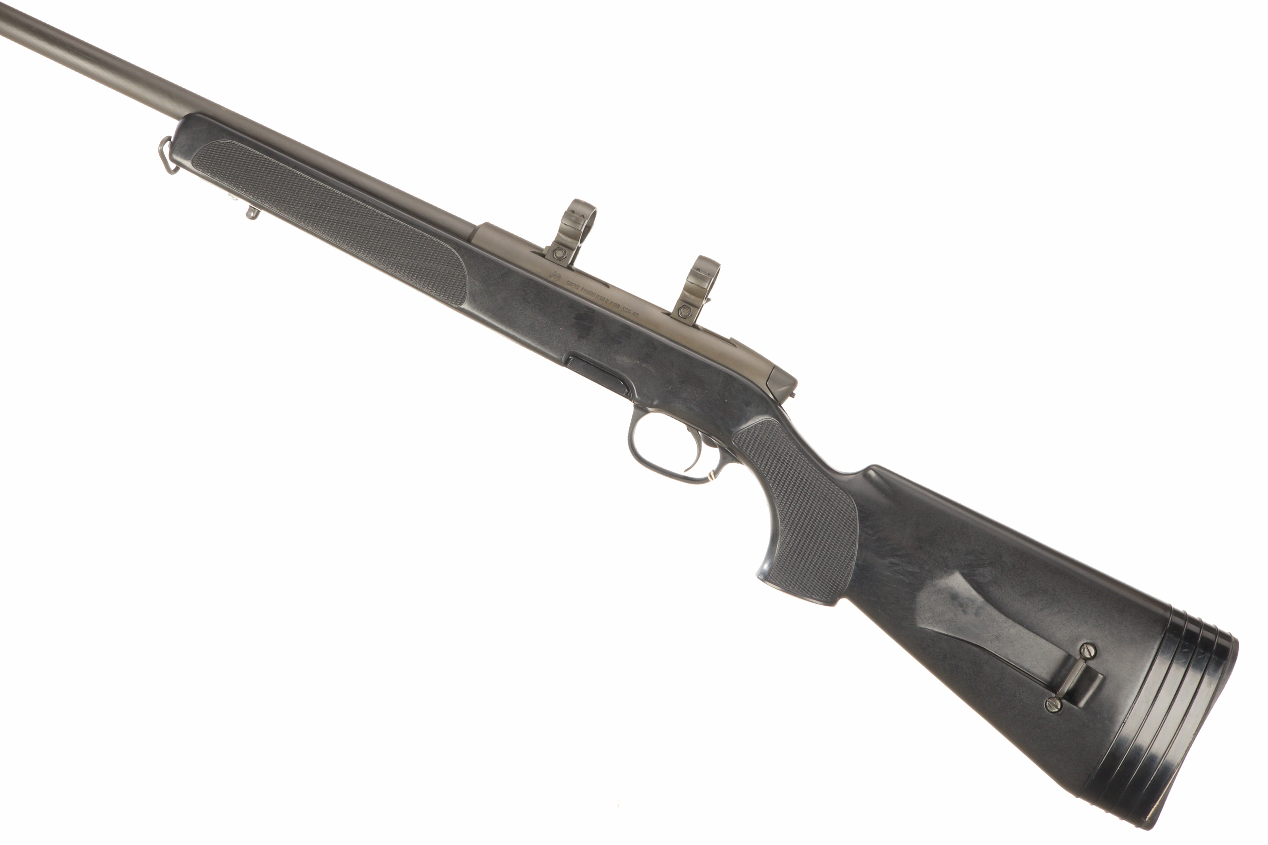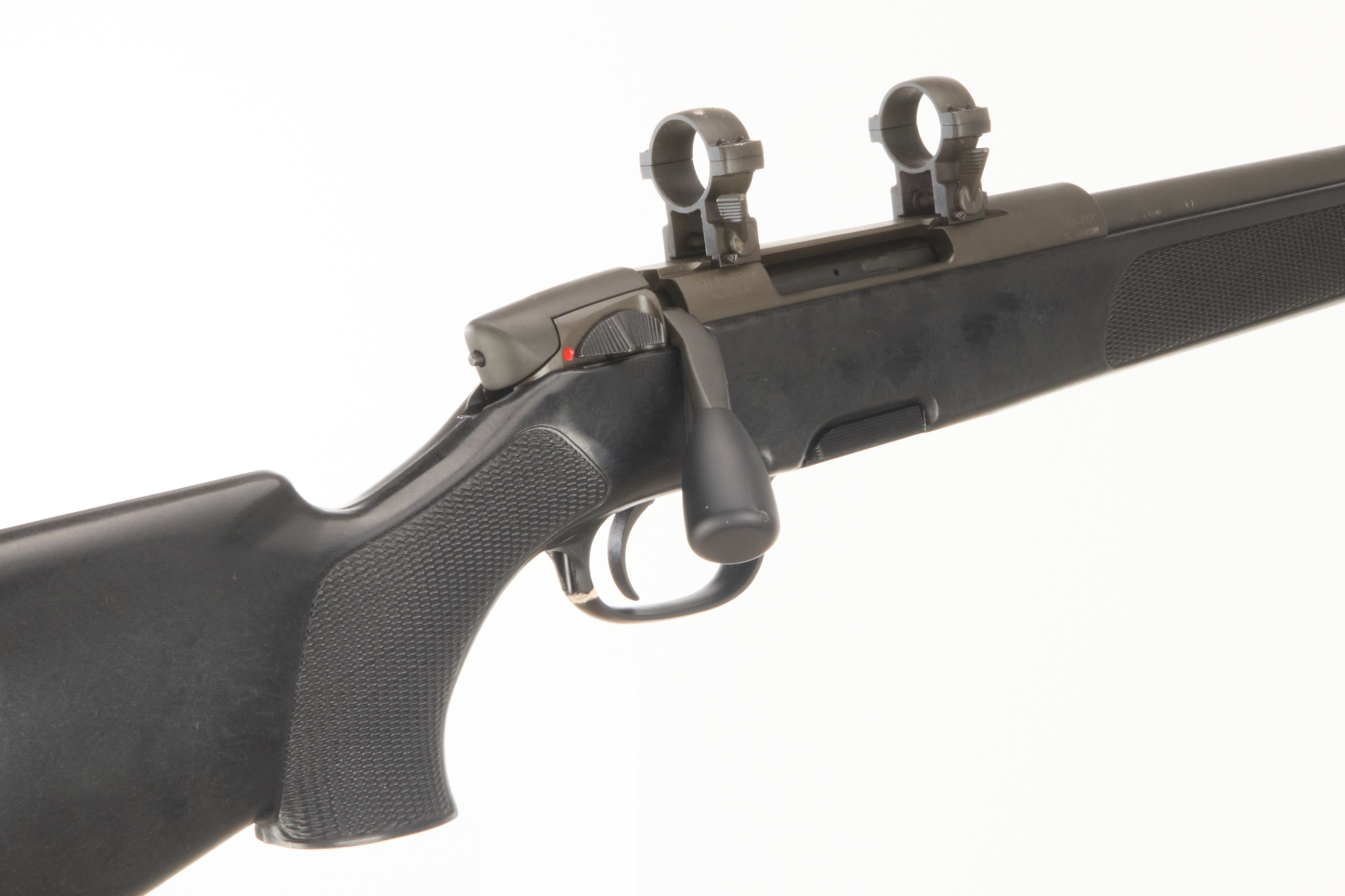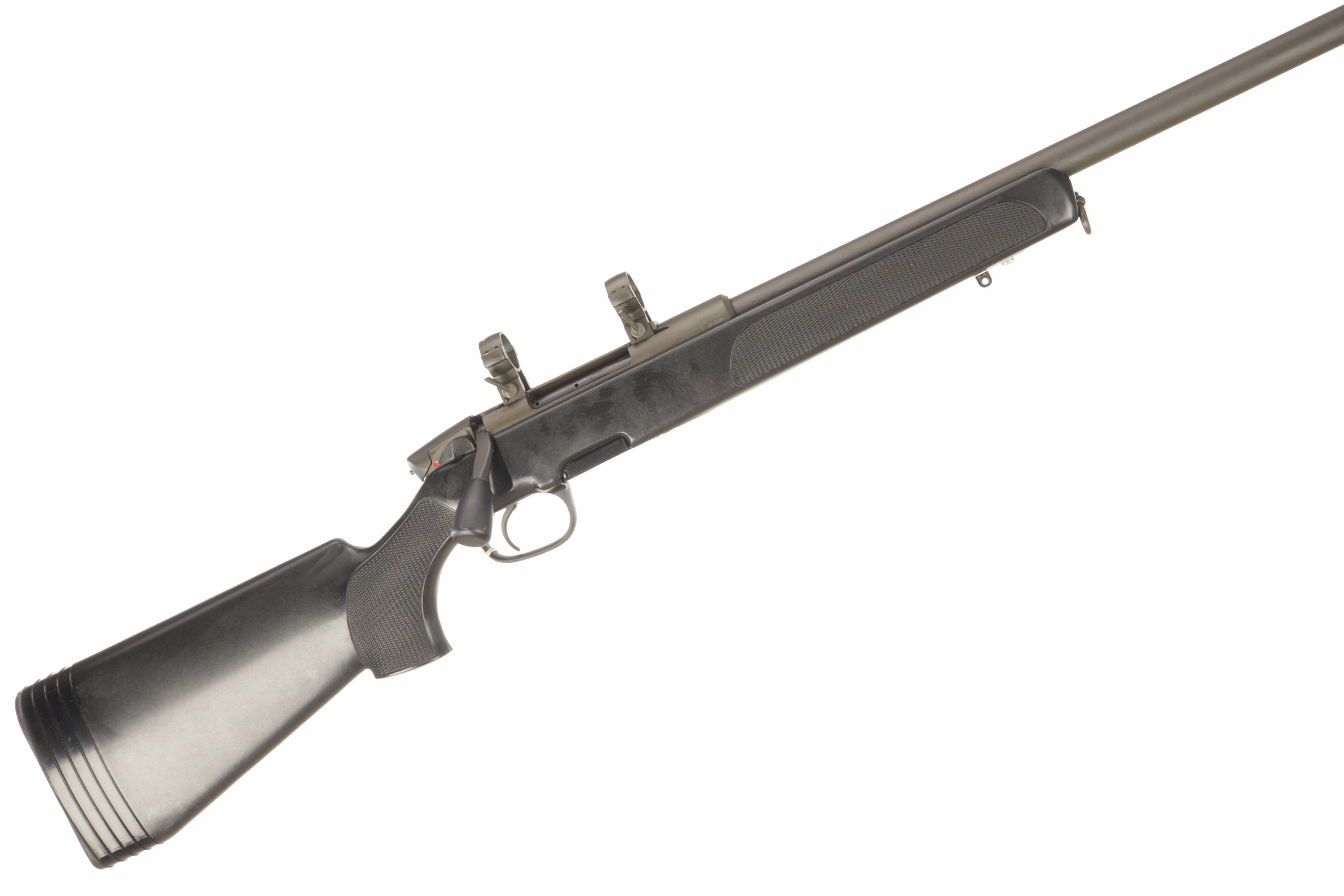 Rubber butt pad with spacers, synthetic stock with chequered grip, front and rear sling swivels, and UIT rail. CW 25mm scope rings. CW rotary magazine.