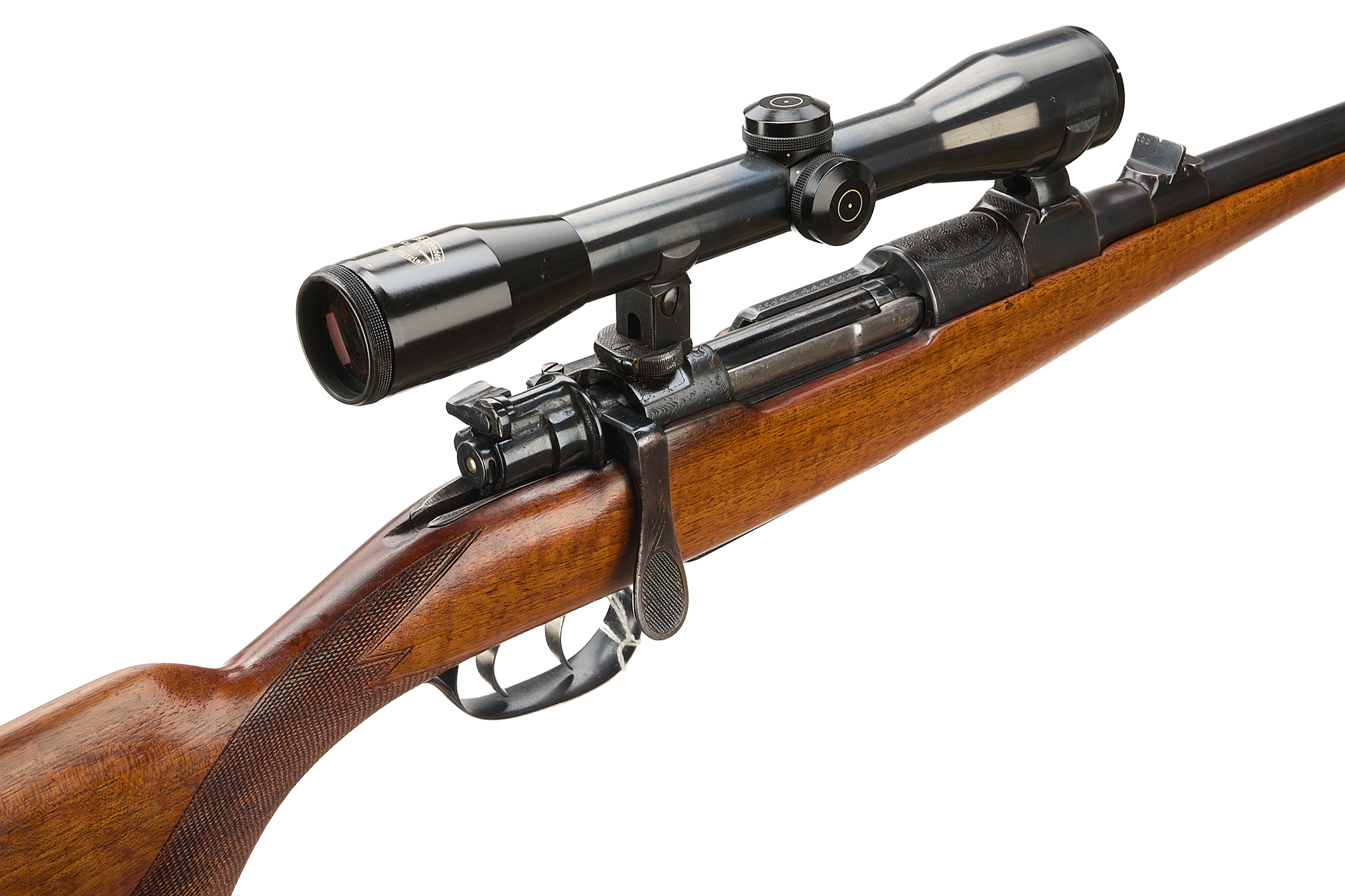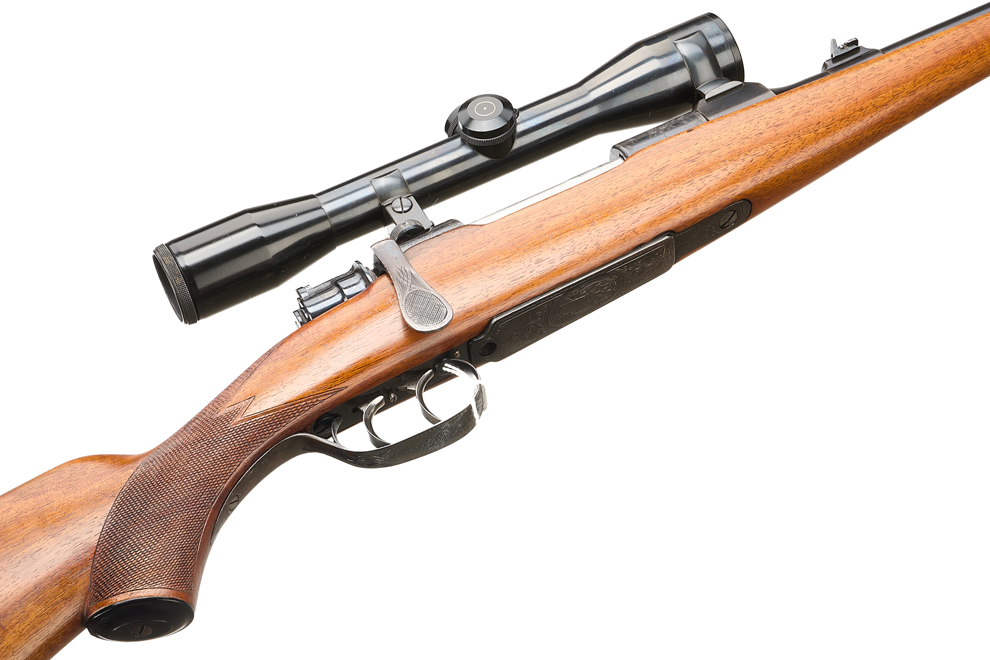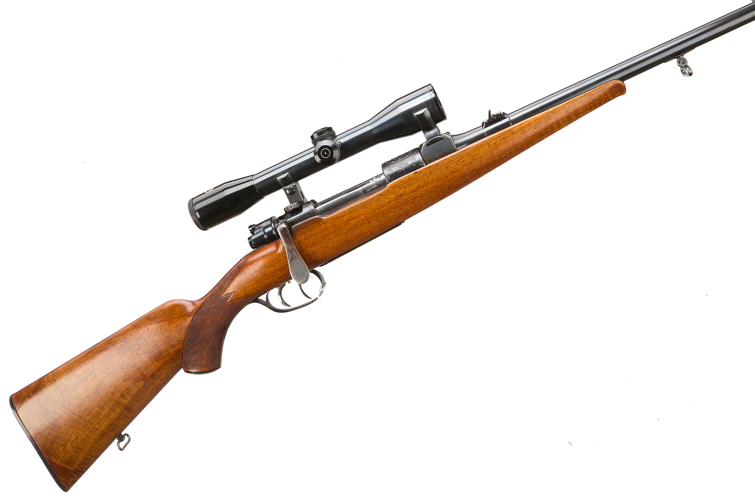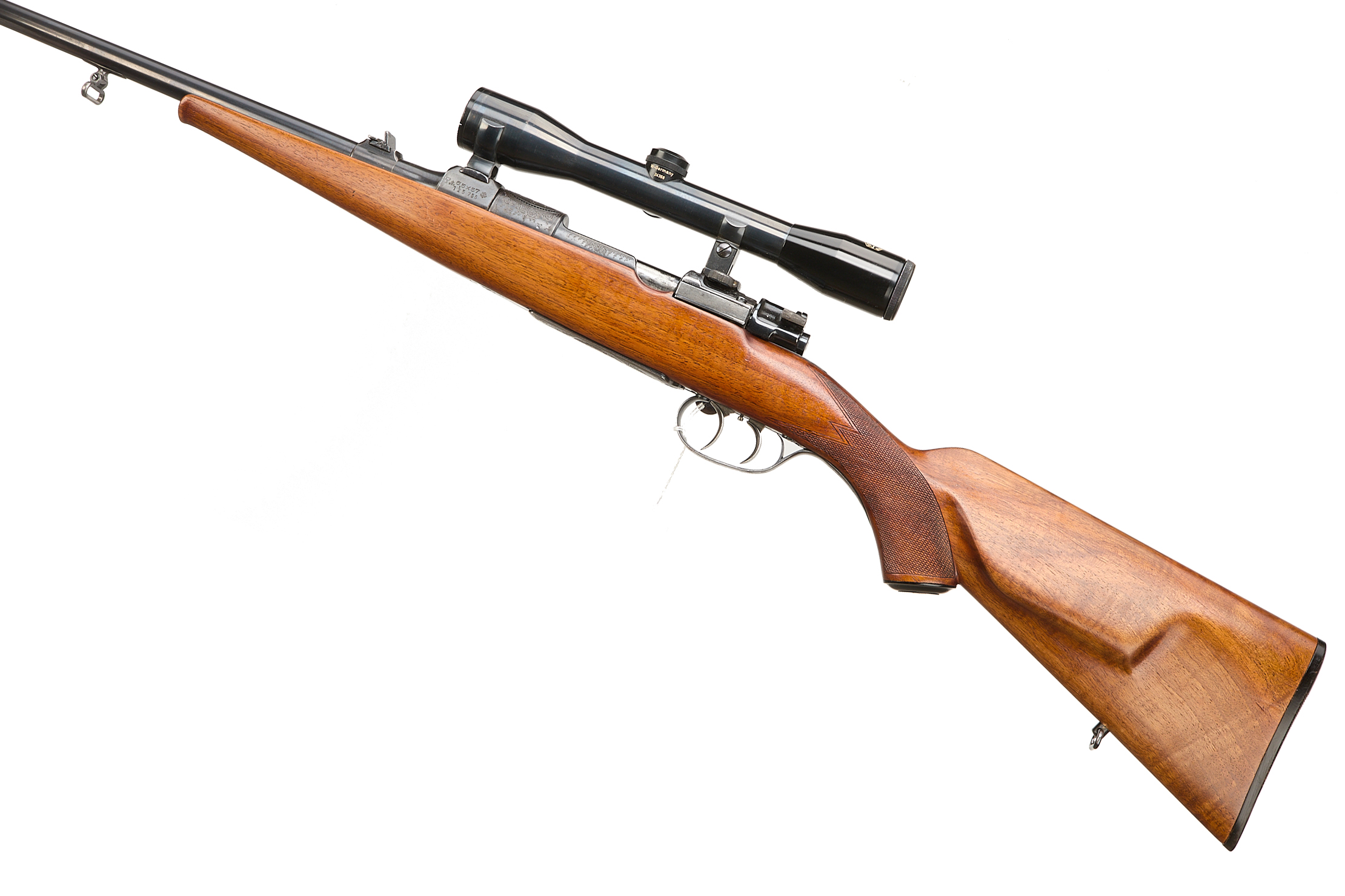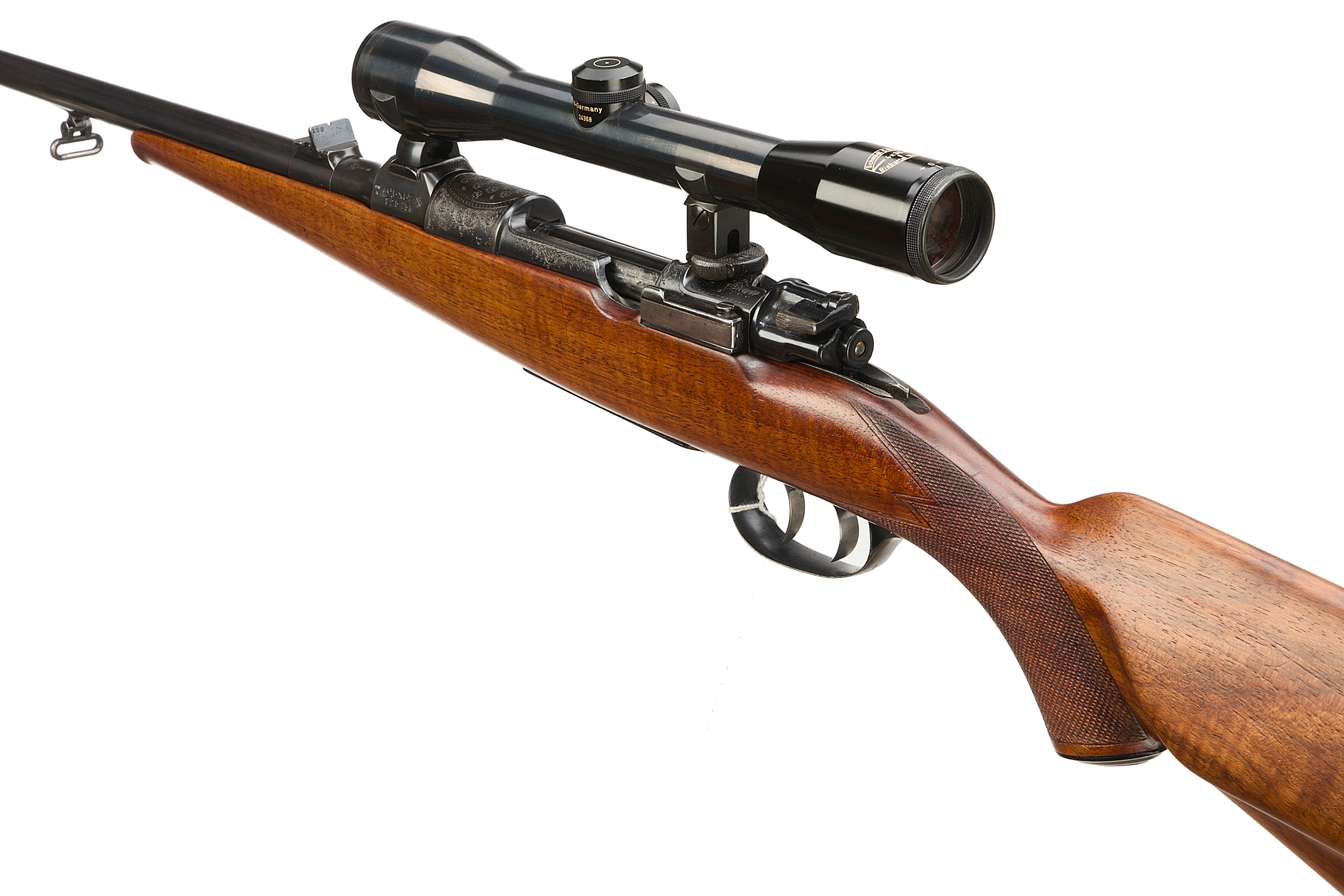 Plastic butt pad, stock with integral cheek piece and chequered grip. Front and rear sling loops. Integral box magazine. Bead front sight, folding leaf rear sight. CW Schmidt & Bender 4×36 scope.